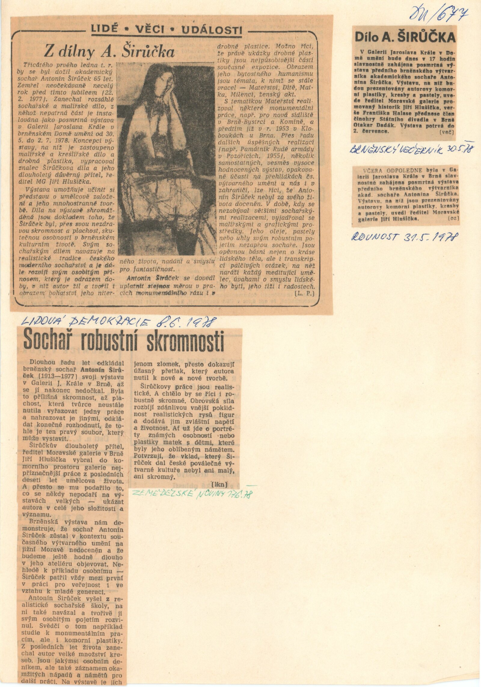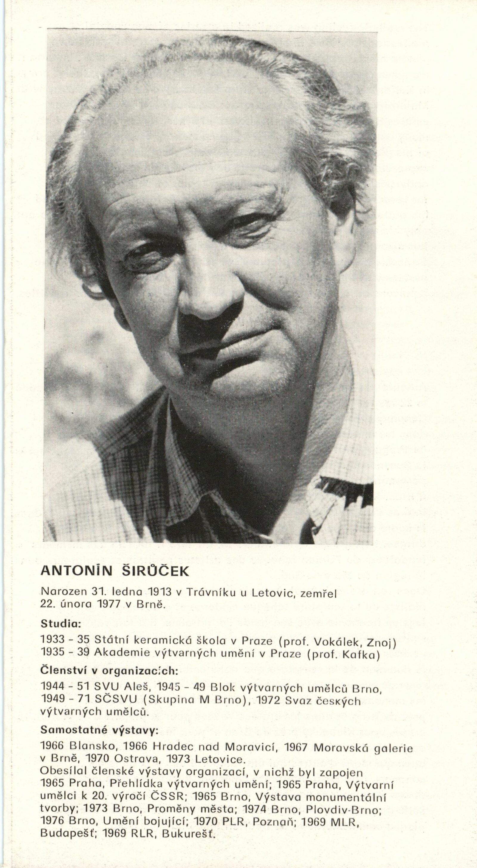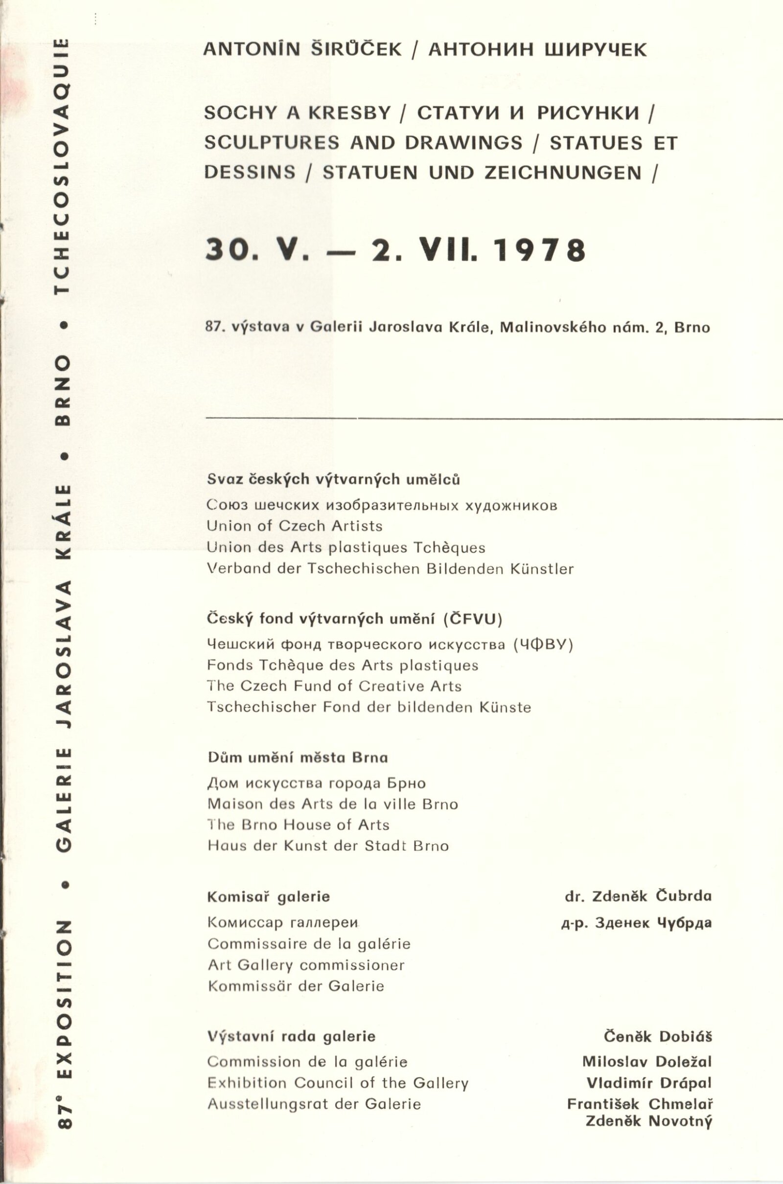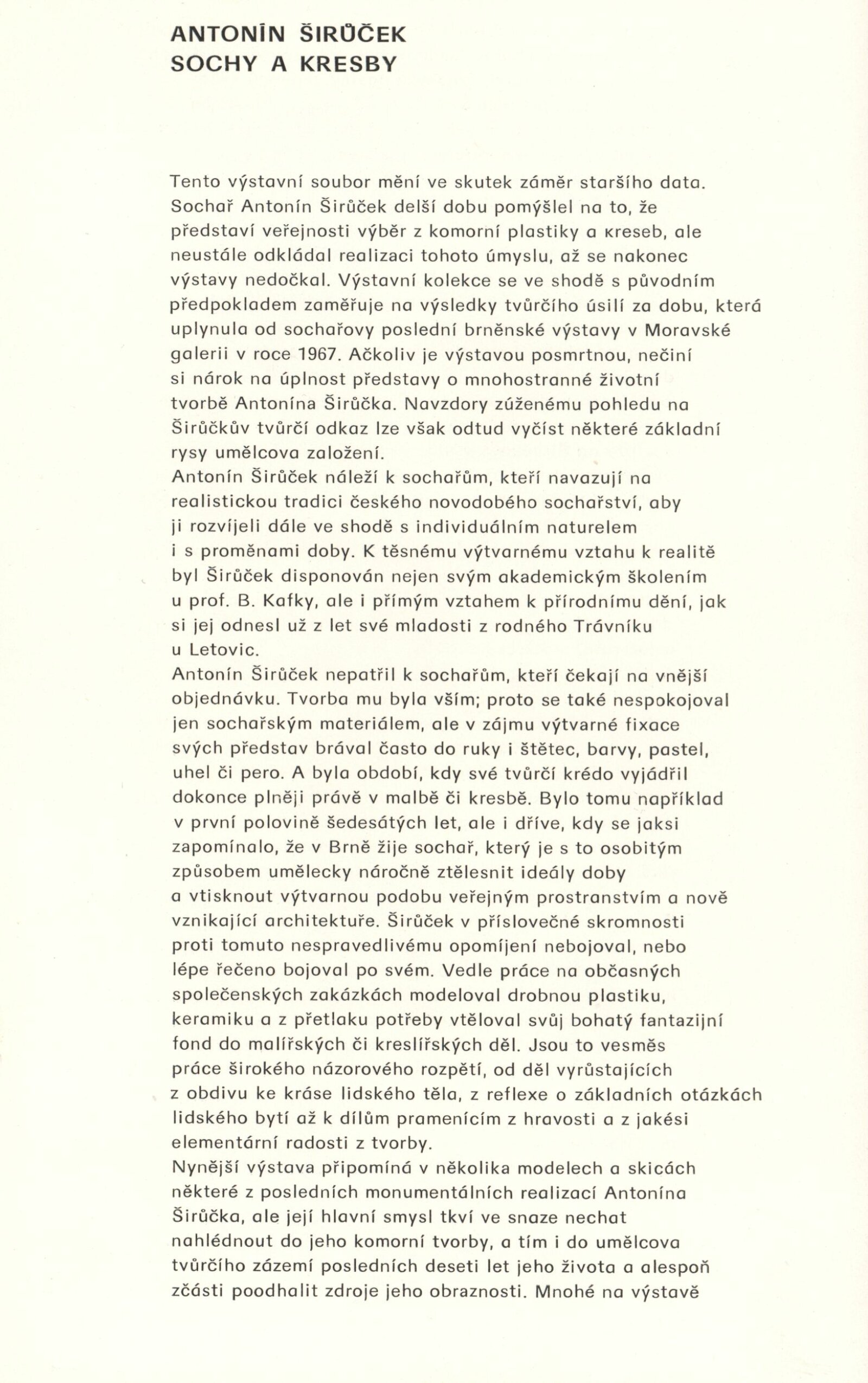 Antonín Širůček. Sochy a kresby: 87. výstava v Galerii Jaroslava Krále 30. 5. – 2. 7. 1978 / Text Jiří Hlušička. - Brno: ČFVU, - 10 s., obr. Portrét, životní data, výstavy, realizace Neobsahuje seznam vystavených děl DU 677