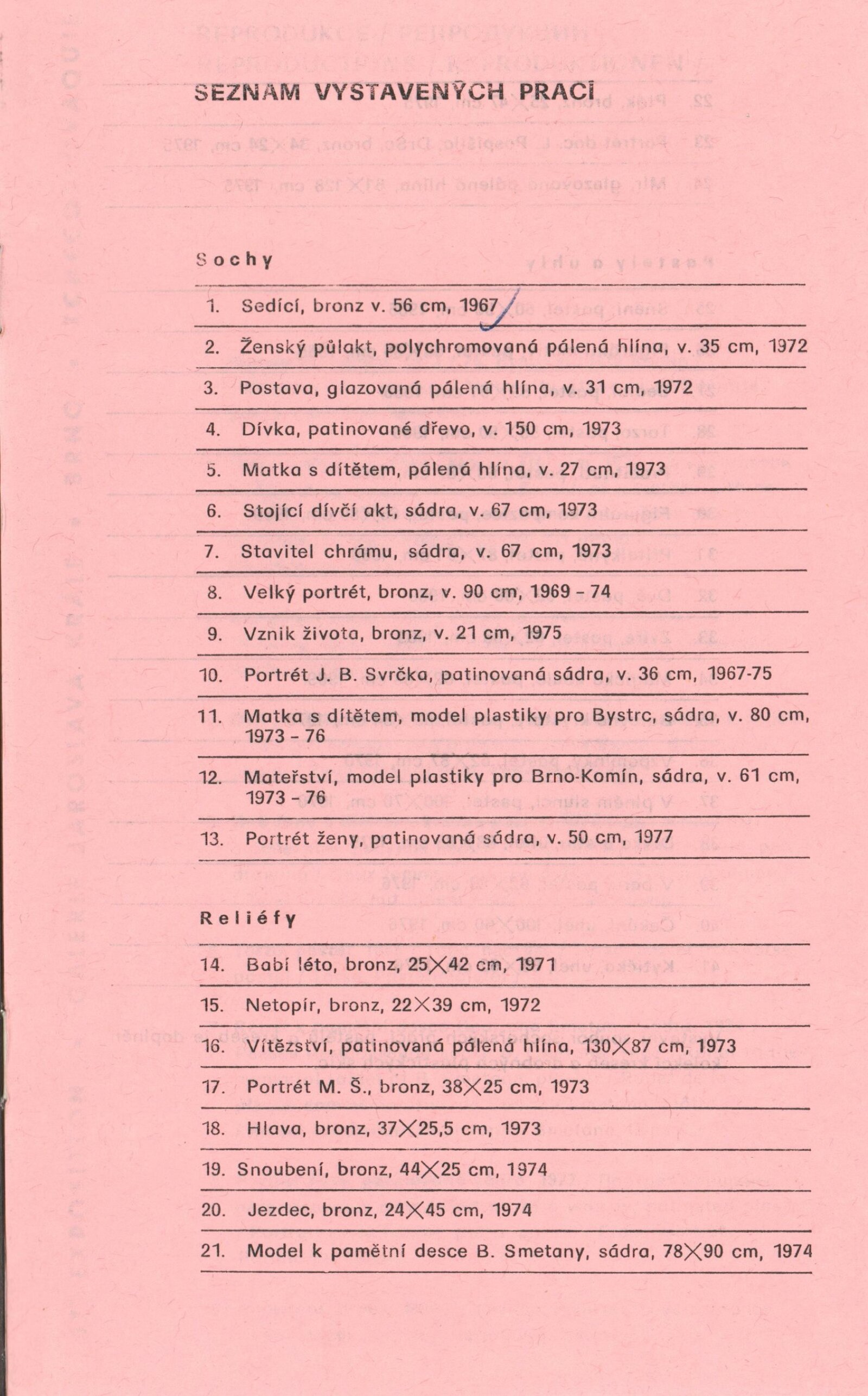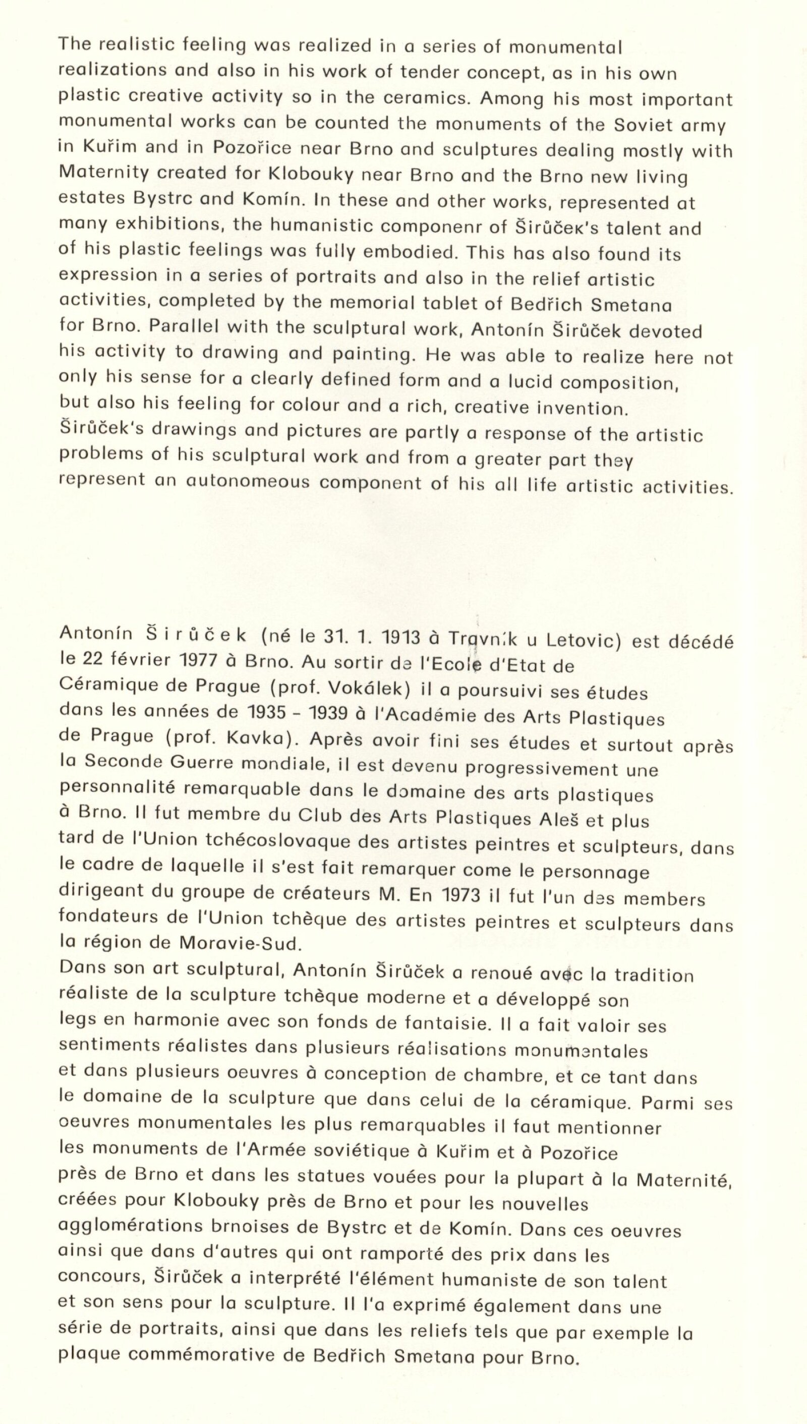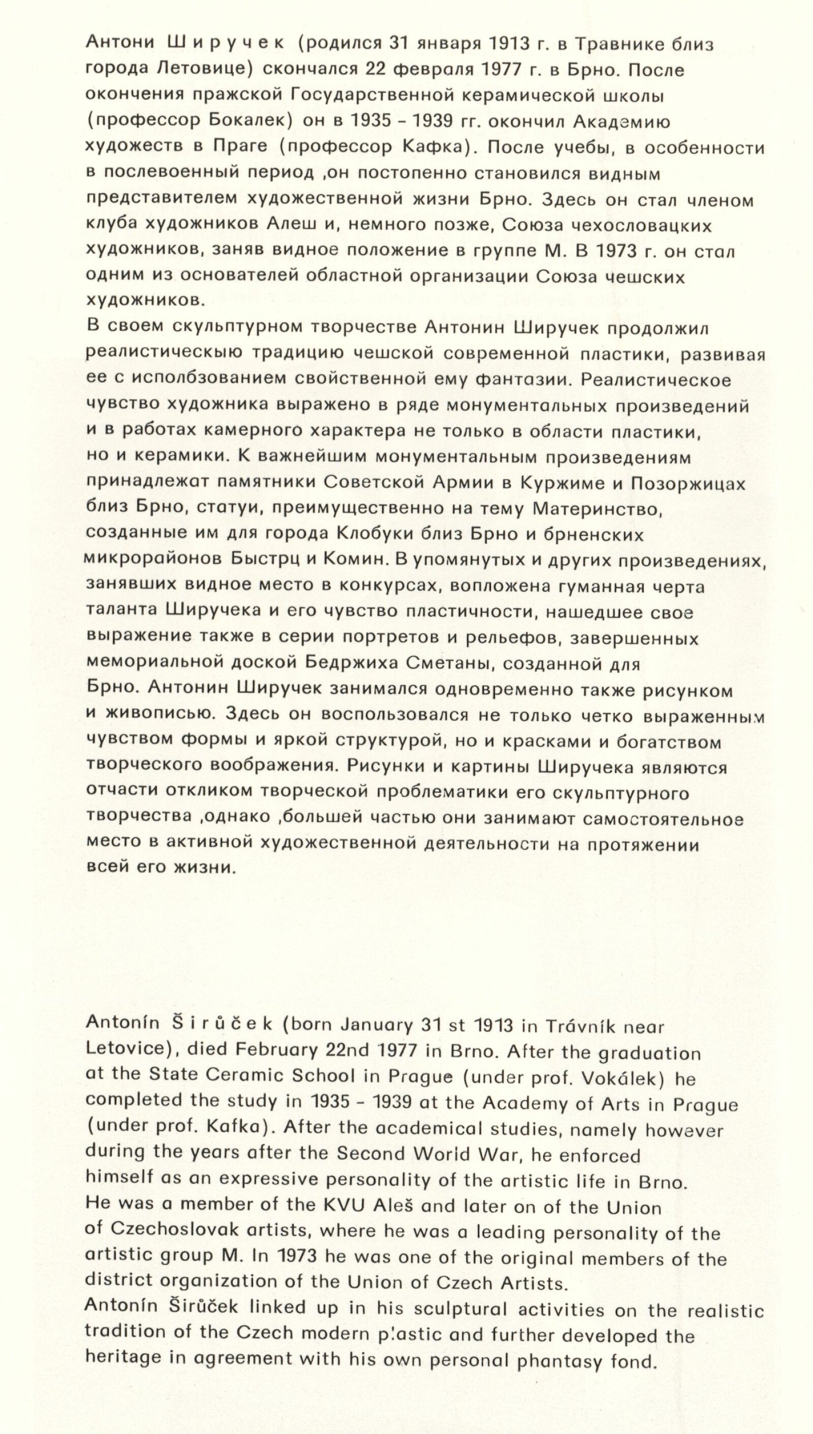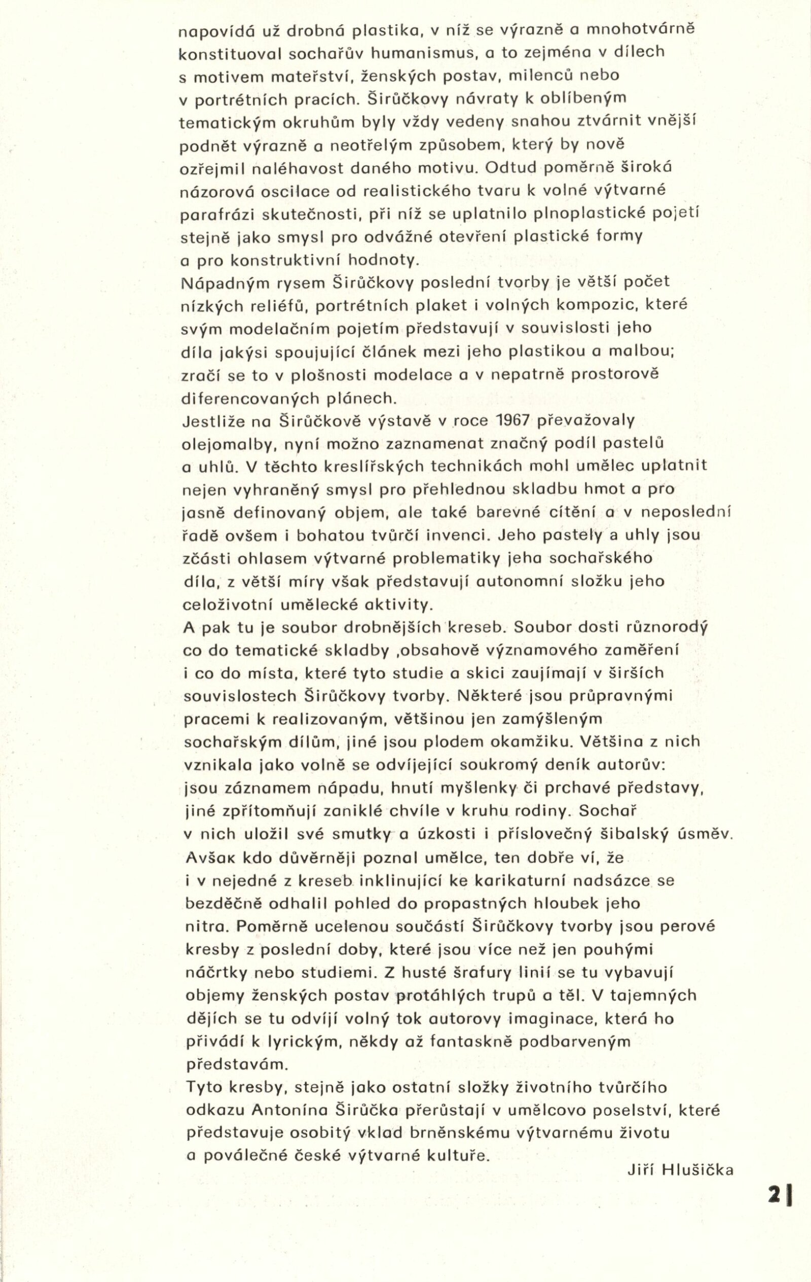 Antonín Širůček. Sochy a kresby: 87. výstava v Galerii Jaroslava Krále 30. 5. – 2. 7. 1978 / Text Jiří Hlušička. - Brno: ČFVU, - 10 s., obr. Portrét, životní data, výstavy, realizace Neobsahuje seznam vystavených děl DU 677