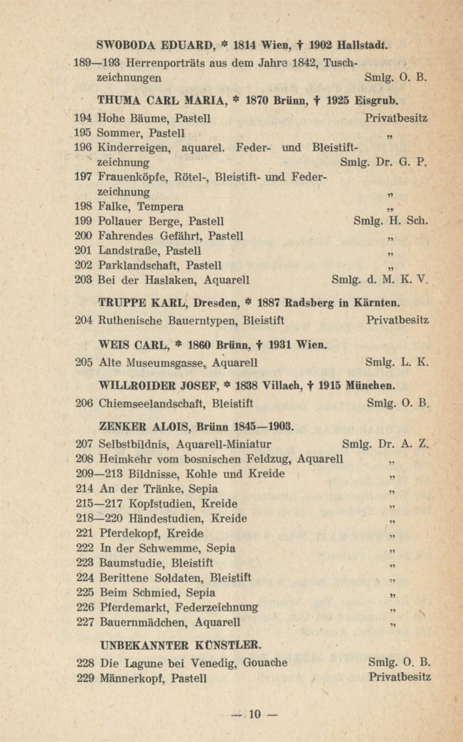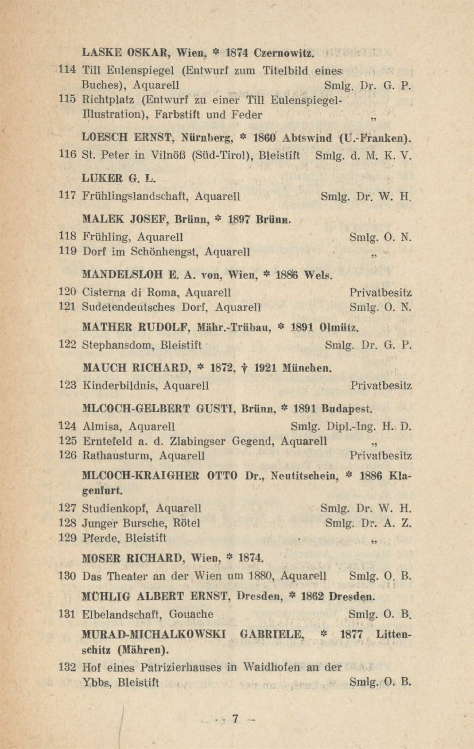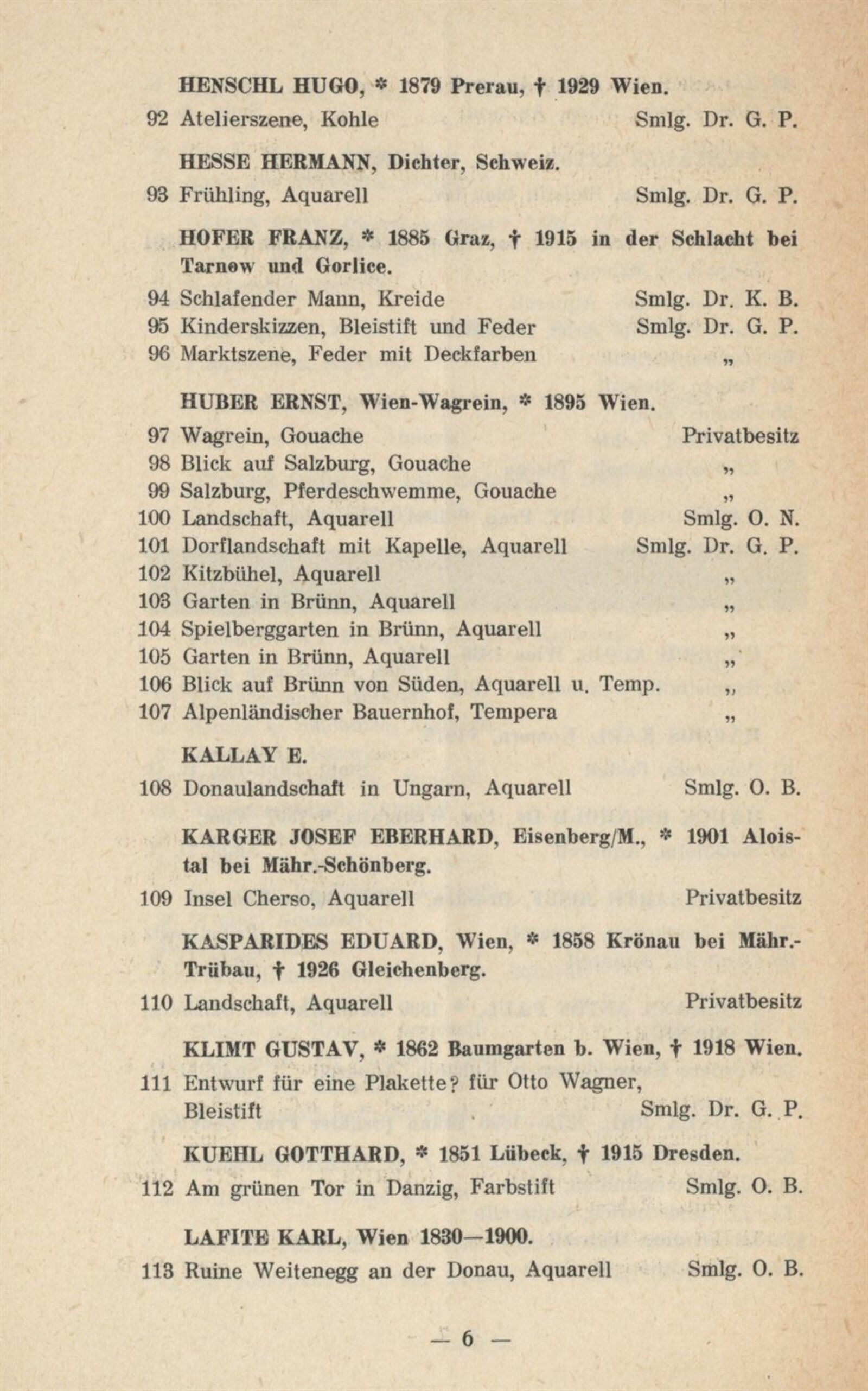 Jakob Alt, Rudolf Alt, Anton Altmann, Alois von Anreiter, Lilli Balle, Gustav Brauner, Anton Bruder, E. B., Eduard Harrison Compton, L. Costantini, Eduard Csank, Else Csank, Emil Czech, Moritz Michael Daffinger, Johann Baptist Dallinger, Georg Decker, Josef Dobrowsky, Reinhold Max Eichler, Friedrich Engel, Anton Faistauer, Leo Fitz, Kurt Hallegger, Alois Hänisch, Karl Harmos, Reinhold Hauck, Josef Hegenbarth, Anton Paul Heilmann, Joh. Hemala, Hugo Henschl, Hermann Hesse, Franz Hofer, Ernst Huber, E. Kallay, Josef Eberhard Karger, Eduard Kasparides, Gustav Klimt, Gotthard Kuehl, Karl Lafite, Oskar Laske, Ernst Loesch, G. L. Luker, Josef Malek, E. A. von Mandelsloh, Rudolf Mather, Richard Mauch, Gusti Mlcoch-Gelbert, Otto Mlcoch-Kraigher, Richard Moser, Albert Ernst Mühlig, Gabriele Murad-Michalkowski, Otto Neudert, Sergius Pauser, G. Pietsch, Emil Pirchan, Emil Pirchan st., Emil Pirchan ml., Ernst Pokorny, F. P., Paul René Reinicke, Ludwig Richter, A. Roos, J. Saltelli, Egon Schiele, Ernst Schilder, Oskar Schmal, Willi Schustala-Vallaza, Karl Schwetz, Josef Steib, Alfred Strnischtie, Eduard Swoboda, Carl Maria Thuma, Karl Truppe, Carl Weis, Josef Willroider, Alois Zenker