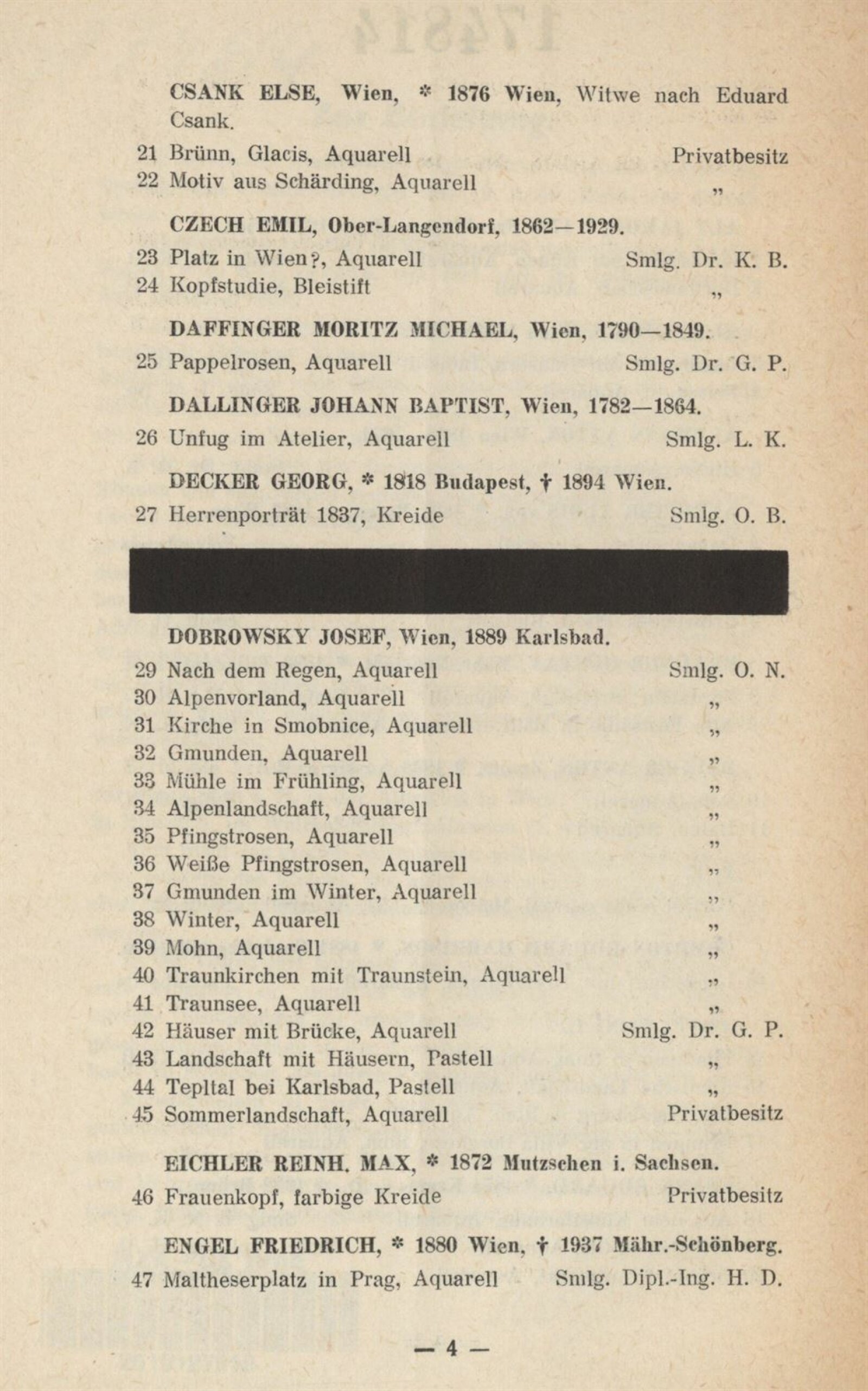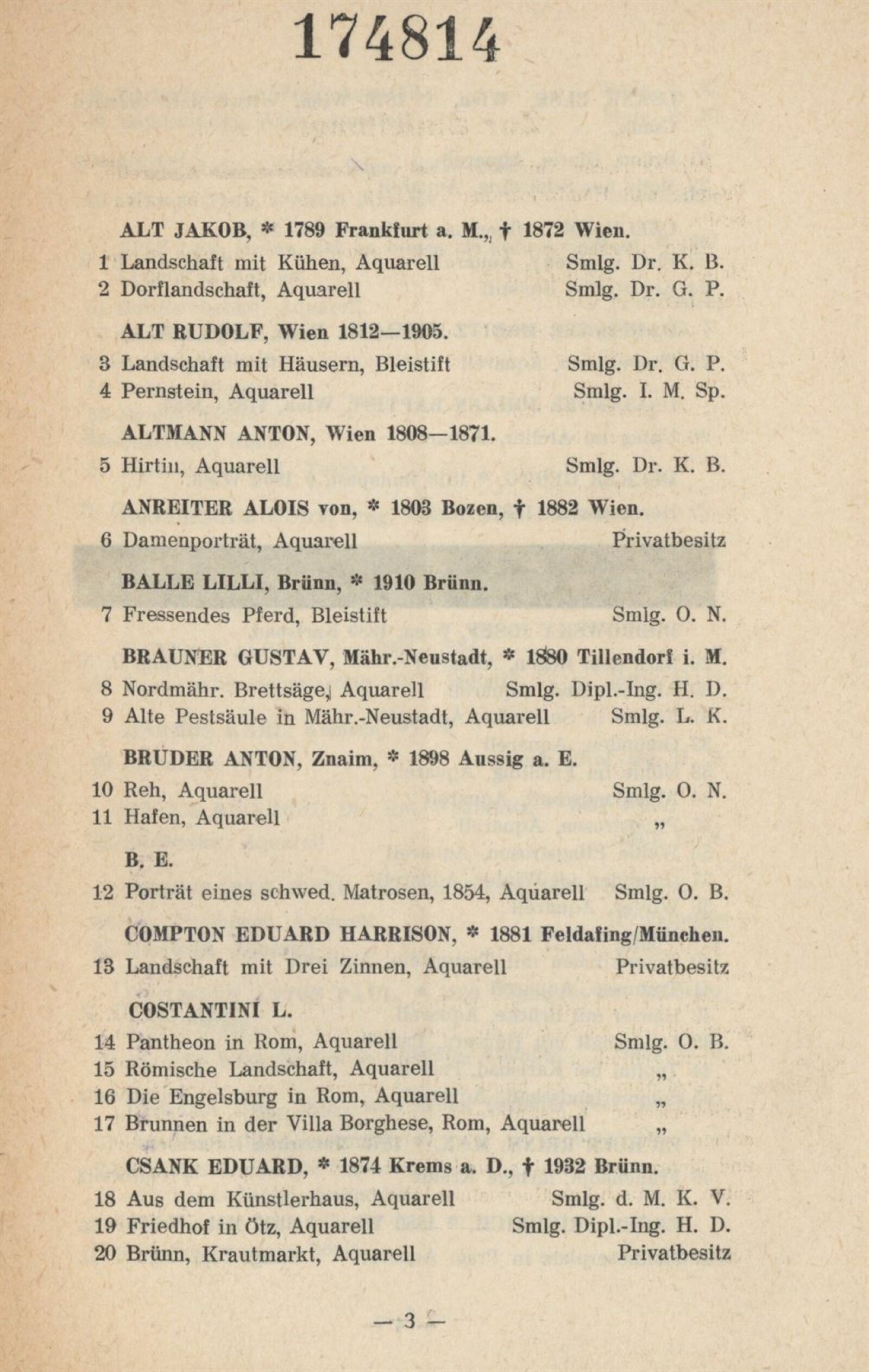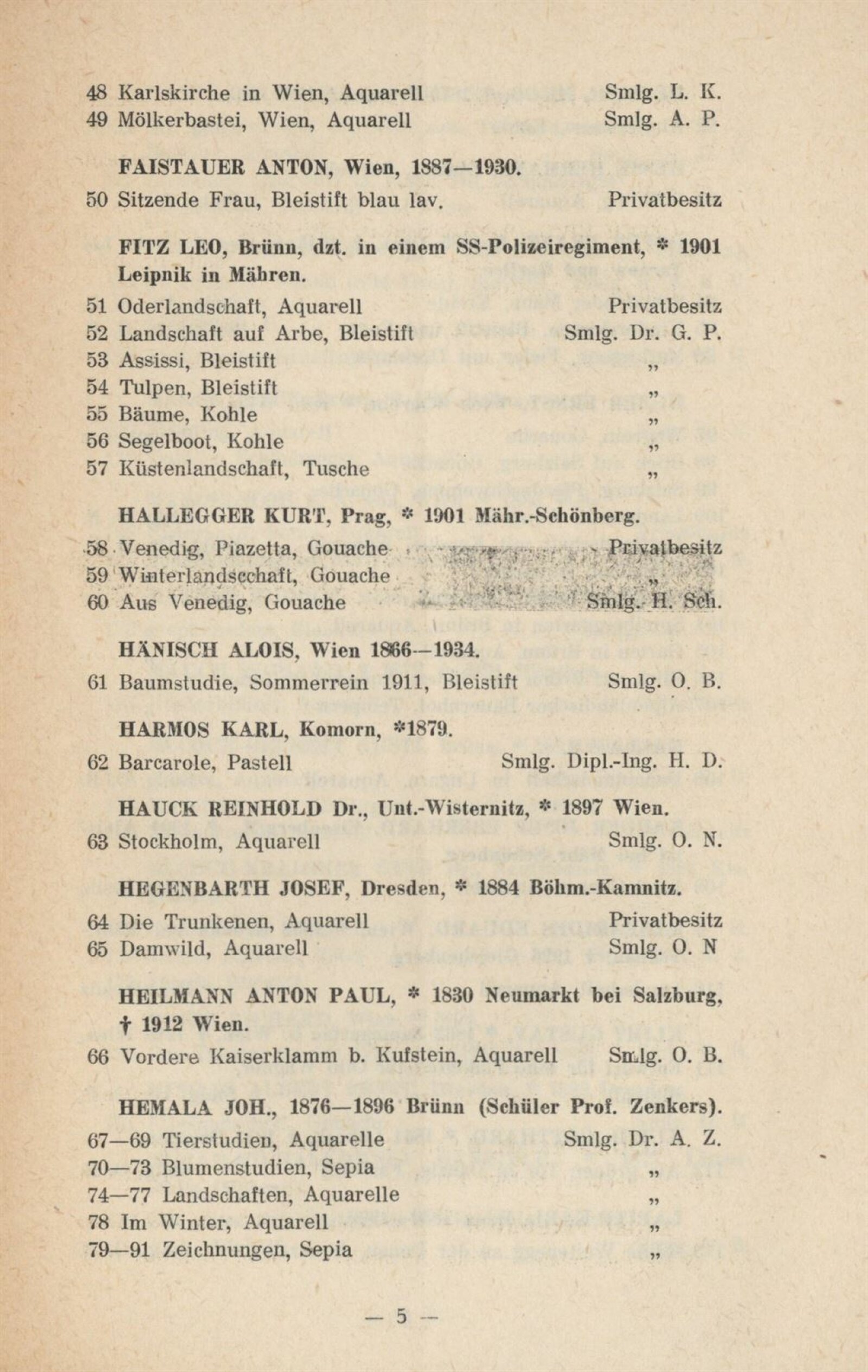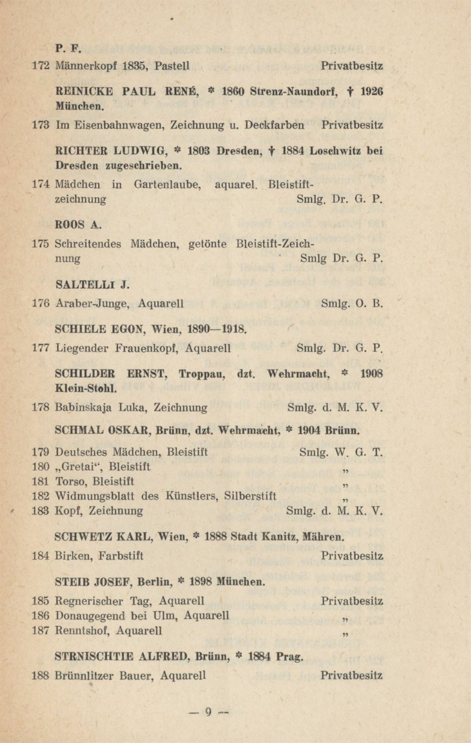 Jakob Alt, Rudolf Alt, Anton Altmann, Alois von Anreiter, Lilli Balle, Gustav Brauner, Anton Bruder, E. B., Eduard Harrison Compton, L. Costantini, Eduard Csank, Else Csank, Emil Czech, Moritz Michael Daffinger, Johann Baptist Dallinger, Georg Decker, Josef Dobrowsky, Reinhold Max Eichler, Friedrich Engel, Anton Faistauer, Leo Fitz, Kurt Hallegger, Alois Hänisch, Karl Harmos, Reinhold Hauck, Josef Hegenbarth, Anton Paul Heilmann, Joh. Hemala, Hugo Henschl, Hermann Hesse, Franz Hofer, Ernst Huber, E. Kallay, Josef Eberhard Karger, Eduard Kasparides, Gustav Klimt, Gotthard Kuehl, Karl Lafite, Oskar Laske, Ernst Loesch, G. L. Luker, Josef Malek, E. A. von Mandelsloh, Rudolf Mather, Richard Mauch, Gusti Mlcoch-Gelbert, Otto Mlcoch-Kraigher, Richard Moser, Albert Ernst Mühlig, Gabriele Murad-Michalkowski, Otto Neudert, Sergius Pauser, G. Pietsch, Emil Pirchan, Emil Pirchan st., Emil Pirchan ml., Ernst Pokorny, F. P., Paul René Reinicke, Ludwig Richter, A. Roos, J. Saltelli, Egon Schiele, Ernst Schilder, Oskar Schmal, Willi Schustala-Vallaza, Karl Schwetz, Josef Steib, Alfred Strnischtie, Eduard Swoboda, Carl Maria Thuma, Karl Truppe, Carl Weis, Josef Willroider, Alois Zenker