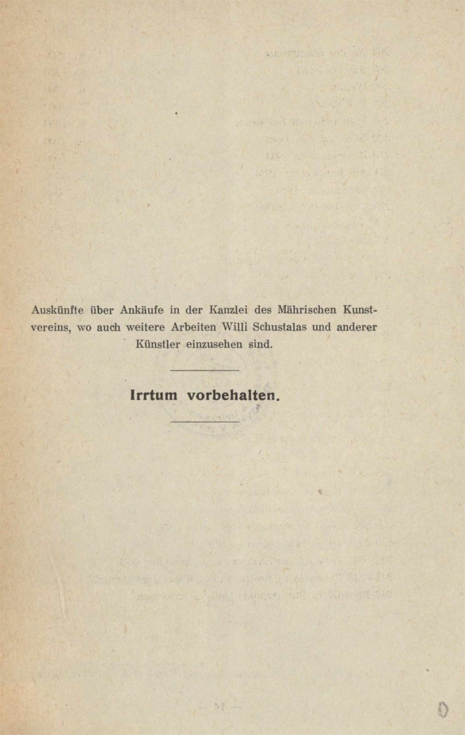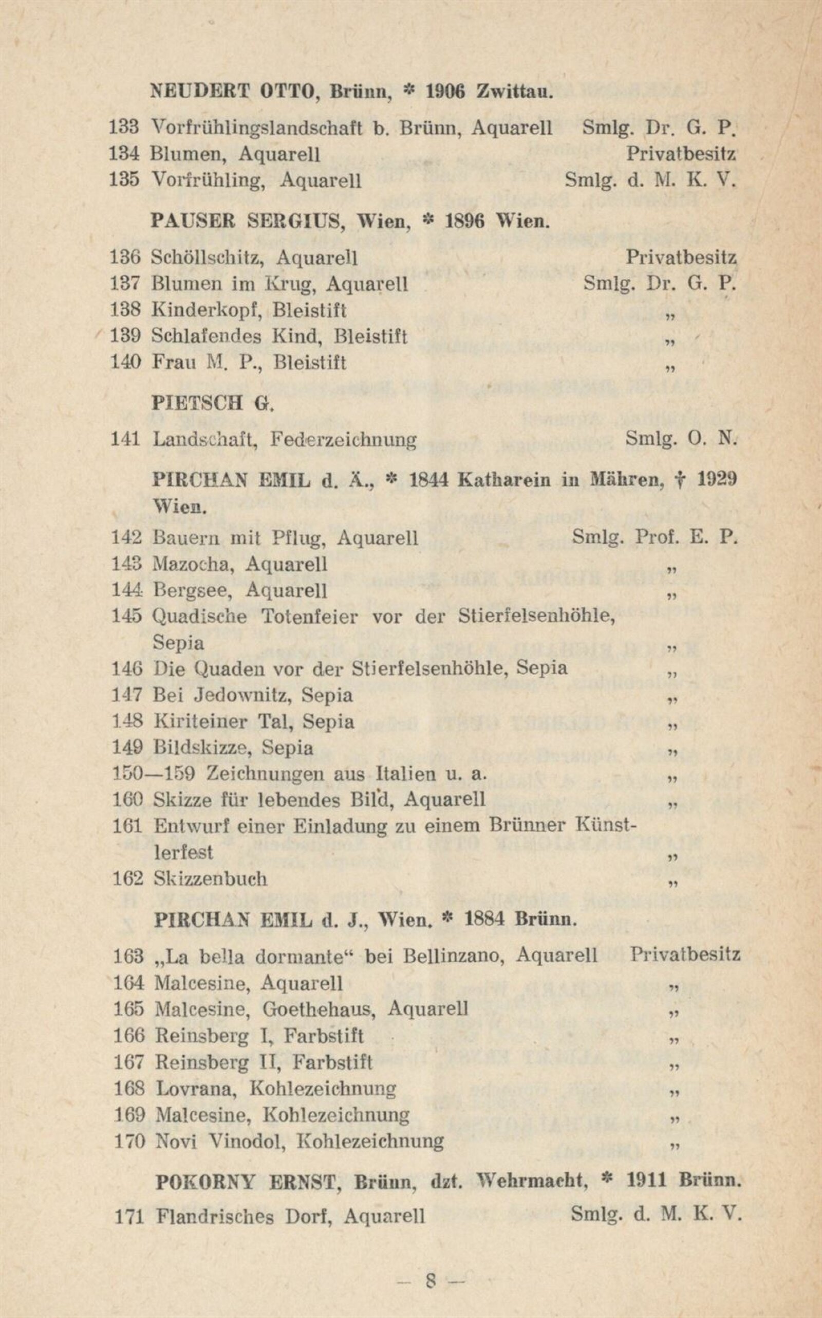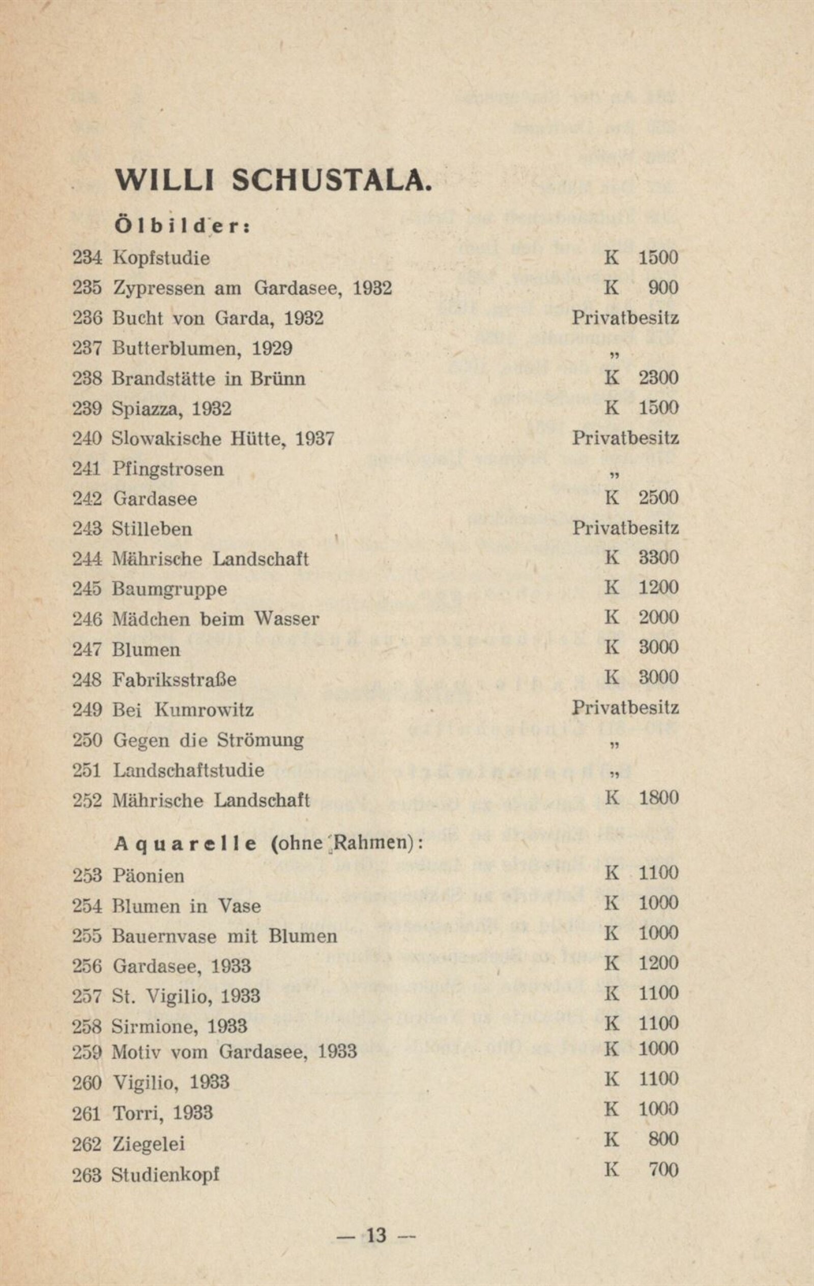 Aquarelle und Zeichnungen 19. u. 20. Jahrhundert aus Brünner Privatsammlungen und Gedächtnisschau Willi Schustala: Mährischer Kunstverein Brünn, Künstlerhaus, 20. 5. – 18. 6. 1944 / Brünn: Mährischer Kunstverein, 1944. – 14 s. – Kubíček 7967, MZK; UPM