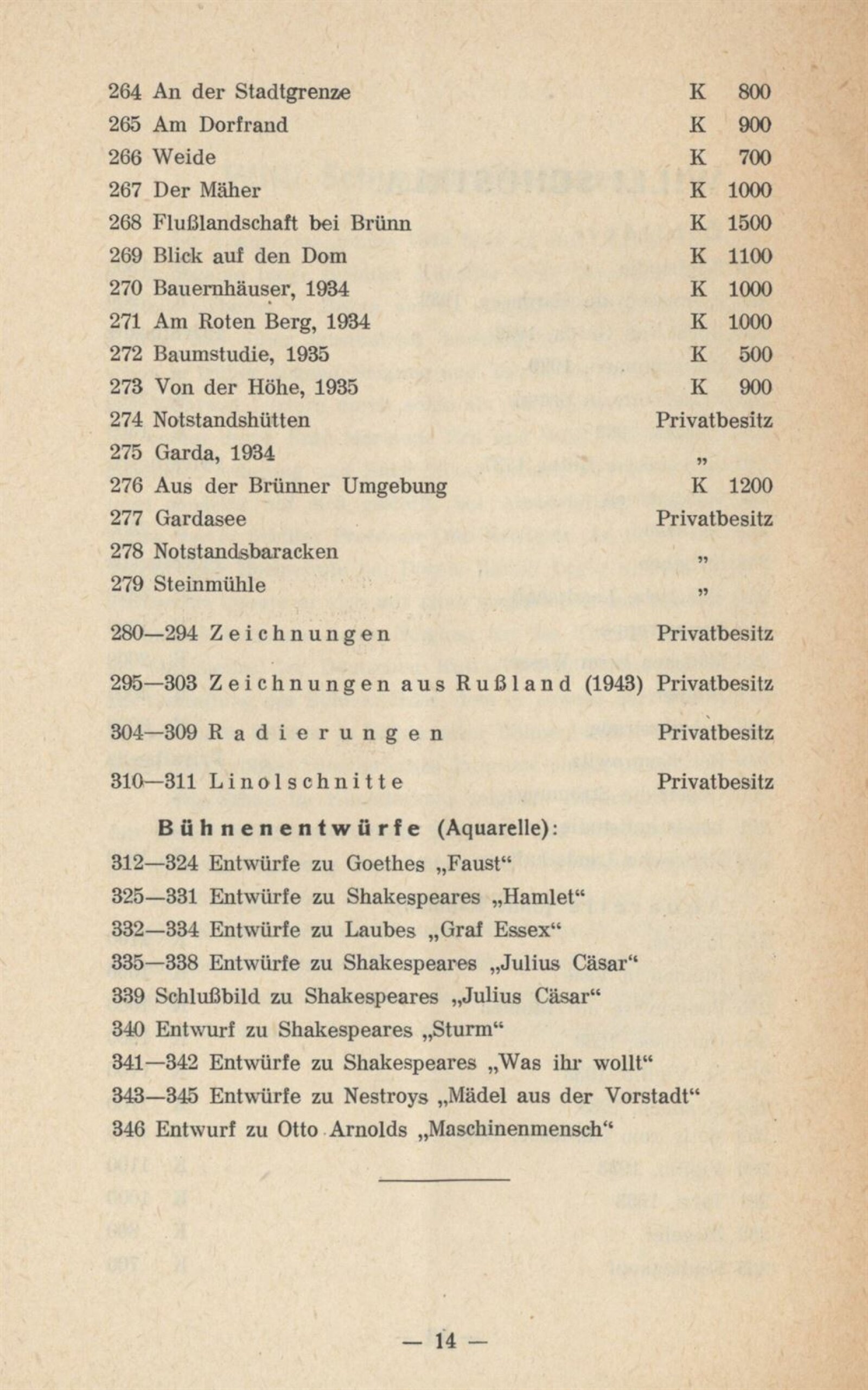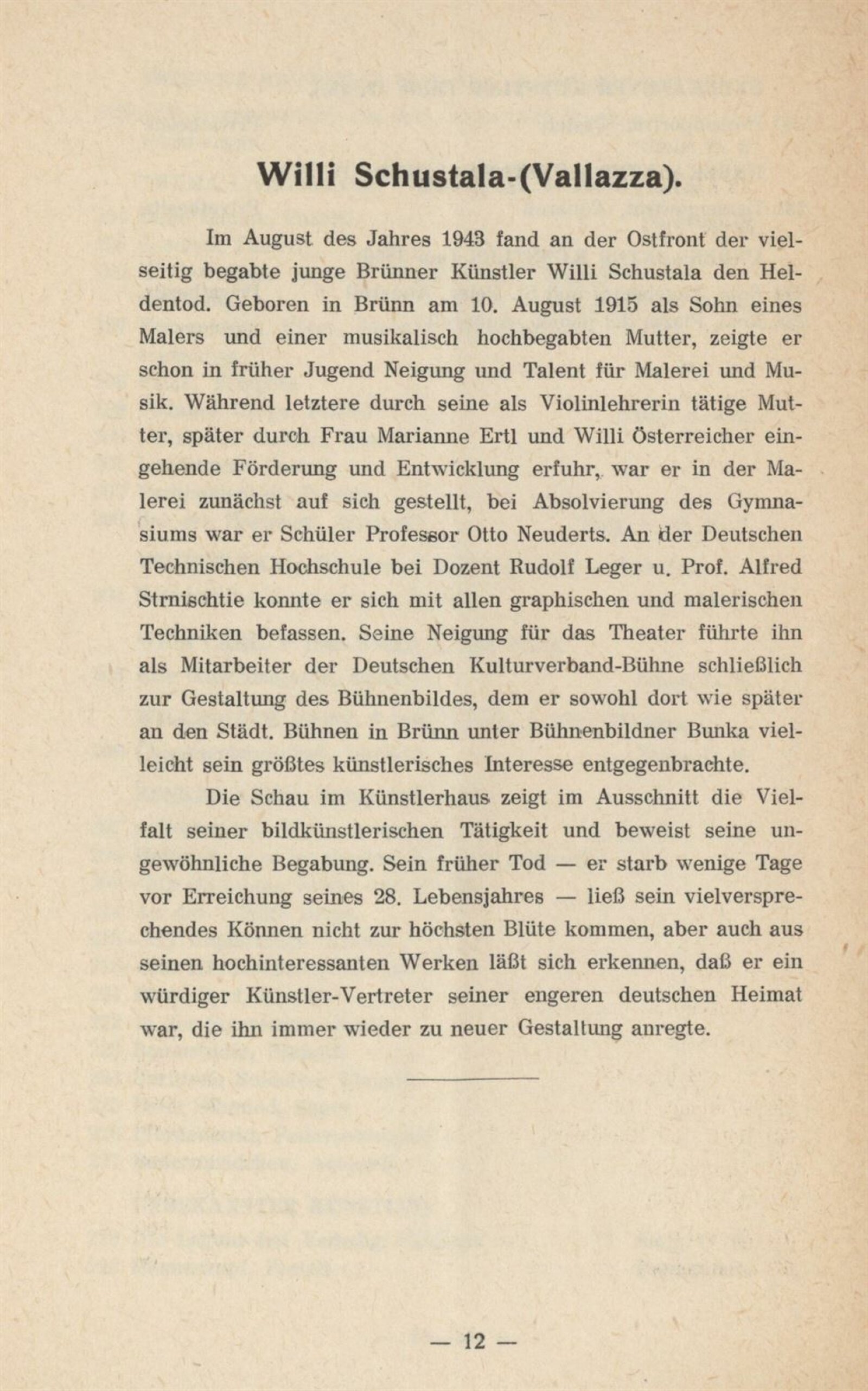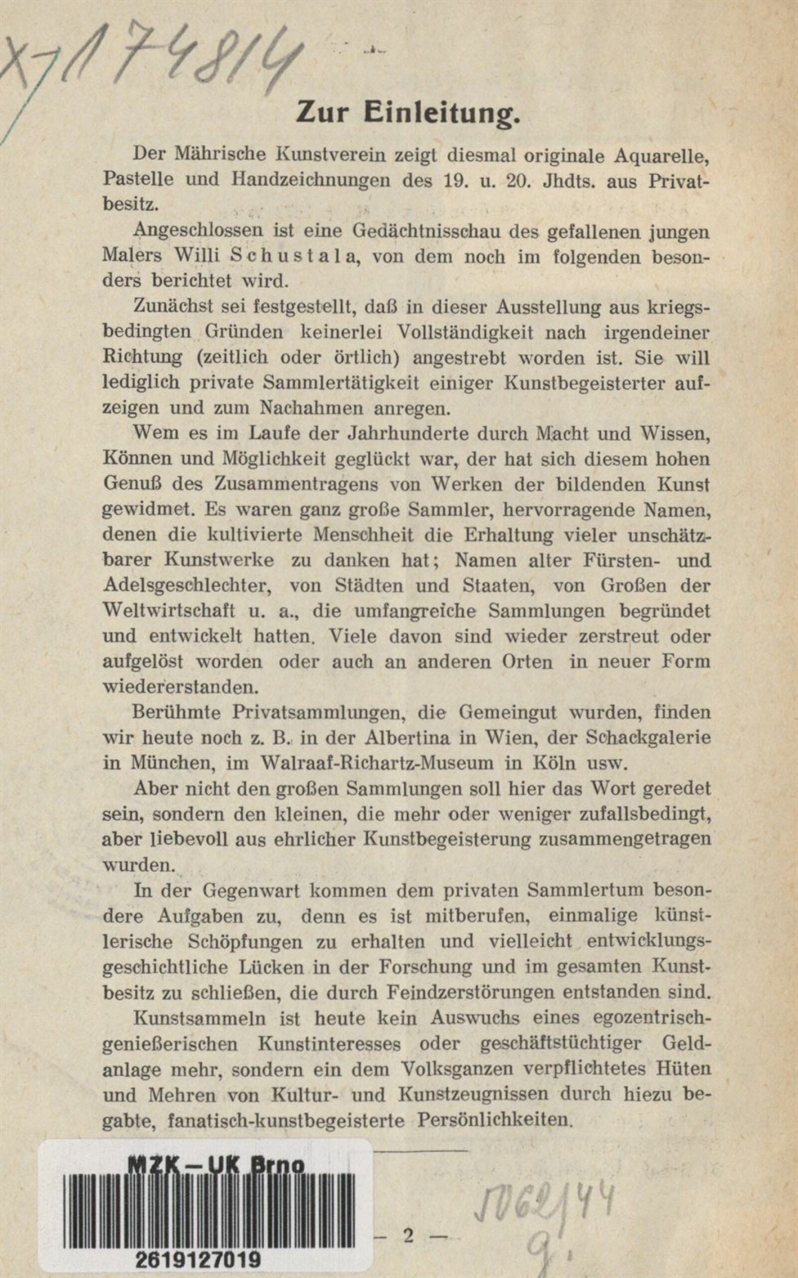 Aquarelle und Zeichnungen 19. u. 20. Jahrhundert aus Brünner Privatsammlungen und Gedächtnisschau Willi Schustala: Mährischer Kunstverein Brünn, Künstlerhaus, 20. 5. – 18. 6. 1944 / Brünn: Mährischer Kunstverein, 1944. – 14 s. – Kubíček 7967, MZK; UPM