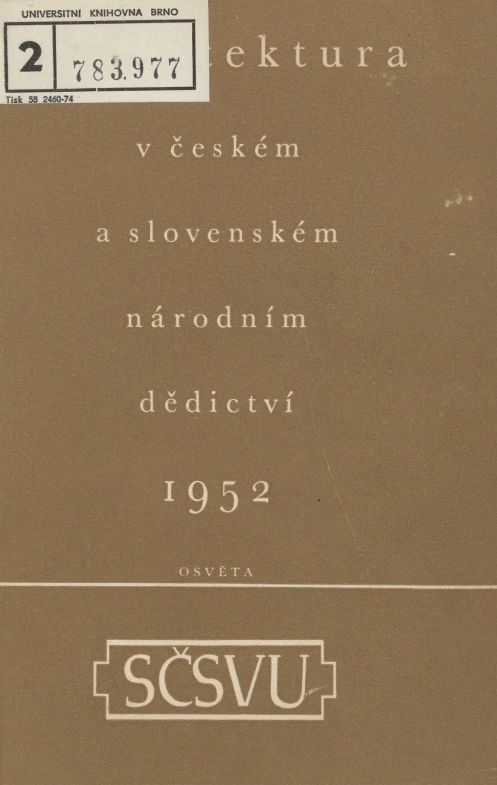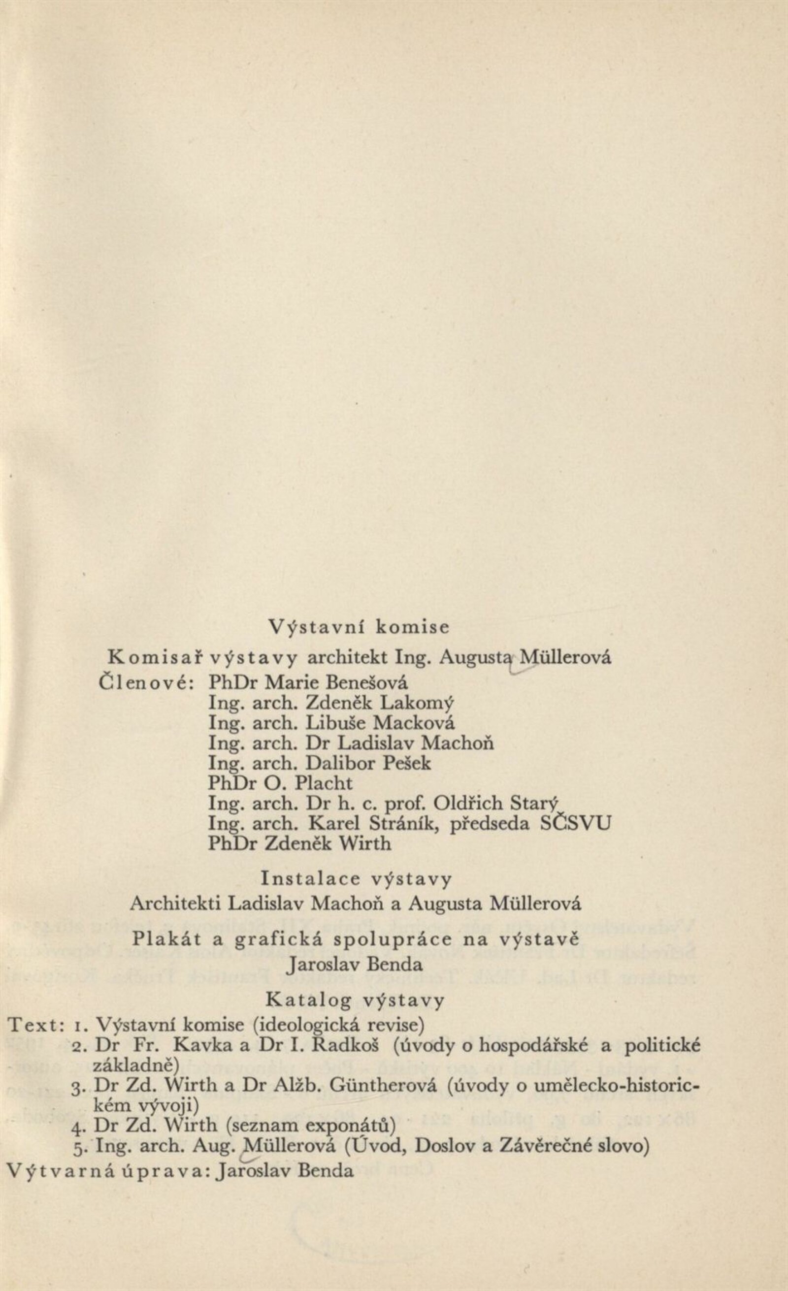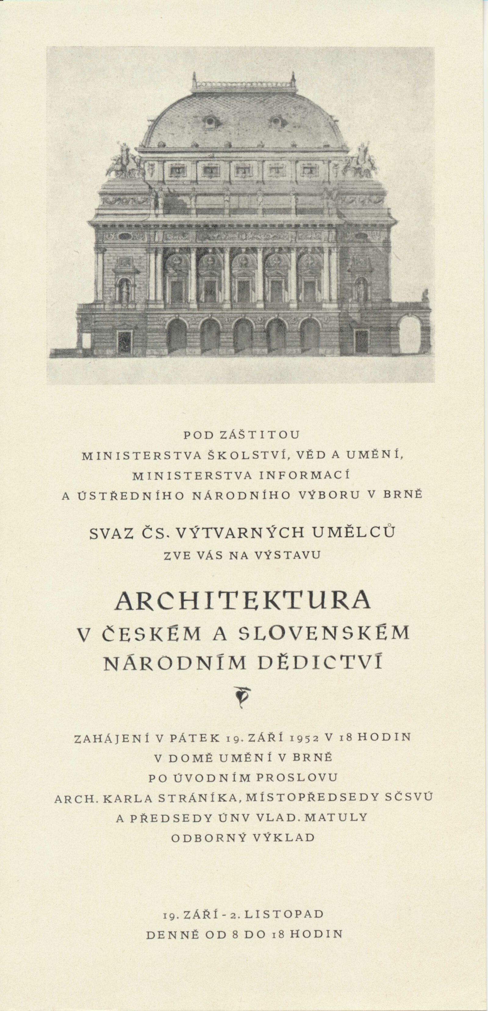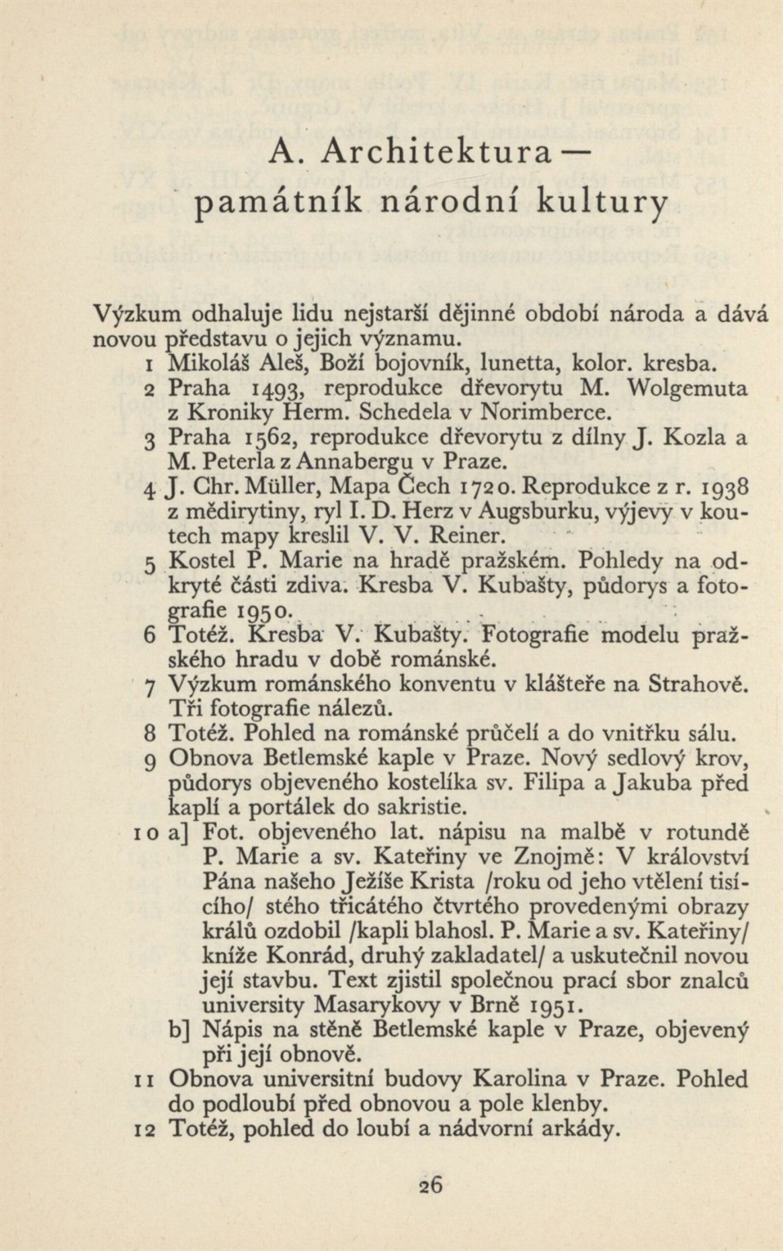 Architektura v českém a slovenském národním dědictví: Dům umění, 19. 9. – 2. 11. 1952 / Převzatý katalog. Architektura v českém a slovenském národním dědictví, palác u Hybernů, 1952 / Texty: Alžbeta Güntherová, František Kavka, Augusta Müllerová, I. Radkoš, Zdeněk Wirth. – Praha: Osvěta, 1952. – 90 s., 32 s. obr. příl., DU 177. – MZK; MG