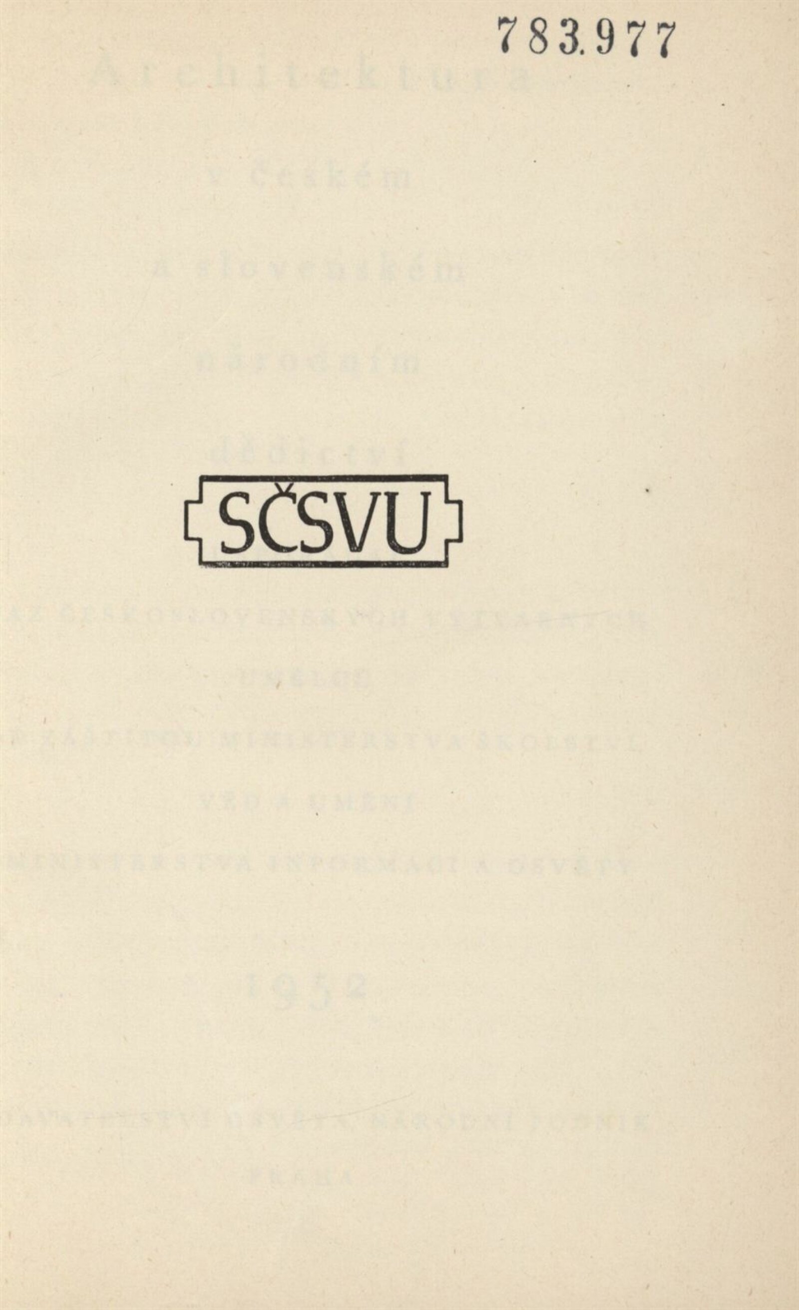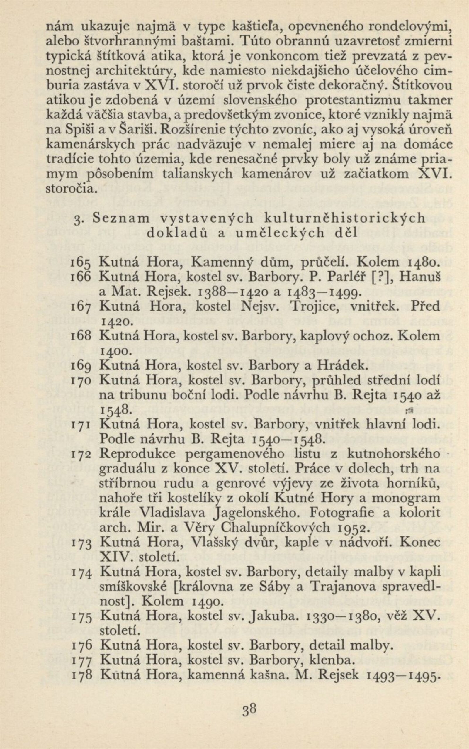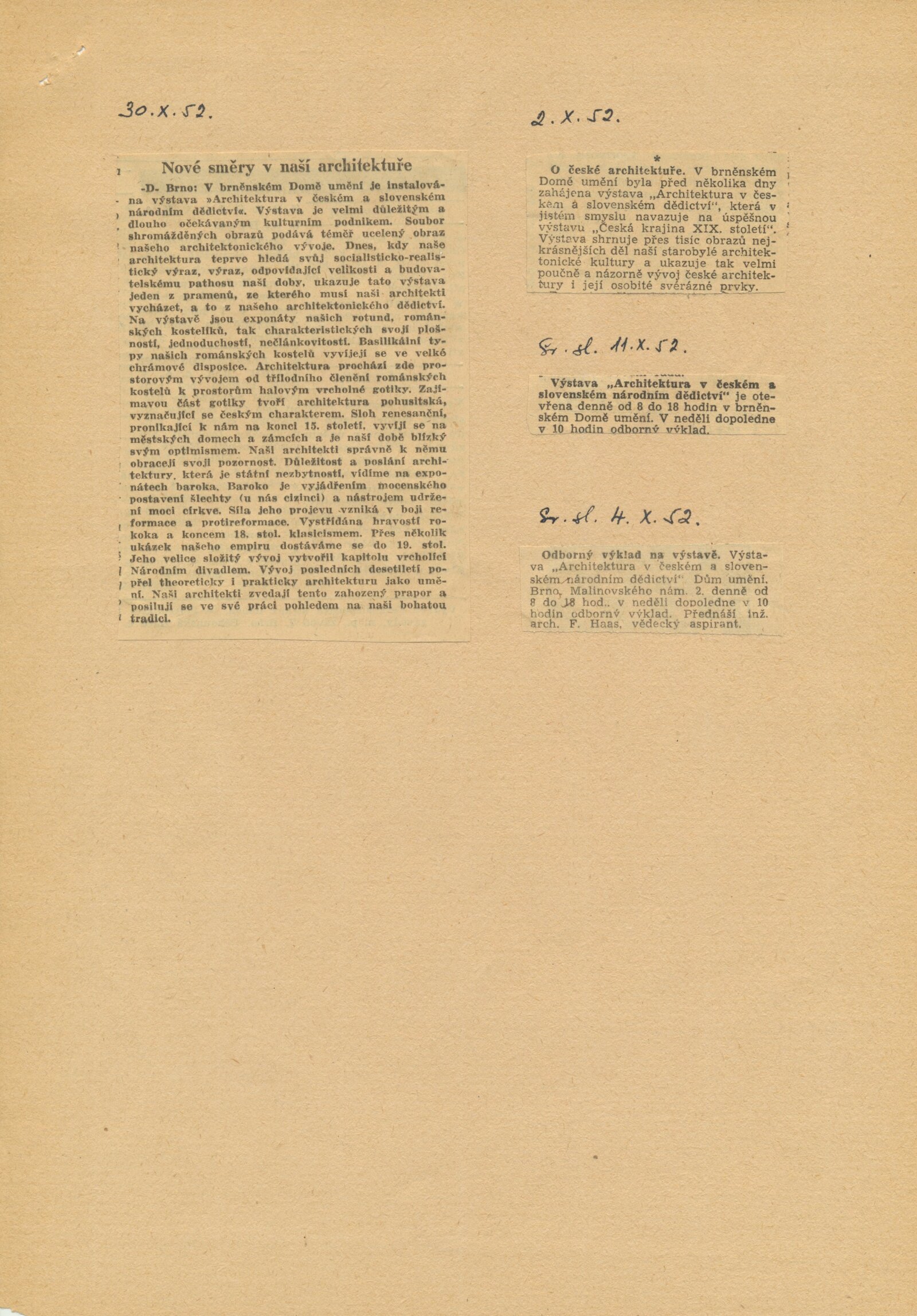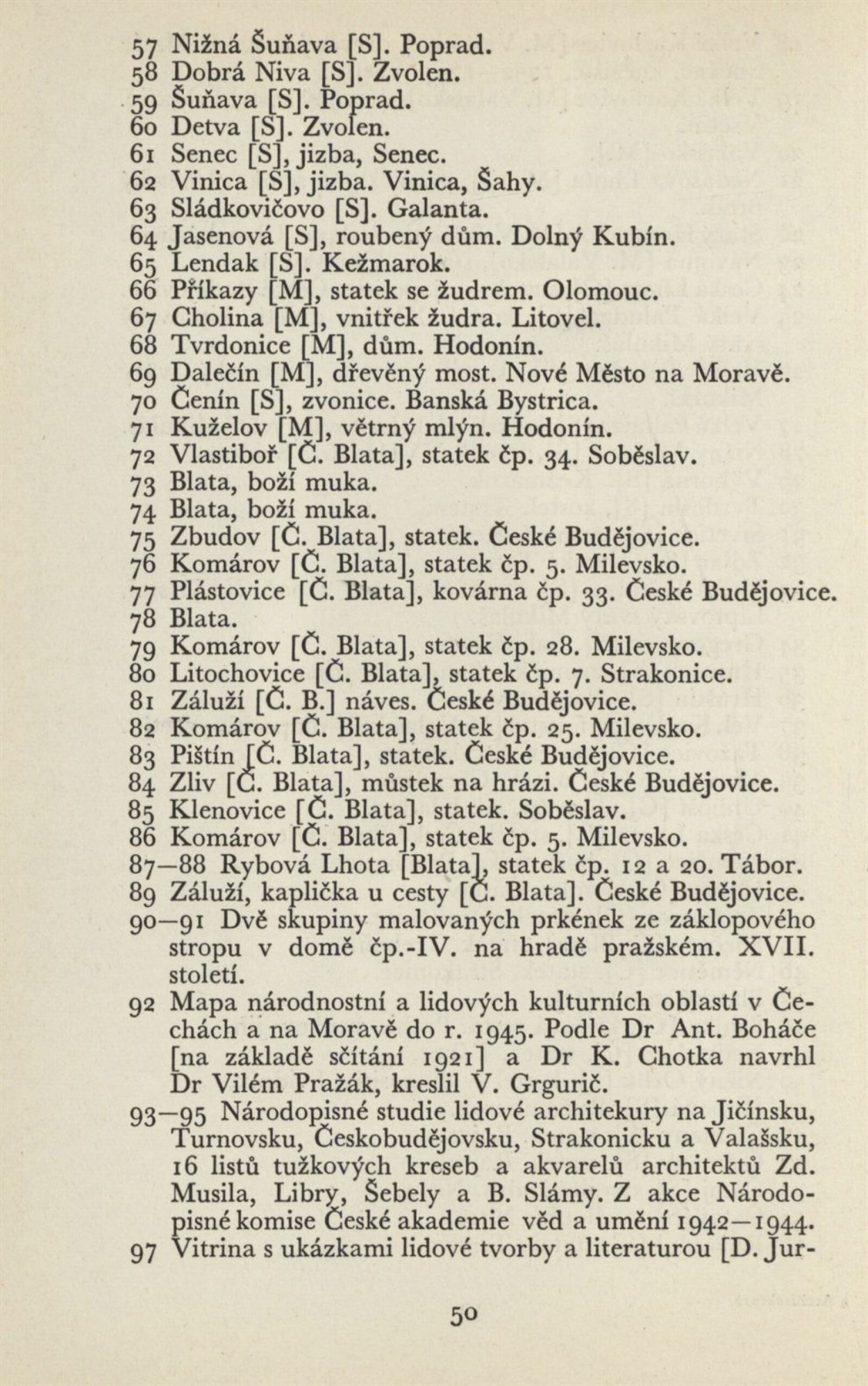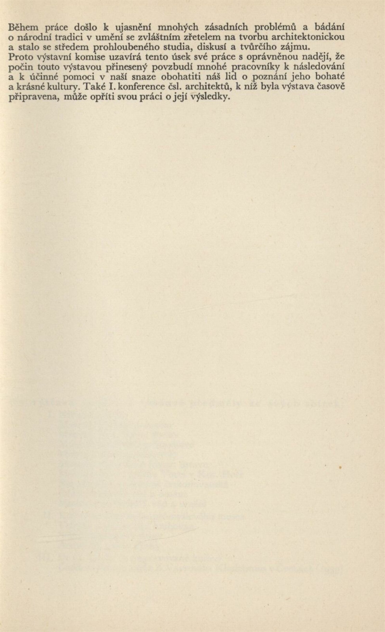 Architektura v českém a slovenském národním dědictví: Dům umění, 19. 9. – 2. 11. 1952 / Převzatý katalog. Architektura v českém a slovenském národním dědictví, palác u Hybernů, 1952 / Texty: Alžbeta Güntherová, František Kavka, Augusta Müllerová, I. Radkoš, Zdeněk Wirth. – Praha: Osvěta, 1952. – 90 s., 32 s. obr. příl., DU 177. – MZK; MG
