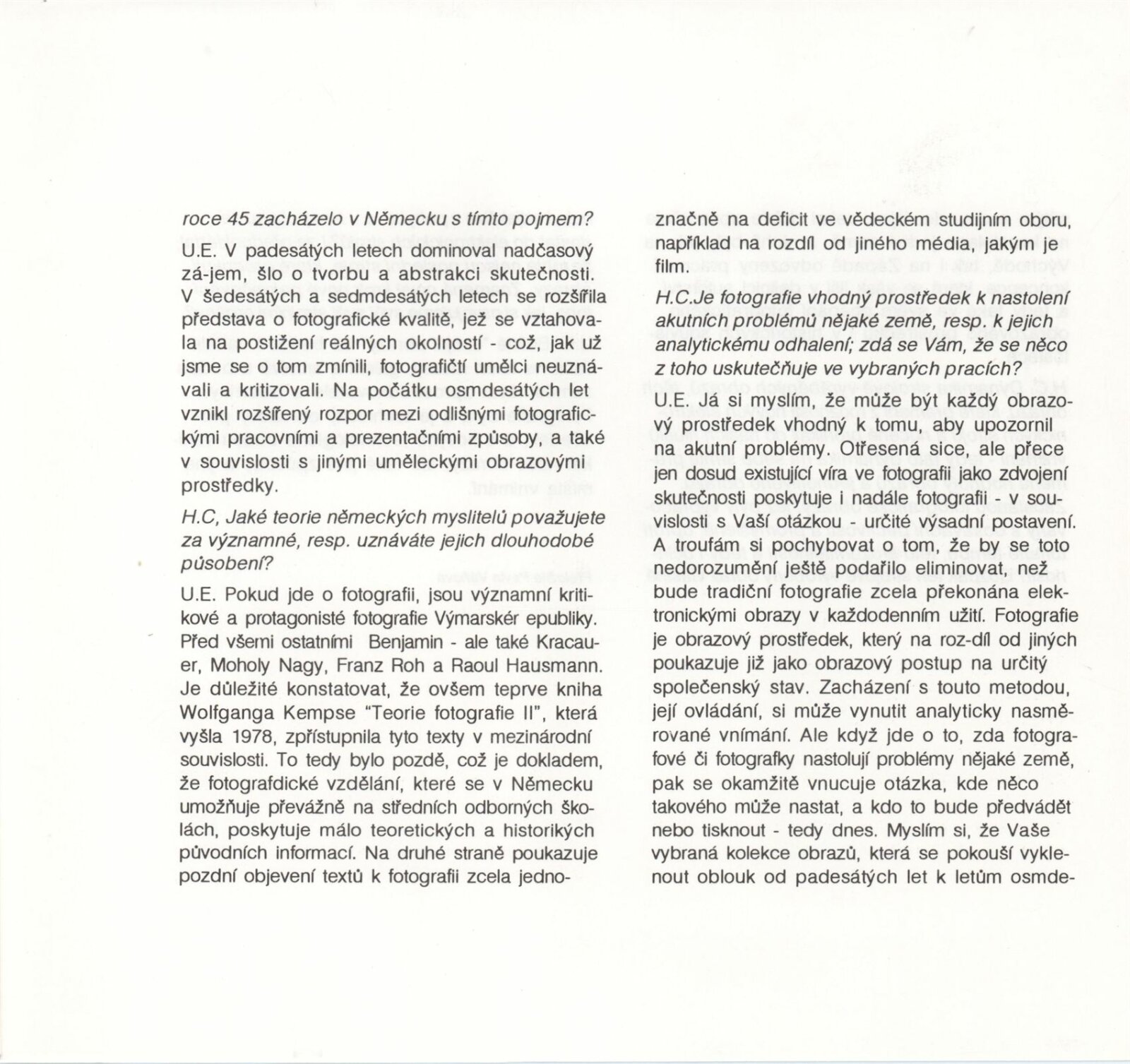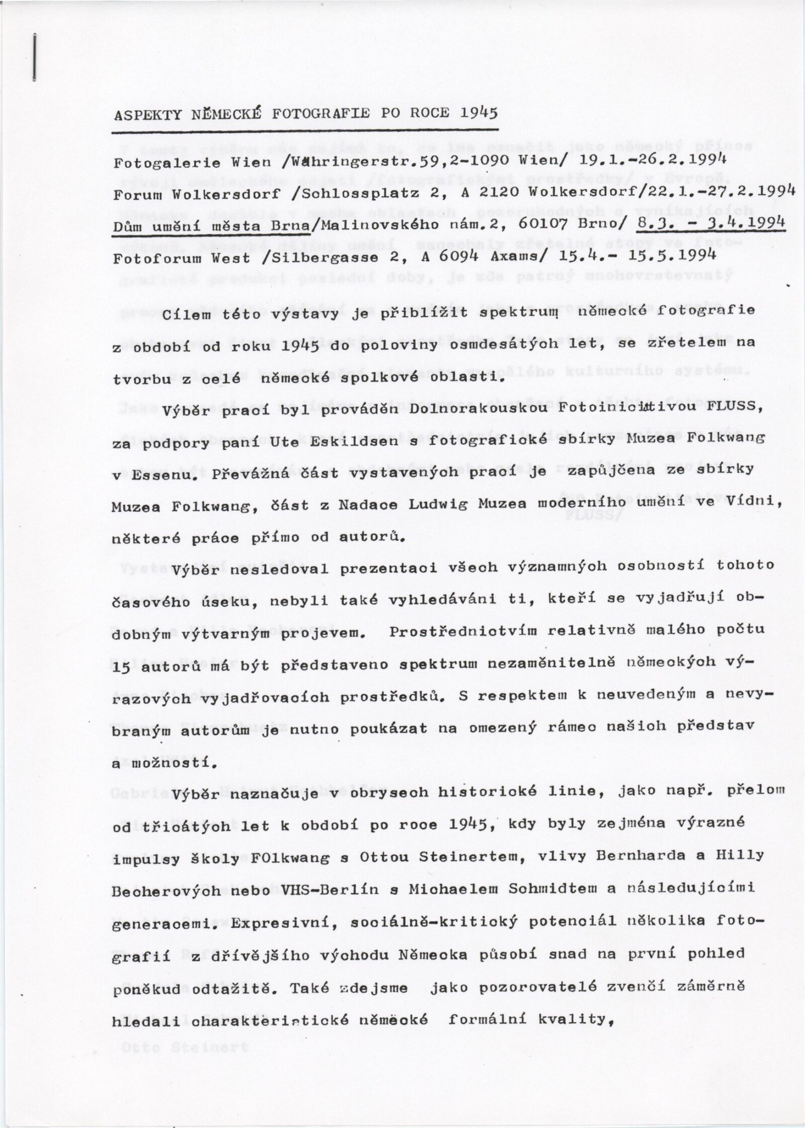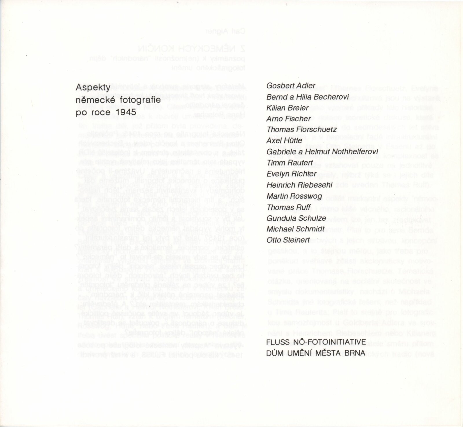 Aspekty německé fotografie po 1945: hala DU 8. 3. – 3. 4. 1994 Převzatý katalog Aspekte deutscher Fotografie nach 45 / Texty Carl Aigner, Ute Eskildsen. - Wien: FLUSS NÖ-Fotoinitiative - [82] s., obr., jako vložka český překlad textů Aspekty německé fotografie po roce 1945 [8] s. DU 963