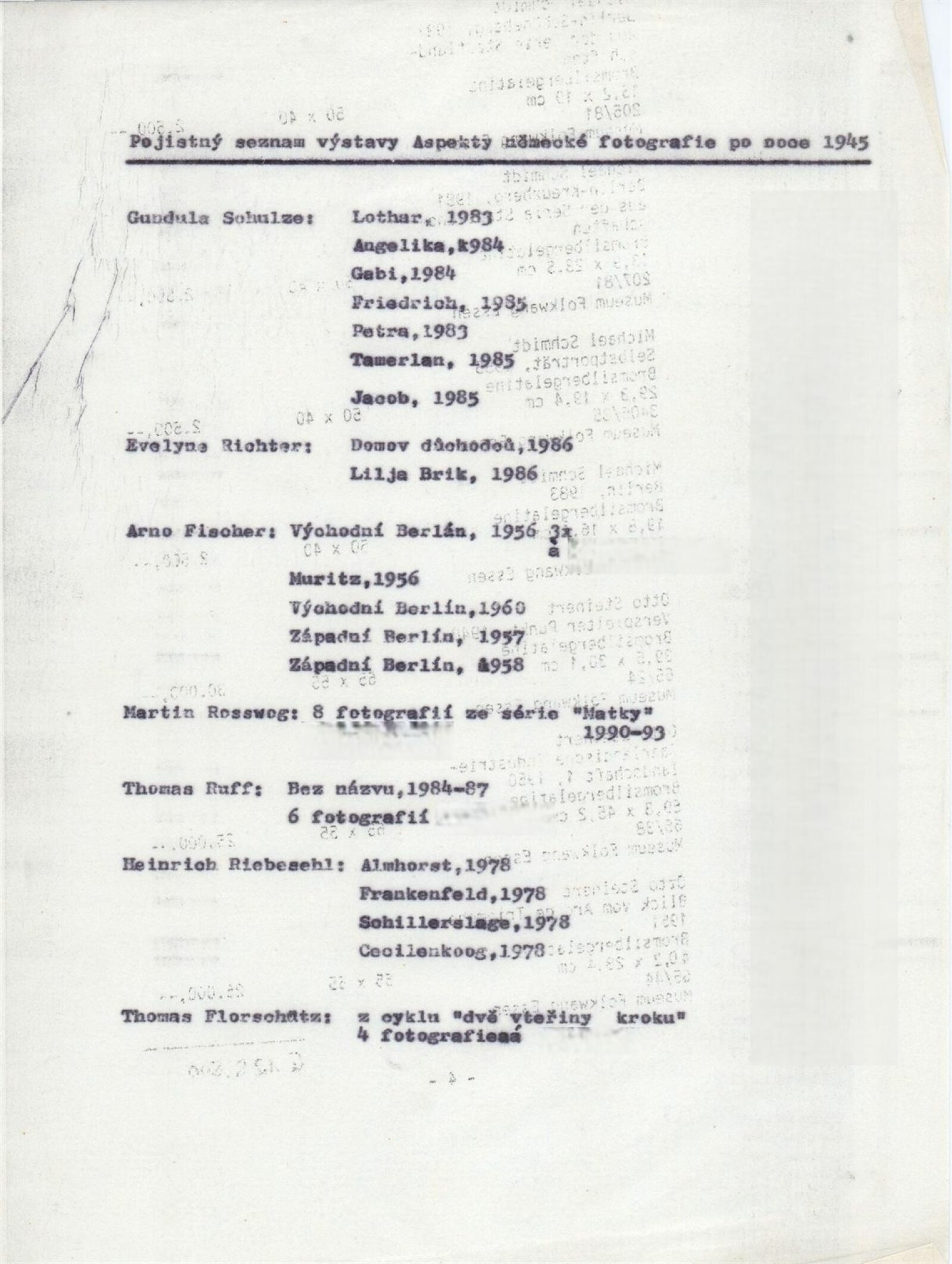 Gosbert Adler, Bernd a Hilla Becherovi, Kilian Breier, Arno Fischer, Thomas Florschuetz, Axel Hütte, Gabriele a Helmut Nothhelferovi, Timm Rautert, Evelyn Richter, Heinrich Riebesehl, Martin Rosswog, Thomas Ruff, Gundula Schulze, Michael Schmidt, Otto Steinert