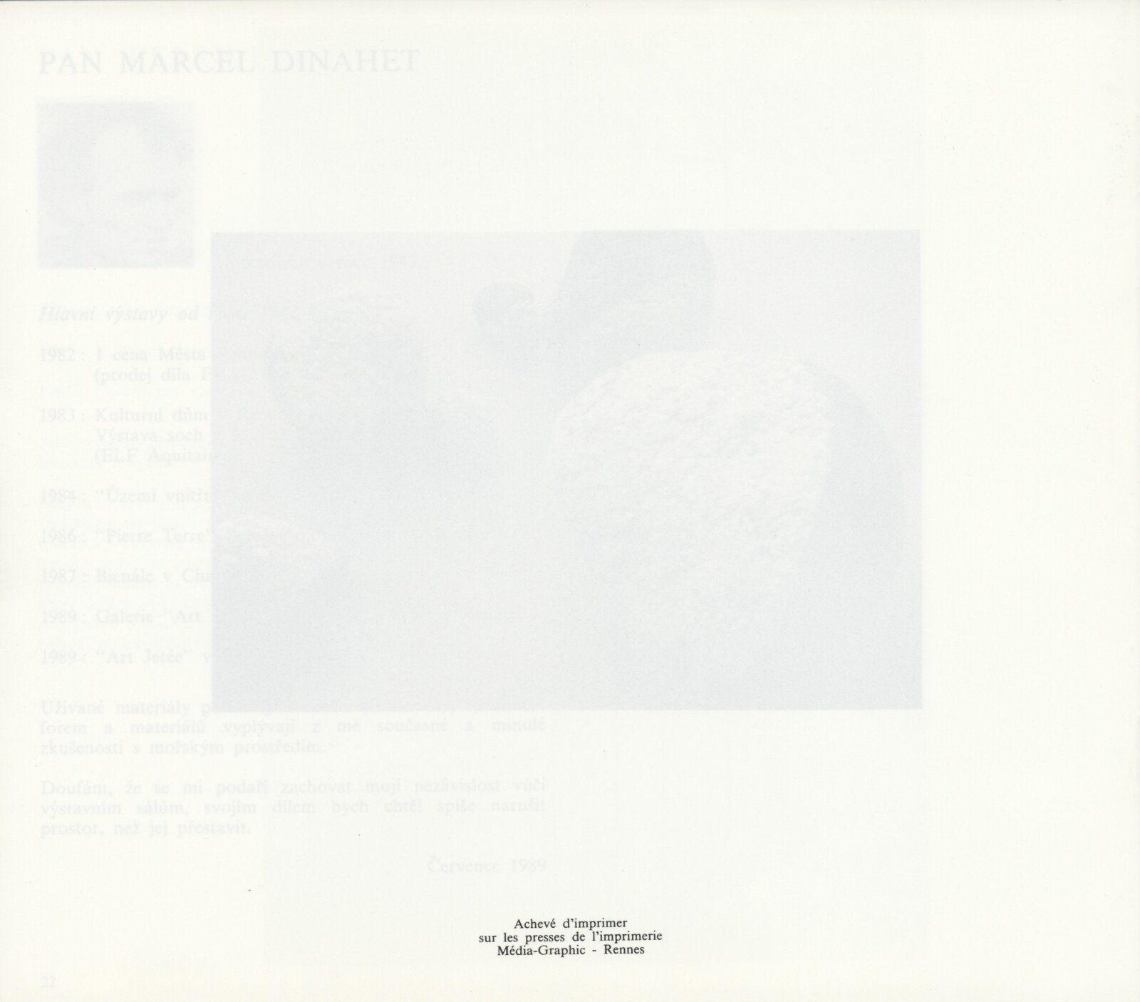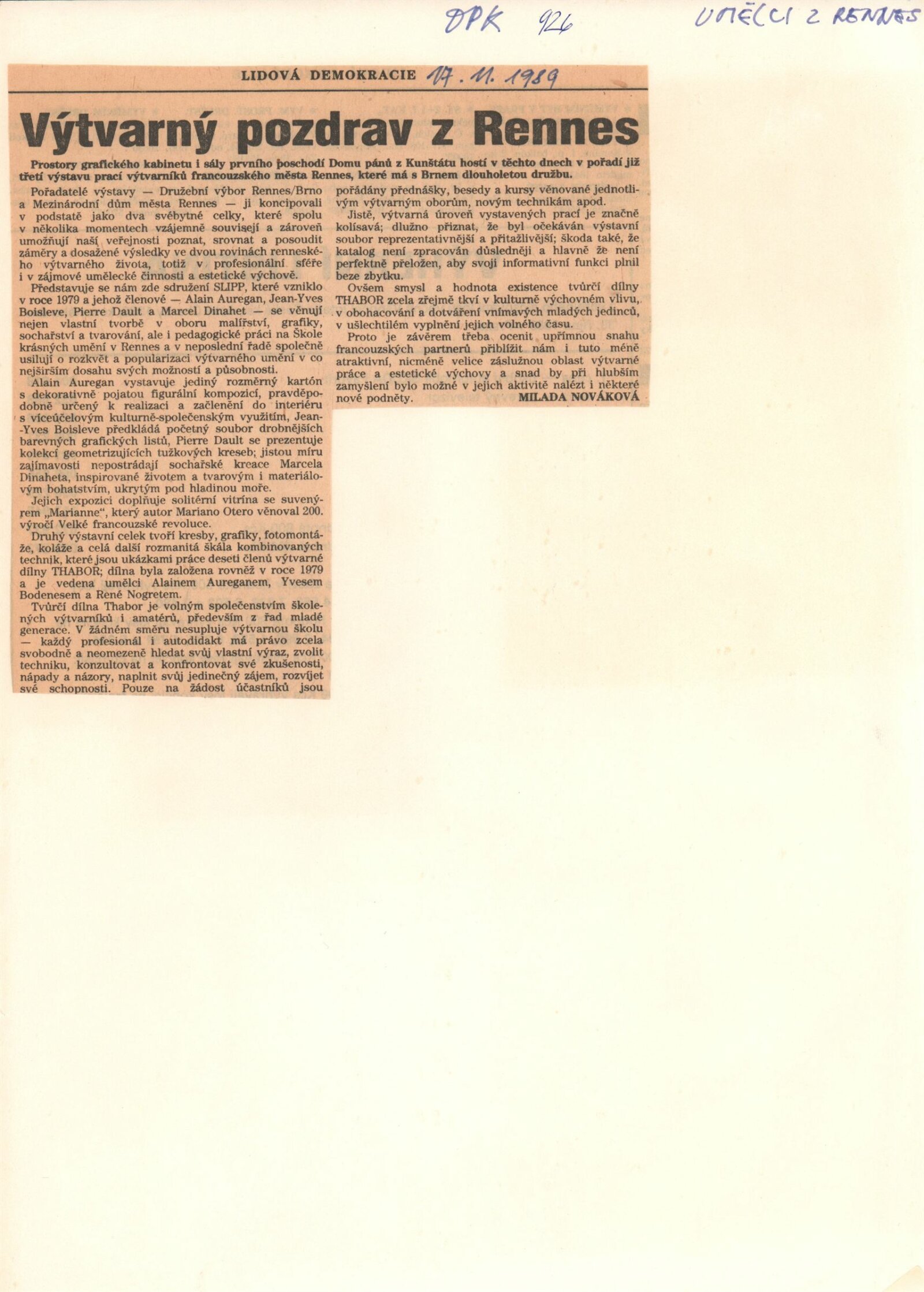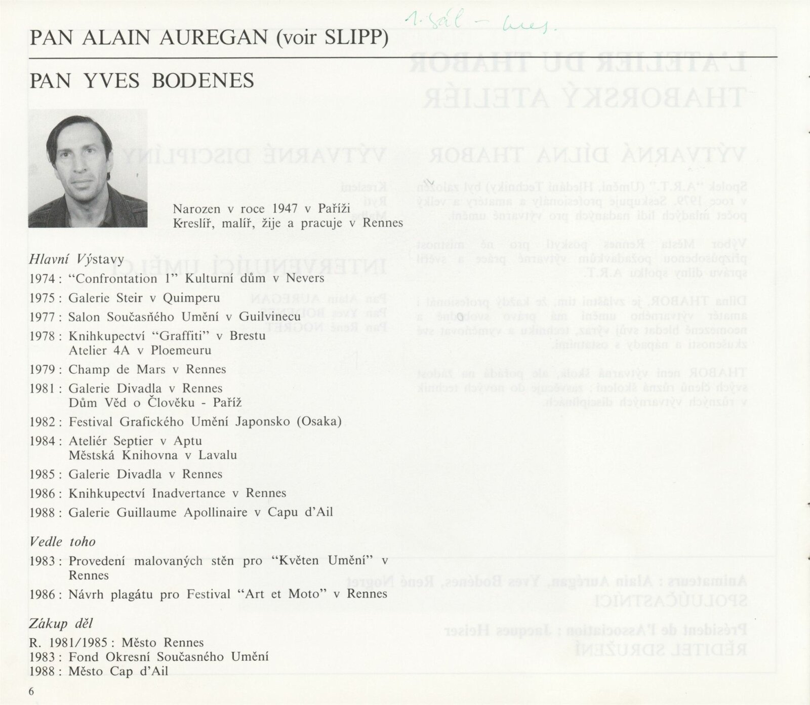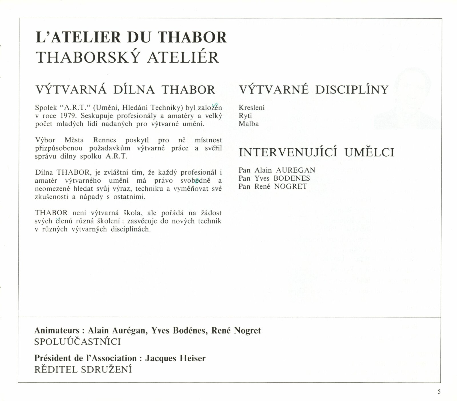 Pozvánka (5 ks, Thabor 2 ks, S.L.I.P.P), katalog (2 ks, Umělci z Rennes - dohromady oba ateliéry), plakát (2 ks), strojopis pozvánek (2 ks), pozvánka na tiskovou konferenci (strojopis), fotografie z vernisáže, seznam exponátů výstavy (ručně), pojistný seznam (FR), korespondence, zápisy o přípravě výstavy, rozhodnutí o konání výstavy, seznam vystavujících umělců (FR), recenze v tisku, poznámky k výstavě, informace o Atelier du Thabor, katalog La S.L.I.P.P (1981)