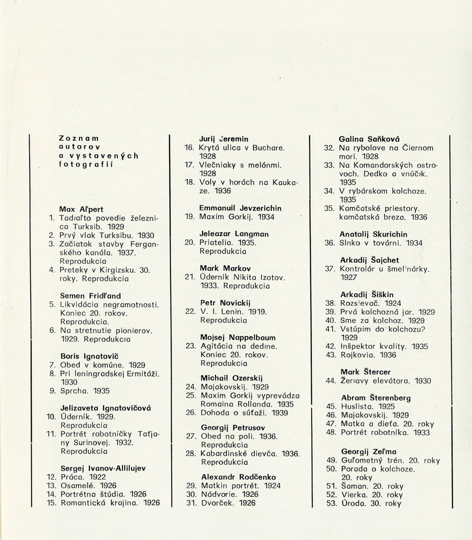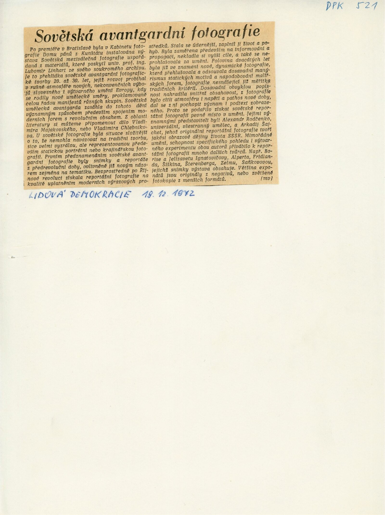 Avantgardní sovětská fotografie 20. a 30. let: Dům umění města Brna / Dům pánů z Kunštátu, 126. výstava Kabinetu fotografie Jaromíra Funka, 1. 12. 1972 – 1. 1. 1973 / Převzatý katalog. Sovietska medzivojnová fotografia: 37. výstava komorní galerie fotografie Profil v Bratislavě, listopad 1972 / Text: Lubomír Linhart. – Bratislava: Mestský dom kultúry a osvety, 1972. – 16 s., obr., DPK 521