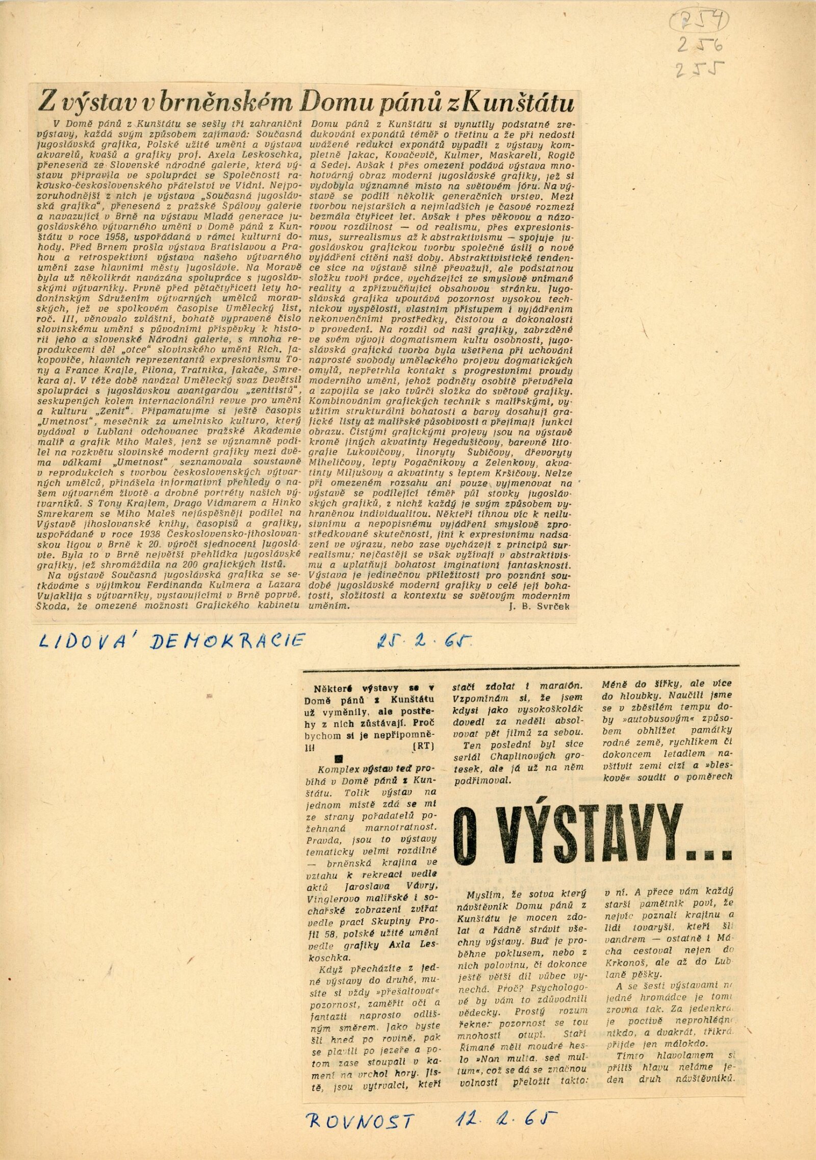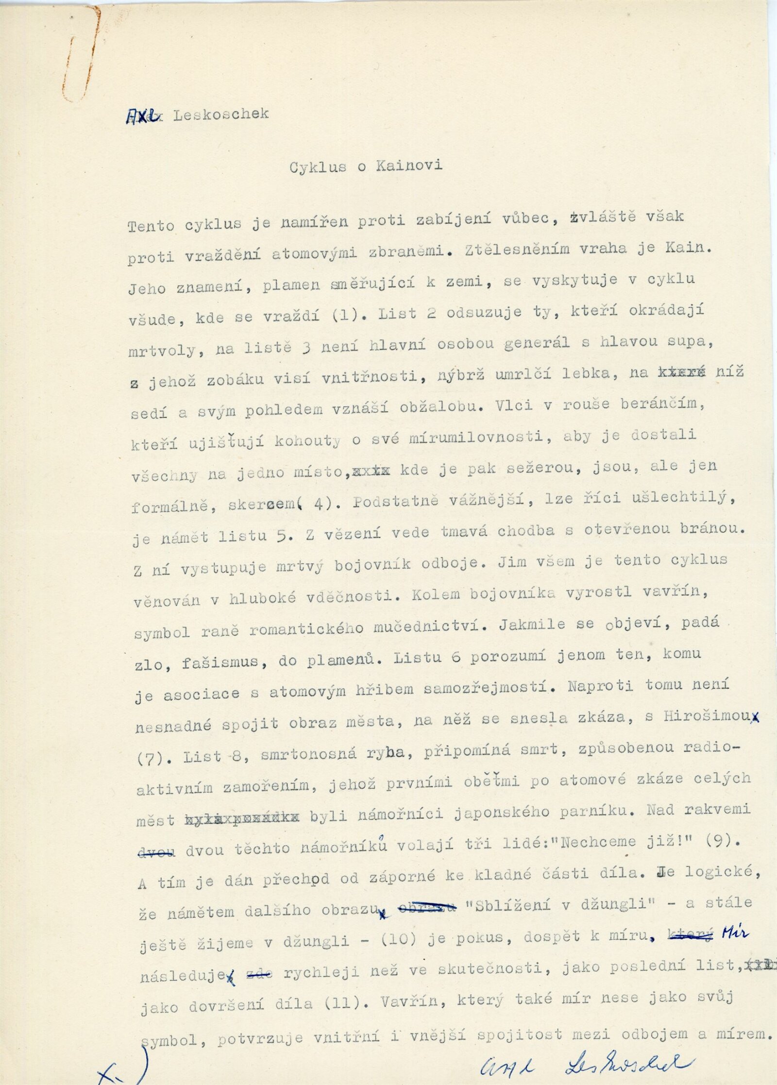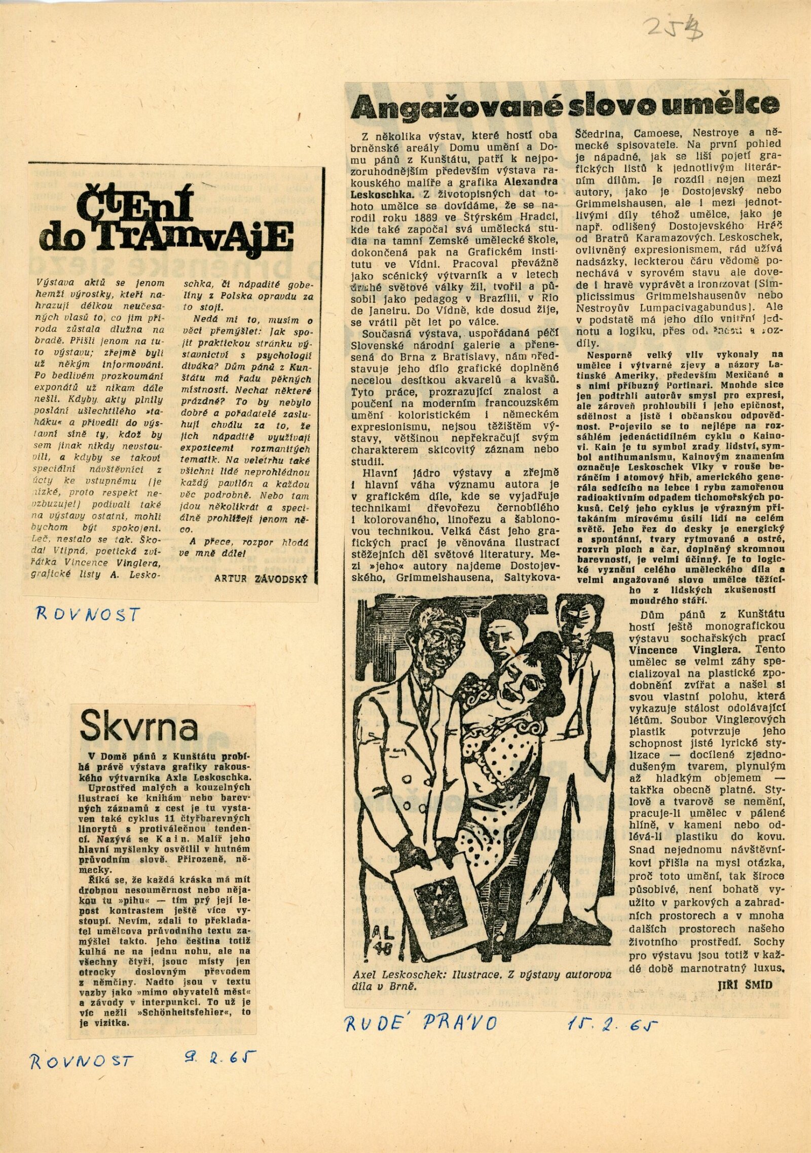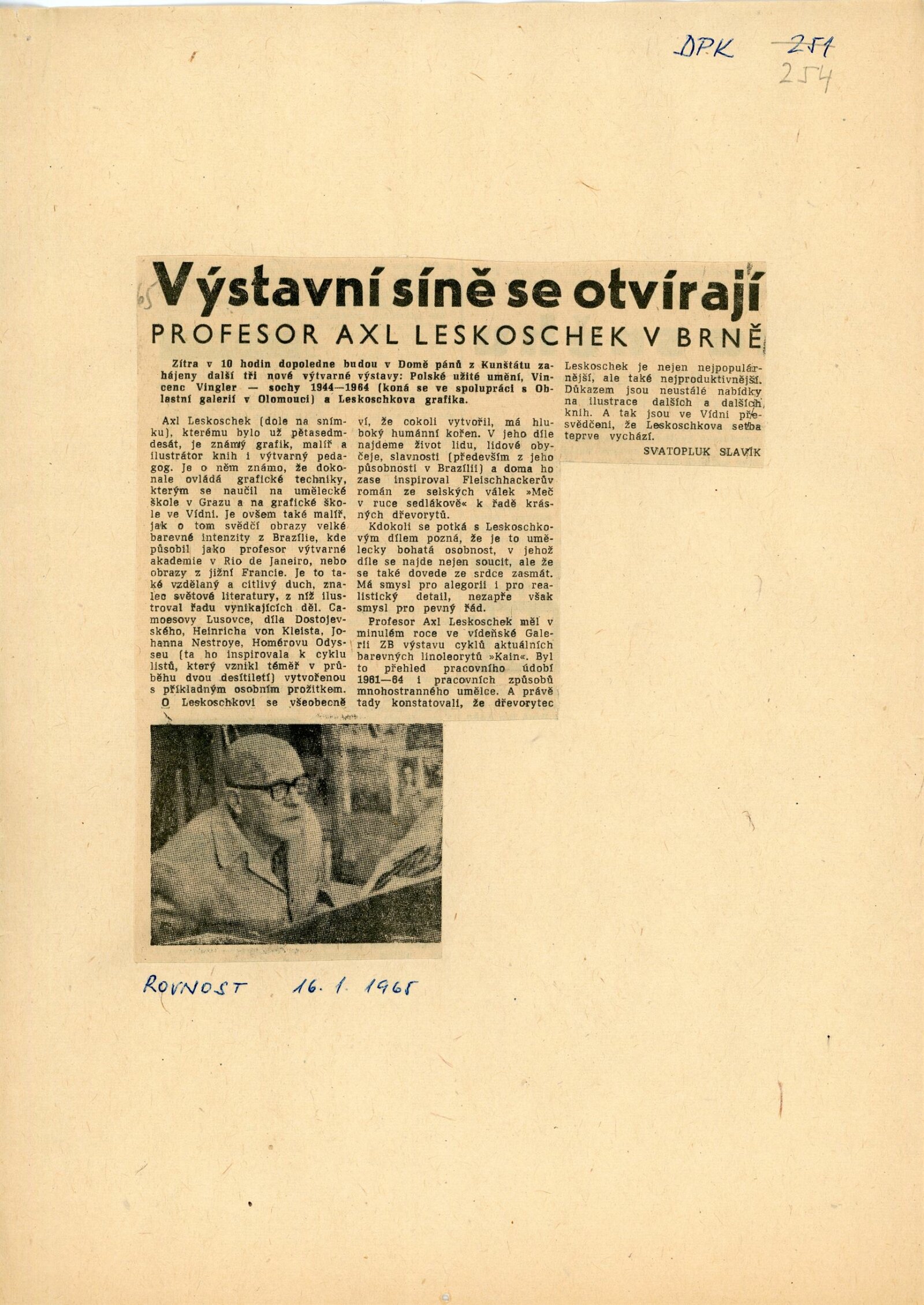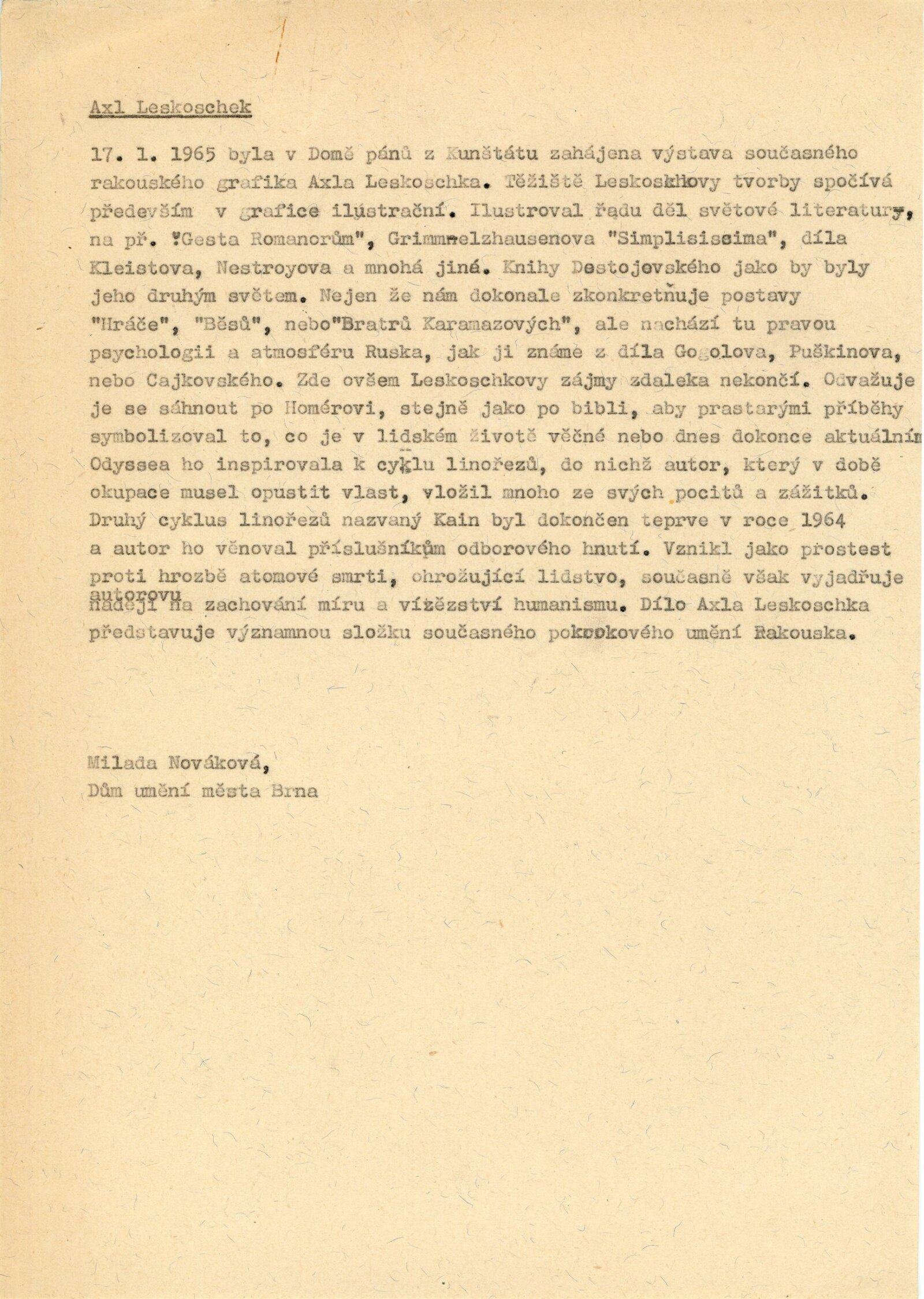 Axl Leskoschek. Grafika /AU/: Dům umění města Brna / Dům pánů z Kunštátu, 1. patro, 17. 1. – 21. 2. 1965 / Katalog nezjištěn. Katalog olomoucké výstavy. Alex Leskoschek: Oblastní galerie Olomouc, duben–květen 1965 / Text: anonymní. – Olomouc: Oblastní galerie, 1965. – 4 s., obr., DPK 254. – MZK; MG