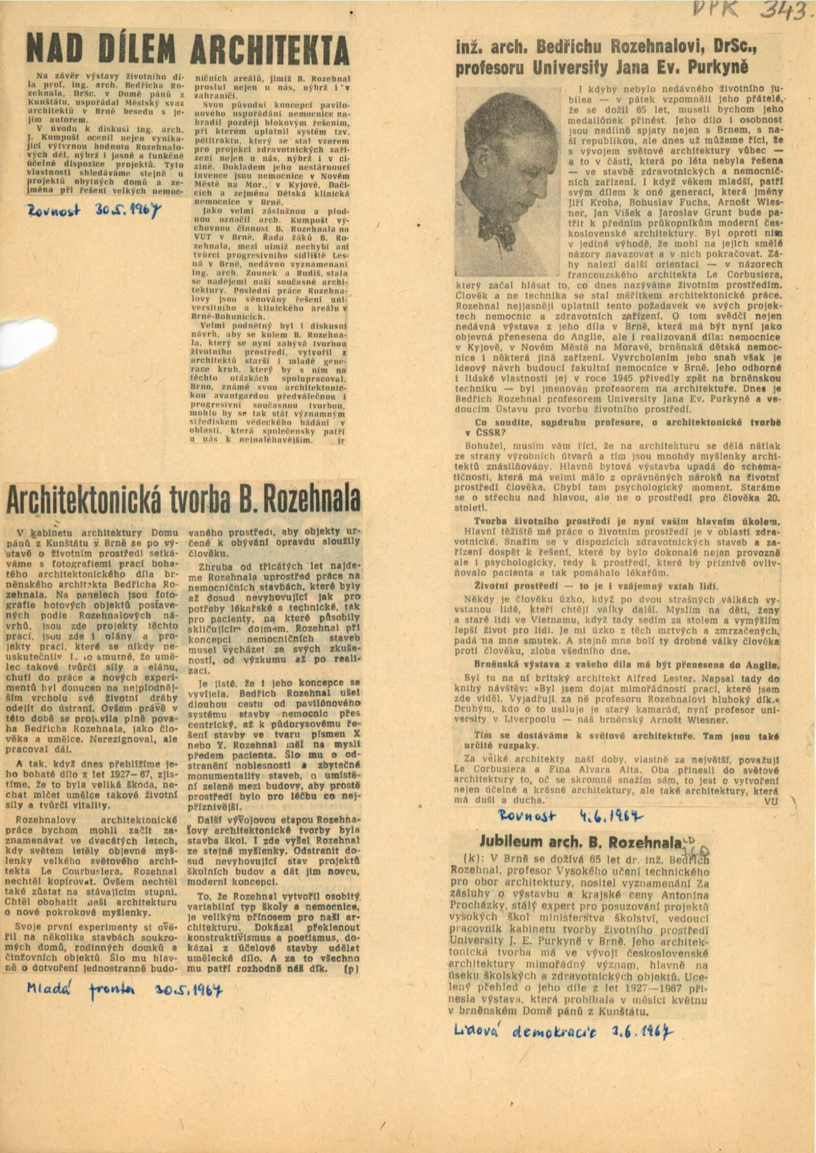 Bedřich Rozehnal. Architektonická tvorba 1927–1967: Dům umění města Brna/ Dům pánů z Kunštátu, Kabinet architektury Svazu architektů ČSSR, 5. 5. – 28. 5. 1967/ Text: Zdeněk Kudělka. – Brno: Svaz architektů ČSSR, 1967. – 20 s., obr., 4 s., obr., DPK 343. – MZK; MG