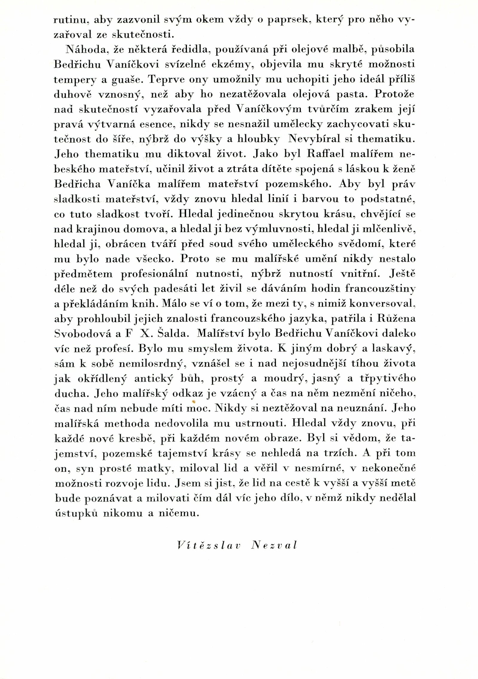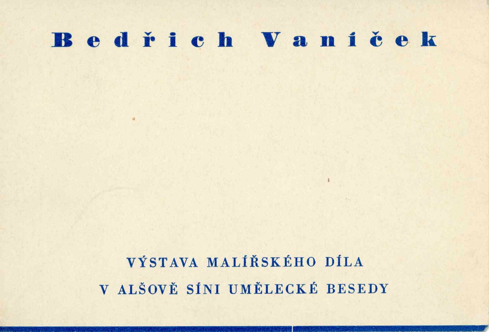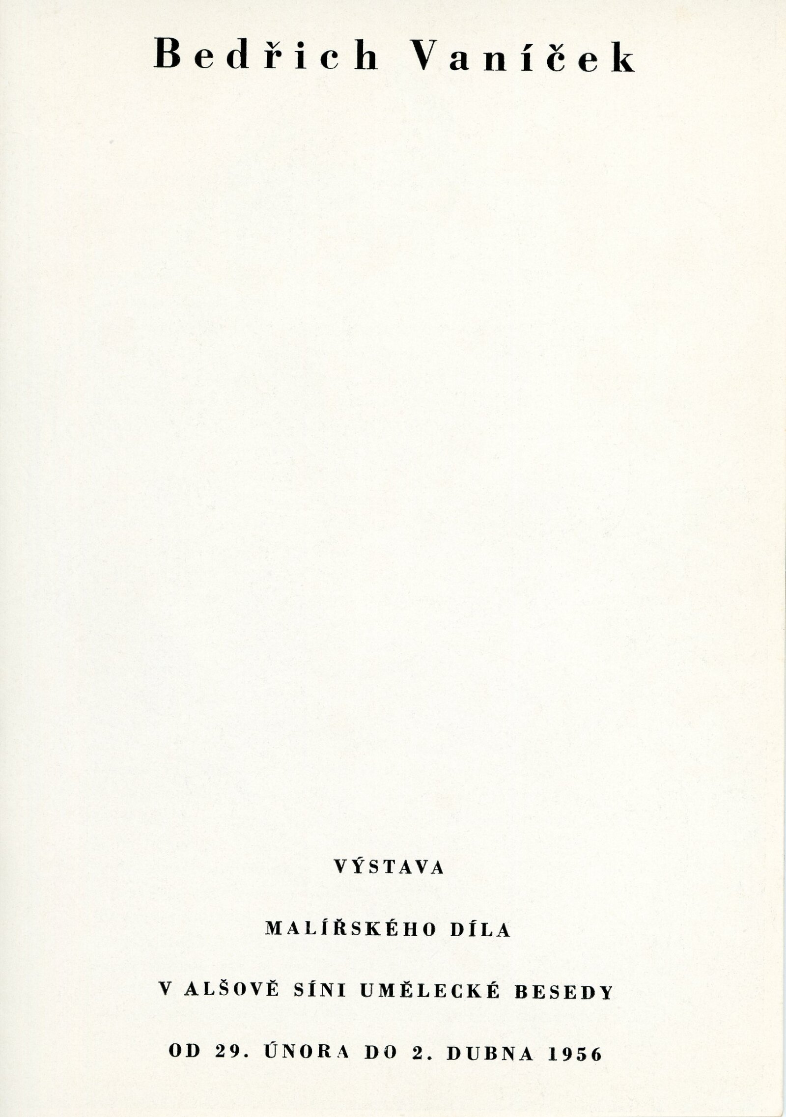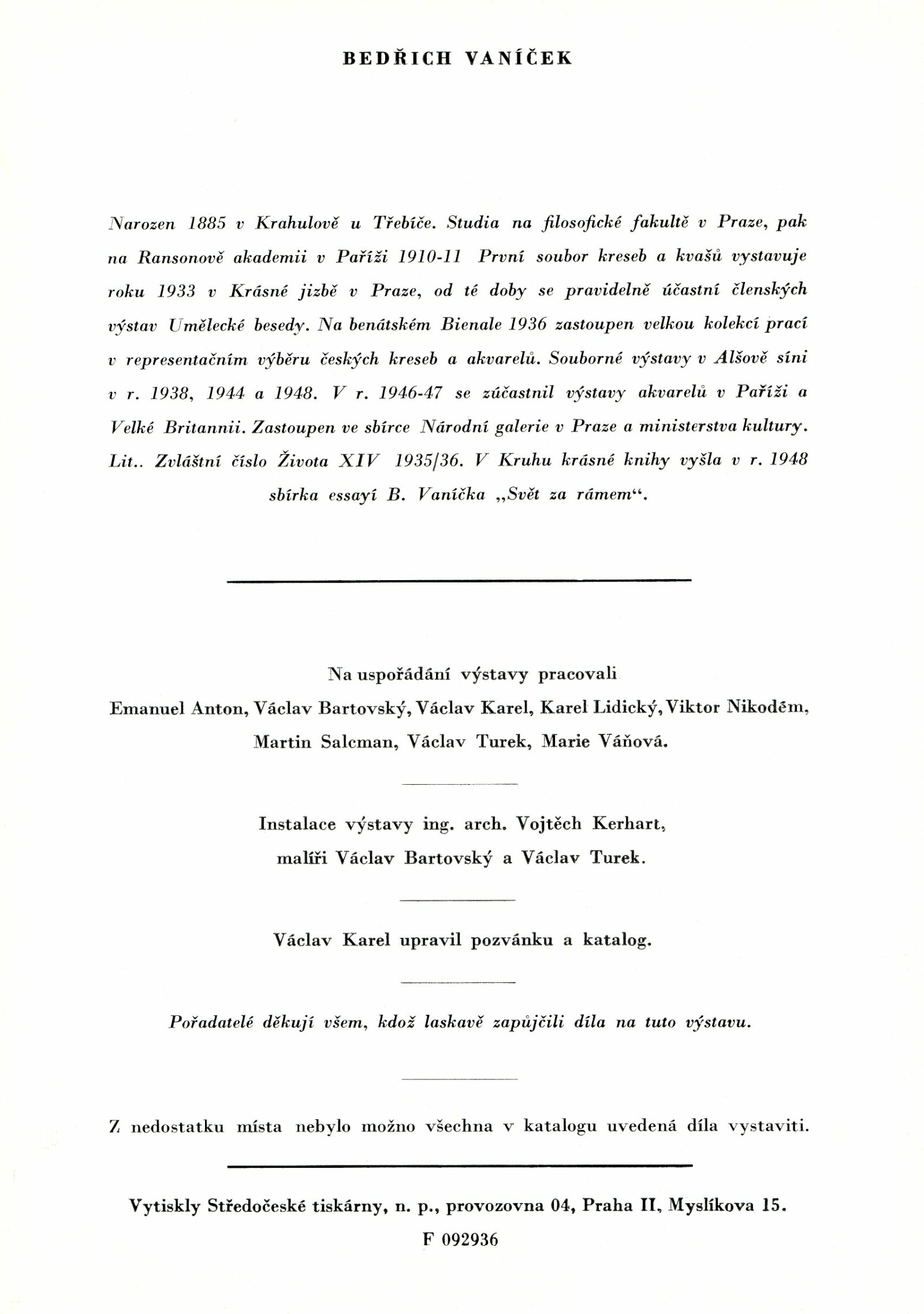 Bedřich Vaníček. Posmrtná výstava: Dům umění města Brna, 27. 5. – 15. 7. 1956 / Převzatý katalog. Bedřich Vaníček. Výstava malířského díla: Alšova síň Umělecké besedy, 29. 2. – 2. 4. 1956 / Texty: Vítězslav Nezval, Václav Bartovský, Viktor Nikodem. – Praha: Umělecká beseda, 1956. – 24 s., obr., DU 253. – MG