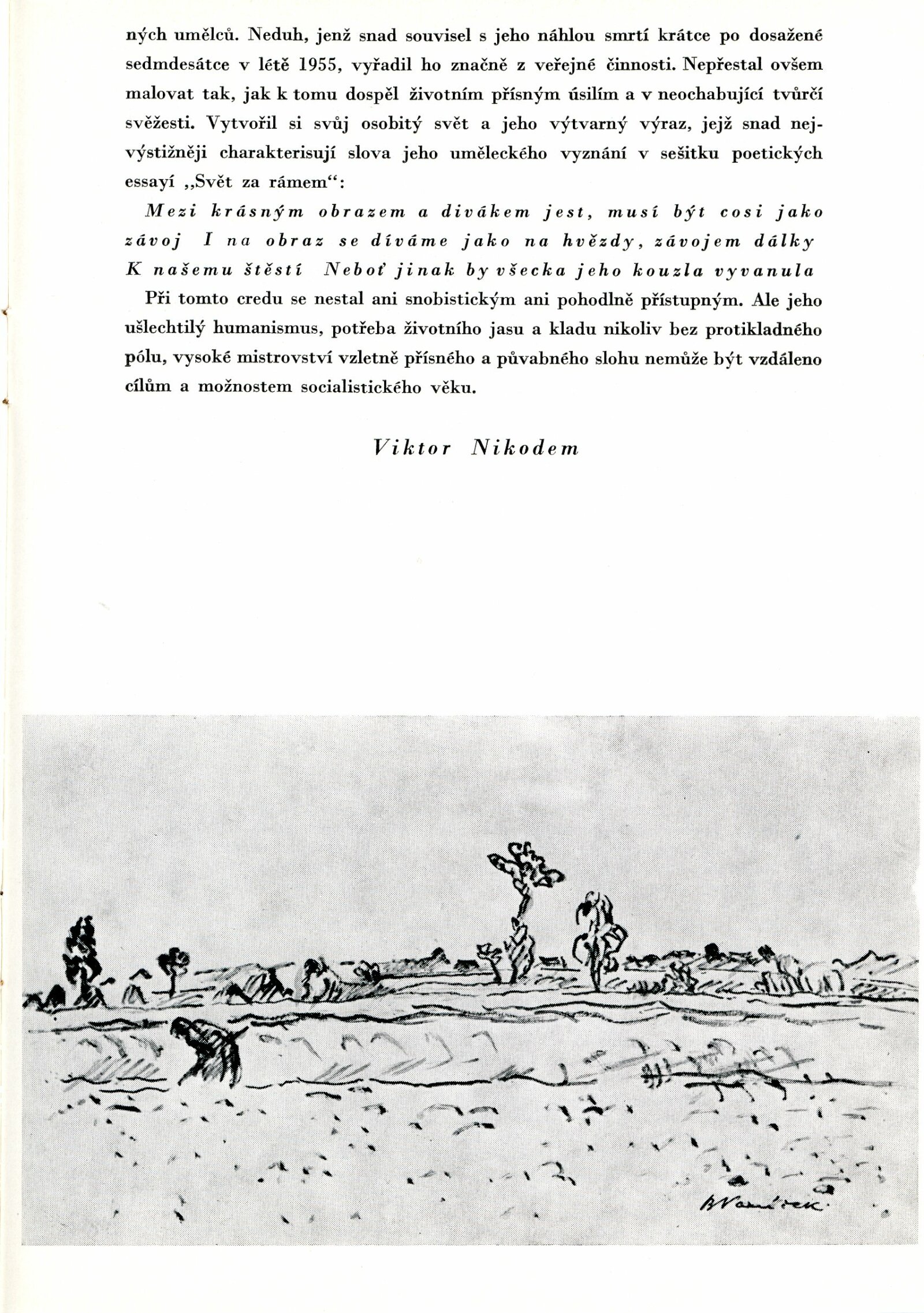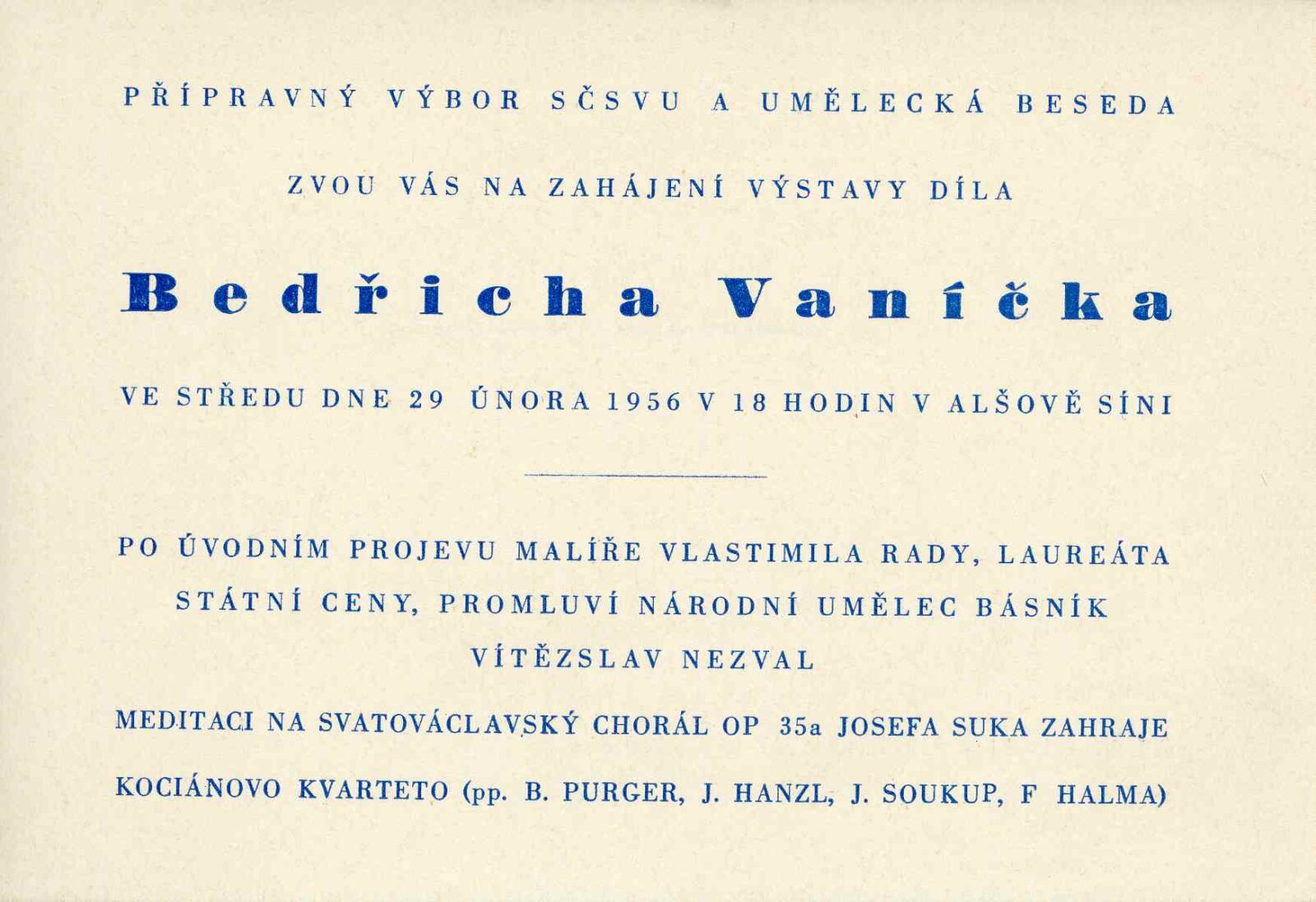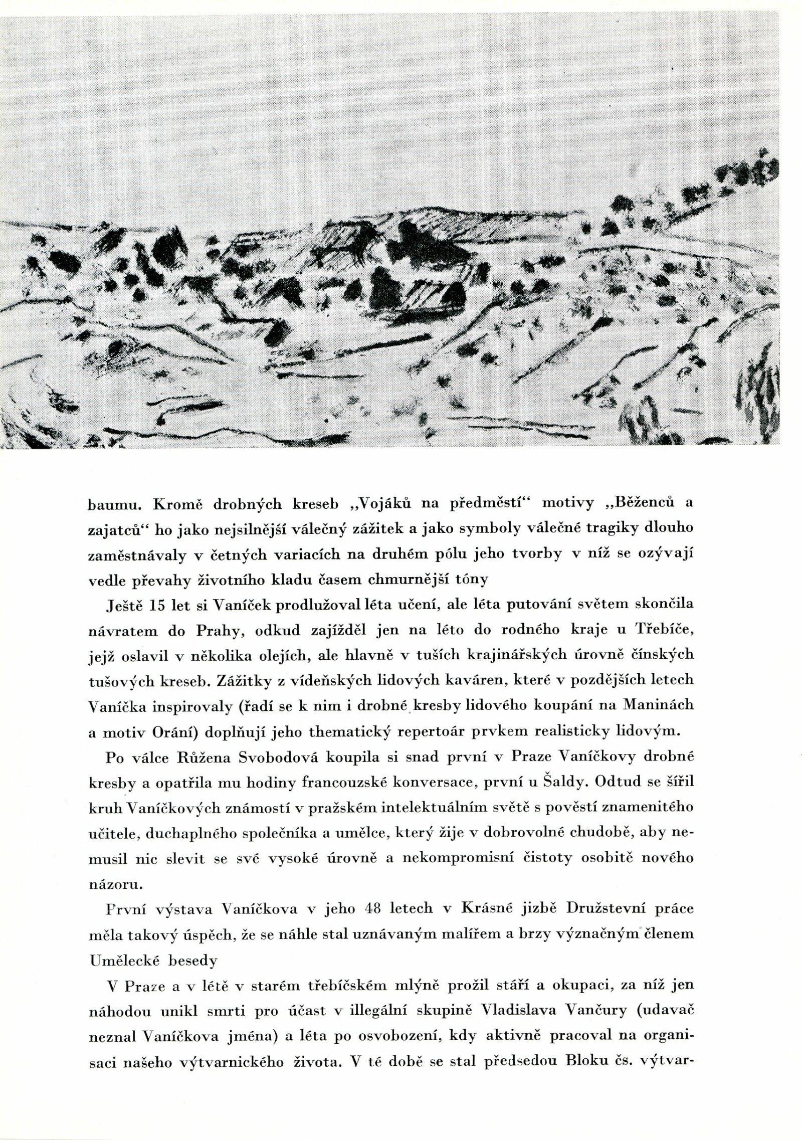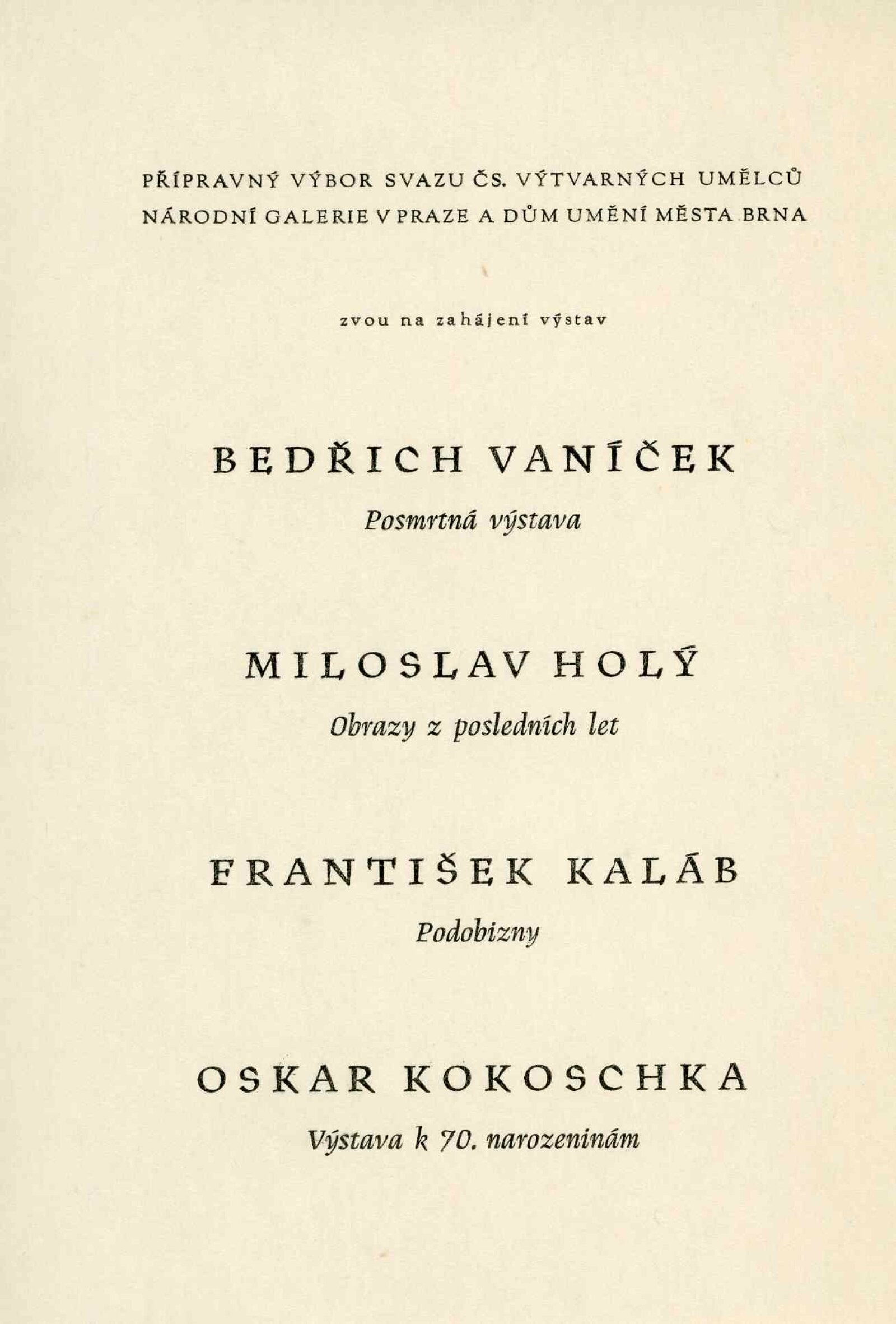 Bedřich Vaníček. Posmrtná výstava: Dům umění města Brna, 27. 5. – 15. 7. 1956 / Převzatý katalog. Bedřich Vaníček. Výstava malířského díla: Alšova síň Umělecké besedy, 29. 2. – 2. 4. 1956 / Texty: Vítězslav Nezval, Václav Bartovský, Viktor Nikodem. – Praha: Umělecká beseda, 1956. – 24 s., obr., DU 253. – MG