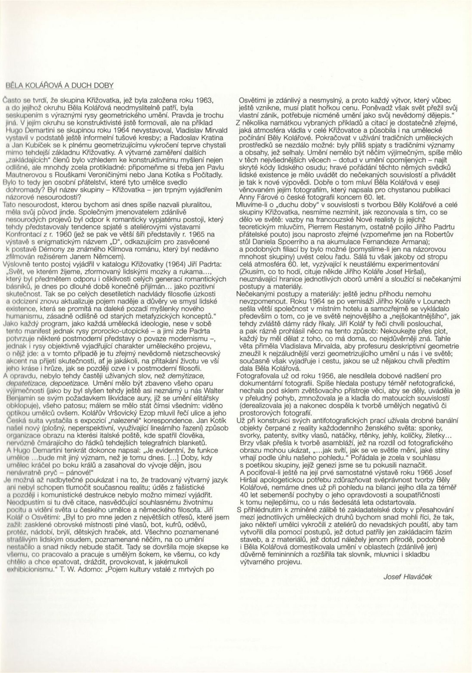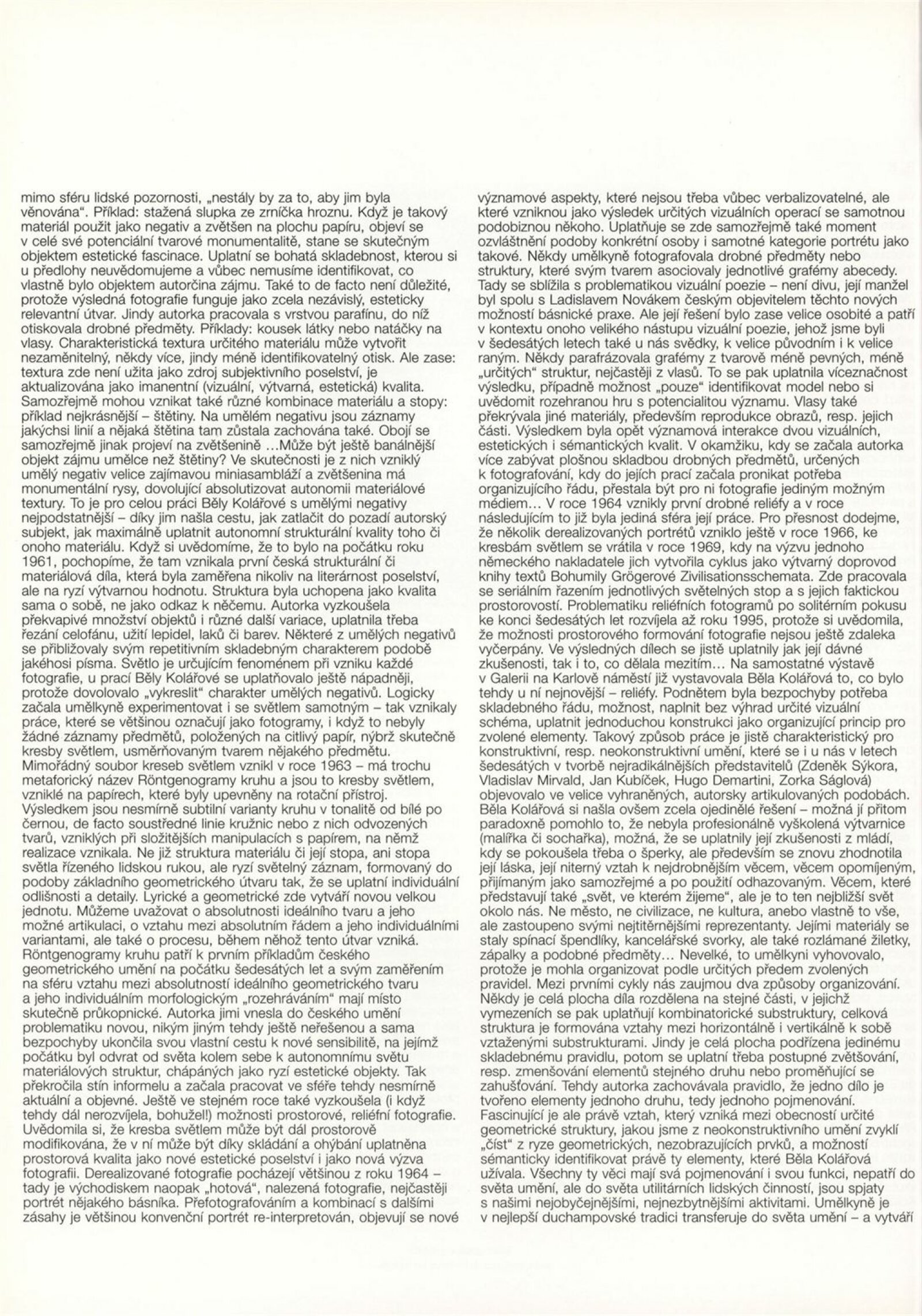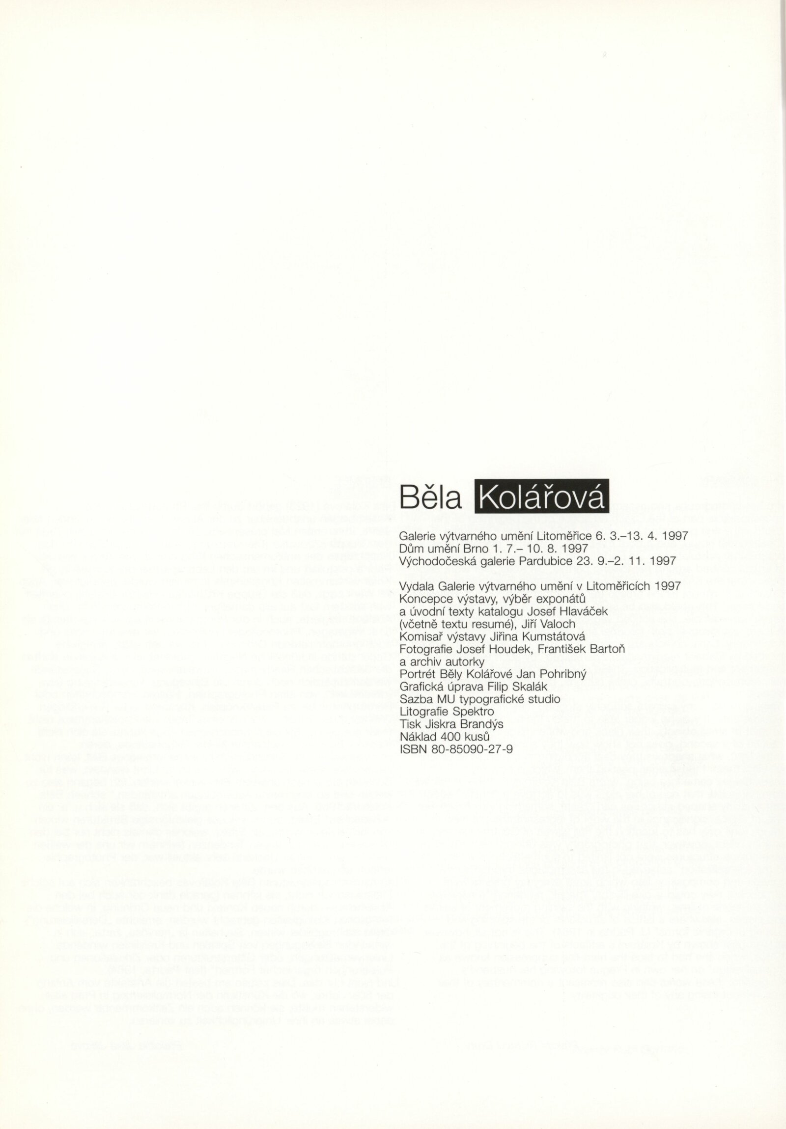 Běla Kolářová: Dům umění Brno, Procházkova síň, 1. 7. – 10. 8. 1997 / Texty: autorka, Josef Hlaváček, Jiří Valoch a další. – Litoměřice: Galerie výtvarného umění, 1997. – [61] s., obr., seznam vystavených prací [4] s., portrét, životní data, výstavy, zastoupení ve sbírkách, bibliografie, DU 1057. – MZK; MG