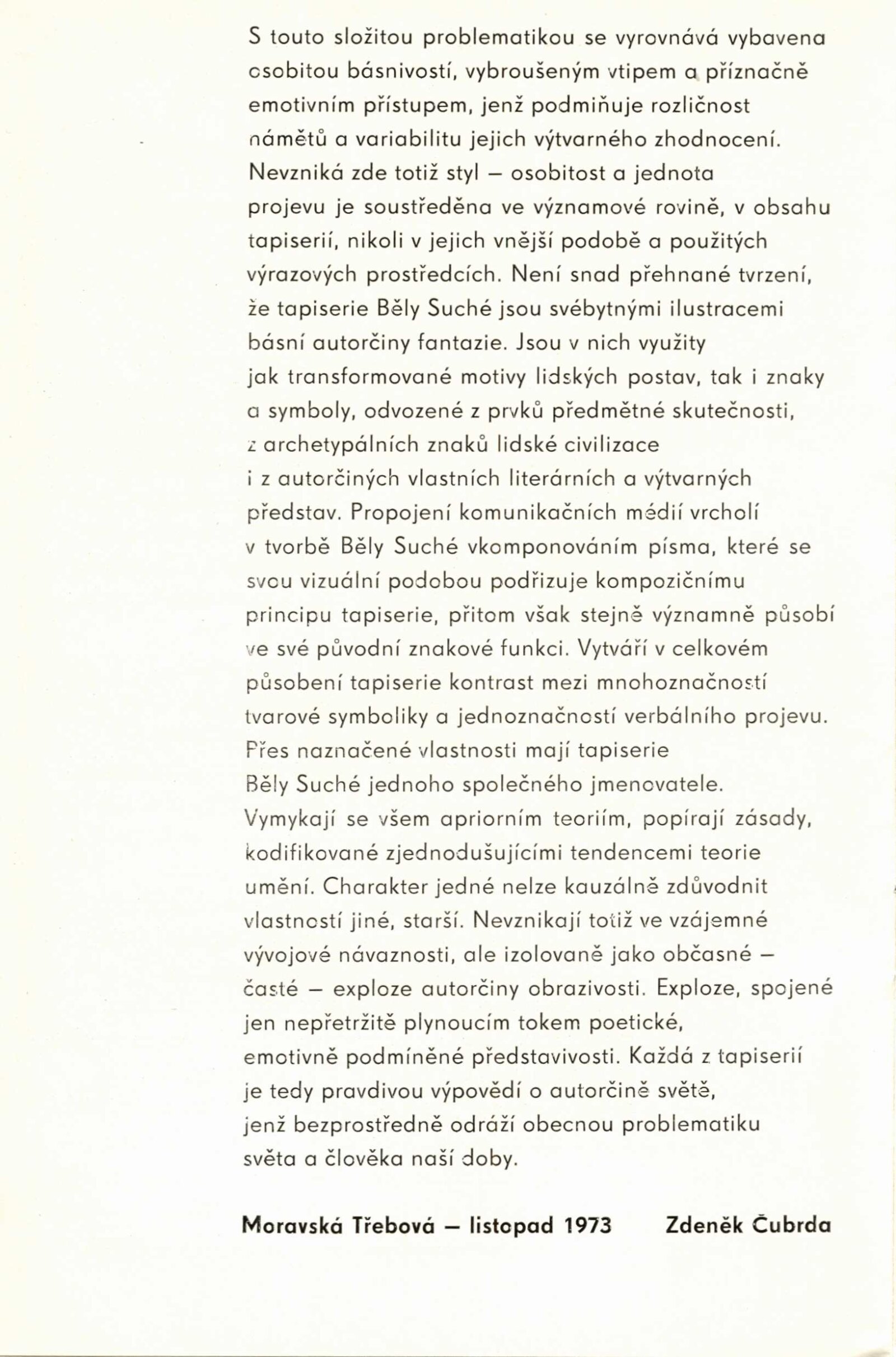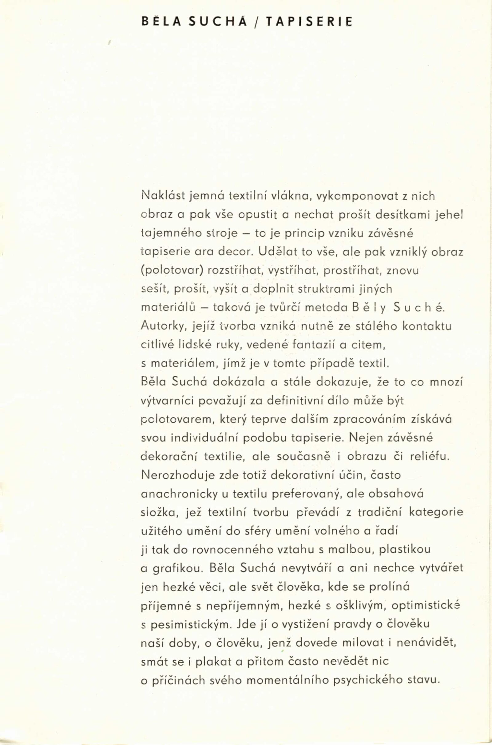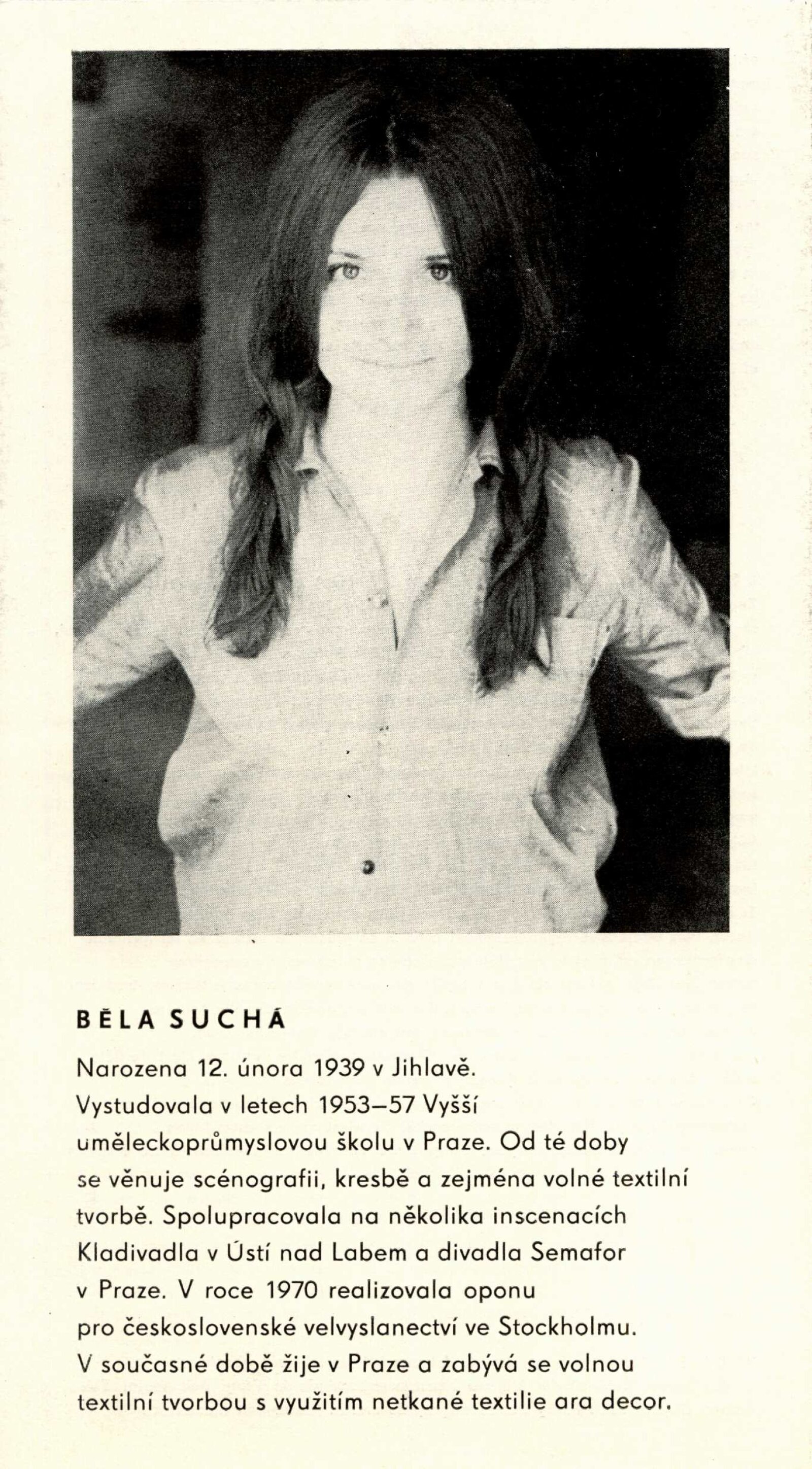 Běla Suchá. Tapiserie: Dům umění, 56. výstava v Galerii Jaroslava Krále, 27. 11. 1973 – 1. 1. 1974 / Text: Zdeněk Čubrda. – Brno: ČFVU, 1973. – 10 s., obr., bar. obr. příl. volně, seznam vystavených prací 2 s., portrét, životopis, výstavy, DU 599. – MZK; MG; MMB