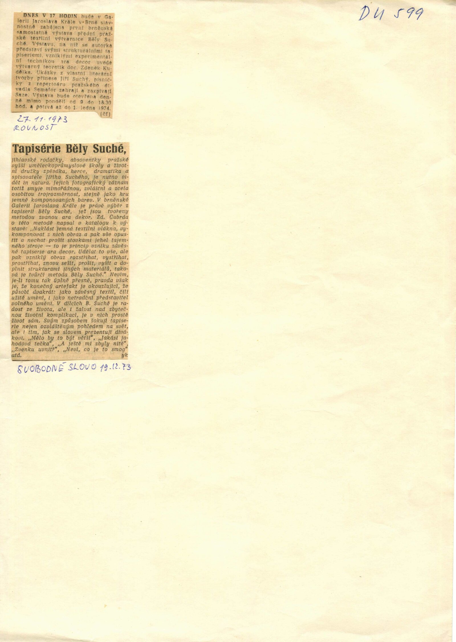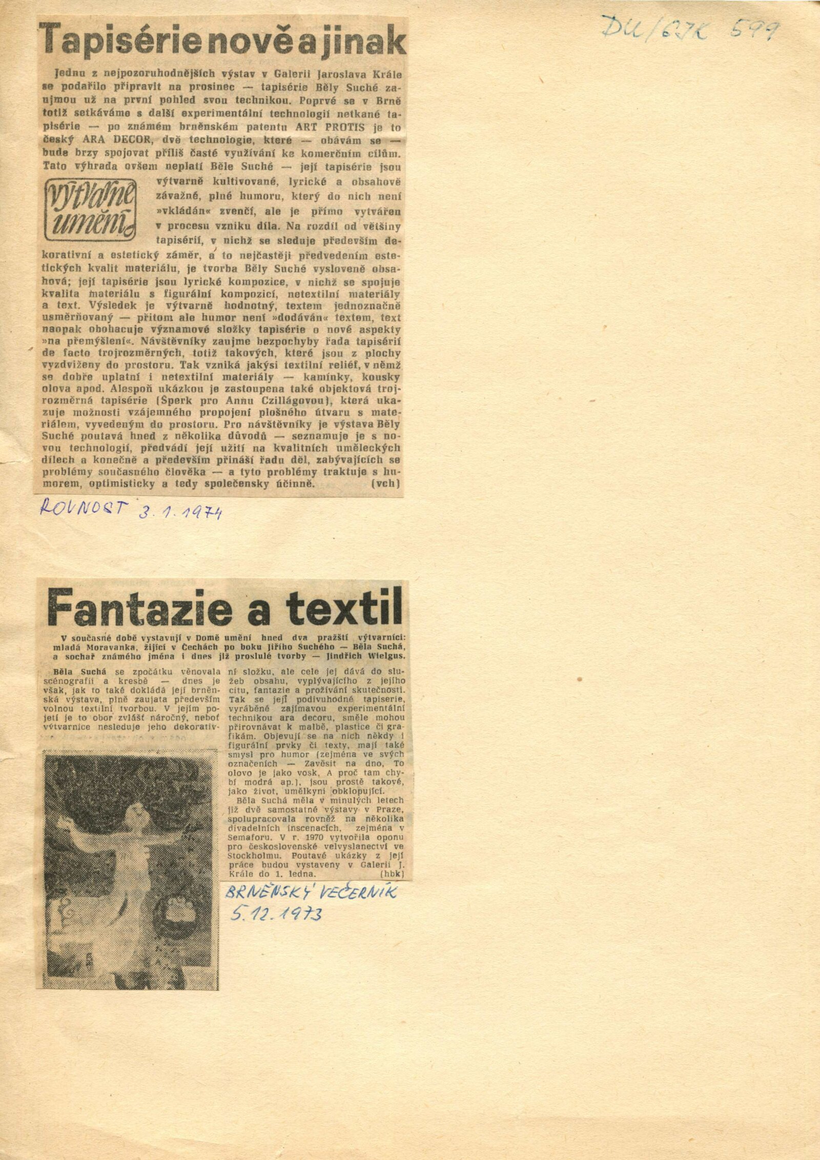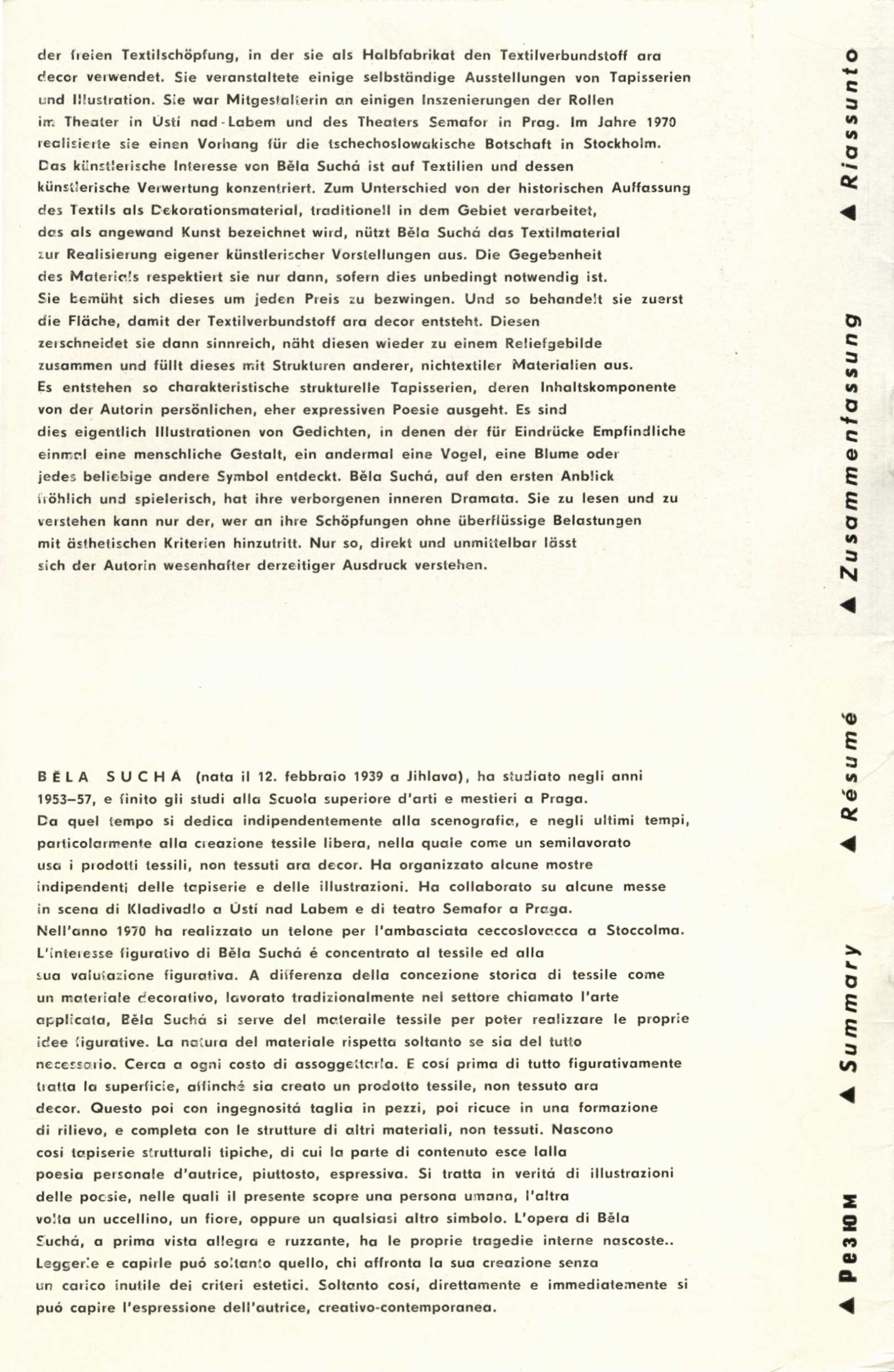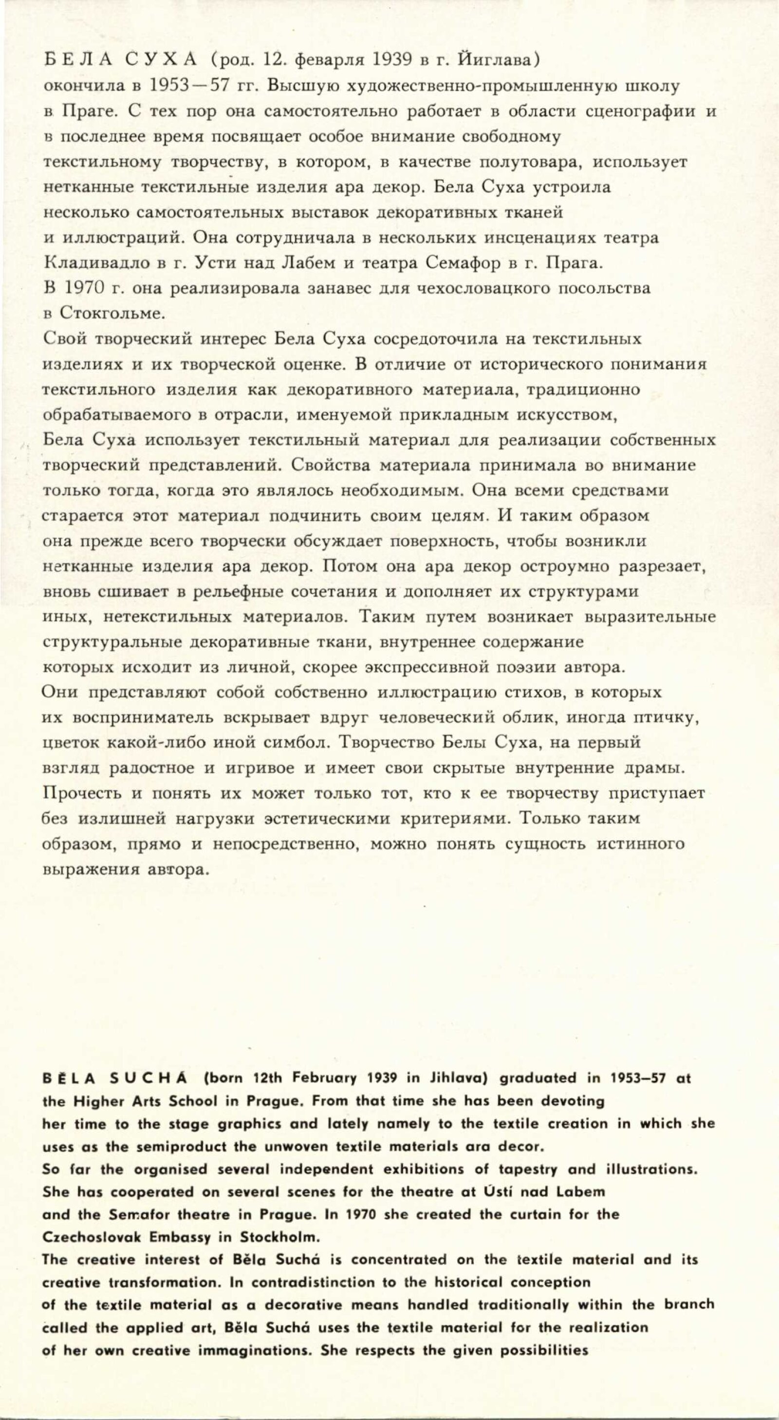 Běla Suchá. Tapiserie: Dům umění, 56. výstava v Galerii Jaroslava Krále, 27. 11. 1973 – 1. 1. 1974 / Text: Zdeněk Čubrda. – Brno: ČFVU, 1973. – 10 s., obr., bar. obr. příl. volně, seznam vystavených prací 2 s., portrét, životopis, výstavy, DU 599. – MZK; MG; MMB