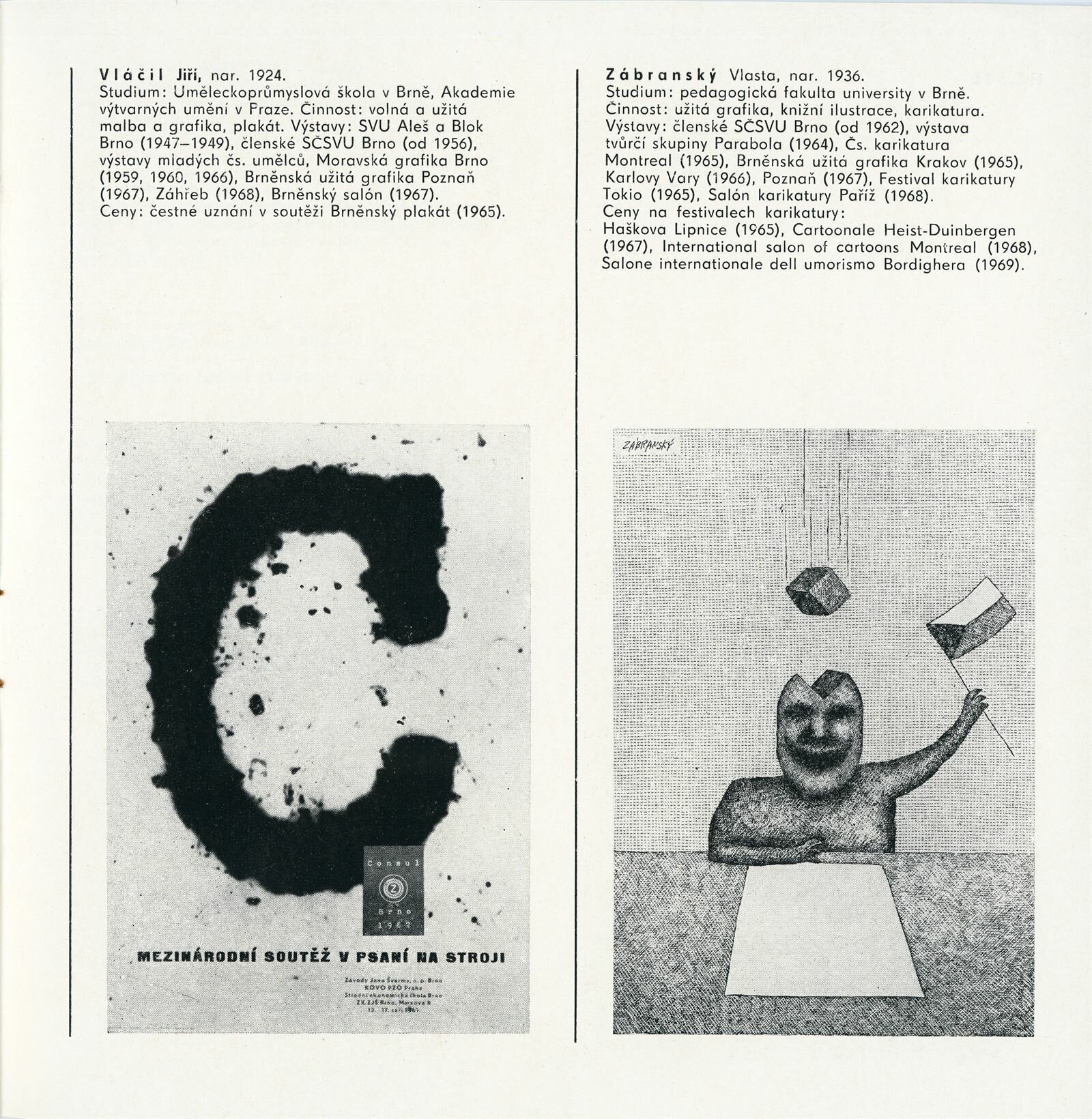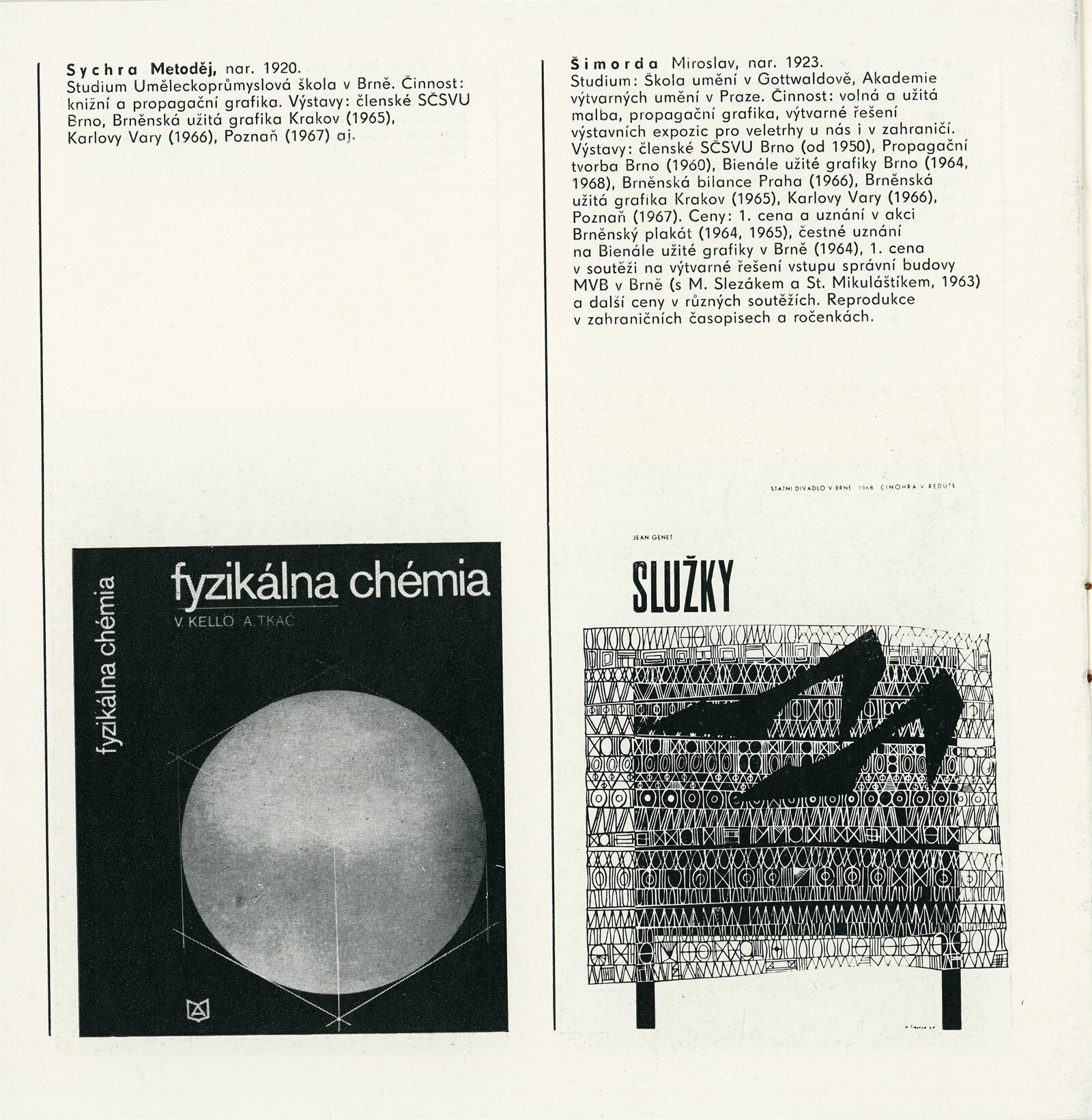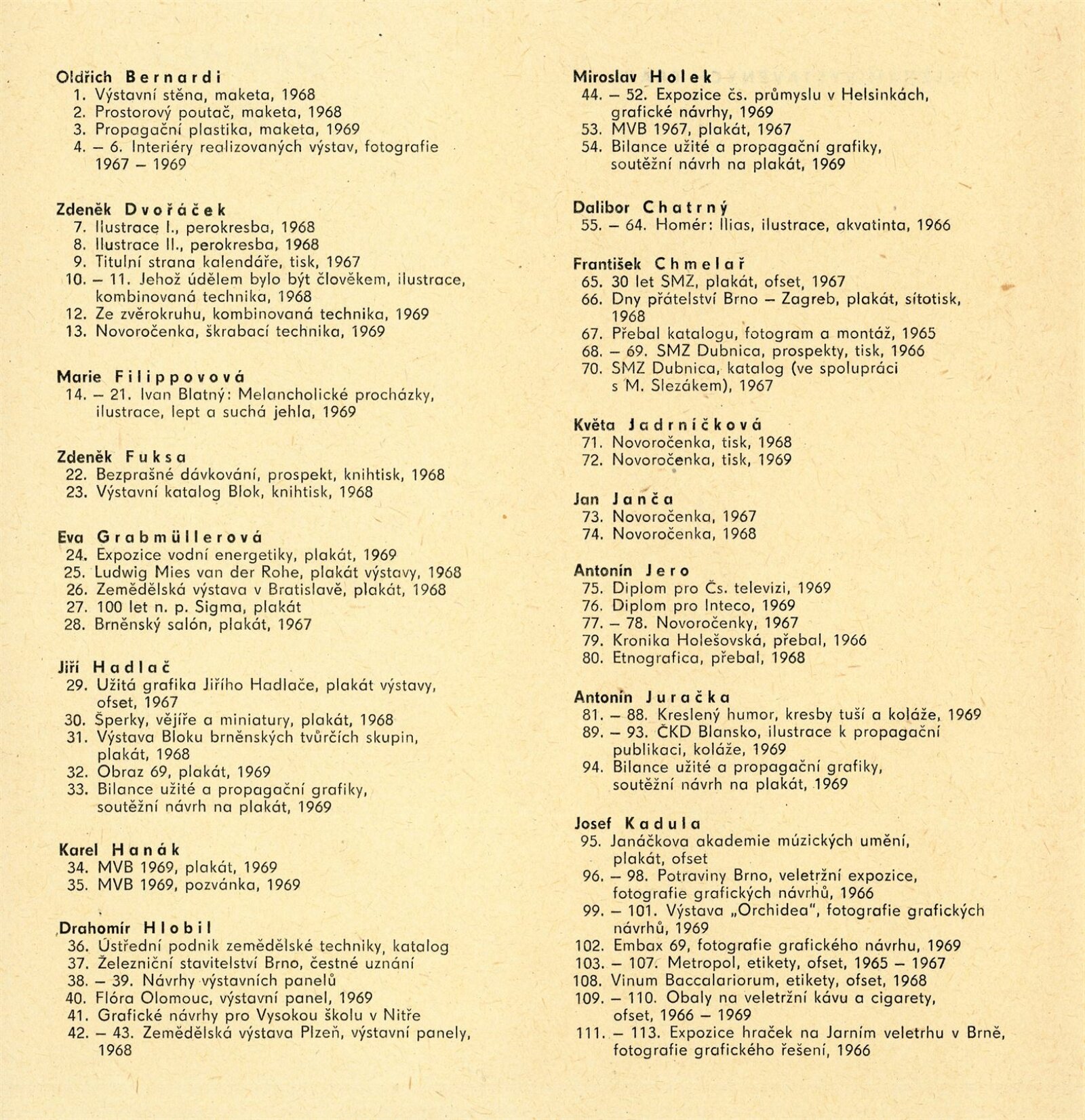 Bilance užité a propagační grafiky: Dům umění města Brna / Dům pánů z Kunštátu, 7. 11. – 7. 12. 1969 / Text: Jan Šebela. – Brno: SČVU, 1969. – 32 s., obr., seznam vystavených prací 4 s., životopisy vystavujících, DPK 421. – MZK; MG