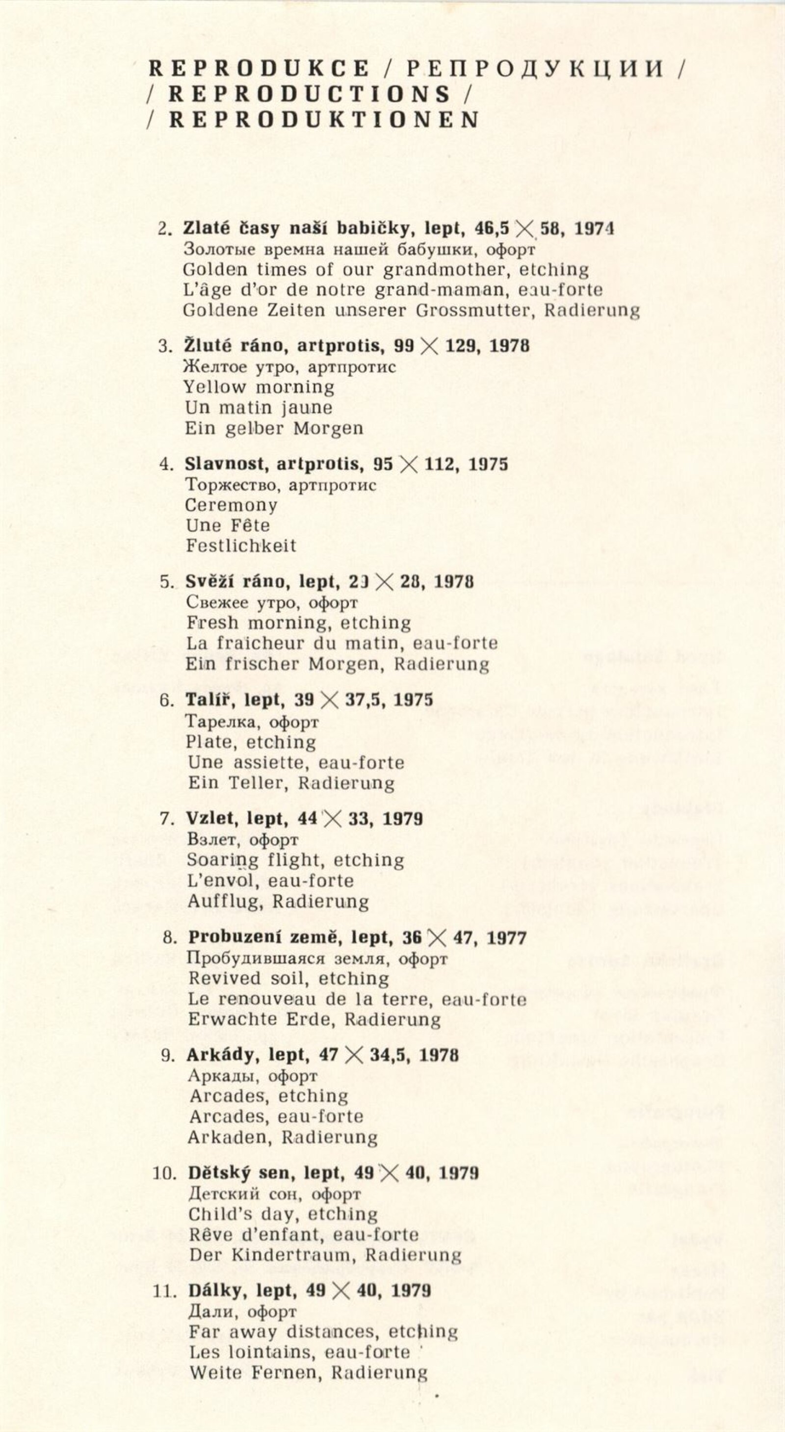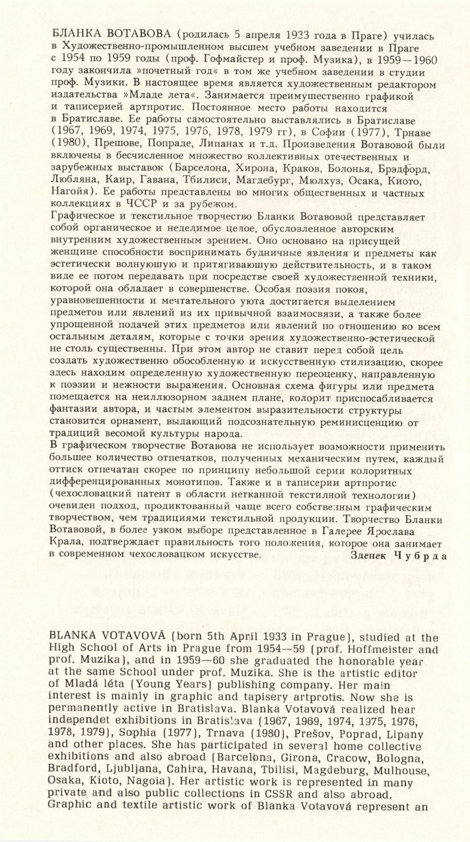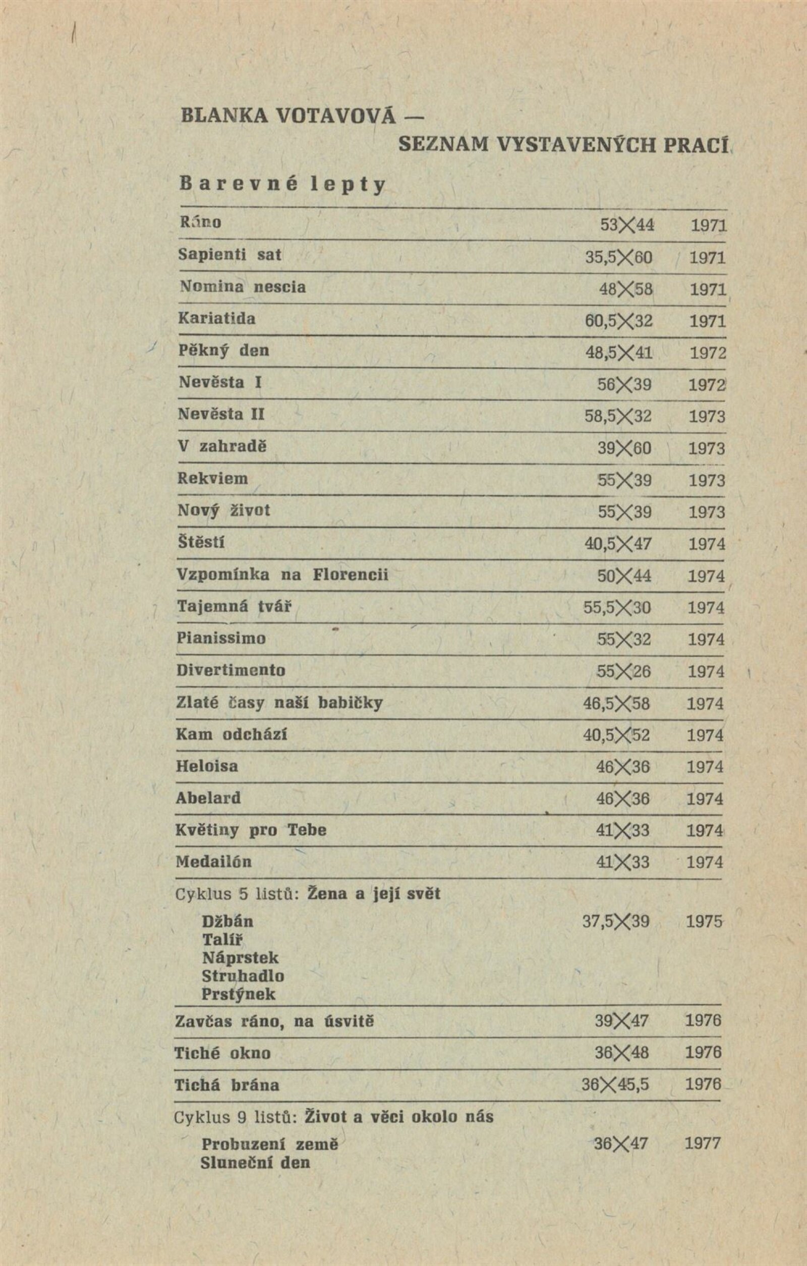 Blanka Votavová. Grafika, art protis: Dům umění, 100. výstava v Galerii Jaroslava Krále, 21. 10.– 23. 11. 1980. / Text: Fedor Kriška. – Brno: ČFVU, 1980. – 10 s., obr., seznam vystavených prací 2 s., portrét, životní data, výstavy, DU 717. – MMB