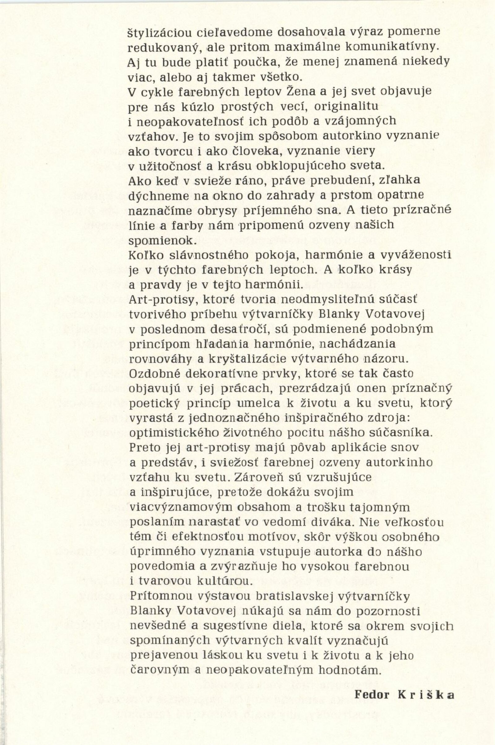 pozvánka, katalog, fotografie díla, recenze v tisku, katalog výstavy Blanky Votavové v Galérii C. Majerníka (1974)