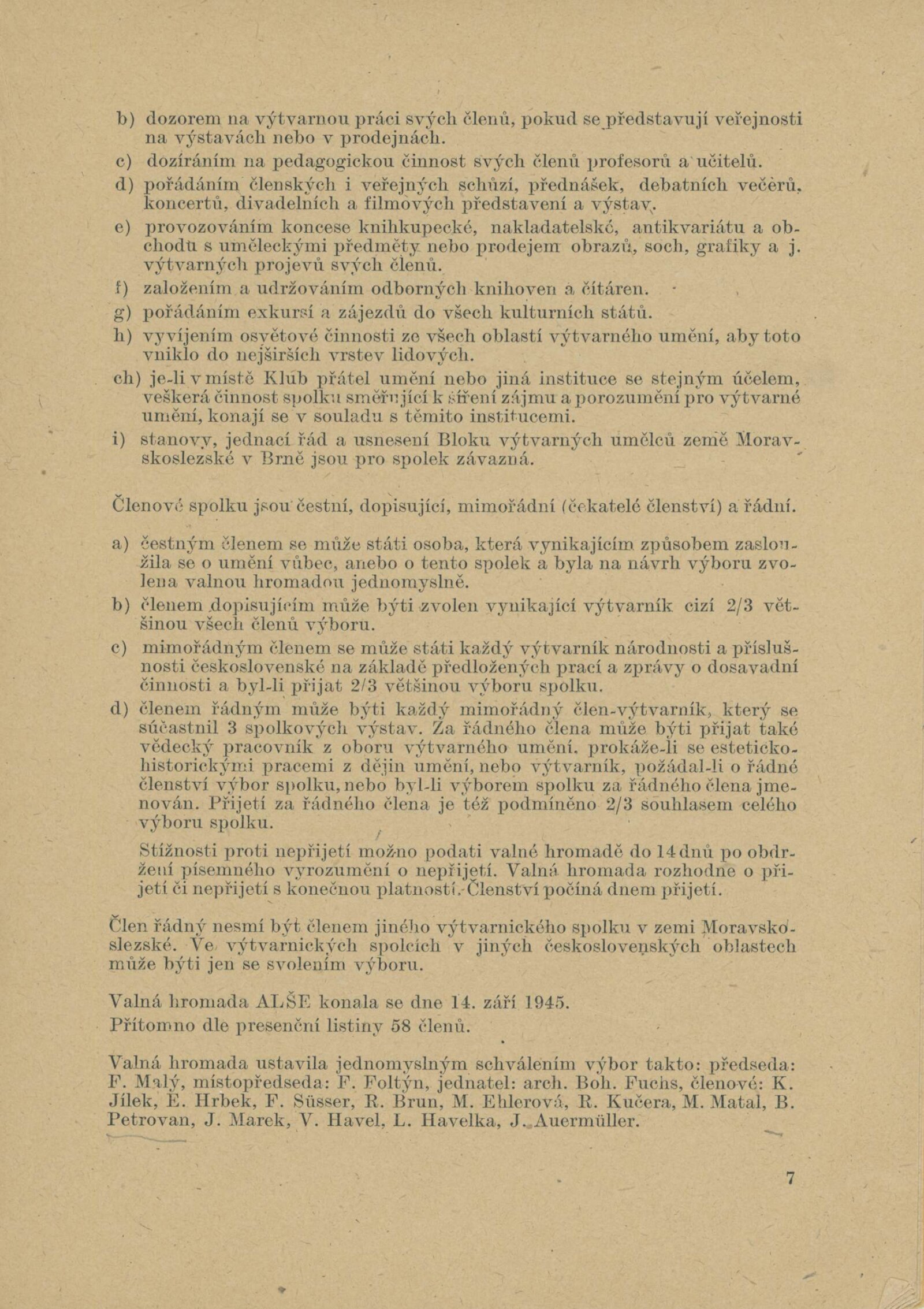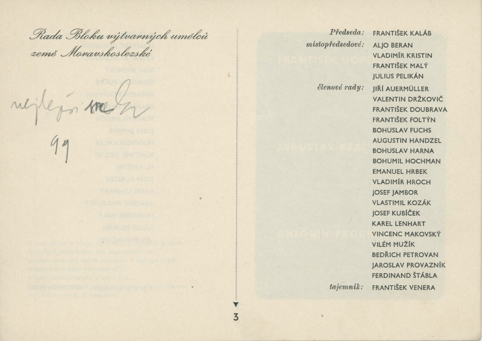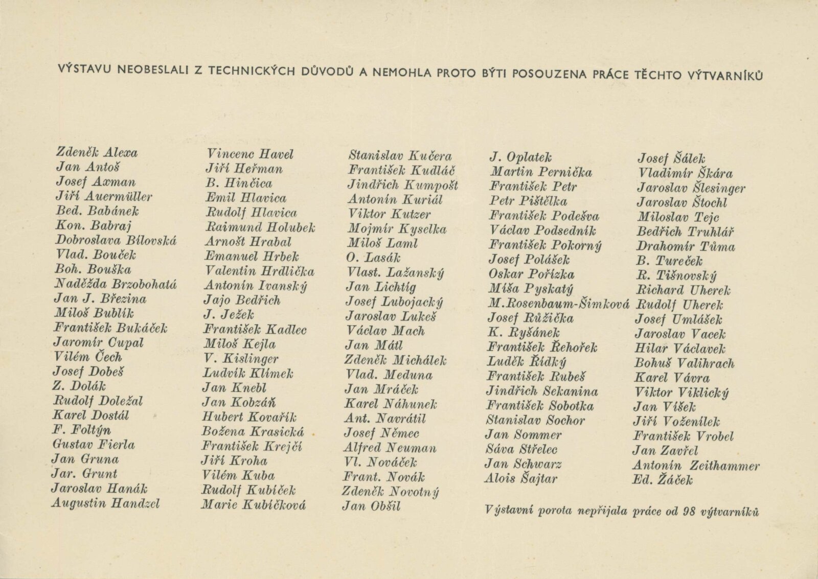 Josef Baják, Taťána Bakalová, Aljo Beran, Josef Bezděk, Jan Blažek, Helena Bochořáková, Alois Bokůvka, O. Bolom-Kotari, Jan Brukner, Richard Brun, Rudolf Doležal, František Doubrava, Valentin Držkovič, Bohumír Dvorský, Jaroslav Dvořáček, Ladislav Dydek, Marie Ehlerová, František Fiala, Vlastimil Fiala, Karel Formánek, Jan T. Fischer, Miroslav Fridrich, Olga Fridrichová Steinzová, Bohuslav Fuchs, Rudolf Gajdoš, František L. Gahura, Luděk Havelka, Robert Hliněnský, Karel Hofman, Bohumil Hochman, Karel Homola, František Hoplíček, František Hořava, Vojtěch Hořínek, Vladimír Hroch, Bohumil Jahoda, Josef Jambor, Jan Janča, Jiří Jaška, Jan Jílek, Karel Jílek, Eugenie Jurečková, František Kaláb, Josef Kamenický, Josef Kousal, Jaroslav Král, Jánuš Kubíček, Josef Kubíček, František Kocourek, Josef Konečný, Eduard S. Kostrhon, Adolf V. Kovanič, Vlastimil Kozák, Stanislav Krátký, Eduard Krejčí, Vlastimil Kristin, Alois Kučera, Rudolf Kučera, Božena Kuhnová, Bohdan Lacina, Jindřich Lenhart, Karel Lenhart, Zdeněk Máčel, Vincenc Makovský, František Malý, Bohumír Matal, Jiří Marek, Stanislav Menšík, Augustin Mervart, Eduard Milén, Vilém Mužík, Jan M. Najmr, Vladimír Navrátil, Miroslav Netík, Jaroslav Pacák, Julius Pelikán, Bedřich Petrovan, František Povolný, Antonín Procházka, Linka Procházková, Jan Provazník, František Rek, Bedřich Rozehnal, Marie Rodingerová, Marta Rožánková-Drábková, Helena Salichová, Alois Schneiderka, Jan V. Sládek, Jan Smital, Miloslav Smutný, Svatopluk Souček, Jaroslav V. Staněk, František Süsser, František Šenk, Evžen Škarda, Čestmír Šlapeta, Lubomír Šlapeta, František Šnajdr, Ára Šolc, Josef Šrámek, Ferda Štábla, Josef Šťastný, František Švéda, Karel Těšík, Jan Tříska, Vladislav Vaculka, Bohumil Večeřa, Zdeňka Vorlová, Josef Vrzal, Vilém Wünsche, Josef Zamazal, Oldřich Zezula, Milan Zezula, Václav Zykmund