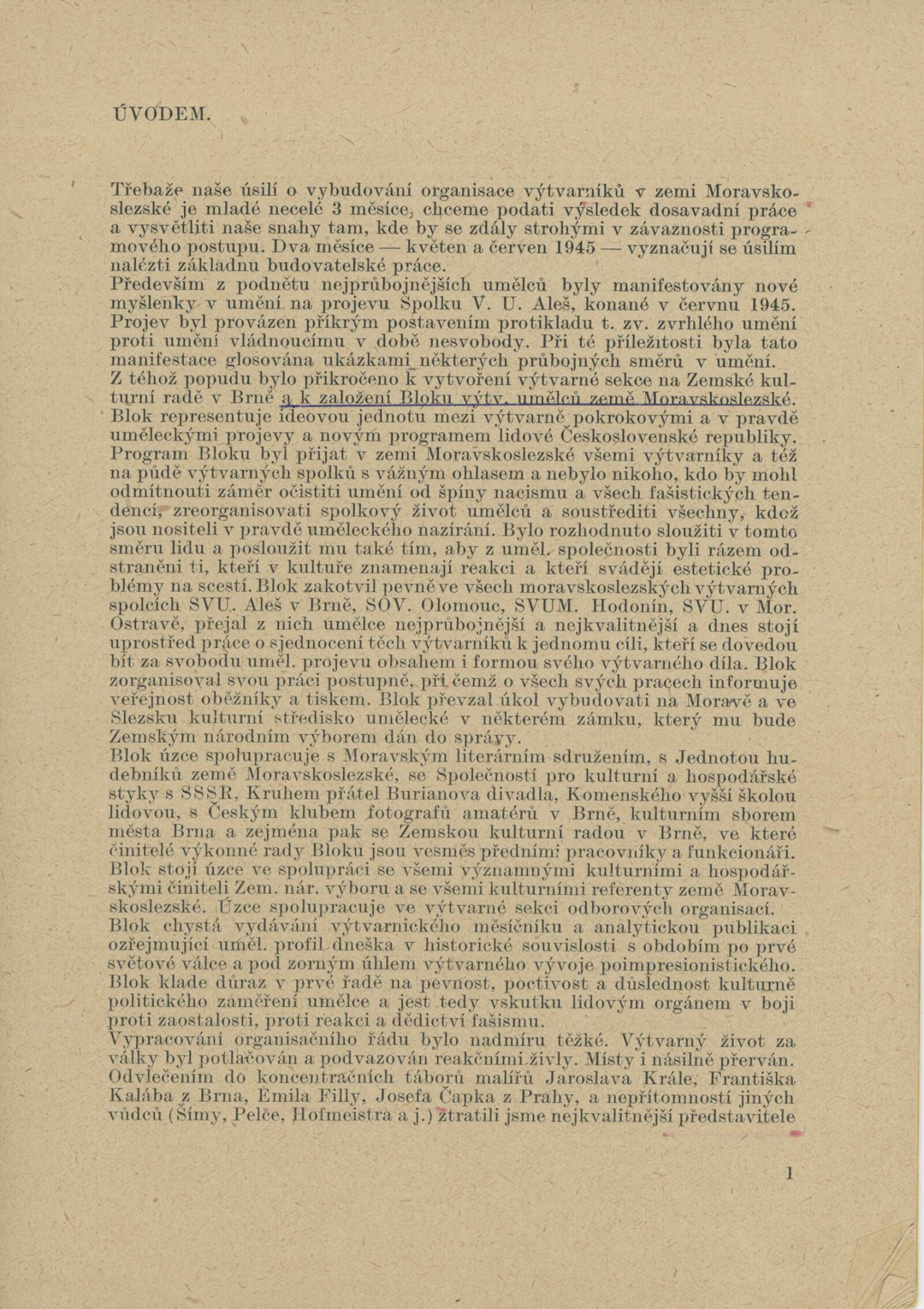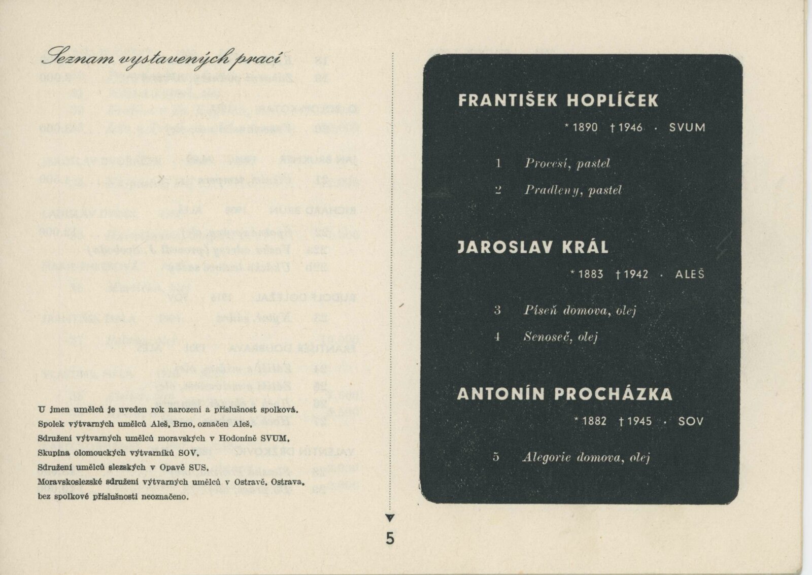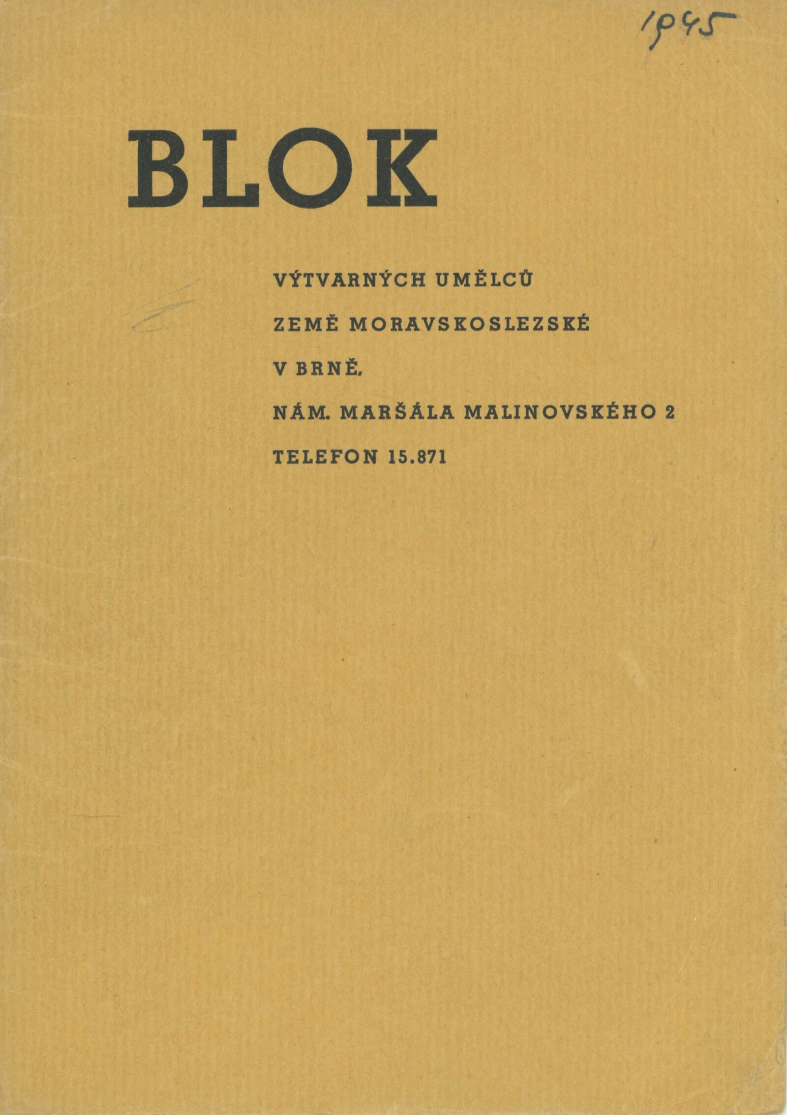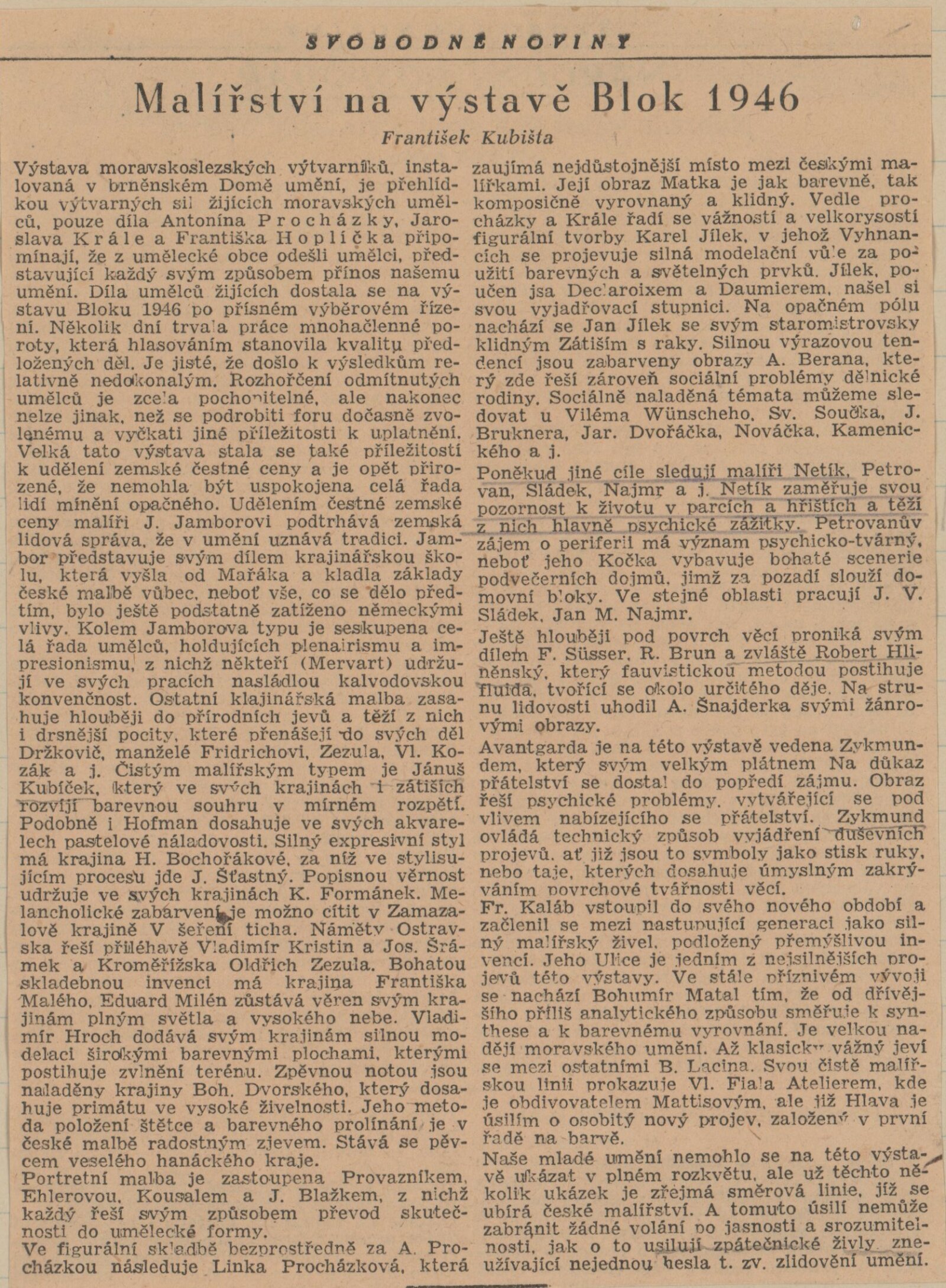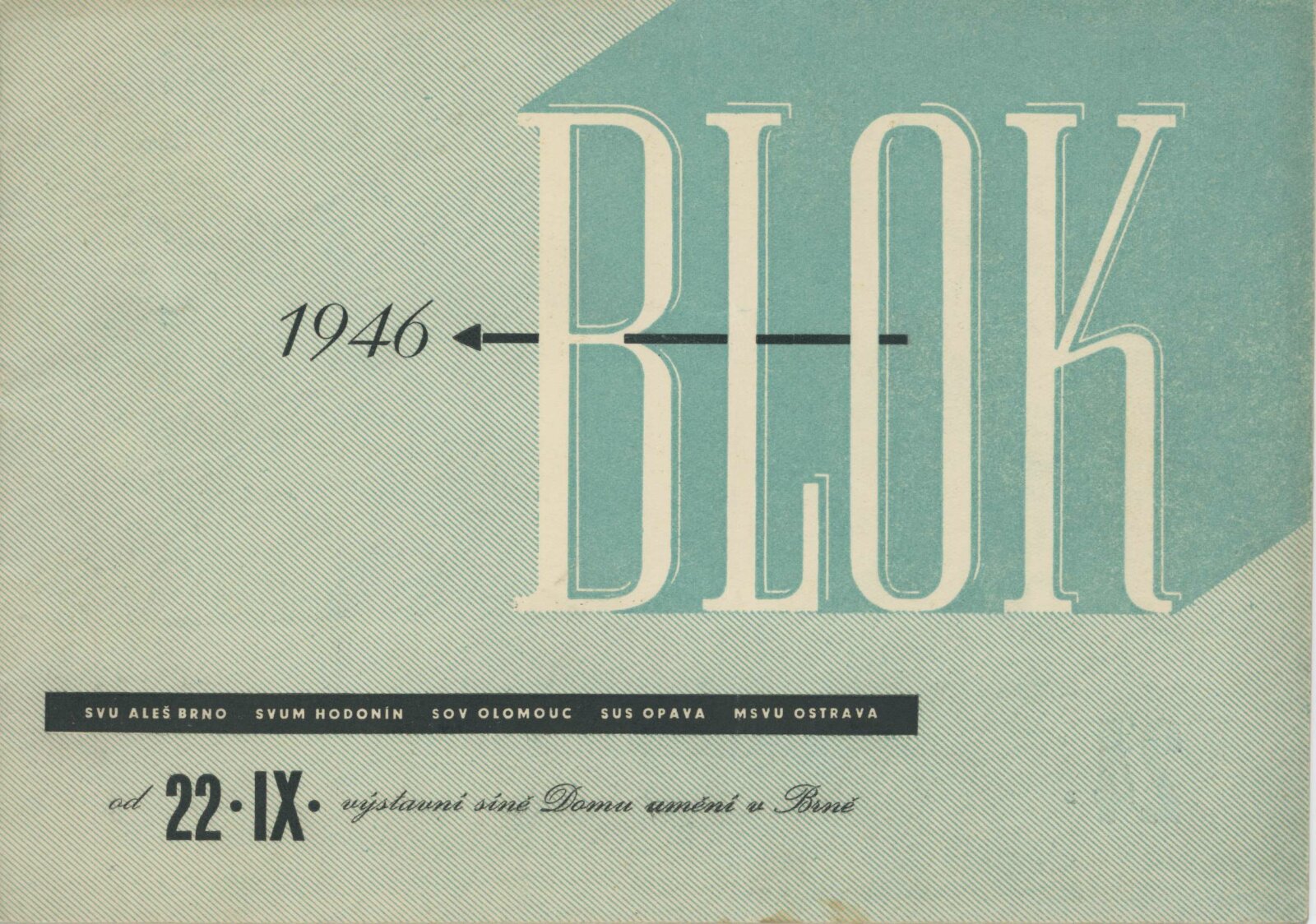 Blok 1946. SVU Aleš Brno, SVUM Hodonín, SOV Olomouc, SUS Opava, MSVU Ostrava. XXIV. výstava: Dům umění v Brně, od 22. 9. 1946 / Brno: Blok výtvarných umělců země Moravskoslezské, 1946. – 14 s., seznam vystavených děl s cenou, DU 24. – Kubíček 7523; MZK; MG; MMB