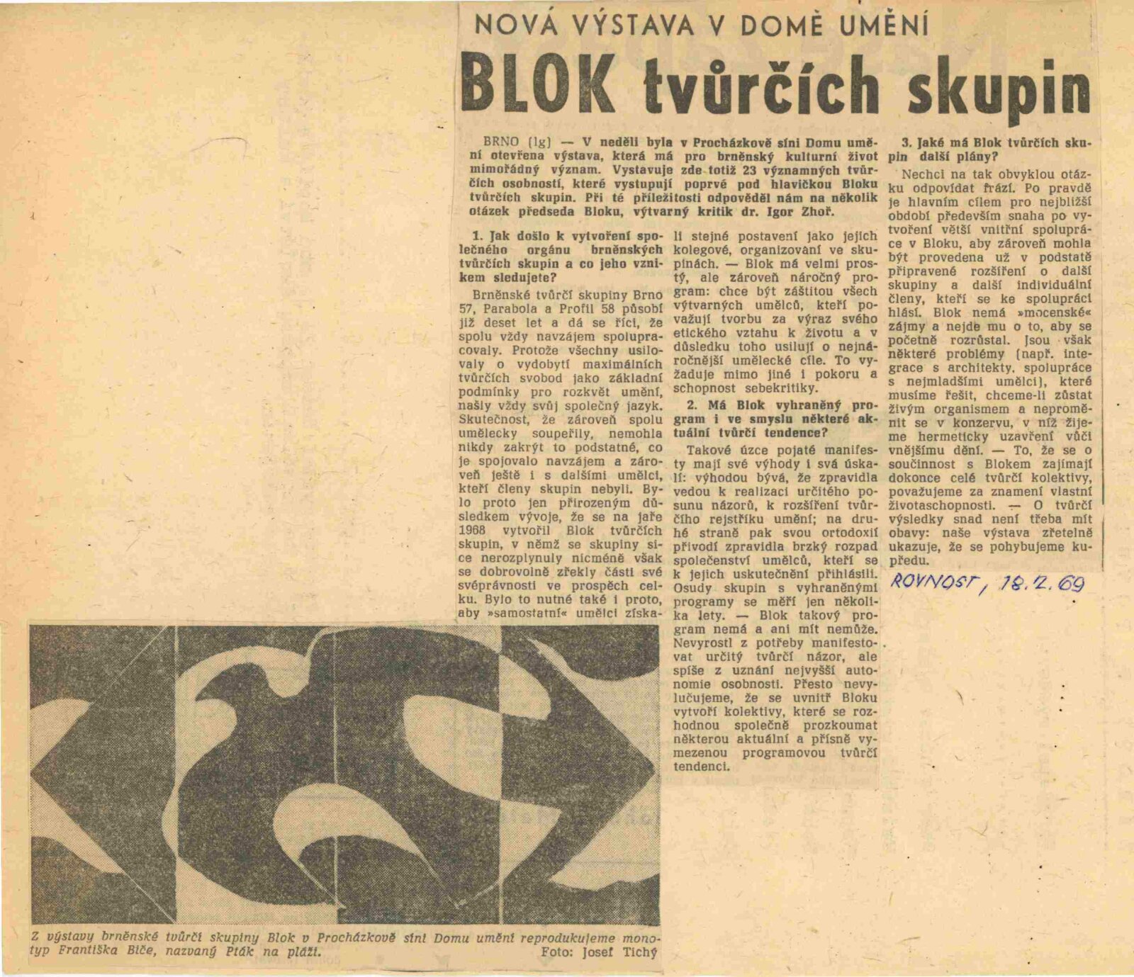 Na jaře roku 1968 vznikl Blok brněnských tvůrčích skupin, organizace sdružující spřízněné výtvarné skupiny Brno 57, Profil 58 a Parabola, které od druhé poloviny padesátých let rozvíjely v Brně uměleckou tvorbu navazující na odkaz předválečné umělecké moderny a usilující o samostatný a soudobý abstrahující výtvarný projev, mimo požadavky oficiální kultury. Vznik Bloku jako zaštiťující platformy tvůrčích skupin, ale také jednotlivců, byl motivovaný jak společným výtvarným názorem a spřízeností uvedených skupin, osobními kontakty a přátelskými vztahy brněnských umělců, ale především potřebou spojit se ve větší organizaci, která mohla lépe odolat politickému a ideologickému tlaku po okupaci Československa sovětskými vojsky v srpnu roku 1968. Prohlášení Bloku, přednesené na shromáždění uměleckých svazů přednesl na jaře roku 1968 brněnský historik umění a architektury Zdeněk Kudělka. Blok měl vytvářet otevřené a zastřešující zázemí pro skupiny umělců, podporující individualitu jednotlivých autorů a přístupné pro přijímání dalších členů i skupin (o připojení měla v roce 1969 zájem brněnská sekce Klubu konkretistů) a podporou mladých tvůrců (v jednom ze zápisů schůzí výboru bylo odsouhlaseno utvoření tzv. Mladého Bloku pro začínající umělce). Schůze Bloku probíhaly v pravidelných měsíčních intervalech od dubna roku 1968 v Domě umění města Brna. Předsedou výboru byl zvolen Igor Zhoř, teoretik skupiny Profil 58, teoretik výtvarné pedagogiky a umění, pedagog, který společně s dalšími členy inicioval uspořádání společné skupinové výstavy. Výstava Bloku v roce 1969 navázala na společnou prezentaci v roce 1963 na výstavě Konfrontace brněnských tvůrčích skupin ve stejných výstavních sálech Domu umění. Přestože Zhoř uvažoval v dalším výhledu především o úžeji koncipovaných výběrových výstavách členů Bloku, považoval za důležité, připravit na začátku konfrontační přehledovou výstavu aktuálních výtvarných stanovisek jednotlivých umělců. Přípravným výborem výstavy byli pověřeni František Bič, Zdeněk Macháček a Jánuš Kubíček. Na společné výstavě se představilo celkem dvacet tři umělců - malířů, grafiků a sochařů. Na vernisáži výstavy, která tehdy běžně probíhala z důvodu prosazování sekularizace společnosti v neděli dopoledne, promluvil Milan Uhde. Činnost Bloku brněnských tvůrčích skupin byla restriktivně ukončena pravděpodobně v roce 1970-1971. (ms)