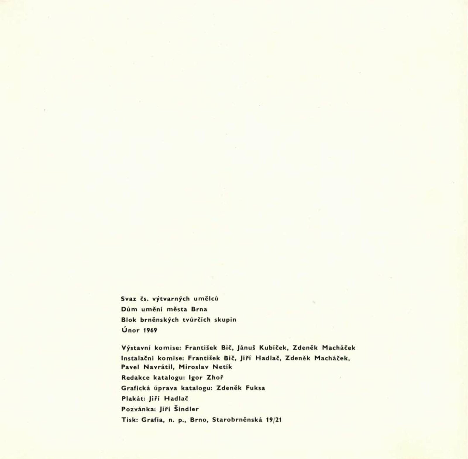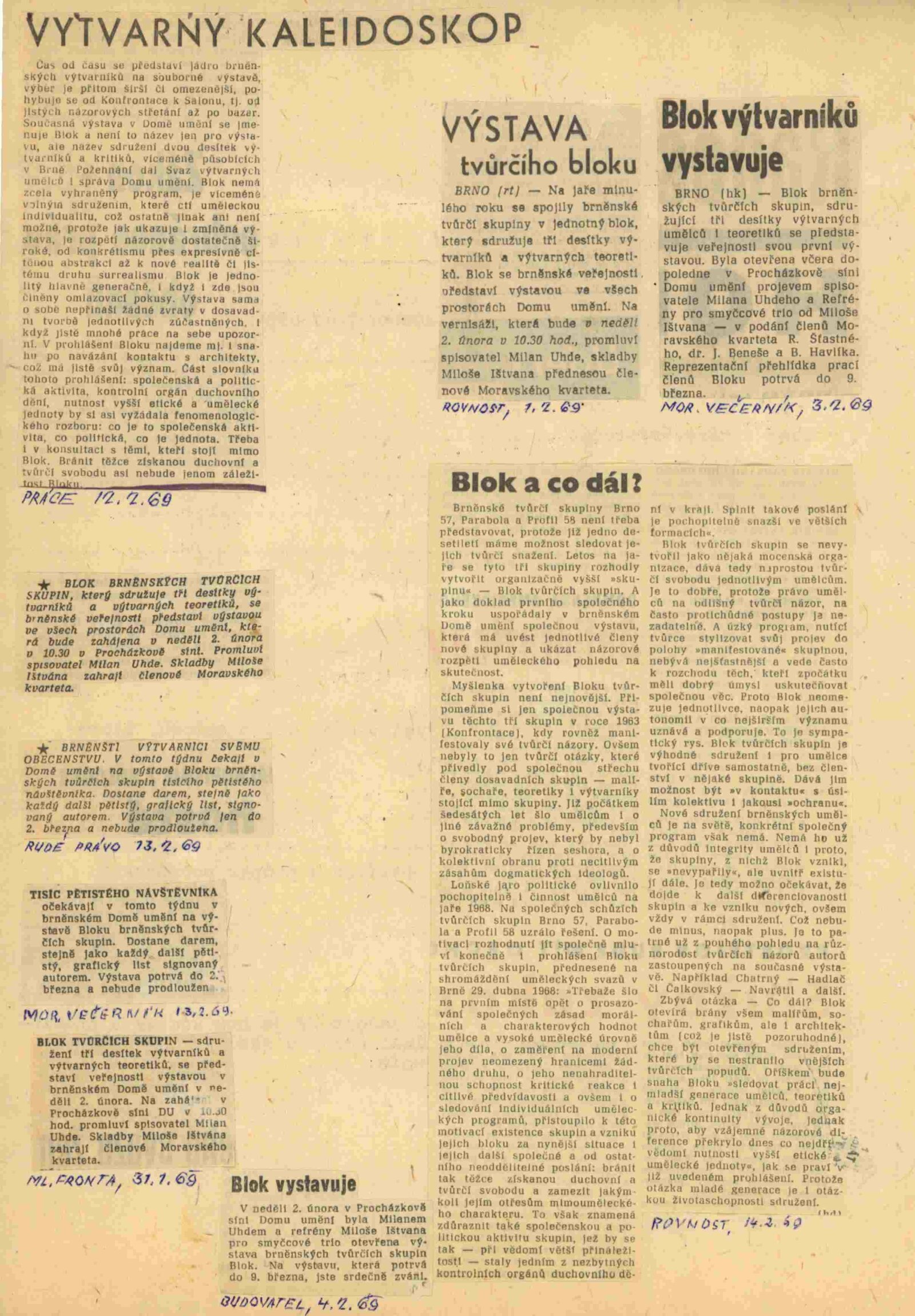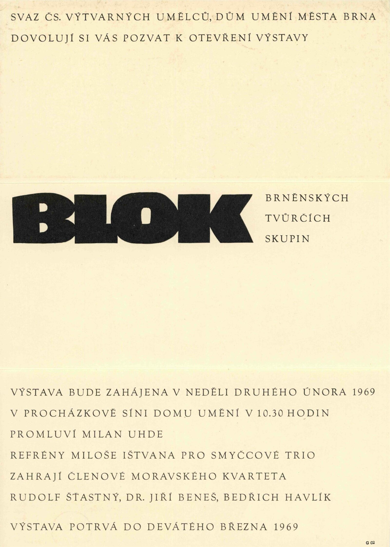 Blok brněnských tvůrčích skupin: Dům umění města Brna, 2. 2. – 2. 3. 1969 / Text: prohlášení Bloku, odpovědi autorů na otázky. – Brno: SČSVU, 1969. – 32 s., obr., DU 516. – Kubíček 7522; MZK; MG