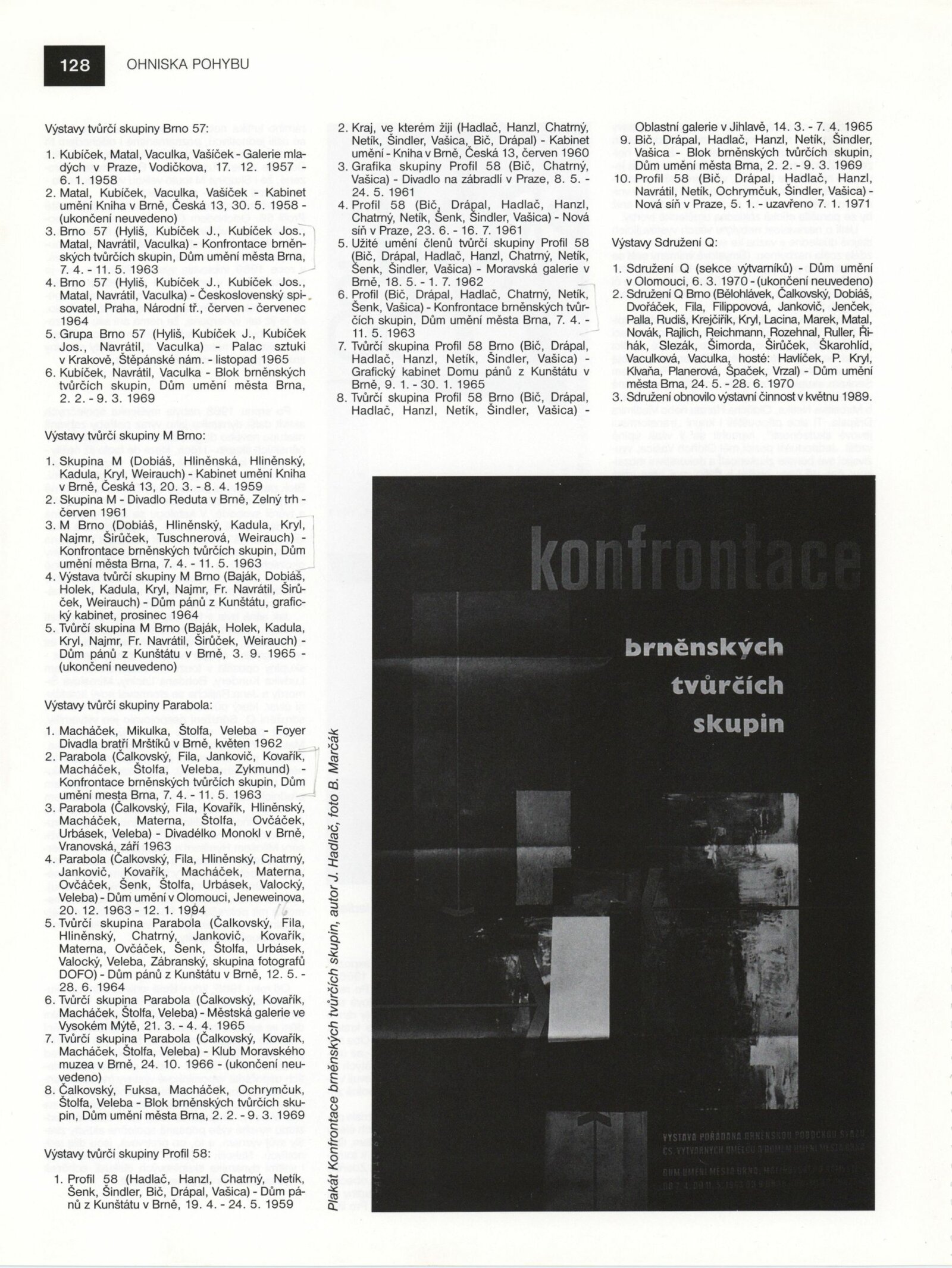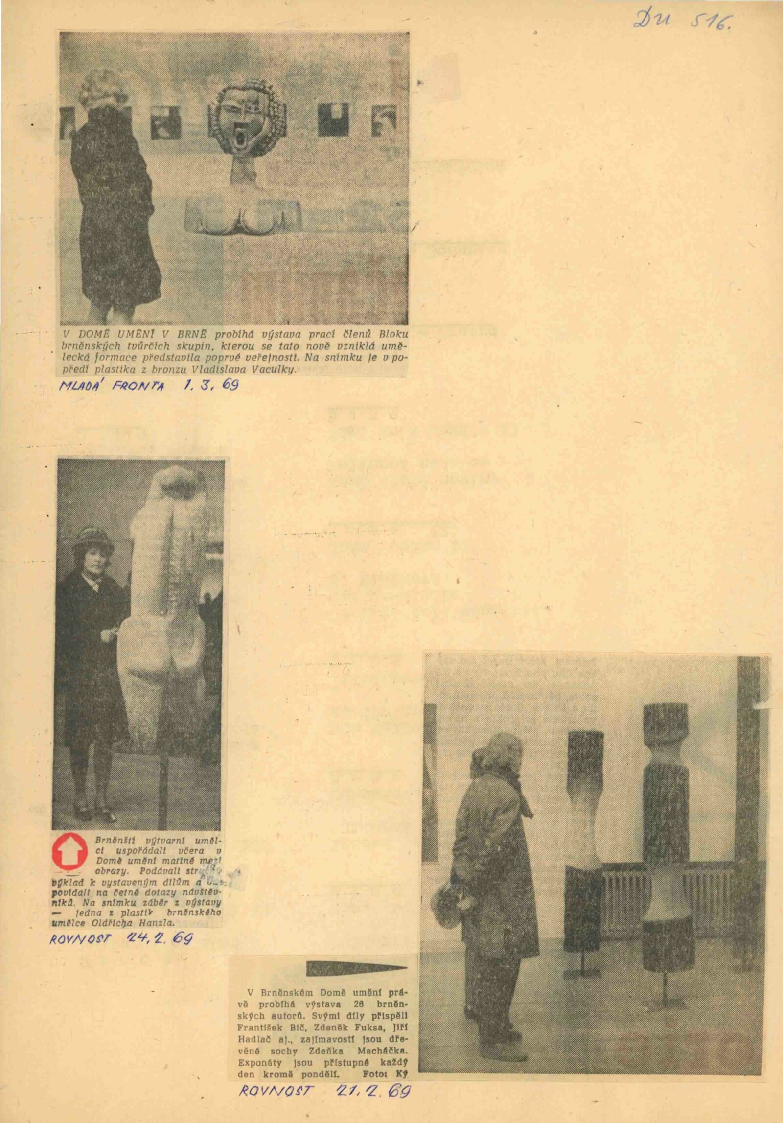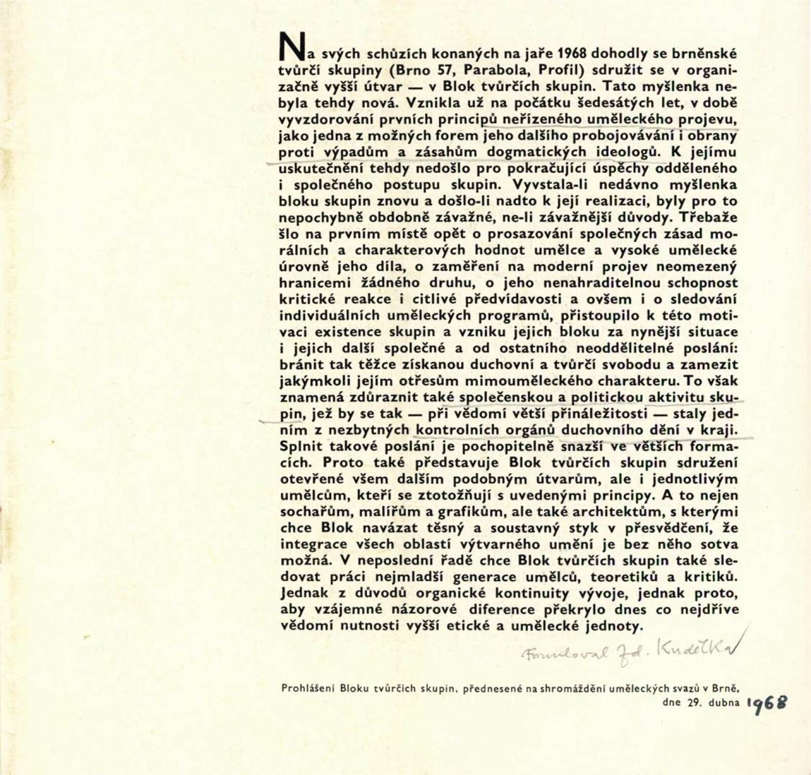 Blok brněnských tvůrčích skupin: Dům umění města Brna, 2. 2. – 2. 3. 1969 / Text: prohlášení Bloku, odpovědi autorů na otázky. – Brno: SČSVU, 1969. – 32 s., obr., DU 516. – Kubíček 7522; MZK; MG