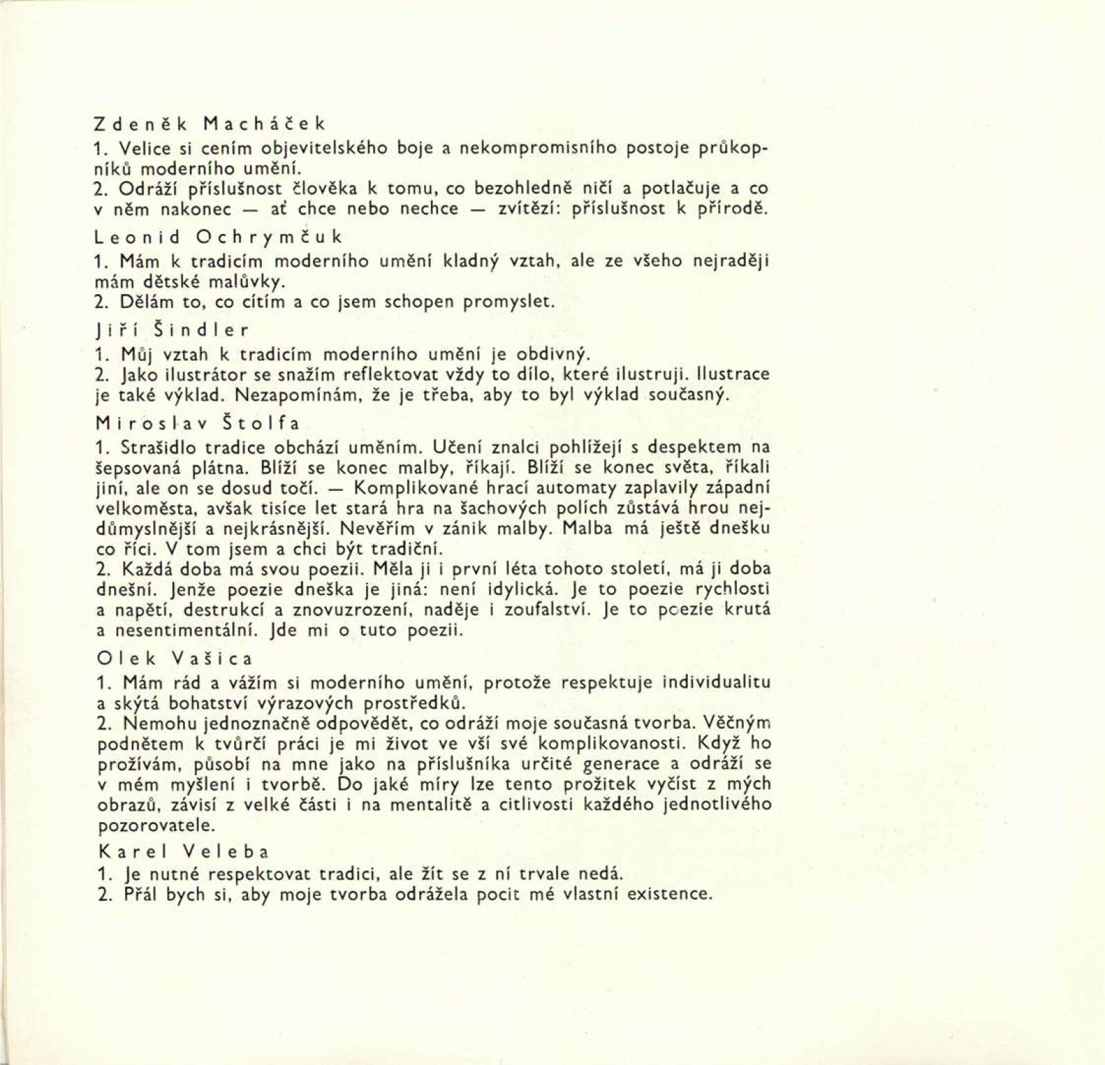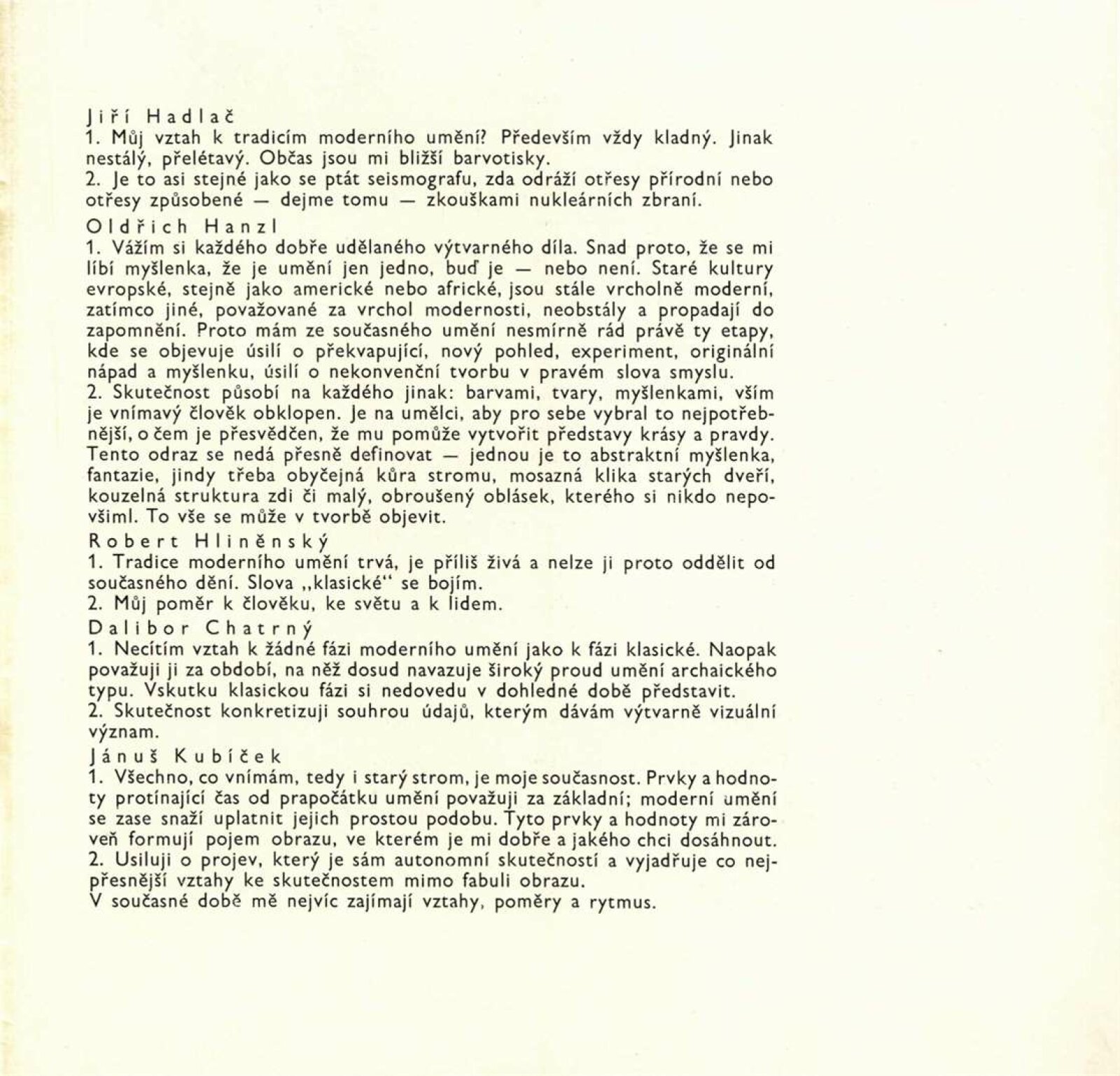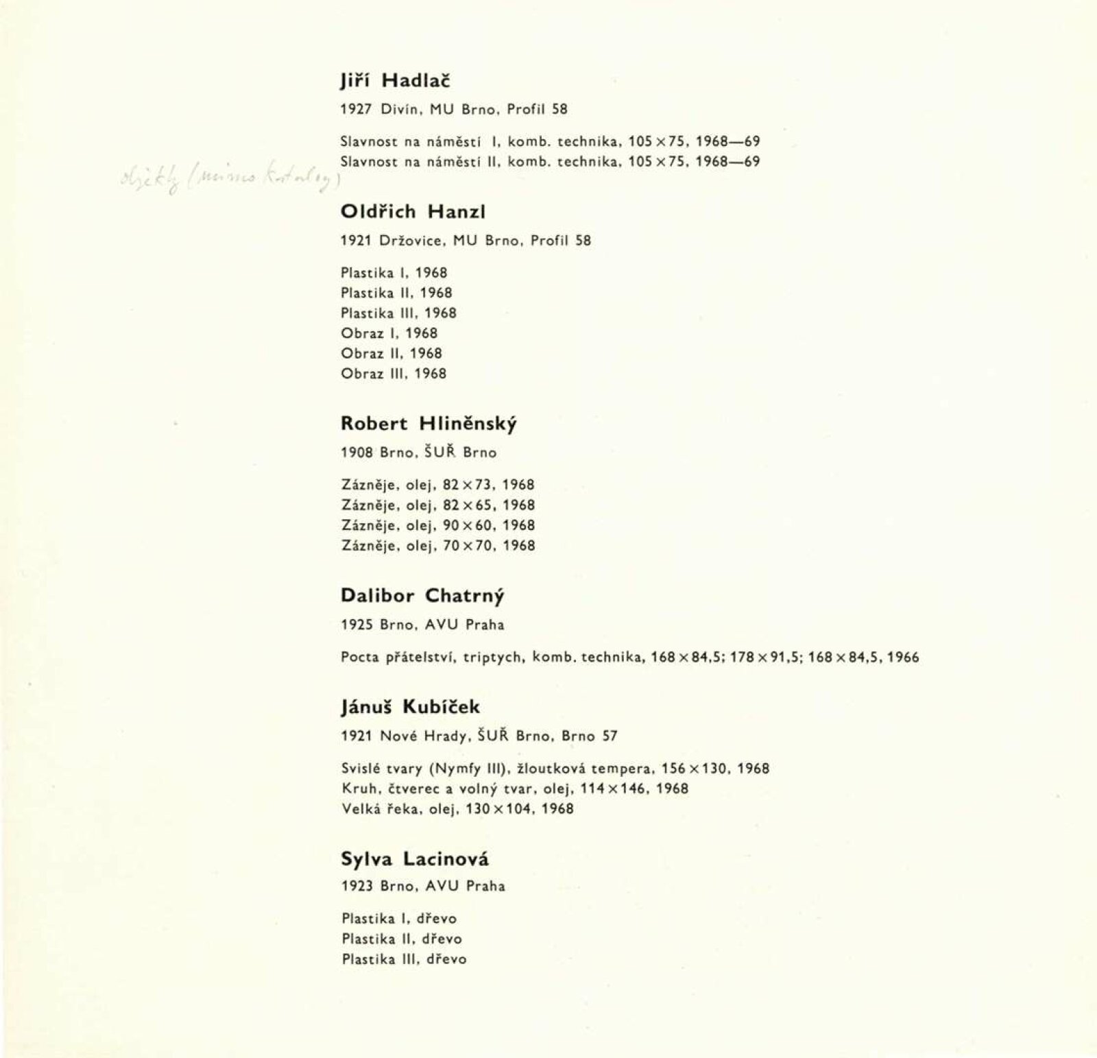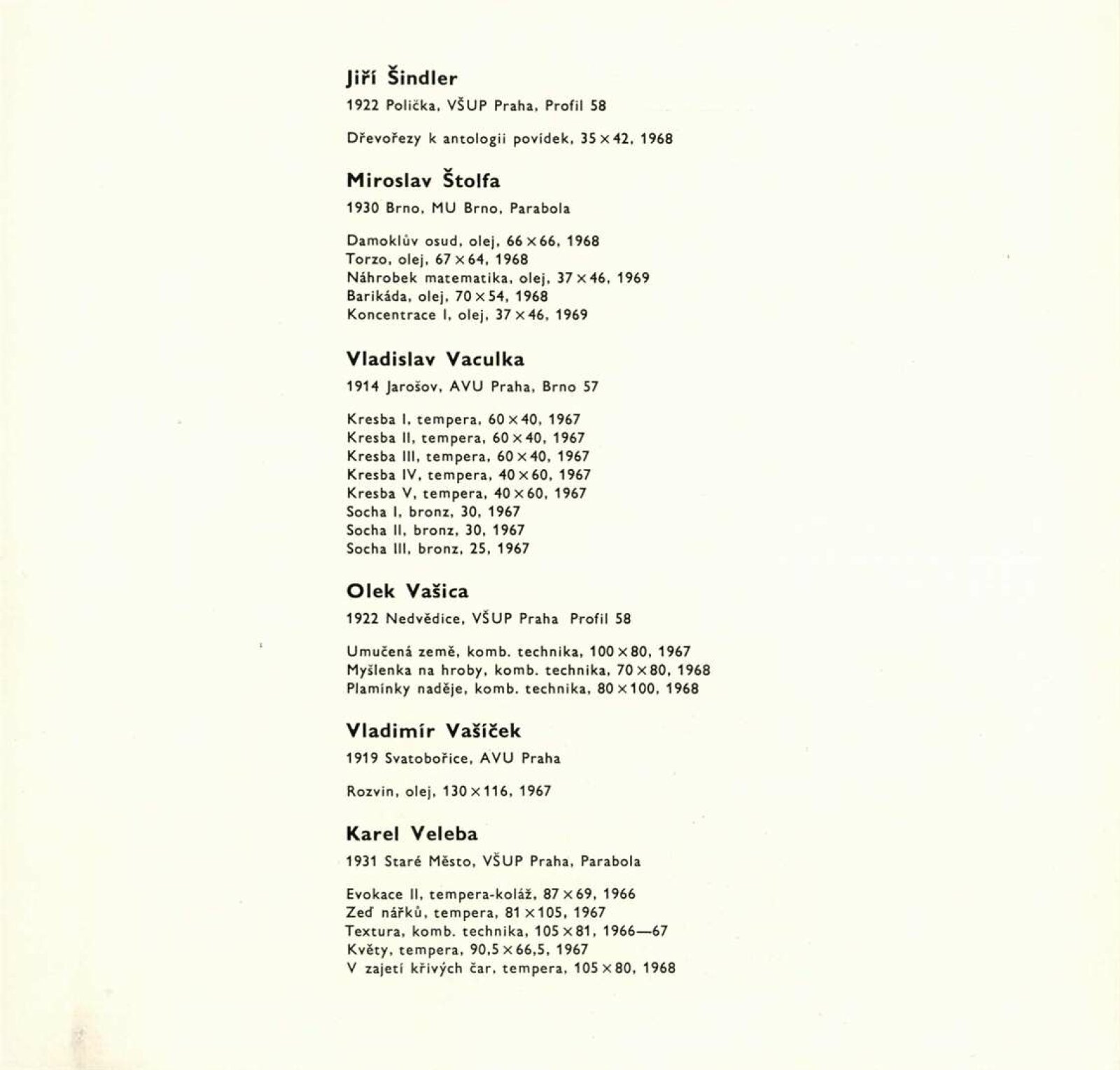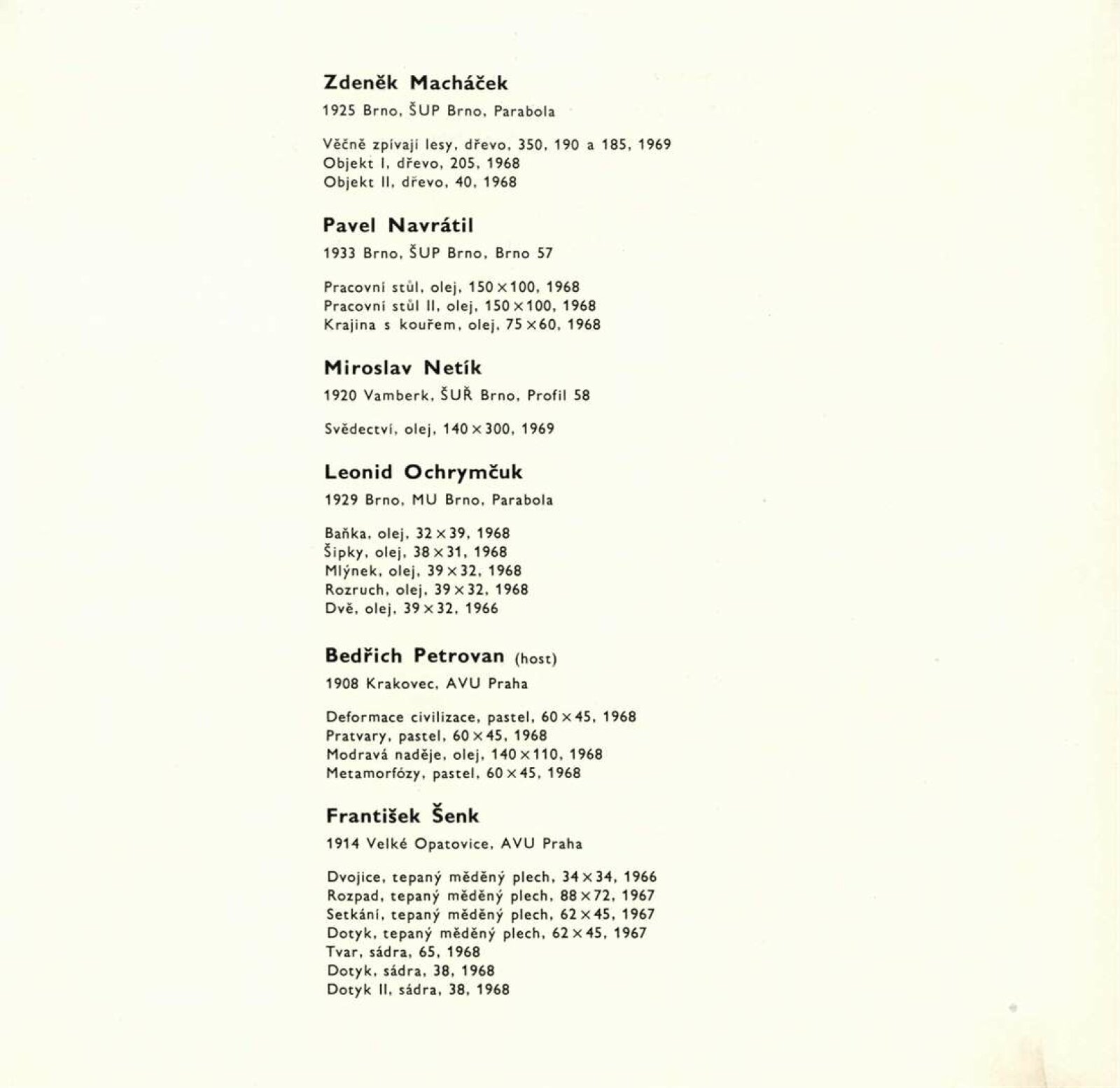 František Bič, Antonín Čalkovský, Vladimír Drápal, Marie Filippovová, Zdeněk Fuksa, Jiří Hadlač, Oldřich Hanzl, Robert Hliněnský, Dalibor Chatrný, Jánuš Kubíček, Sylva Lacinová, Zdeněk Macháček, Pavel Navrátil, Miroslav Netík, Leonid Ochrymčuk, Bedřich Petrovan, František Šenk, Jiří Šindler, Miroslav Štolfa, Vladislav Vaculka, Olek Vašica, Vladimír Vašíček, Karel Veleba