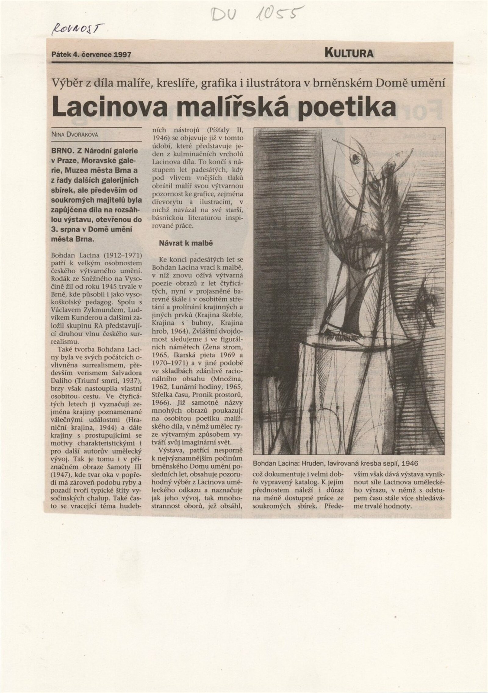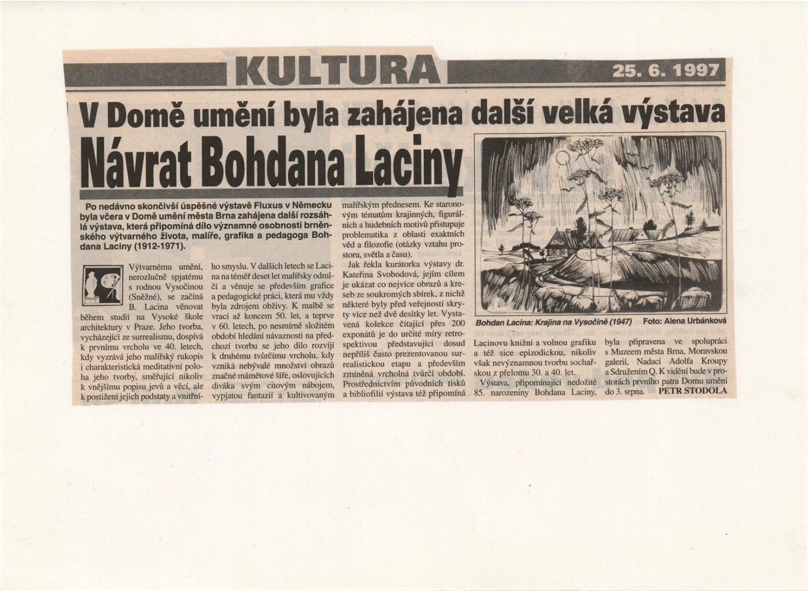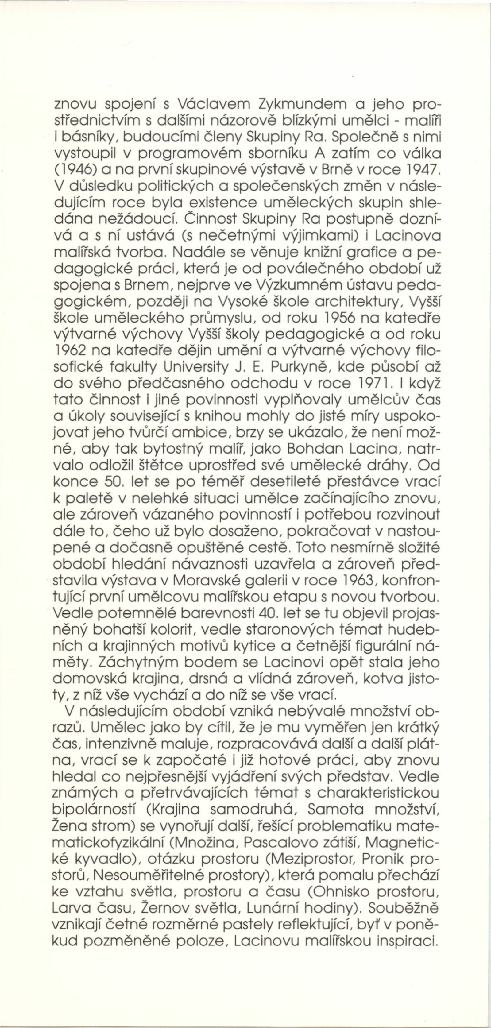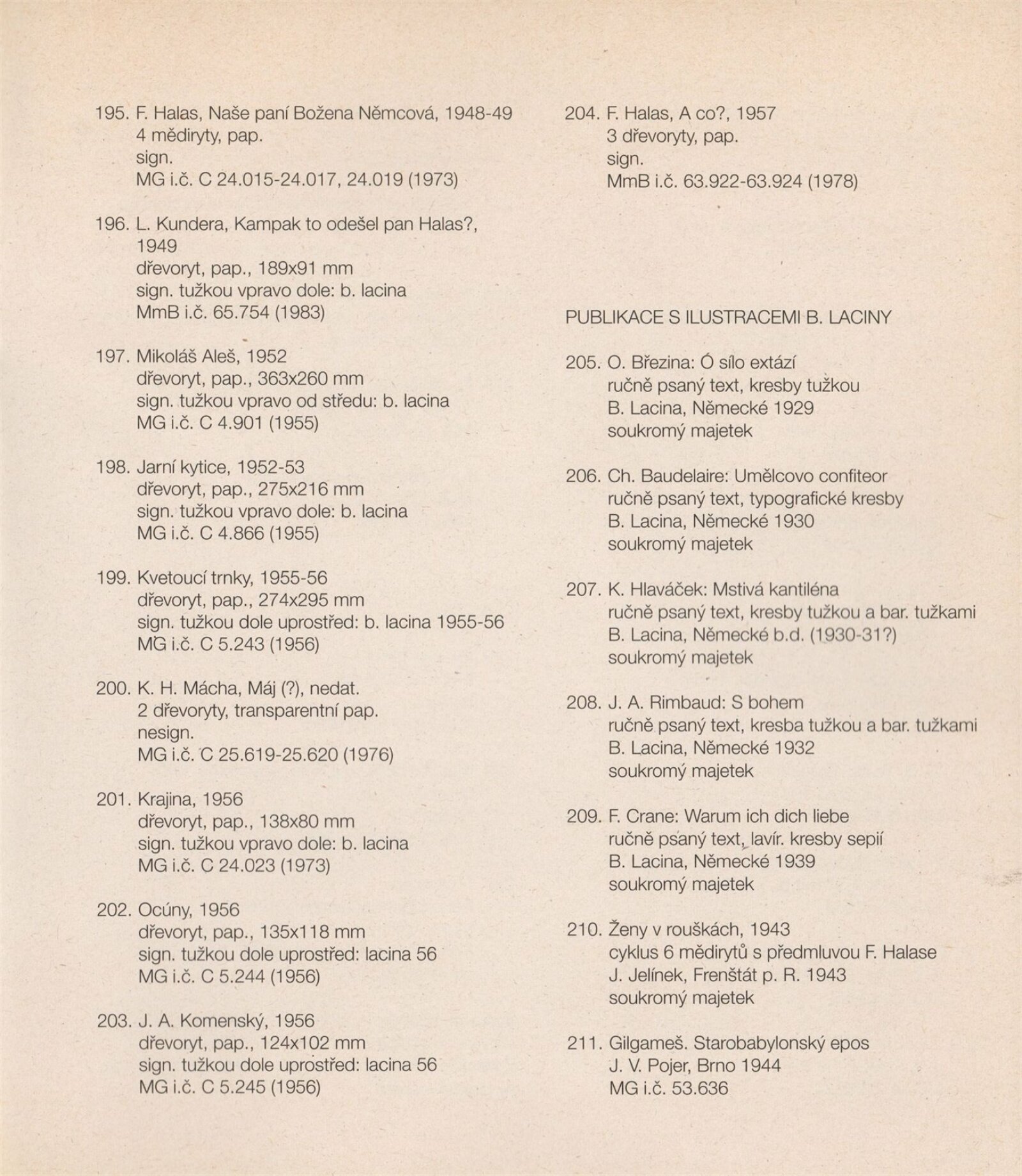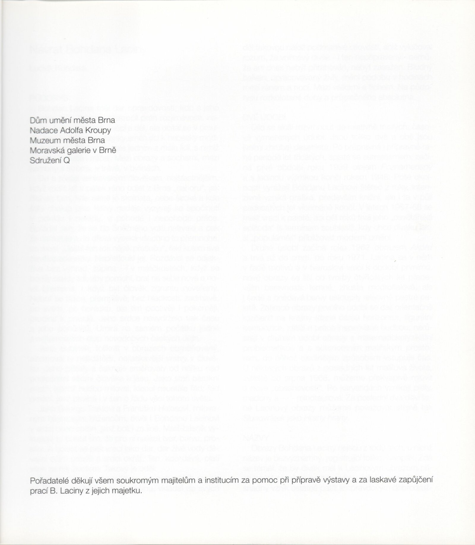 Bohdan Lacina (1912–1971): Dům umění města Brna, 24. 6. – 3. 8. 1997 / Text: Ludvík Kundera, Jiří Hlušička, Jan Lacina. – Brno: DUmB, 1997. – [44] s., obr., seznam vystavených prací [16] s., životní data, výstavy, zastoupení ve sbírkách / Bohdan Lacina (1912–1971): Dům umění města Brna, 24 .6. – 3. 8. 1997 / Text: Kateřina Svobodová. – Brno: Dům umění města Brna, 1997. – [4 s.], DU 1055. – MG