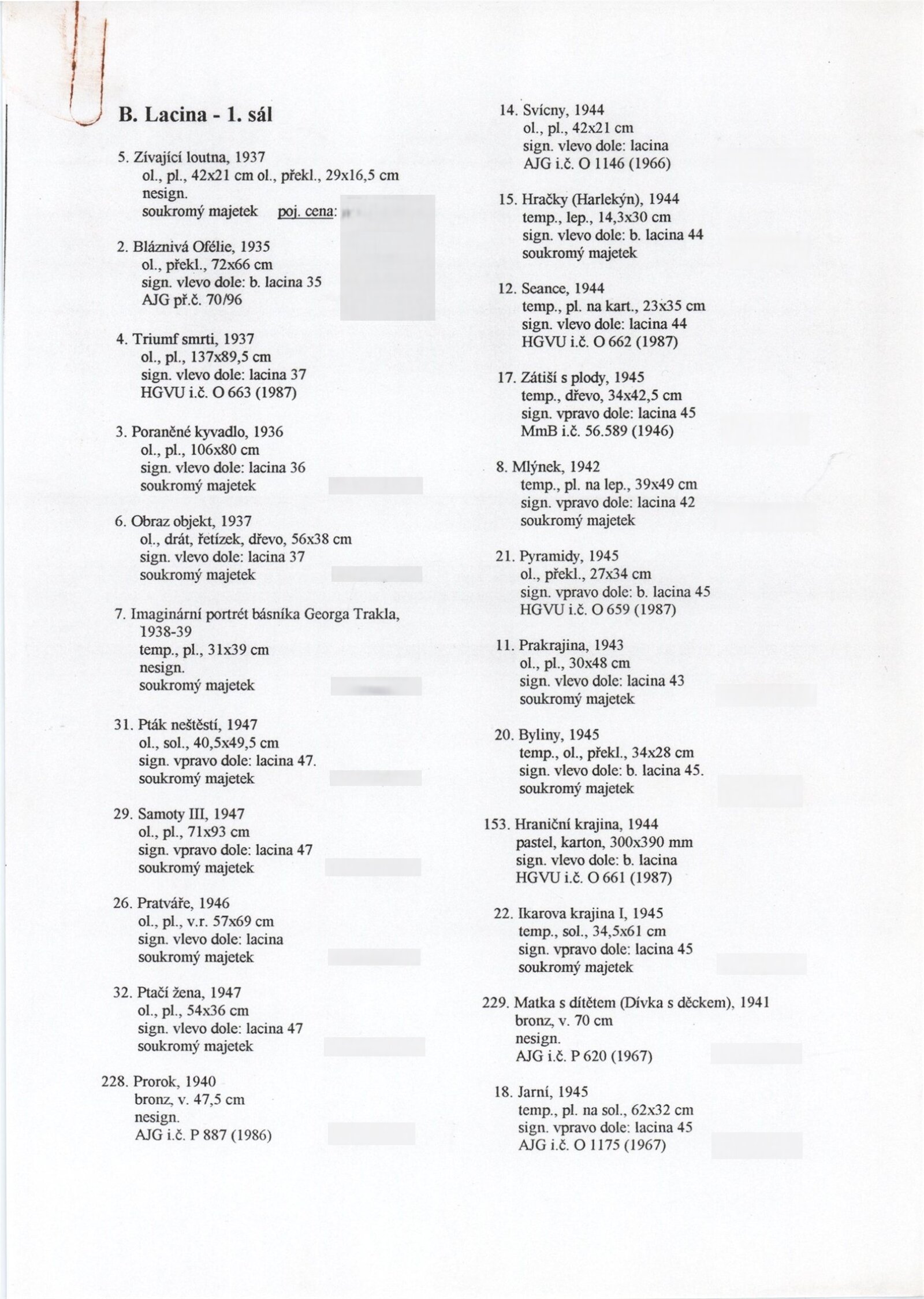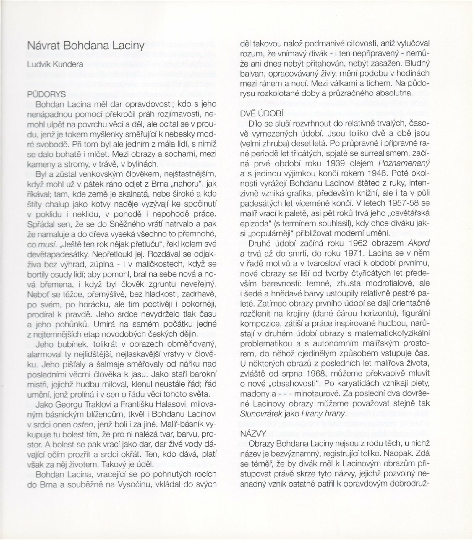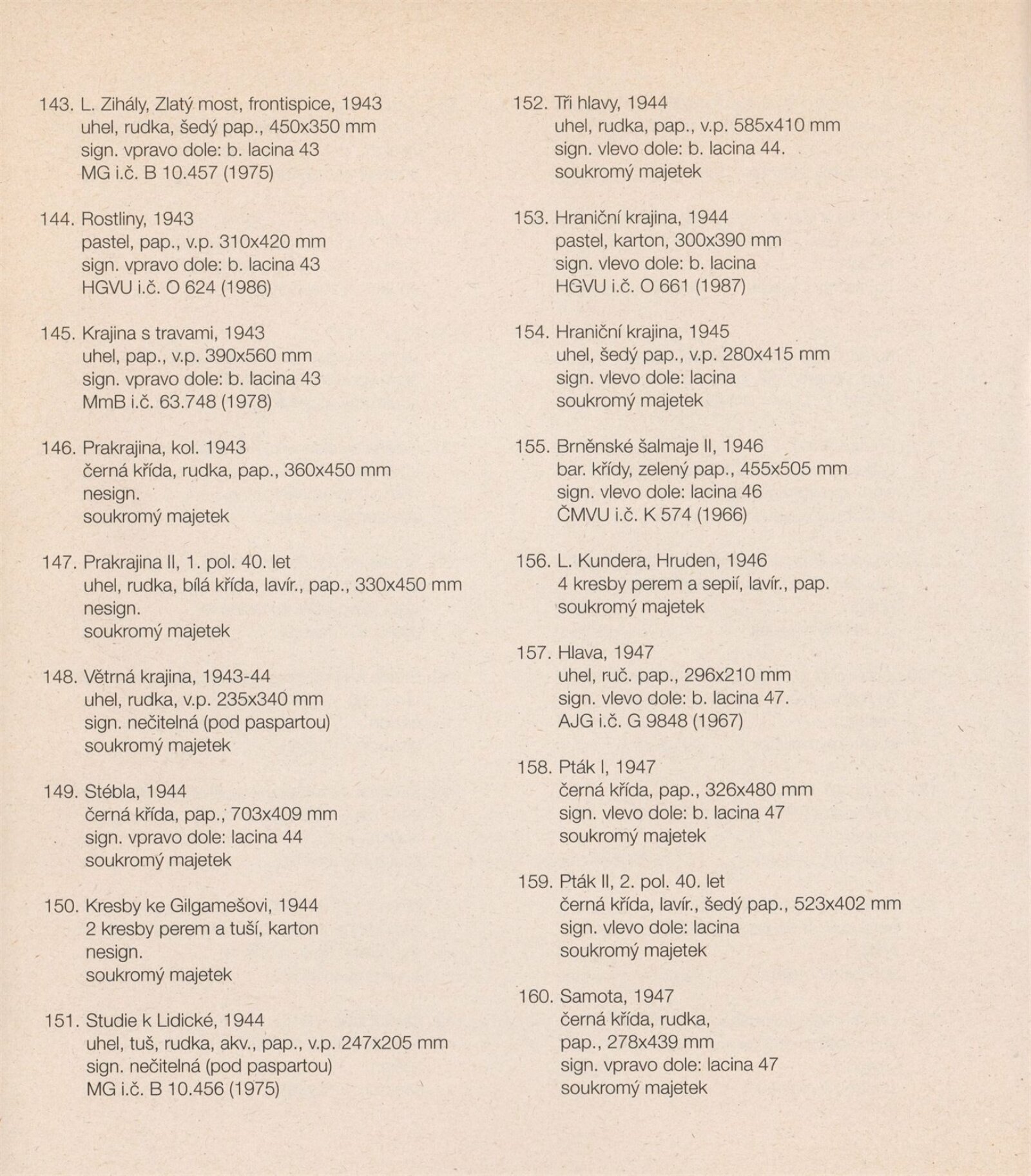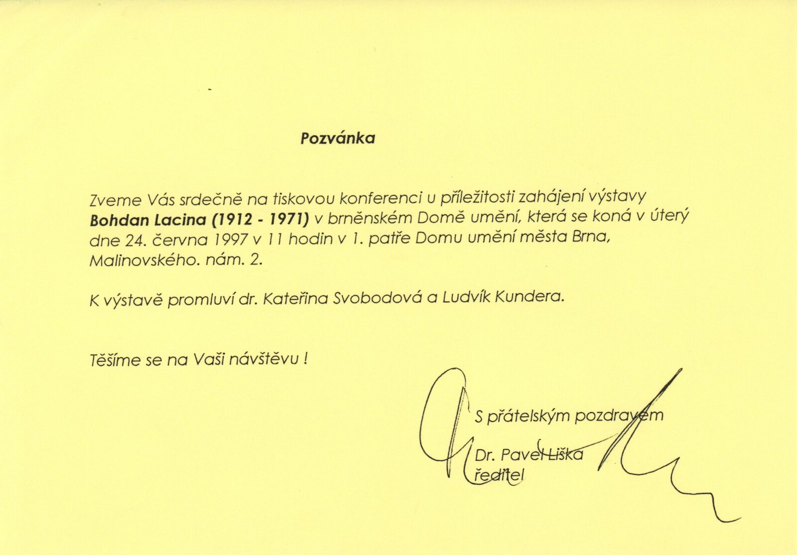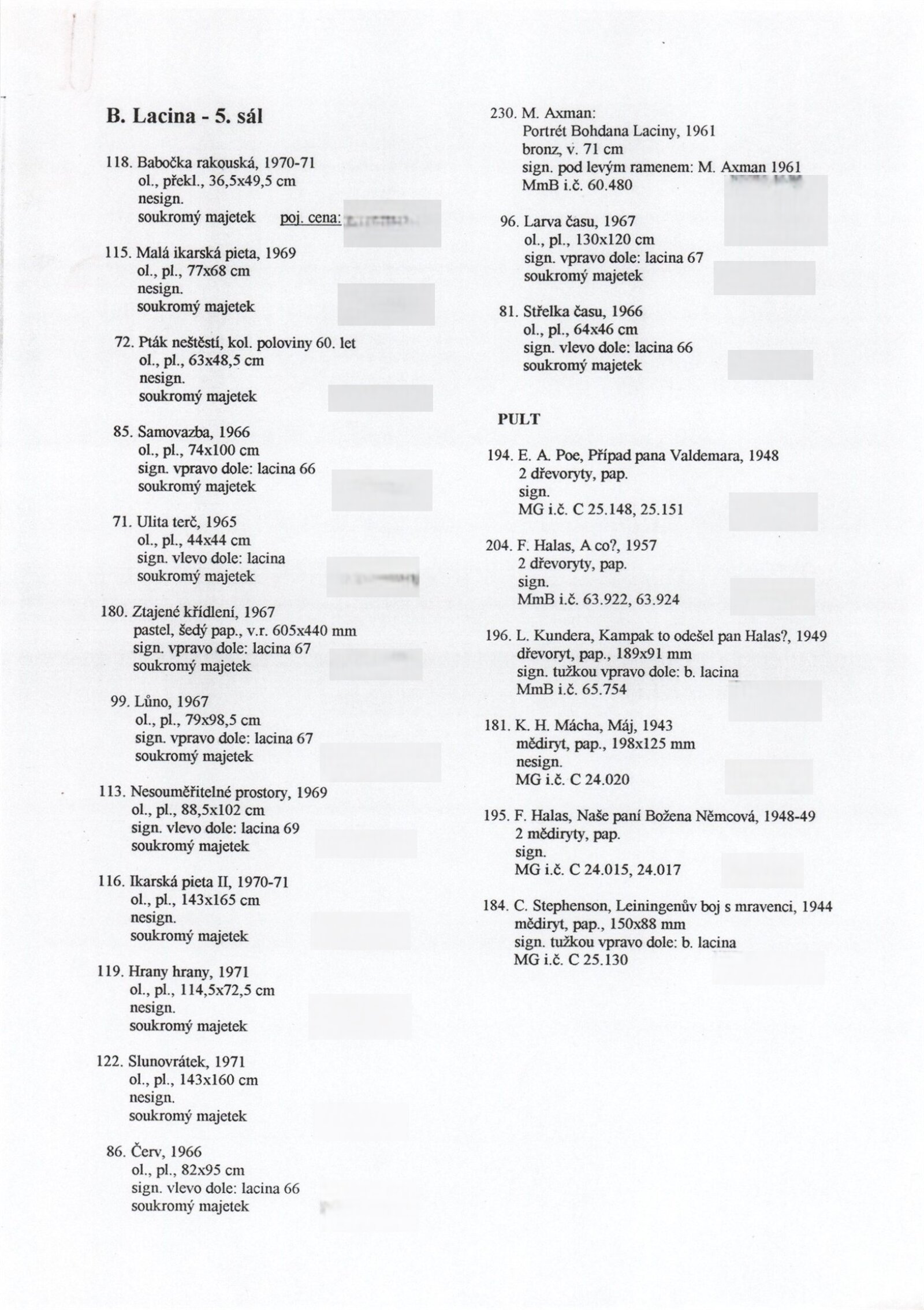 Bohdan Lacina (1912–1971): Dům umění města Brna, 24. 6. – 3. 8. 1997 / Text: Ludvík Kundera, Jiří Hlušička, Jan Lacina. – Brno: DUmB, 1997. – [44] s., obr., seznam vystavených prací [16] s., životní data, výstavy, zastoupení ve sbírkách / Bohdan Lacina (1912–1971): Dům umění města Brna, 24 .6. – 3. 8. 1997 / Text: Kateřina Svobodová. – Brno: Dům umění města Brna, 1997. – [4 s.], DU 1055. – MG