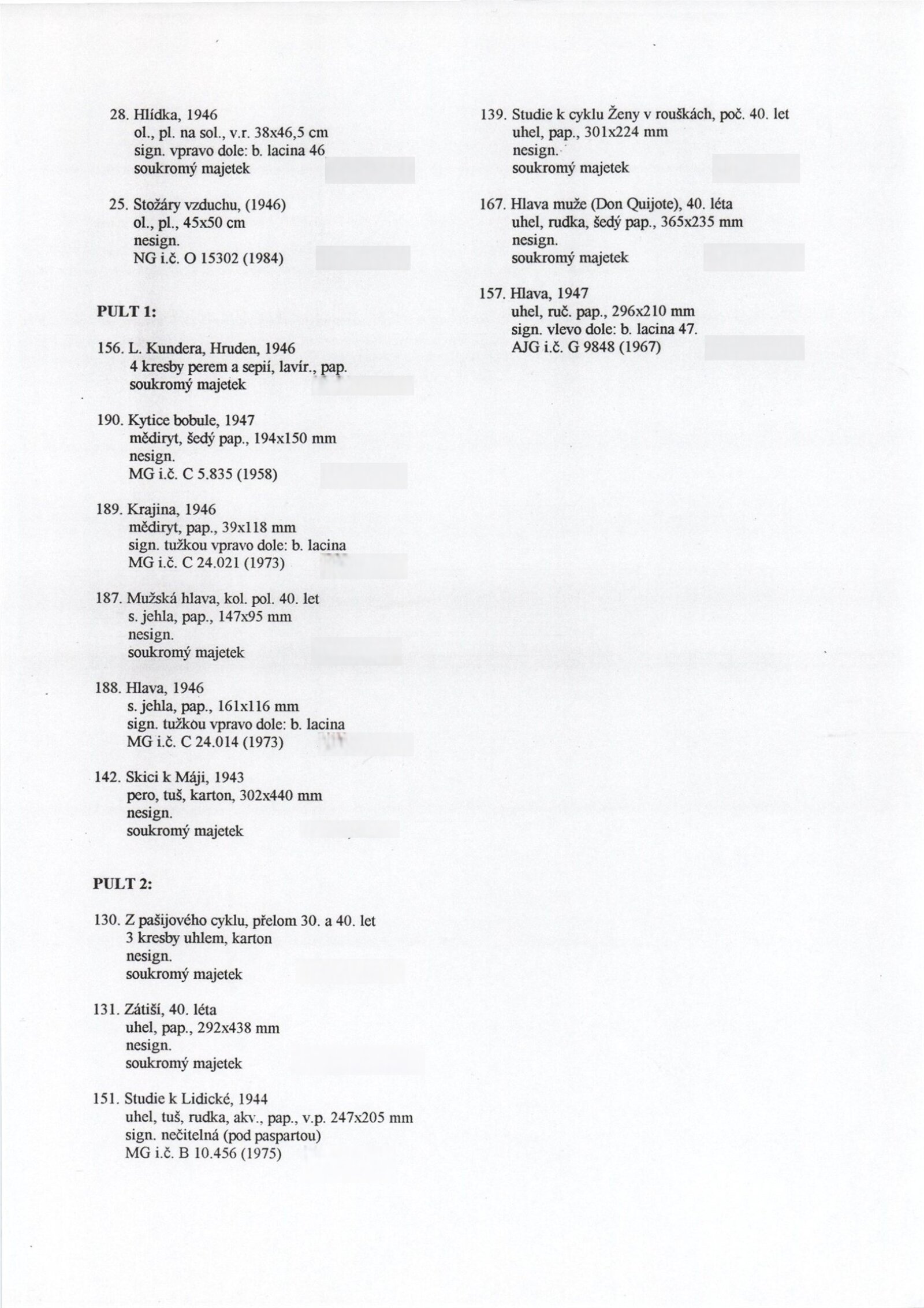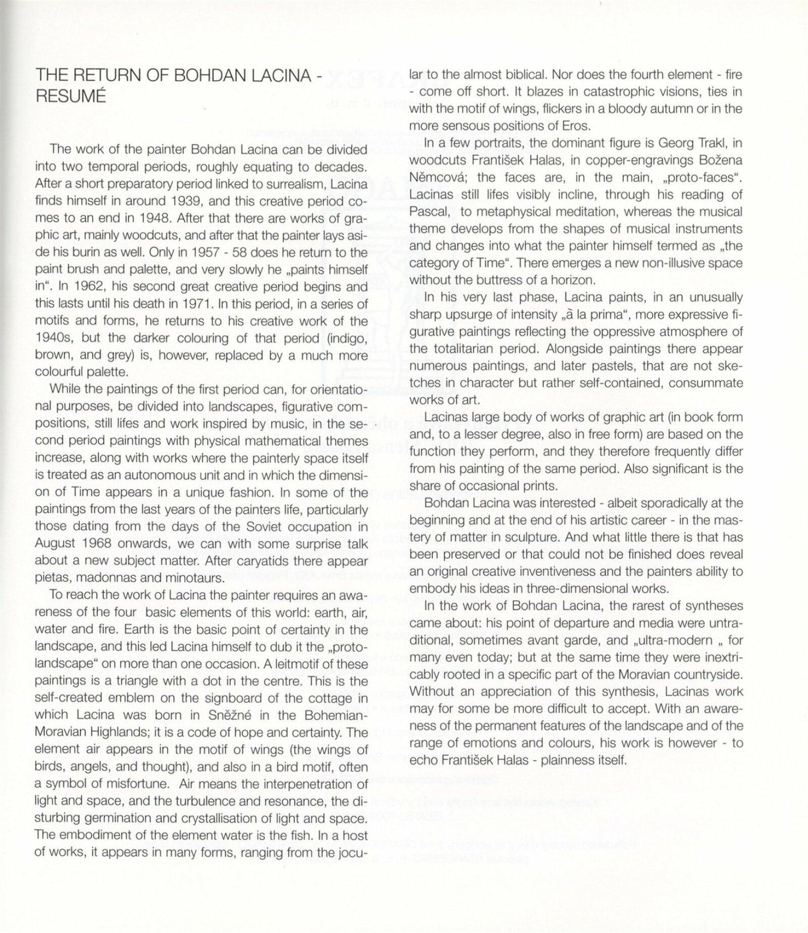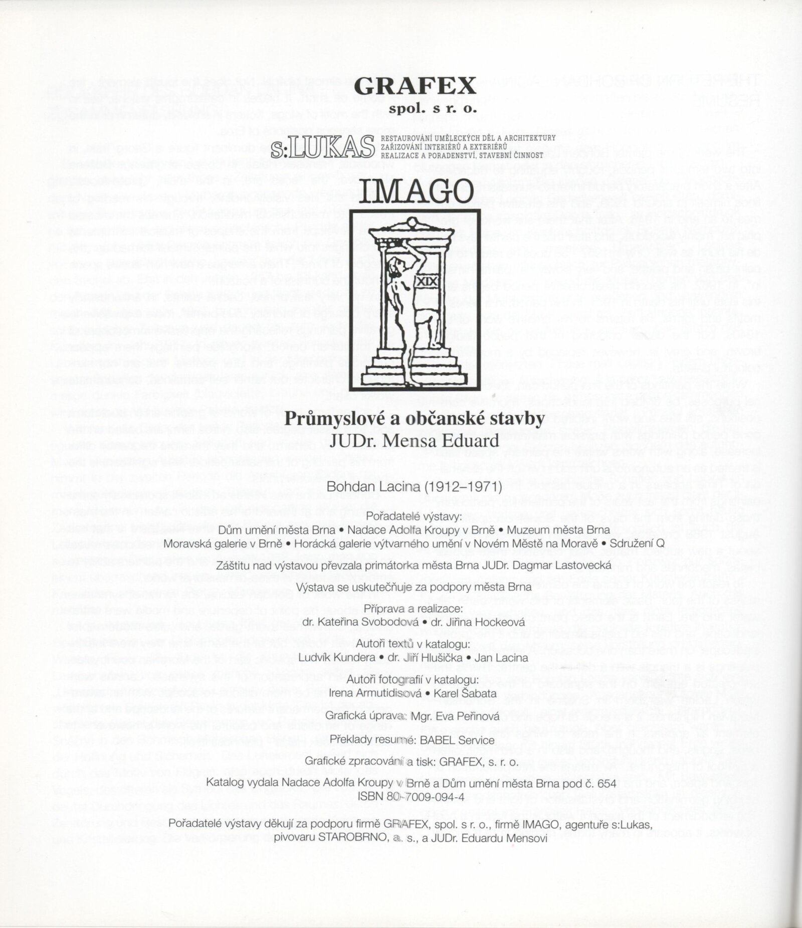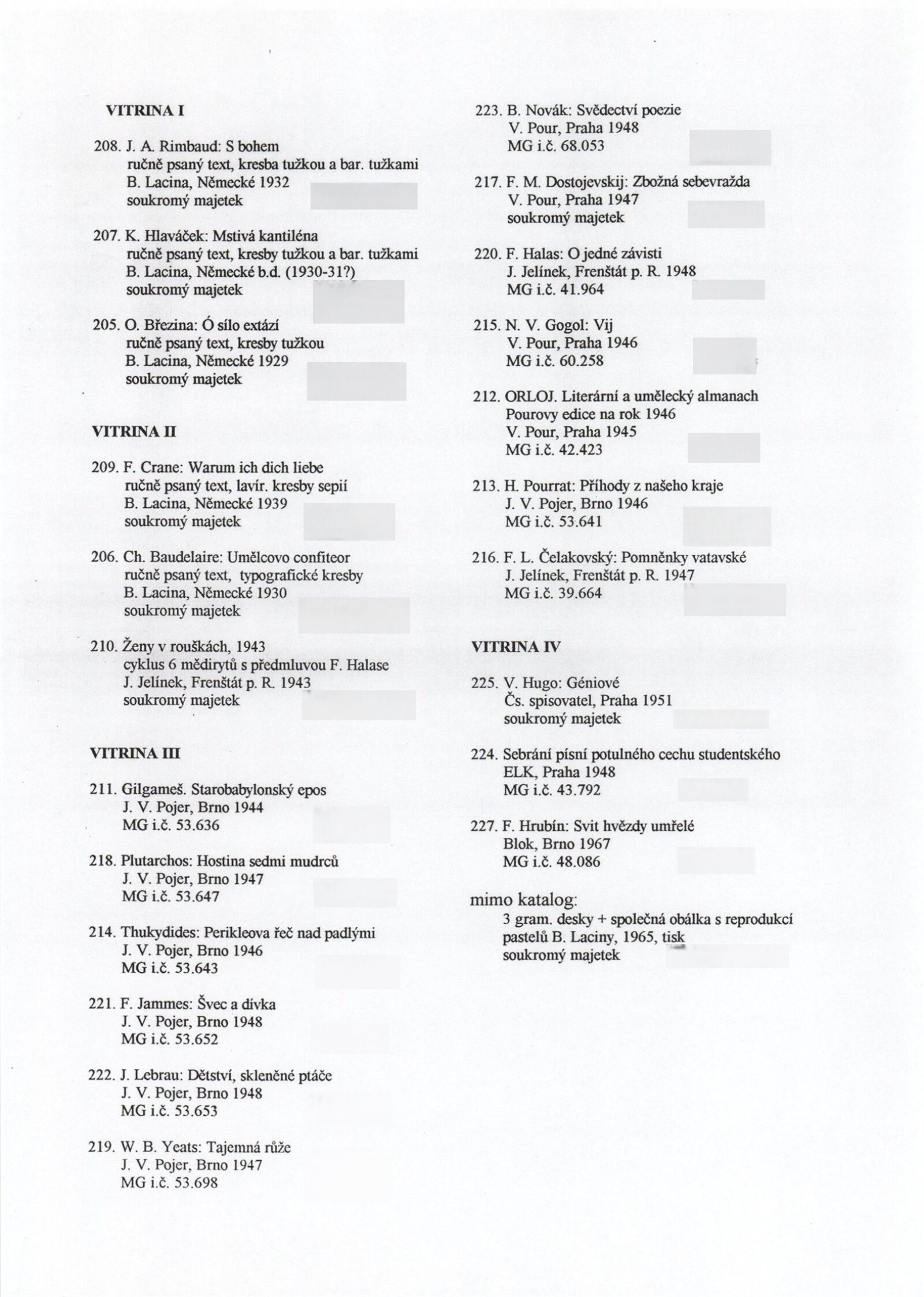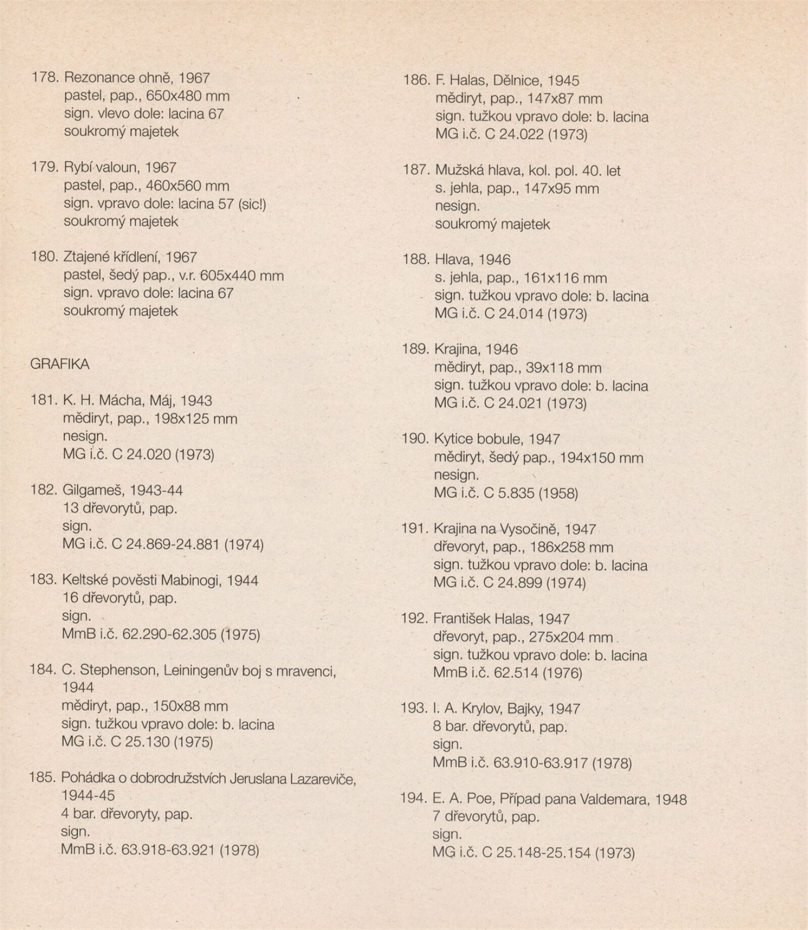 Bohdan Lacina (1912–1971): Dům umění města Brna, 24. 6. – 3. 8. 1997 / Text: Ludvík Kundera, Jiří Hlušička, Jan Lacina. – Brno: DUmB, 1997. – [44] s., obr., seznam vystavených prací [16] s., životní data, výstavy, zastoupení ve sbírkách / Bohdan Lacina (1912–1971): Dům umění města Brna, 24 .6. – 3. 8. 1997 / Text: Kateřina Svobodová. – Brno: Dům umění města Brna, 1997. – [4 s.], DU 1055. – MG
