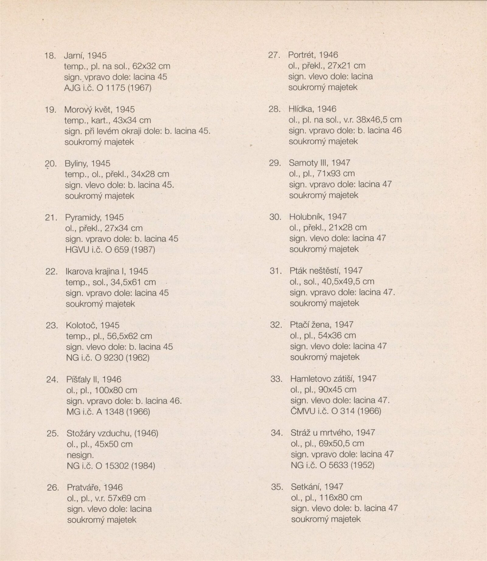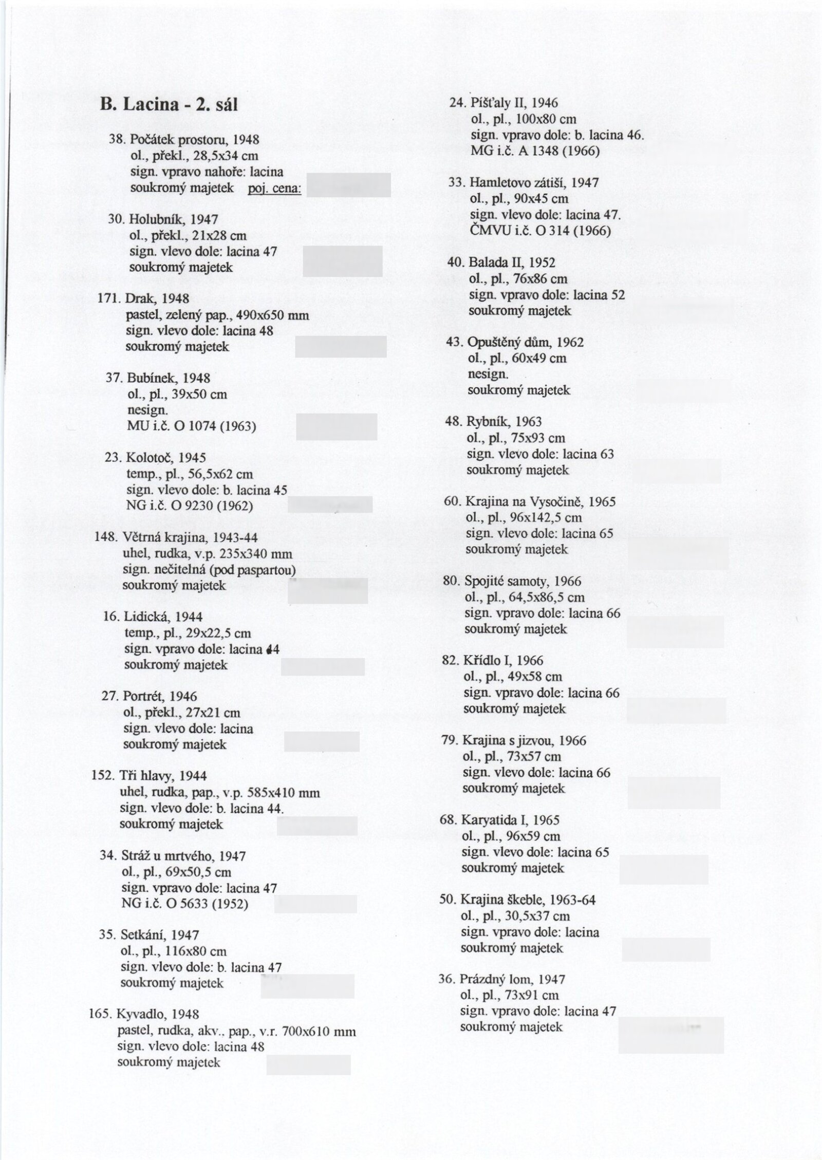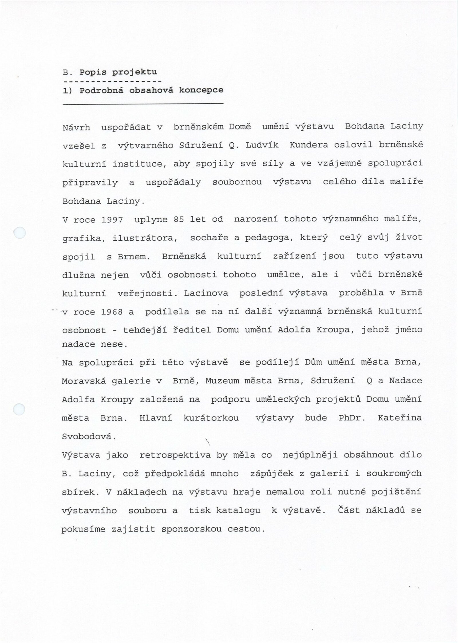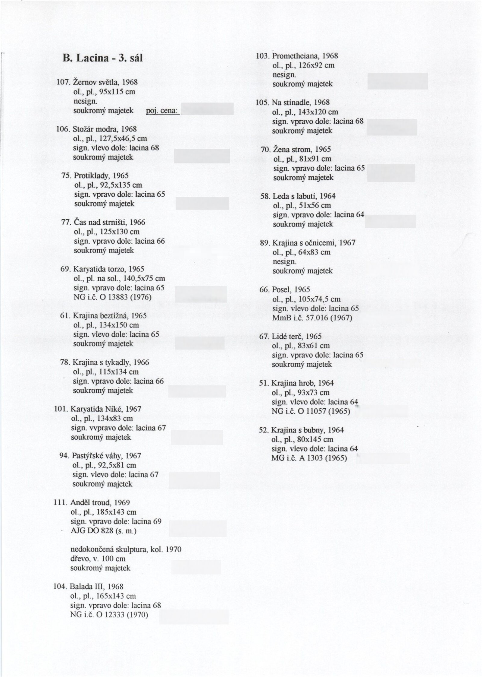 pozvánka na výstavu a tiskovou konferenci, prospekt, katalog, podklady pro katalog, fotografie výstavy, seznam vystavených děl, pojistný seznam, rozmístění děl v sálech DU, institucionální a provozní korespondence, smlouvy, reverzy, žádost Nadace A. Kroupy o finanční dotaci, adresy, recenze v tisku, tisk/katalog Jan Lacina - Když voní káva, seno a terpentýn, katalogy (Dům umění města Brna, Alšova jihočeská galerie 1968, Horácká galerie výtvarného umění v Novém Městě na Moravě 1982)