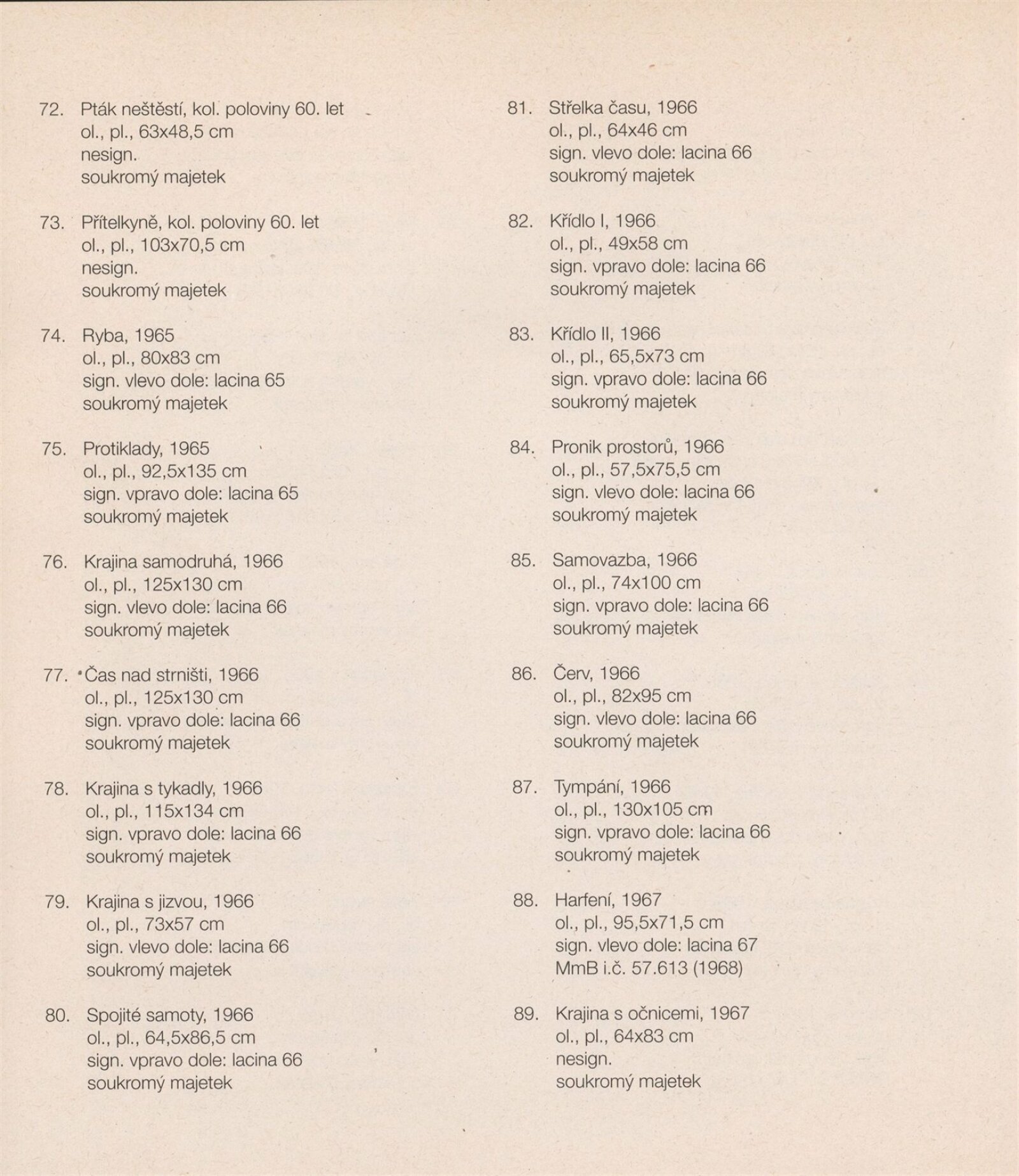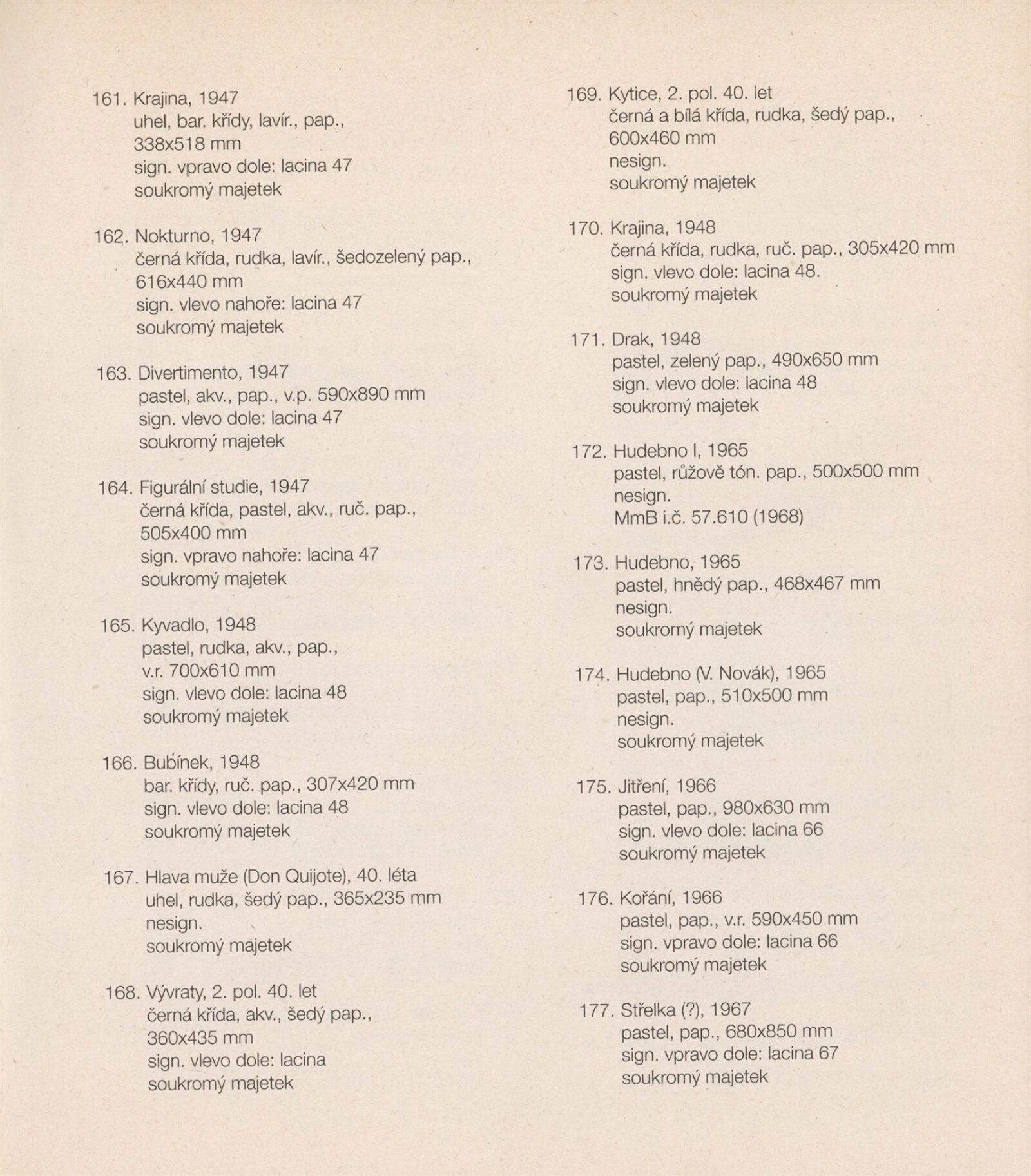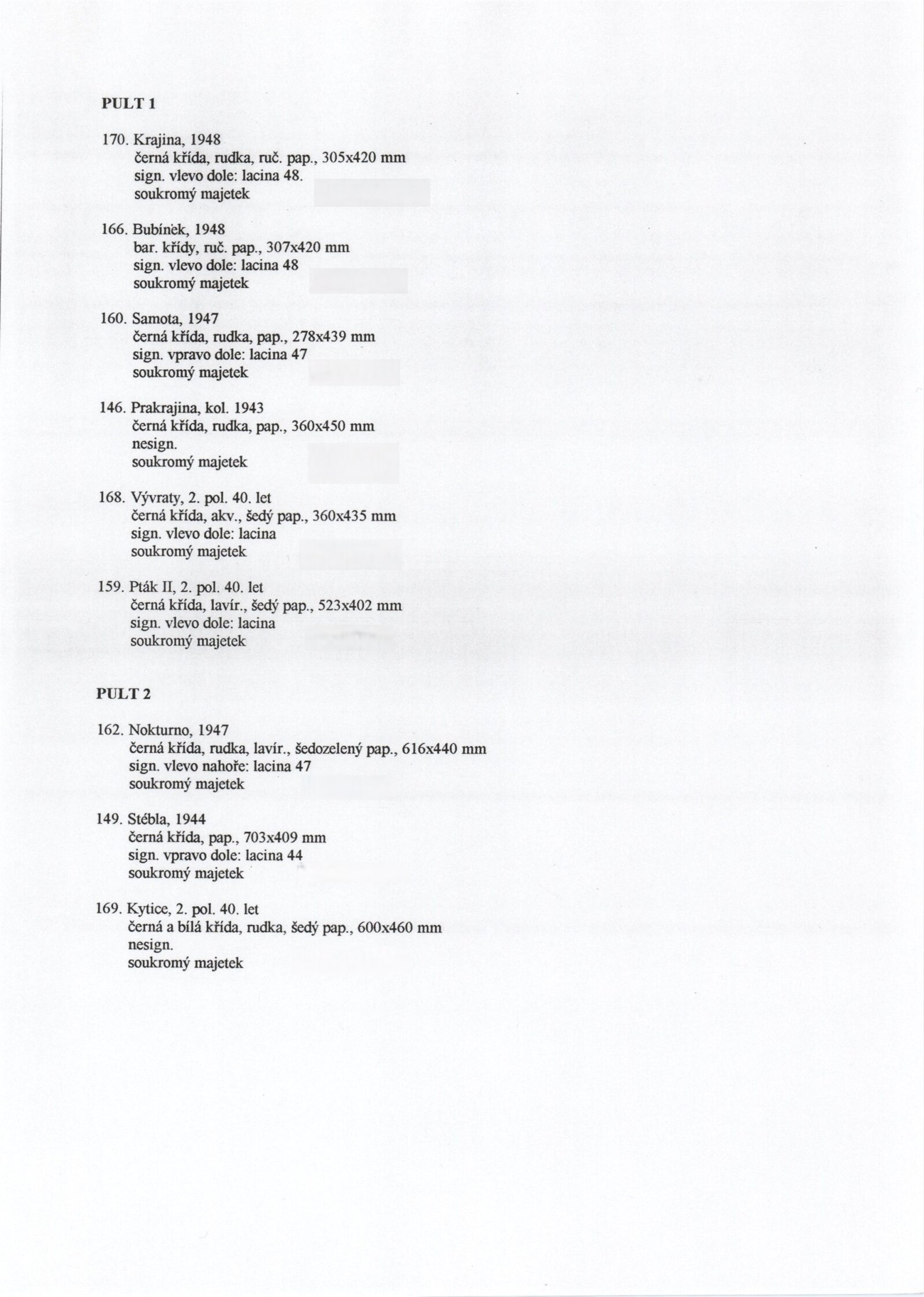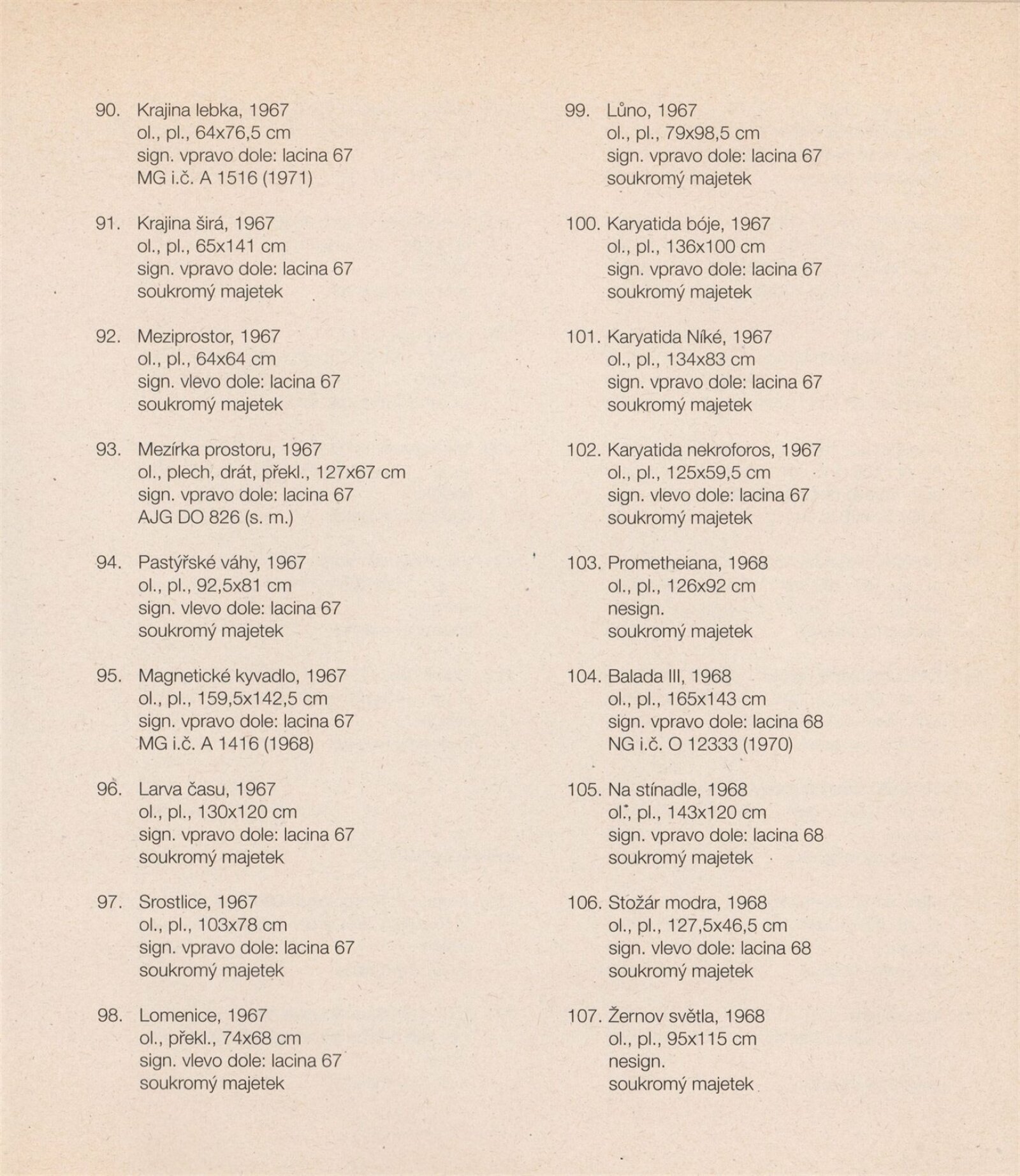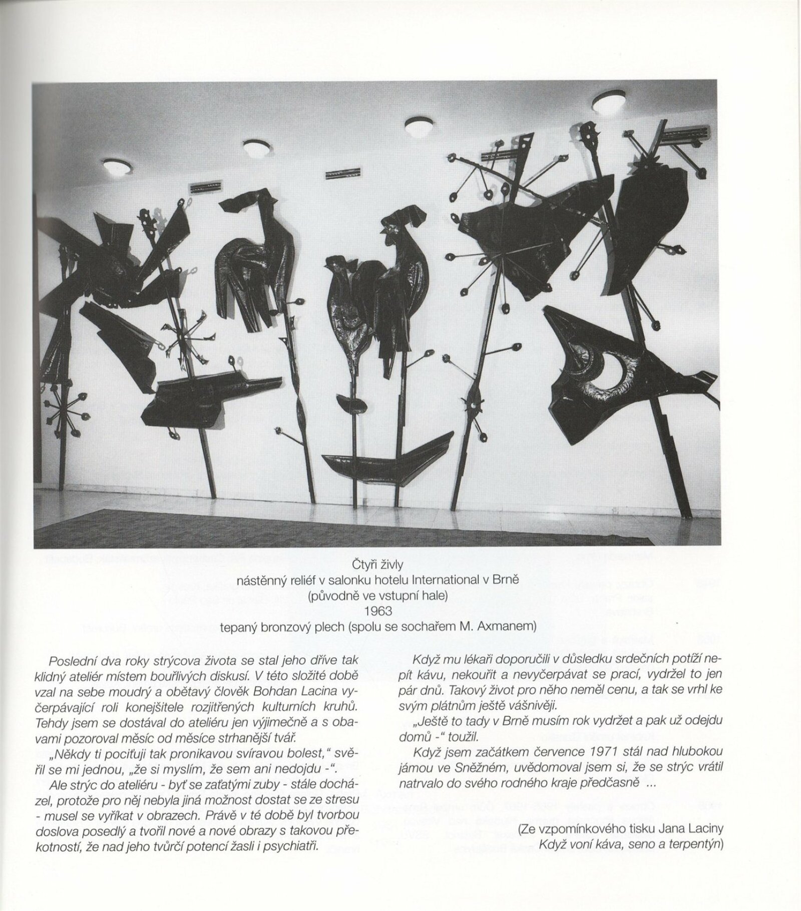 pozvánka na výstavu a tiskovou konferenci, prospekt, katalog, podklady pro katalog, fotografie výstavy, seznam vystavených děl, pojistný seznam, rozmístění děl v sálech DU, institucionální a provozní korespondence, smlouvy, reverzy, žádost Nadace A. Kroupy o finanční dotaci, adresy, recenze v tisku, tisk/katalog Jan Lacina - Když voní káva, seno a terpentýn, katalogy (Dům umění města Brna, Alšova jihočeská galerie 1968, Horácká galerie výtvarného umění v Novém Městě na Moravě 1982)