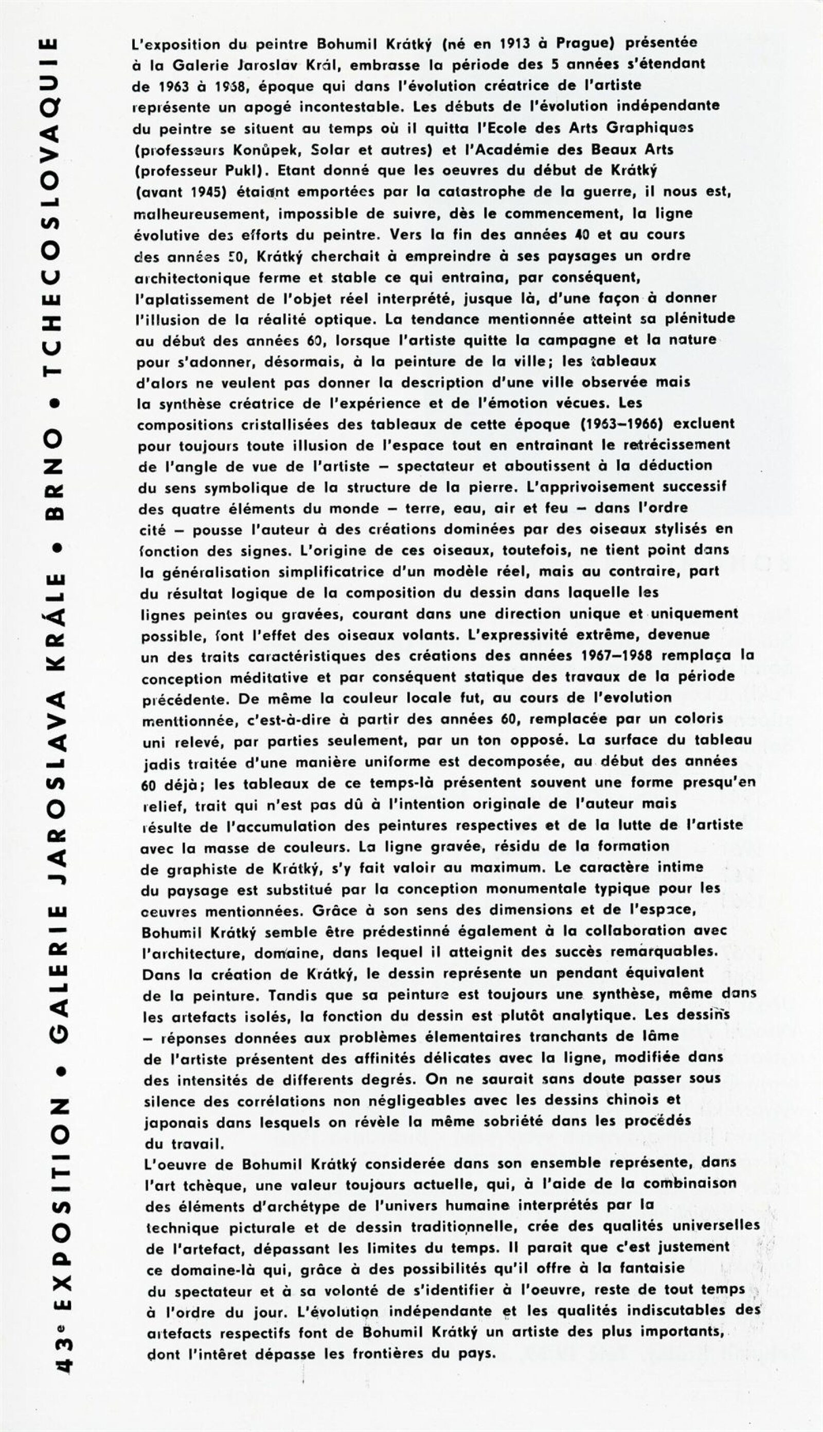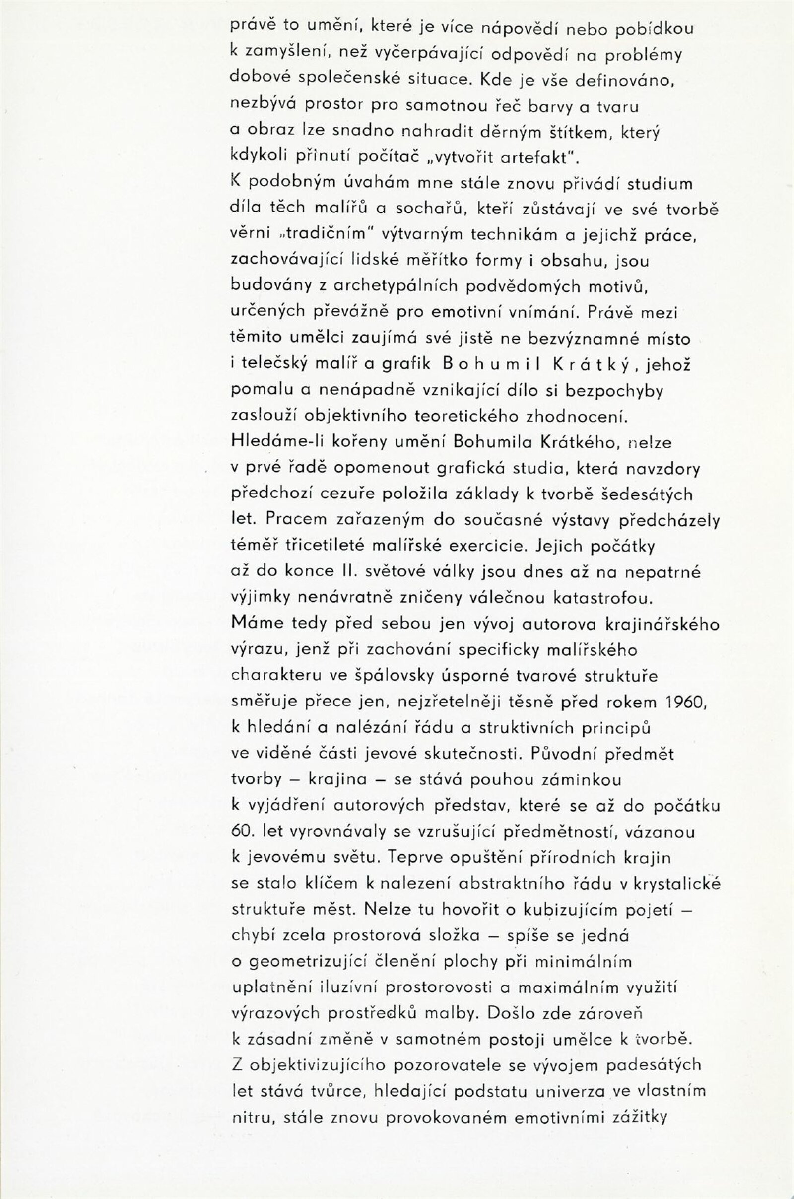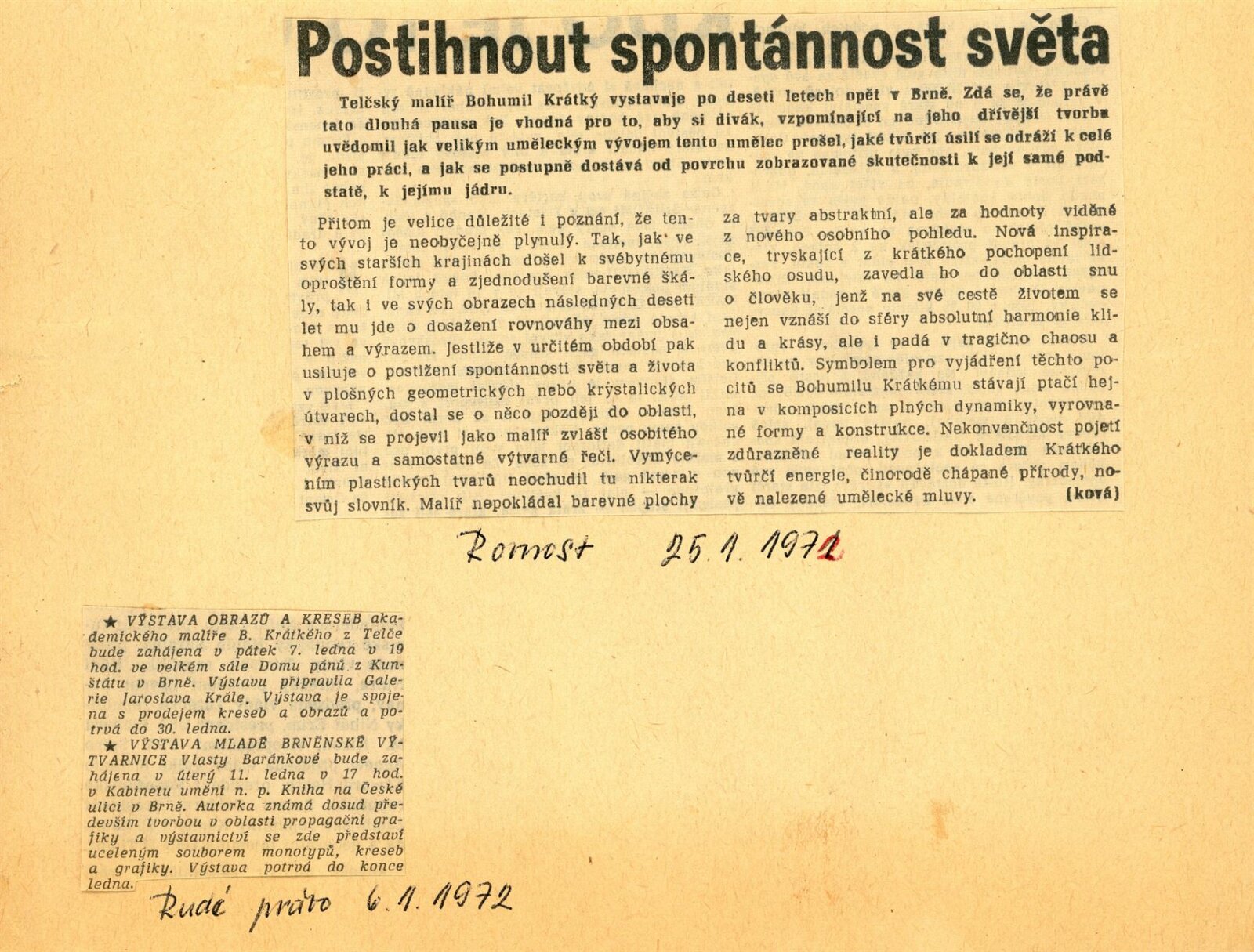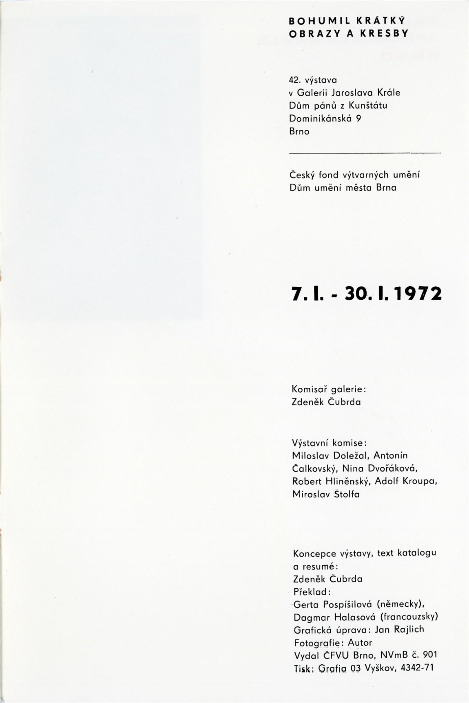 Bohumil Krátký. Obrazy a kresby: Dům umění města Brna, 42. výstava v Galerii Jaroslava Krále a Dům umění města Brna / Dům pánů z Kunštátu, 7. 1. – 30. 1. 1972 / Text: Zdeněk Čubrda. – Brno: ČFVU, 1972. – 12 s., obr., portrét, životní data, výstavy, DU 563. – MZK; MG; MMB