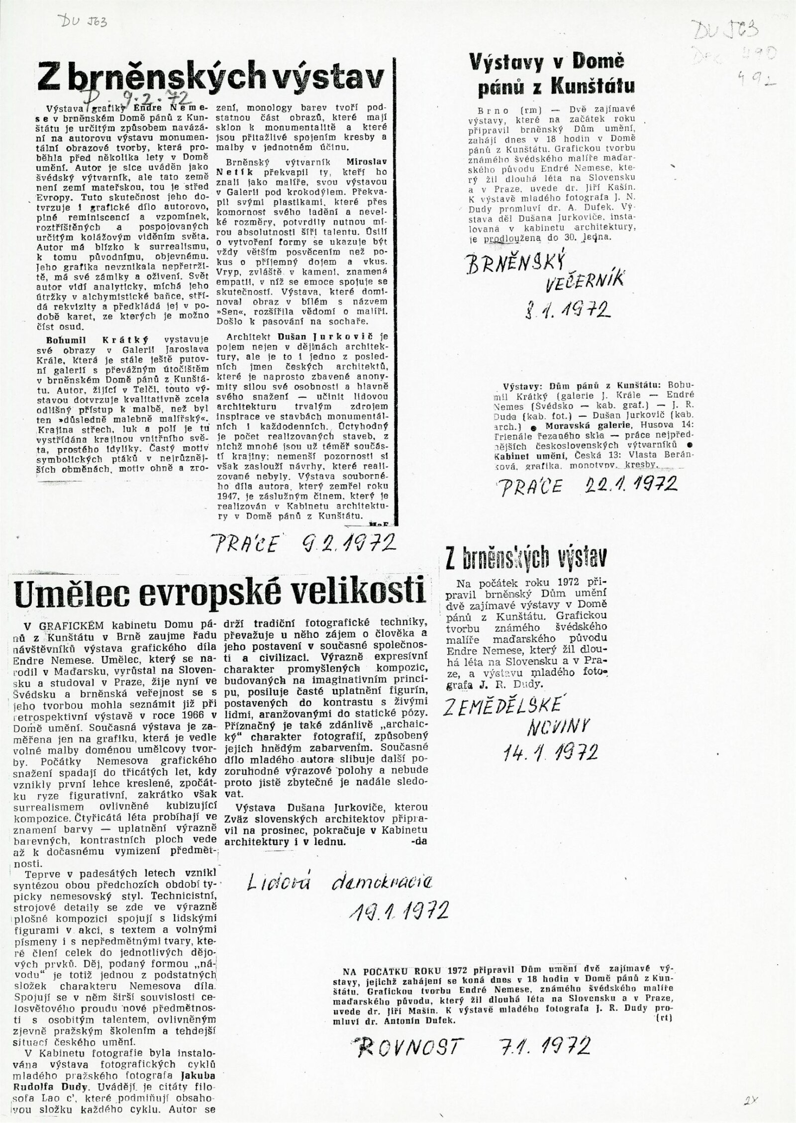 katalog (+ katalog DU 392), fotografie z vernisáže, fotografie díla, recenze v tisku