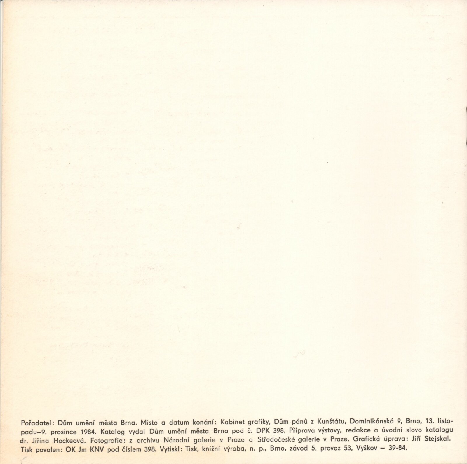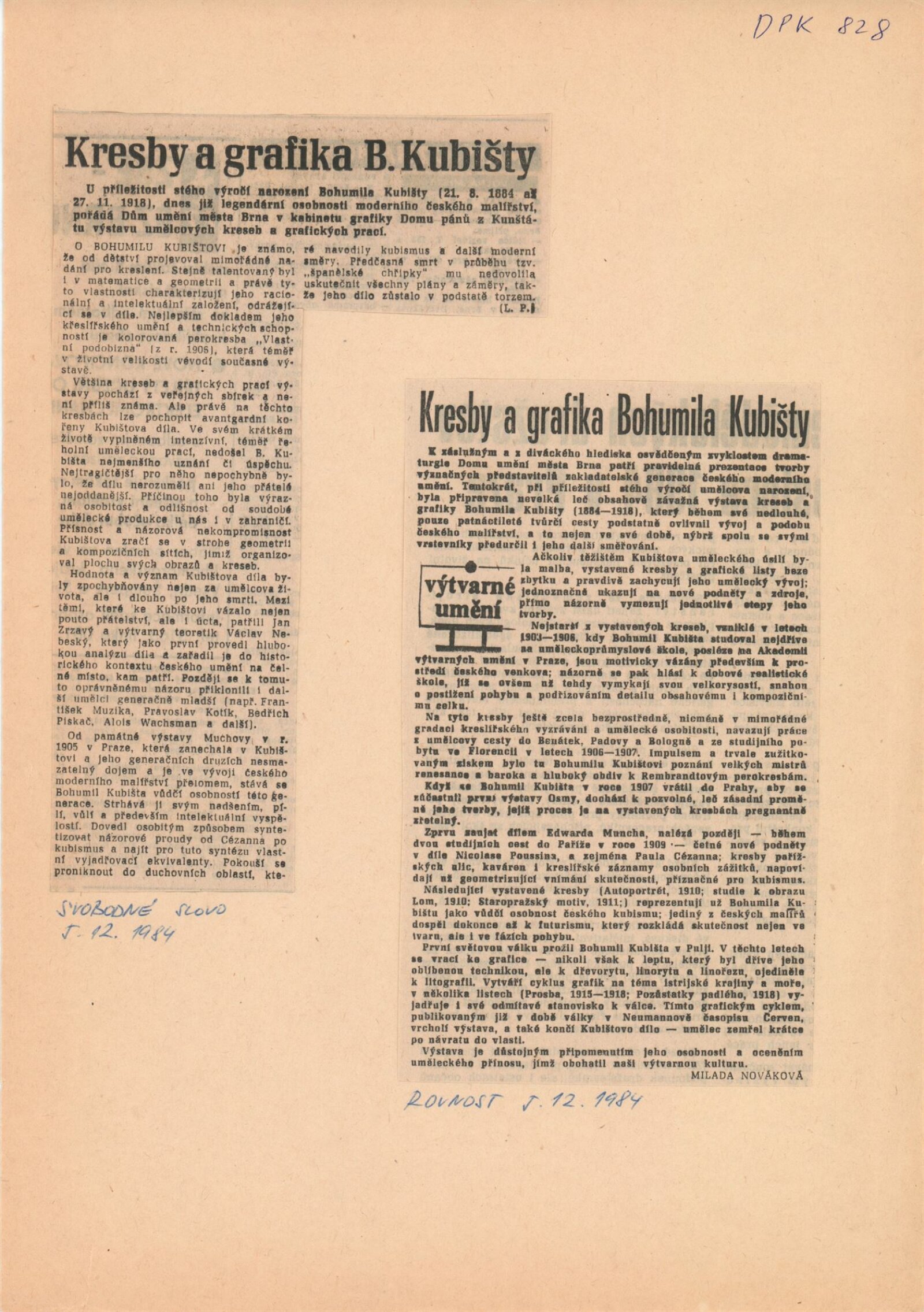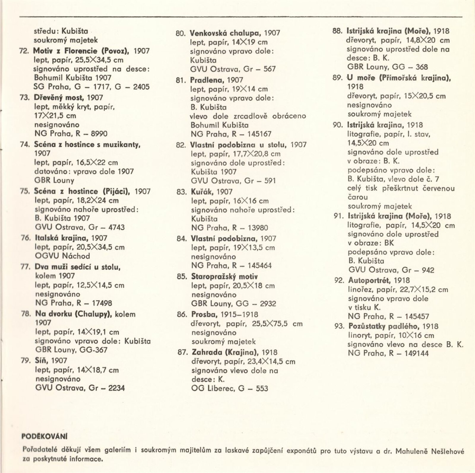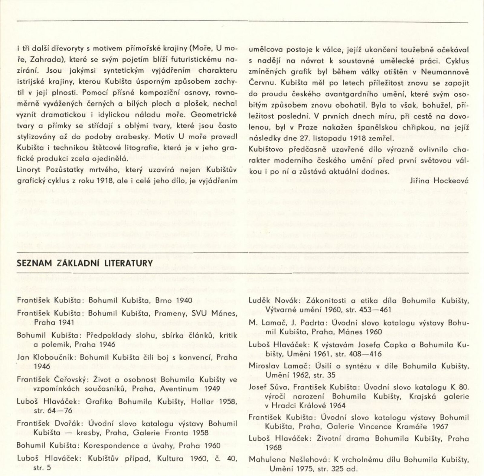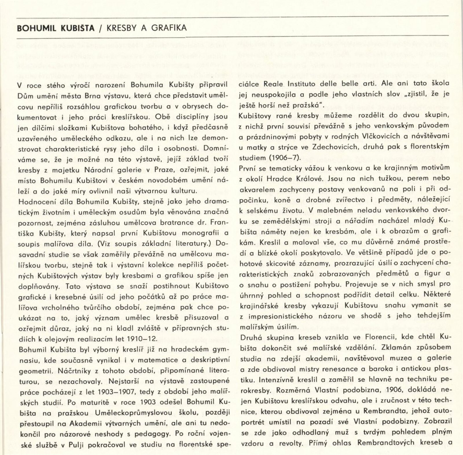 Bohumil Kubišta. Kresby a grafika. Výstava k 100. výročí narození: Dům umění / Dům pánů z Kunštátu, Kabinet grafiky, 13. 11. – 9. 12. 1984 / Text: Jiřina Hockeová. – Brno: DUmB, 1984. – 24 s., obr., životní data, bibliografie, DPK 828. – MZK; MG; MMB