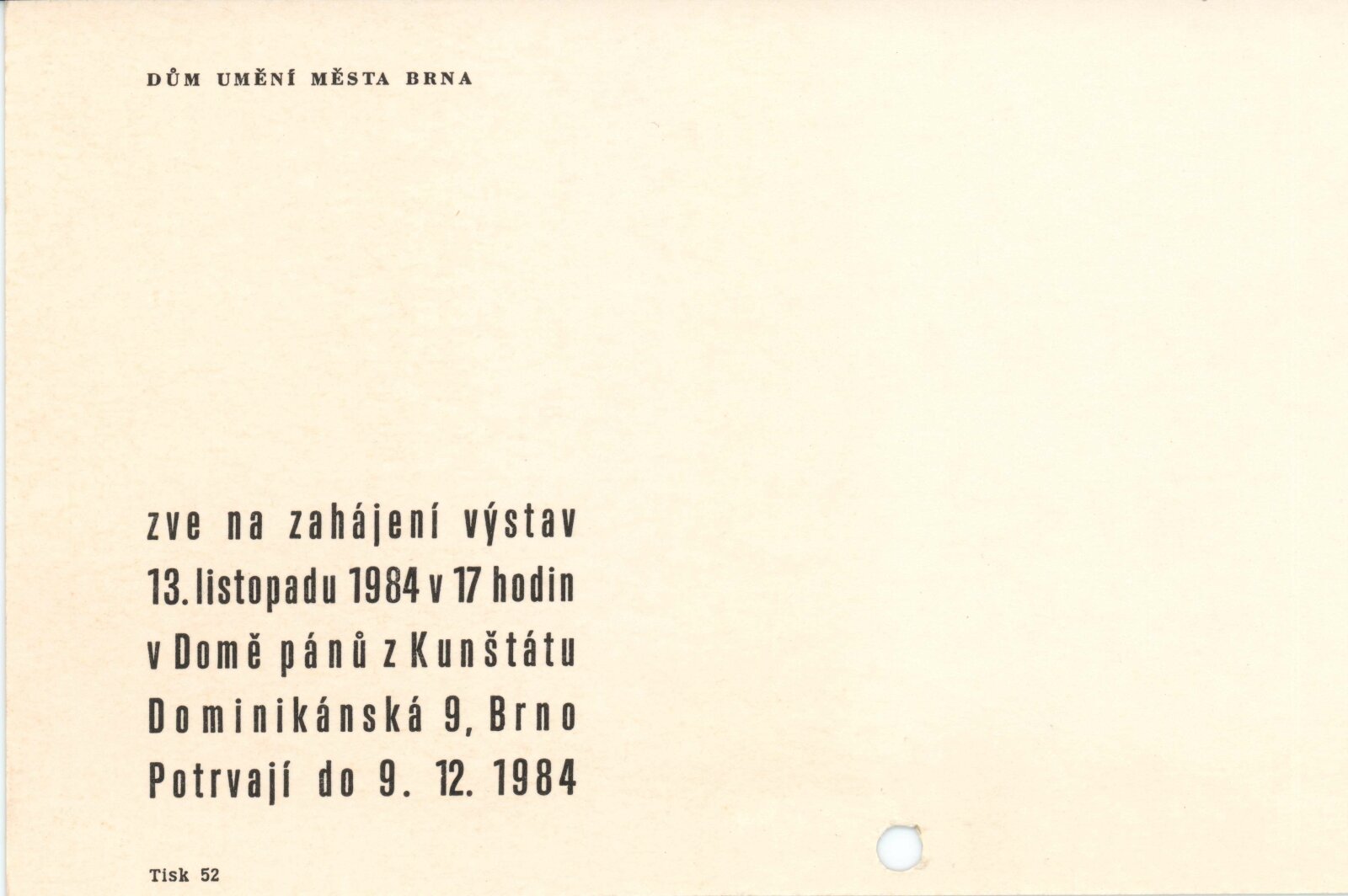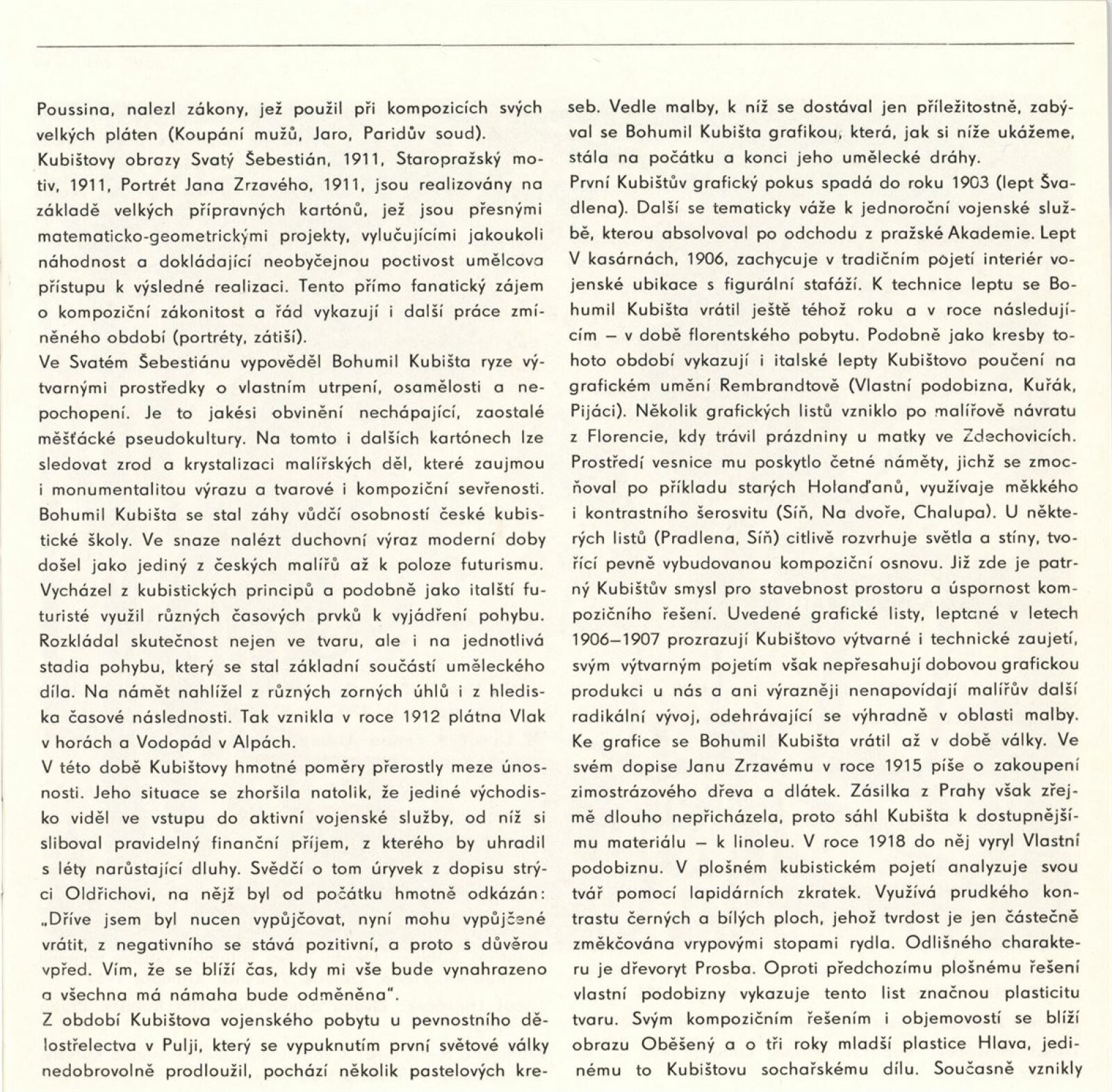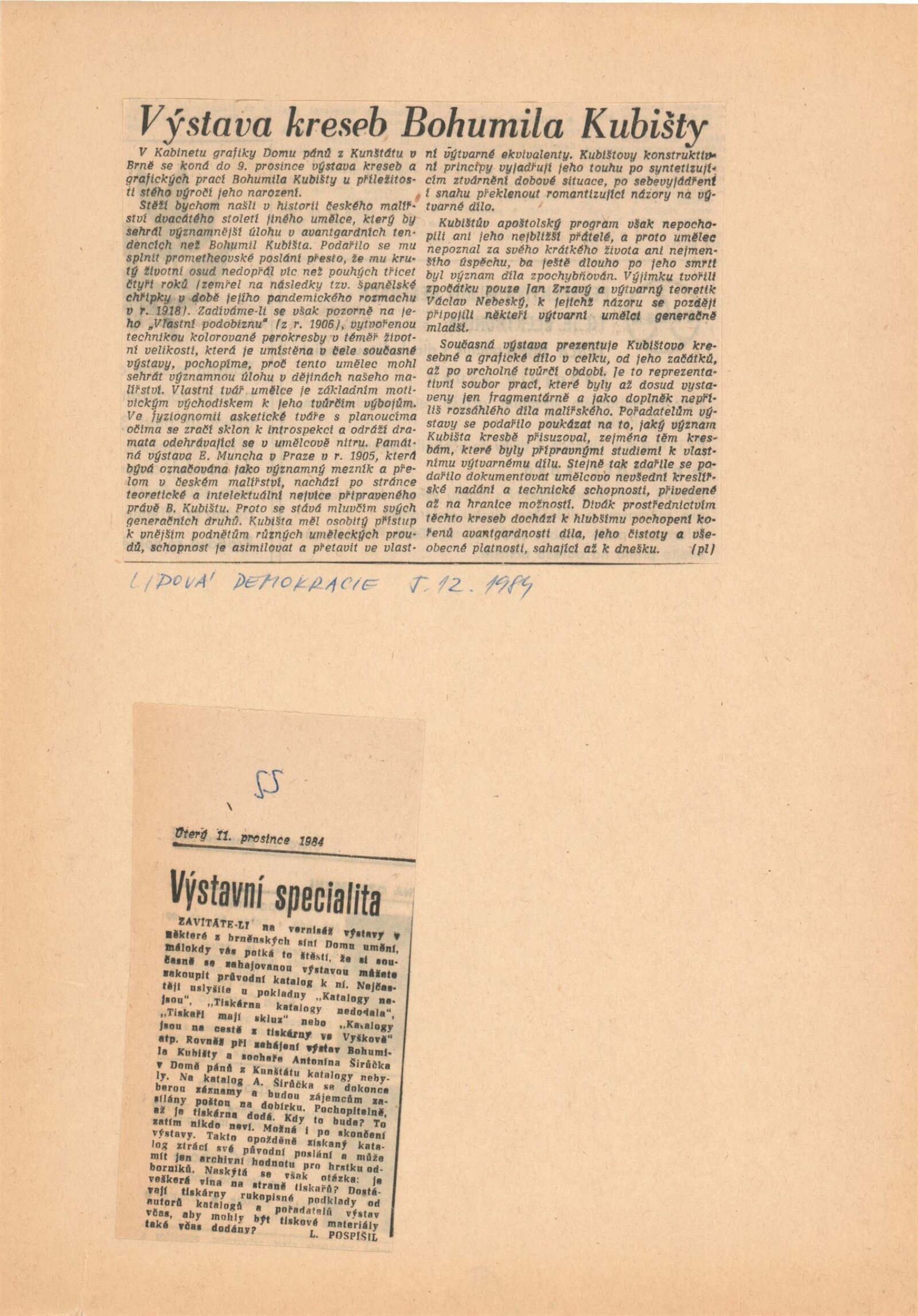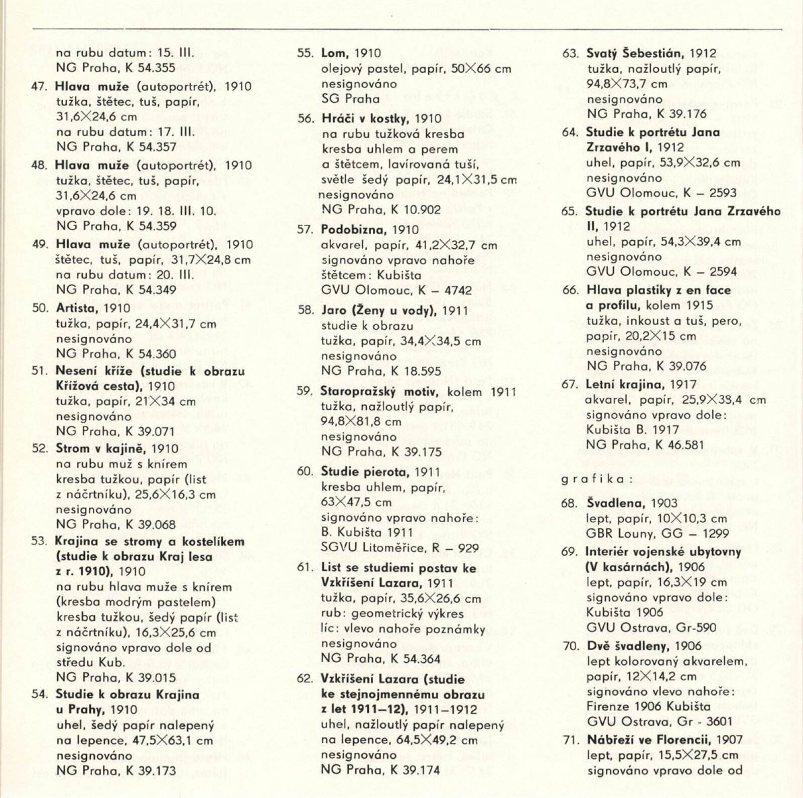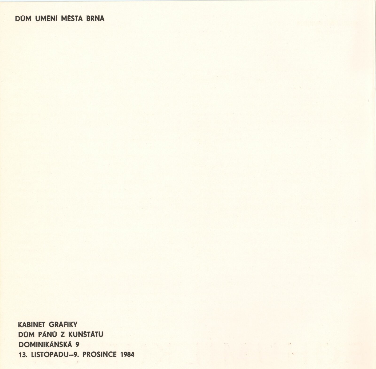 Bohumil Kubišta. Kresby a grafika. Výstava k 100. výročí narození: Dům umění / Dům pánů z Kunštátu, Kabinet grafiky, 13. 11. – 9. 12. 1984 / Text: Jiřina Hockeová. – Brno: DUmB, 1984. – 24 s., obr., životní data, bibliografie, DPK 828. – MZK; MG; MMB