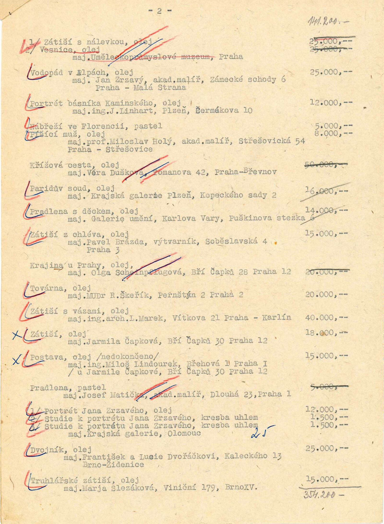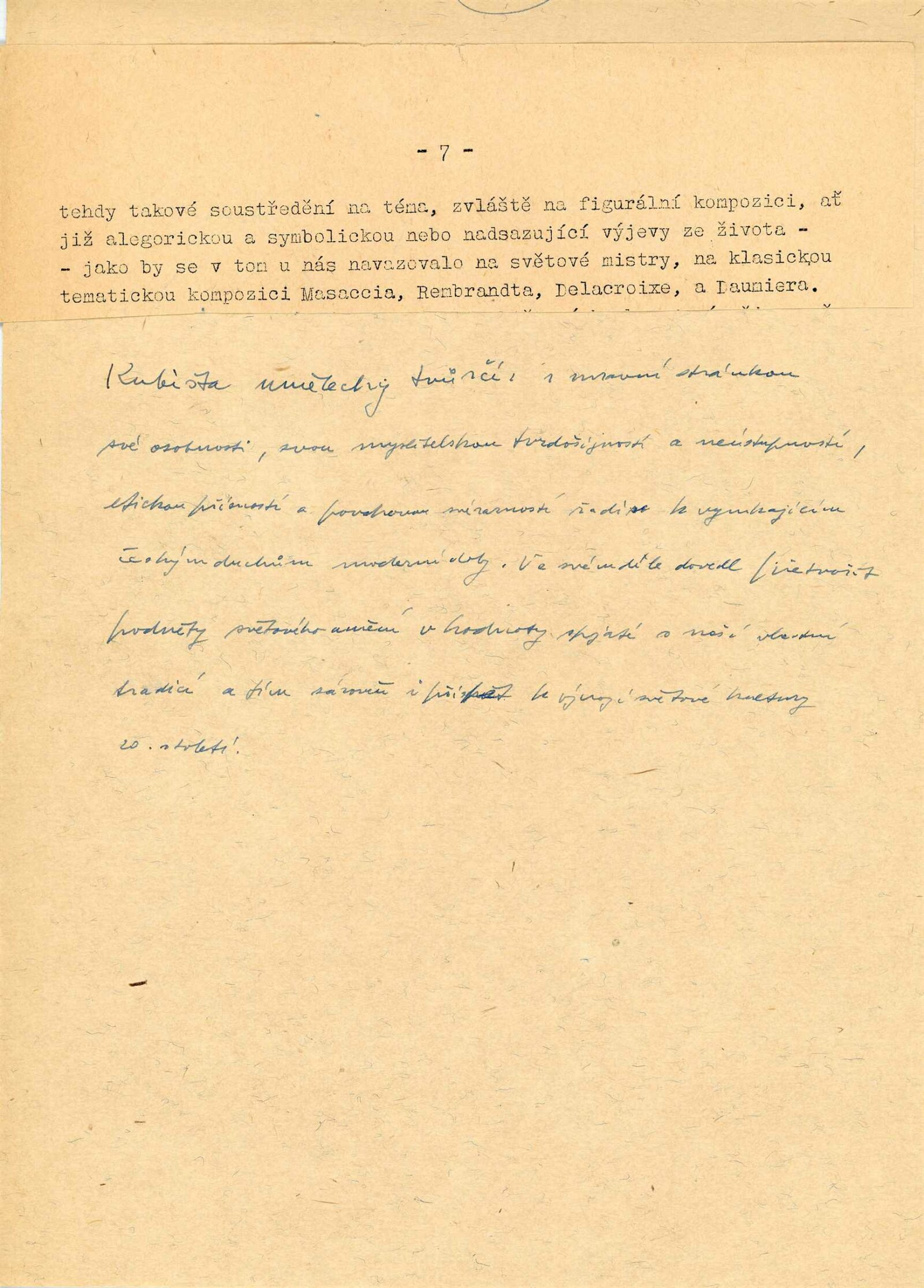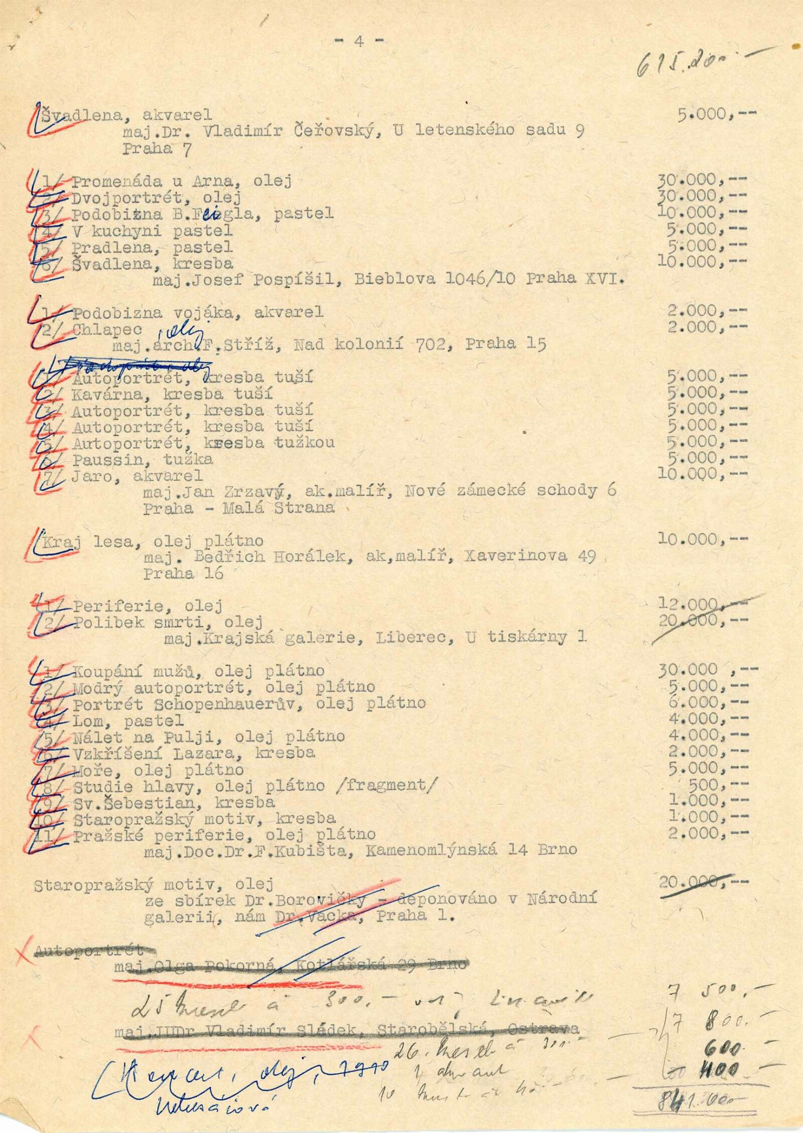 pozvánka, text (předmluva, rukopis projevu při zahájení), informace o výstavě pro OŠK MěNV, korespondence (o zápůjčkách, dopis Jana Zrzavého, Olgy Scheinpflugové, Jarmily Čapkové), reverzy, seznam obrazů z Mánesa s adresami majitelů děl, recenze v tisku