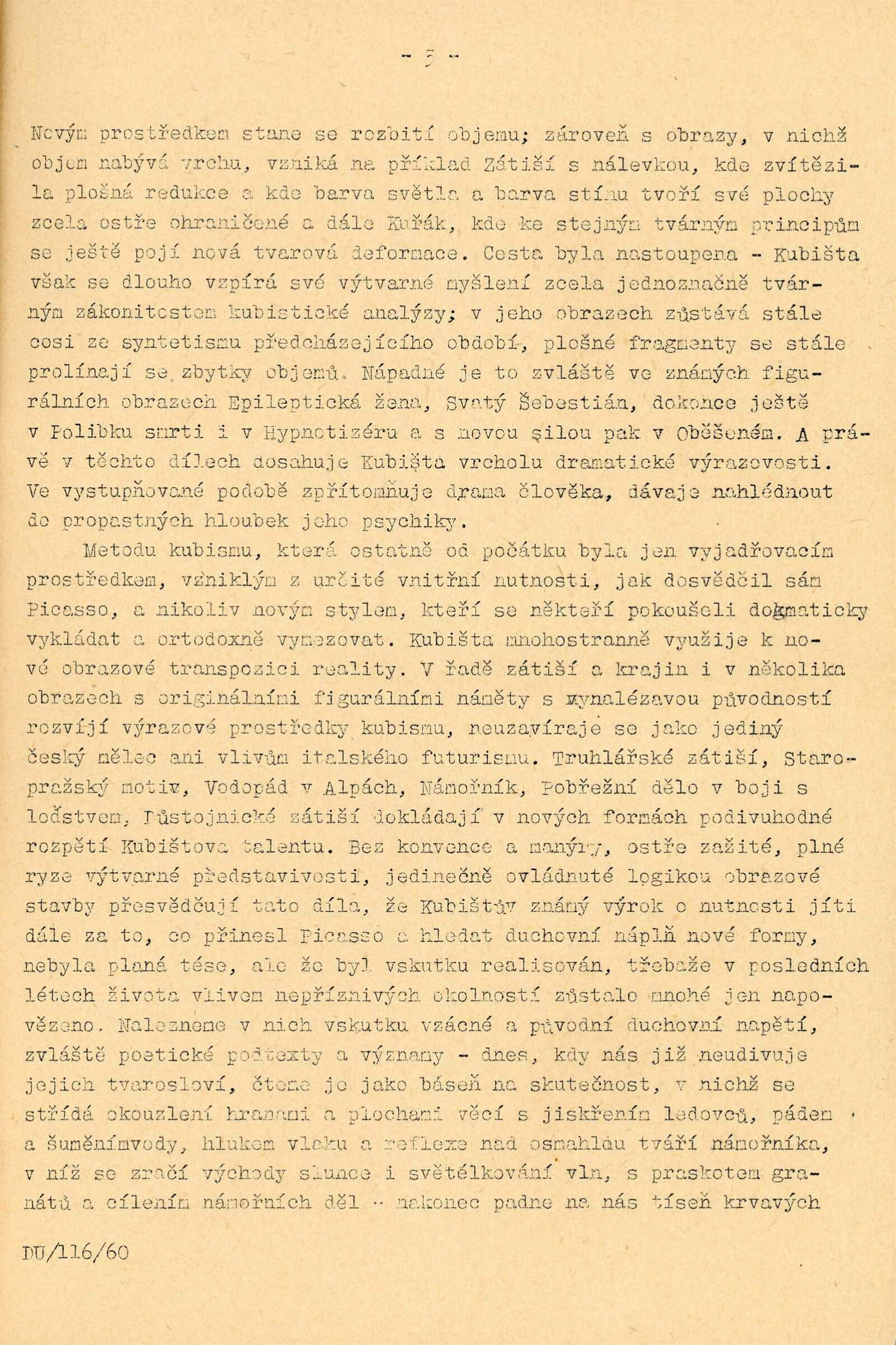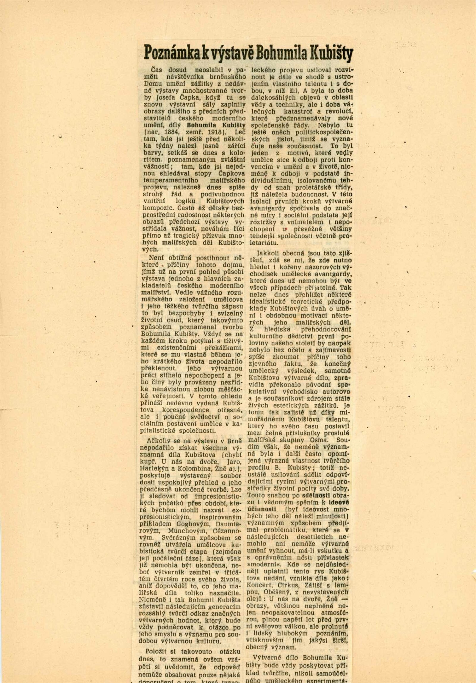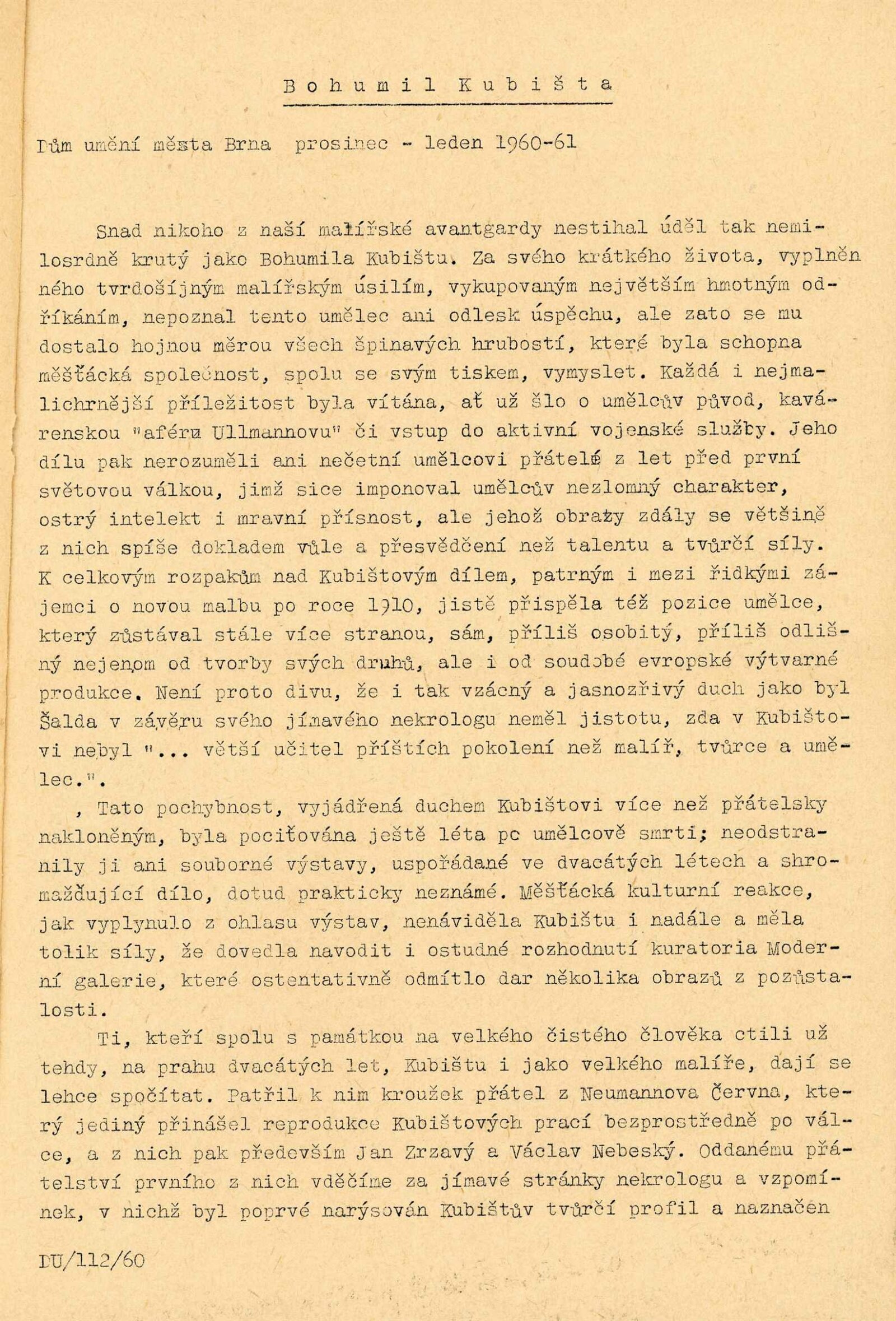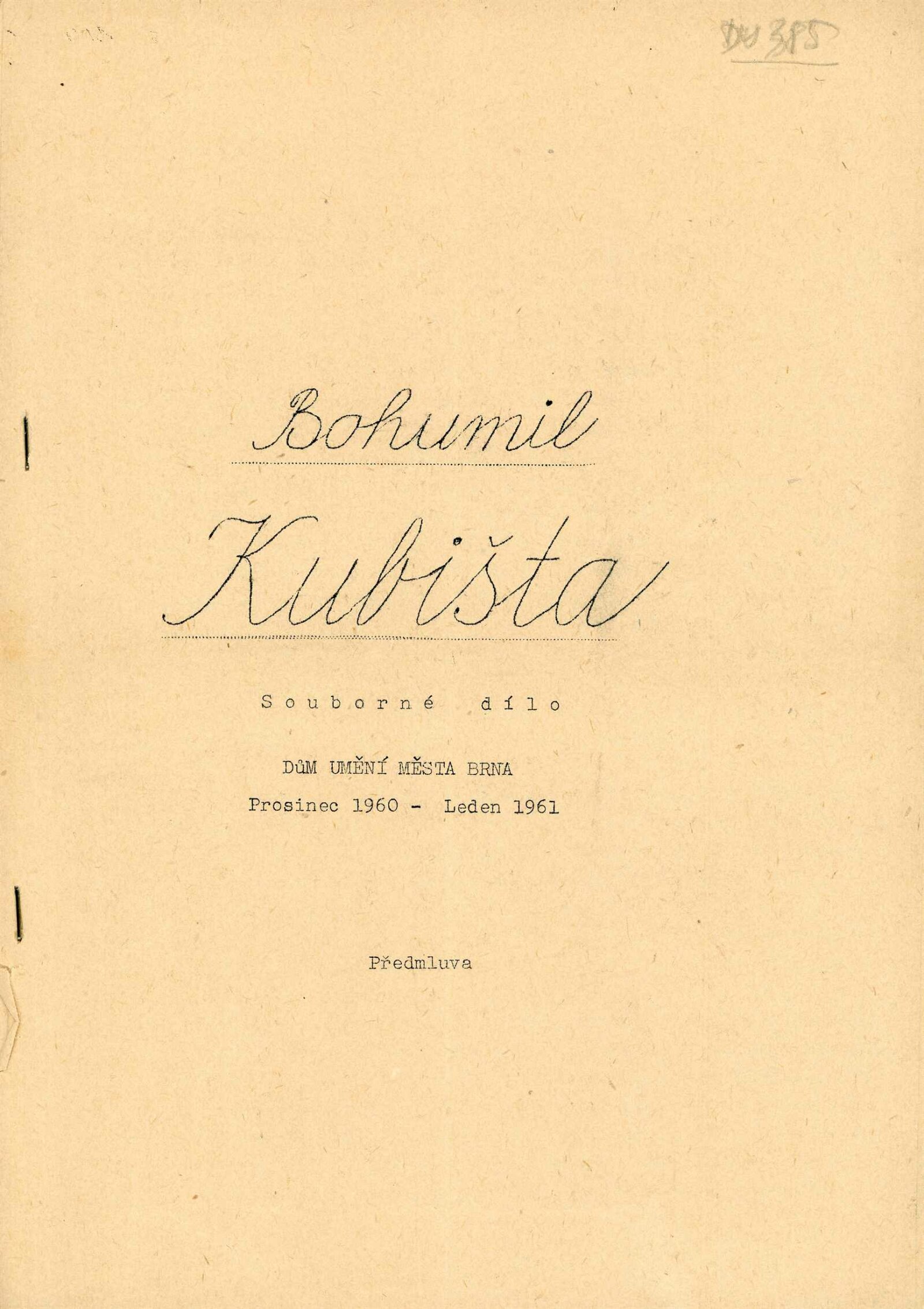 Bohumil Kubišta: Dům umění města Brna, 17. 12. 1960 – 29. 1. 1961 / Převzatý katalog. Bohumil Kubišta: Praha, Mánes září–říjen 1960 / Texty: Miroslav Lamač, Jiří Padrta. – Praha: SČSVU, 1960. – 31 s., obr., DU 385. – MZK; MG; MMB