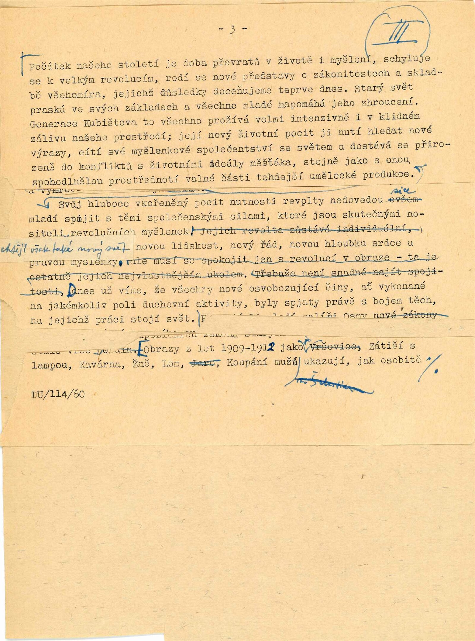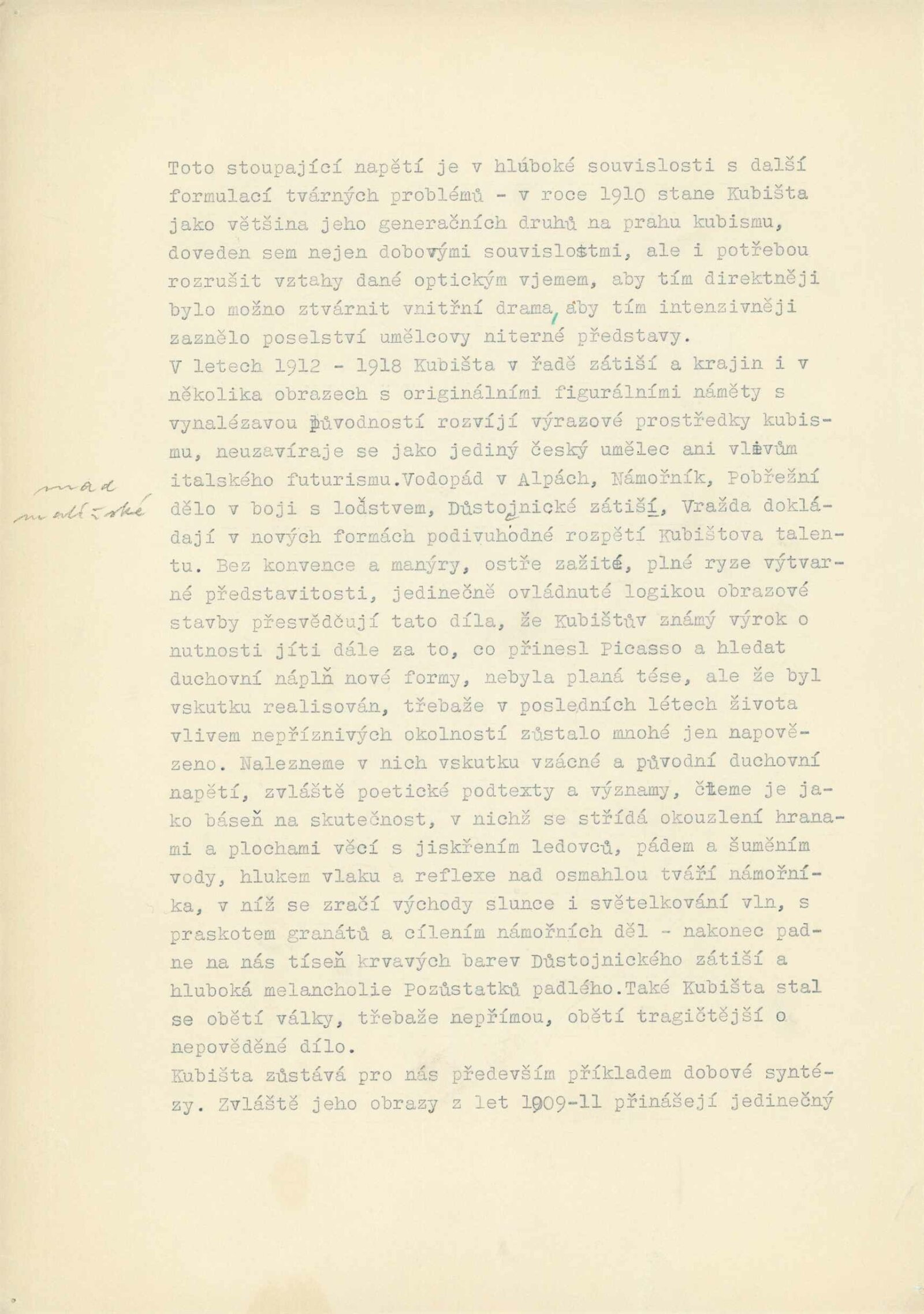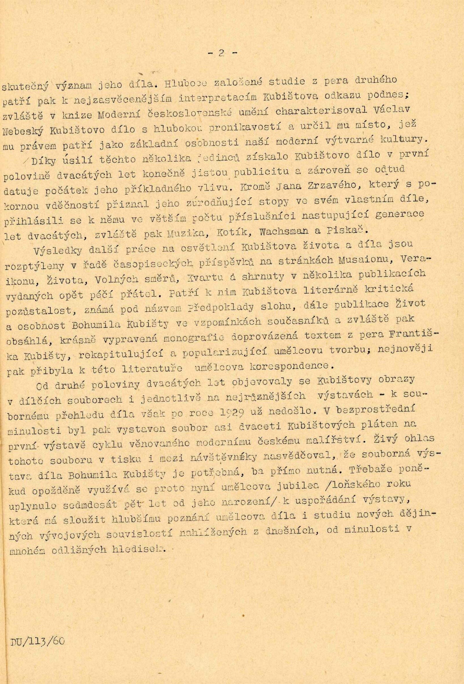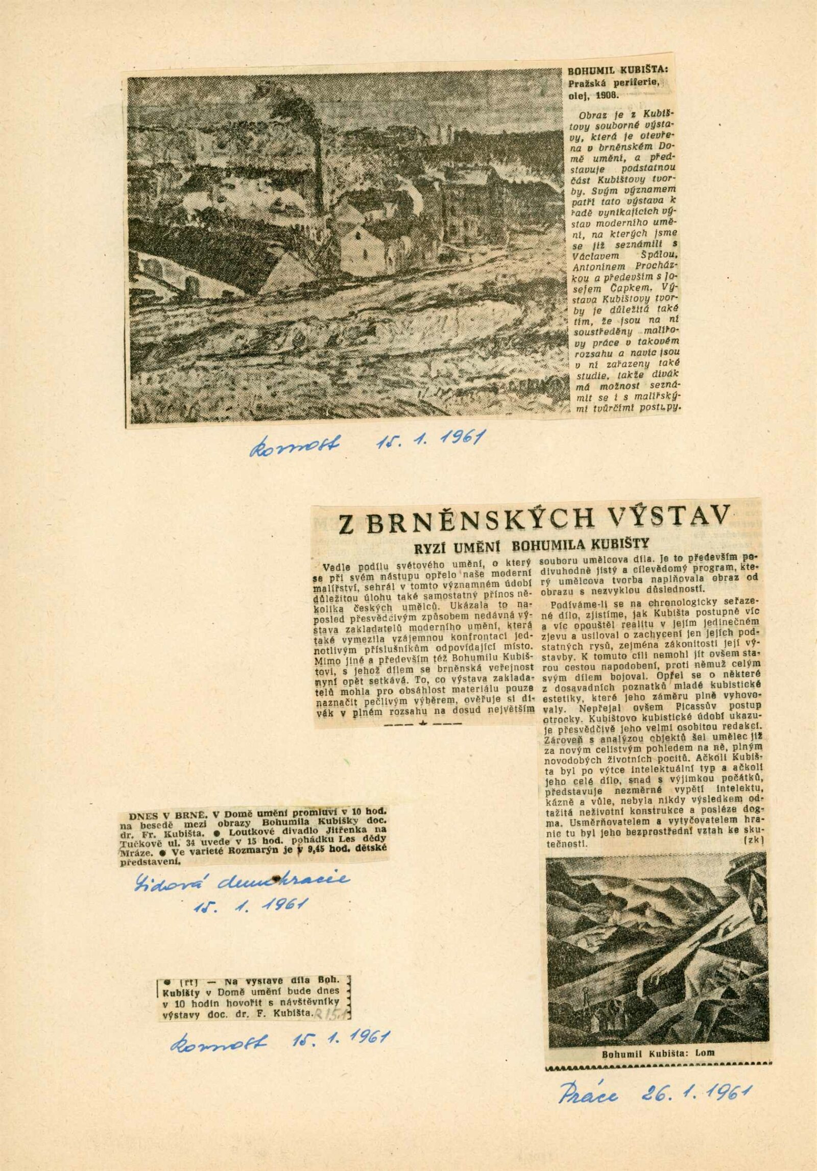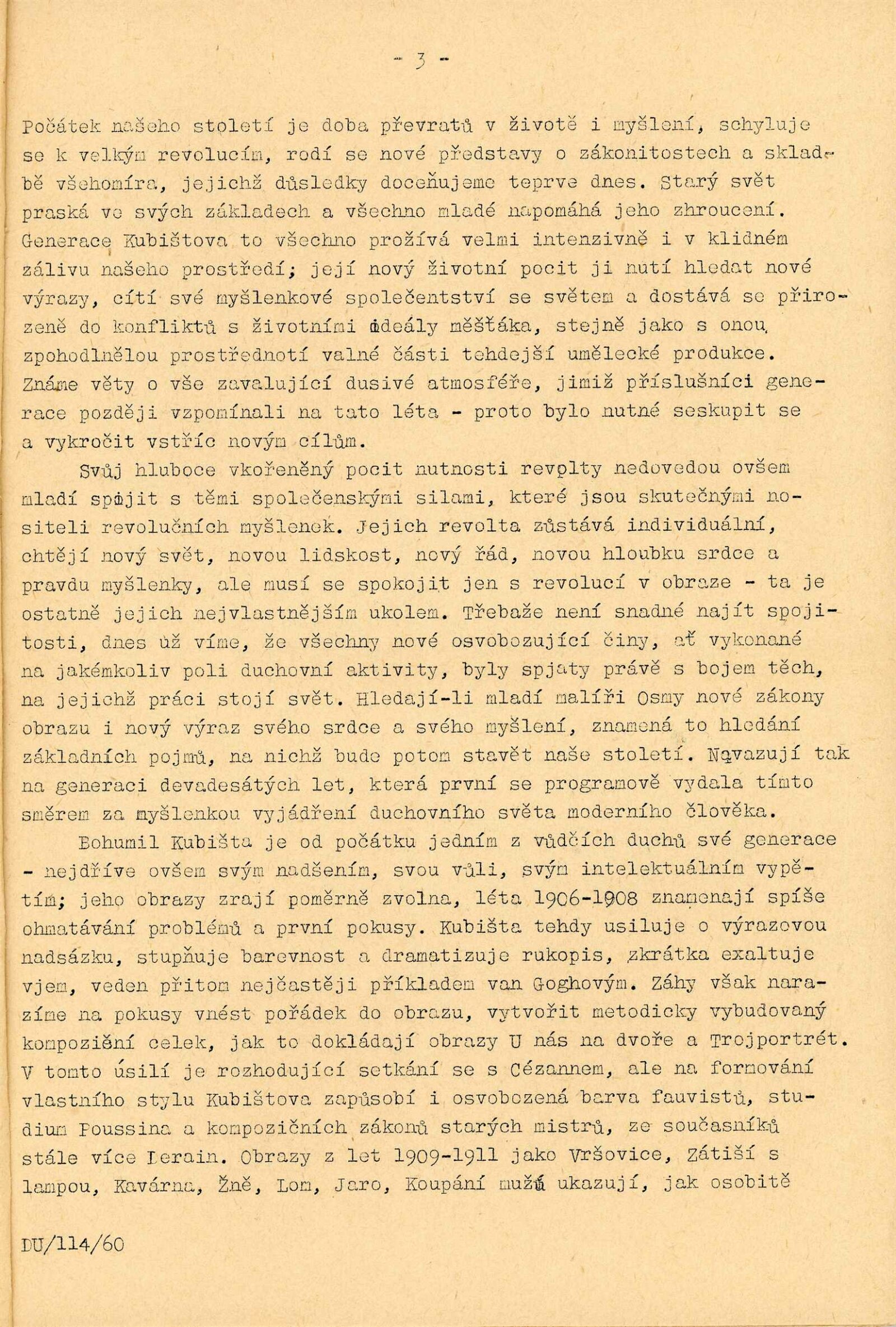 Bohumil Kubišta: Dům umění města Brna, 17. 12. 1960 – 29. 1. 1961 / Převzatý katalog. Bohumil Kubišta: Praha, Mánes září–říjen 1960 / Texty: Miroslav Lamač, Jiří Padrta. – Praha: SČSVU, 1960. – 31 s., obr., DU 385. – MZK; MG; MMB