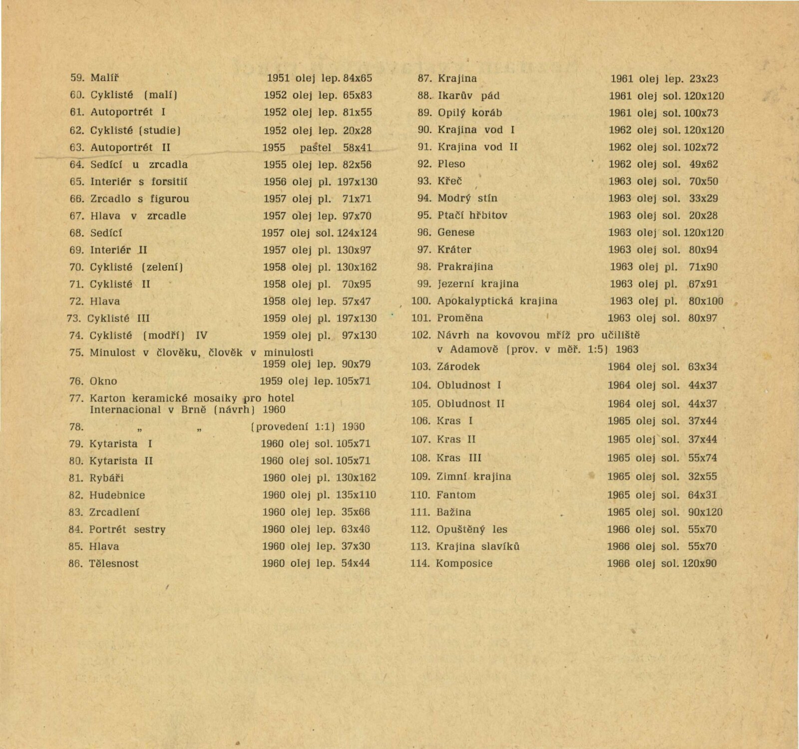 pozvánka, katalog, text pro překlad, báseň (Josef Kainar, Miloš Macourek), text vernisáže (Adolf Kroupa), anotace, seznam vystavených prací, fotografie z vernisáže, korespondence (o přípravě výstavy, instituce, Zdeněk Kudělka, Milan Albich, provozní korespondence), reverzy, smlouva s autorem, recenze v tisku, pozvánky a katalogy z výstav (Jihlava, Hodonín), digitalizovaný videozáznam ČT - záběry z výstav 1963-1969
