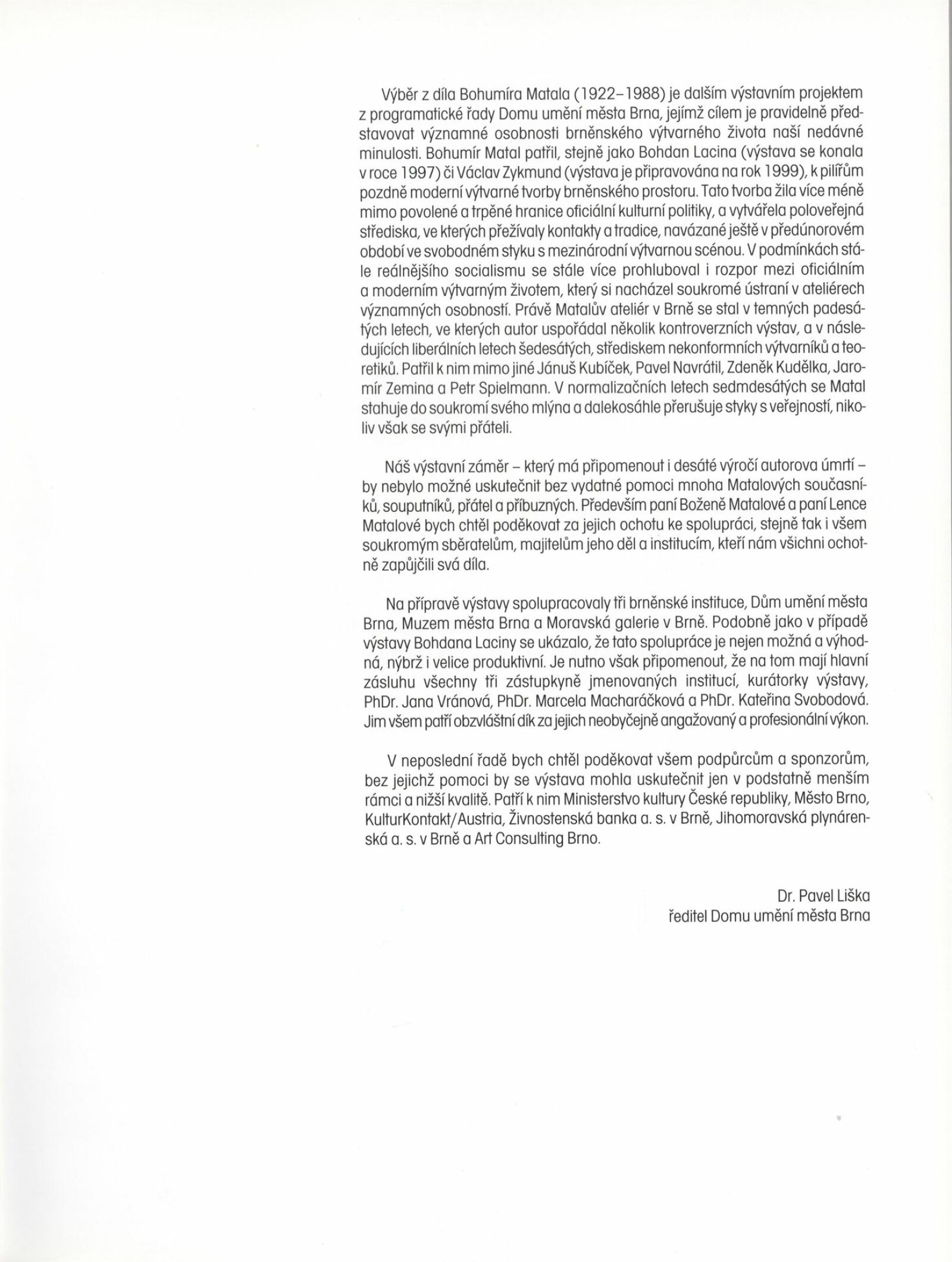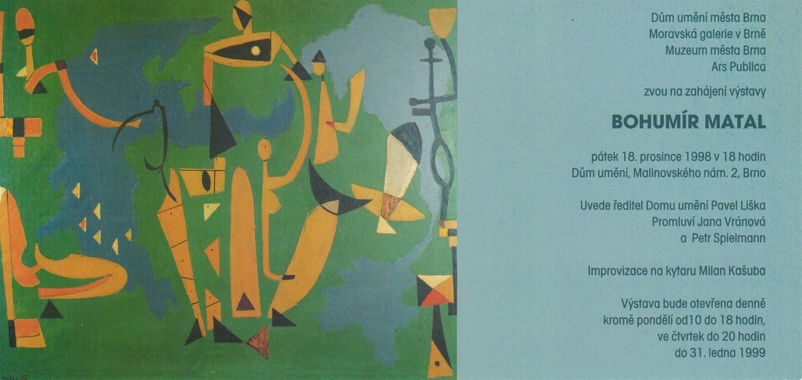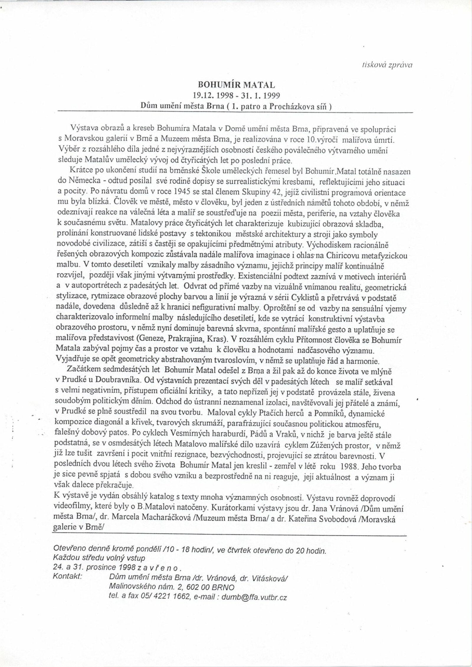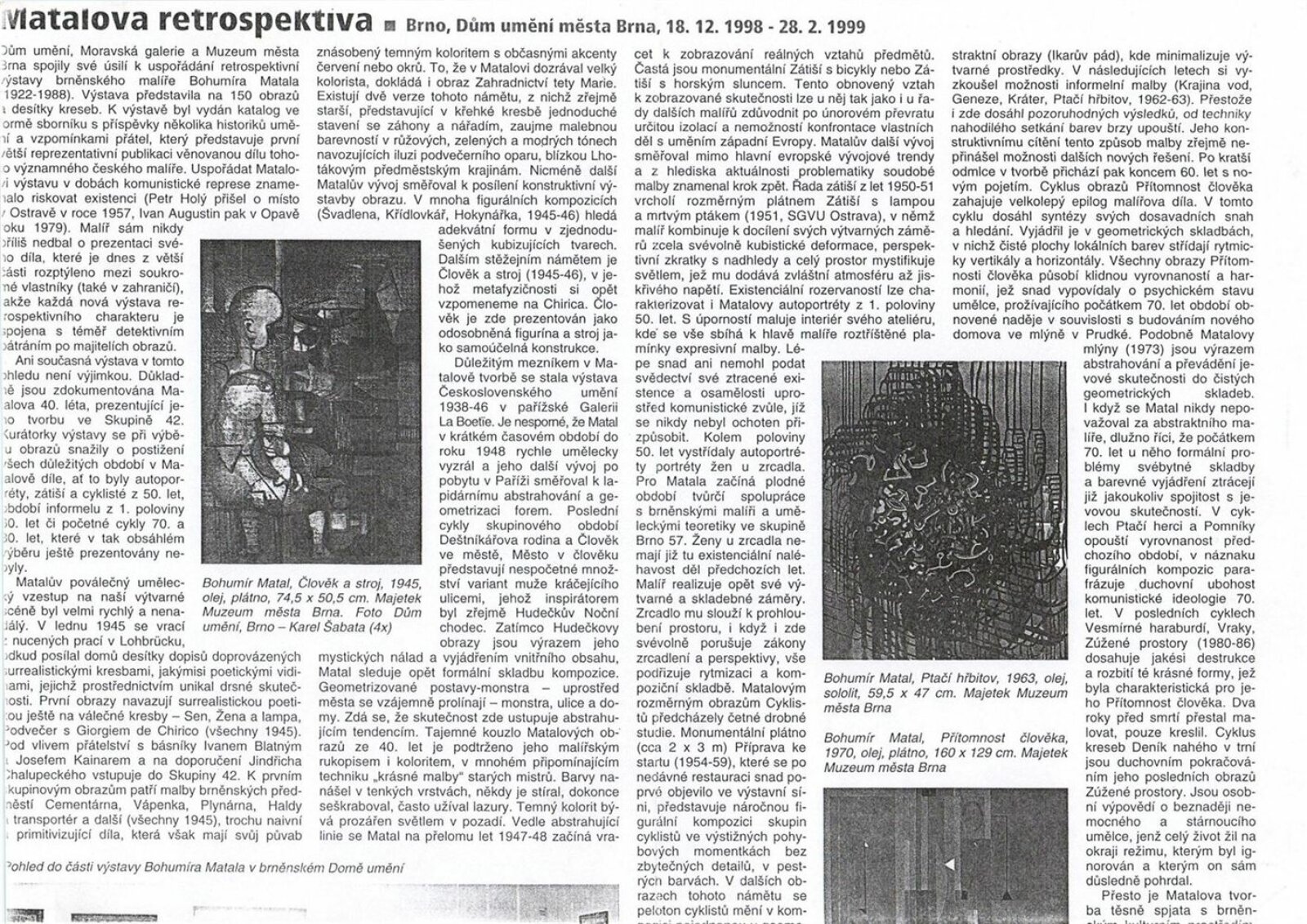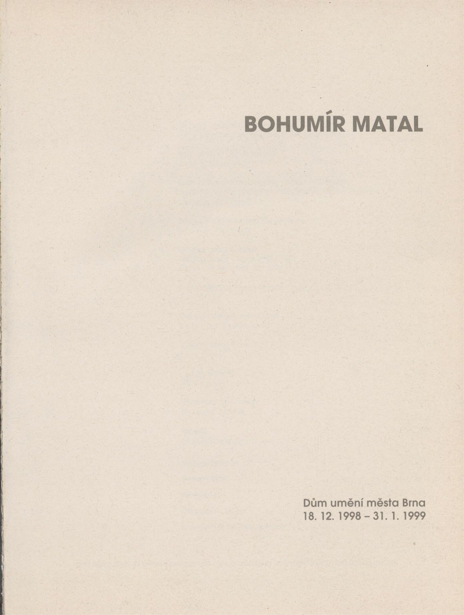 Bohumír Matal: Dům umění města Brna, 18. 12. 1998 – 31. 1. 1999 / Texty: Petr Holý, Jan Kačer, Ludvík Kundera, Pavel Liška, Marcela Macharáčková, Antonín Přidal, Petr Spielmann, Kateřina Svobodová, Lada H. Vacková, Igor Zhoř. – Brno: DUmB, 1998. – 173 s., obr., seznam vystavených prací [12] s., fotografická dokumentace, životopis, výstavy, realizace v architektuře, scénografie, knižní grafika a ilustrace, bibliografie, seznam obrazů ve veřejných sbírkách, DU 1088. – MZK