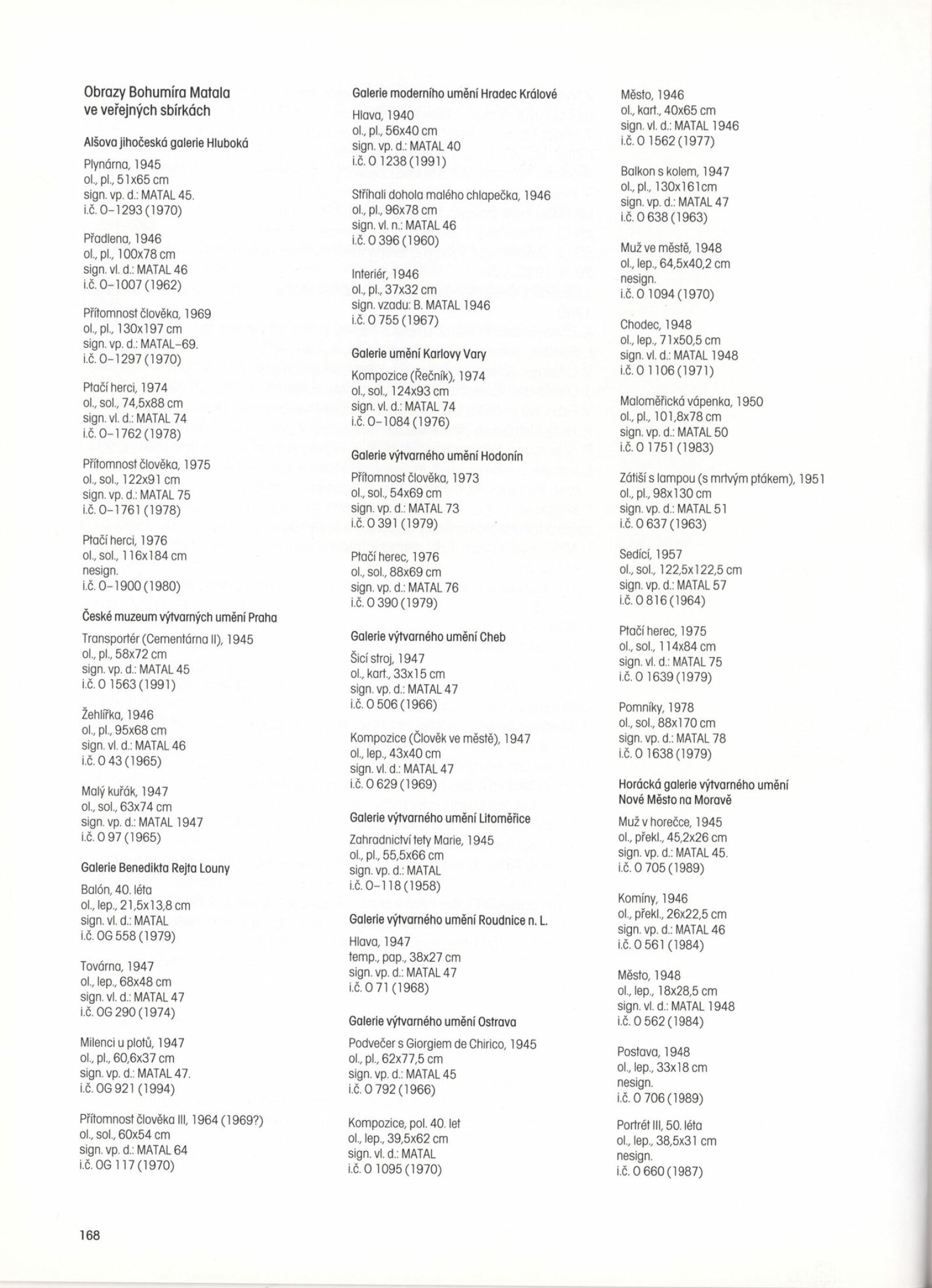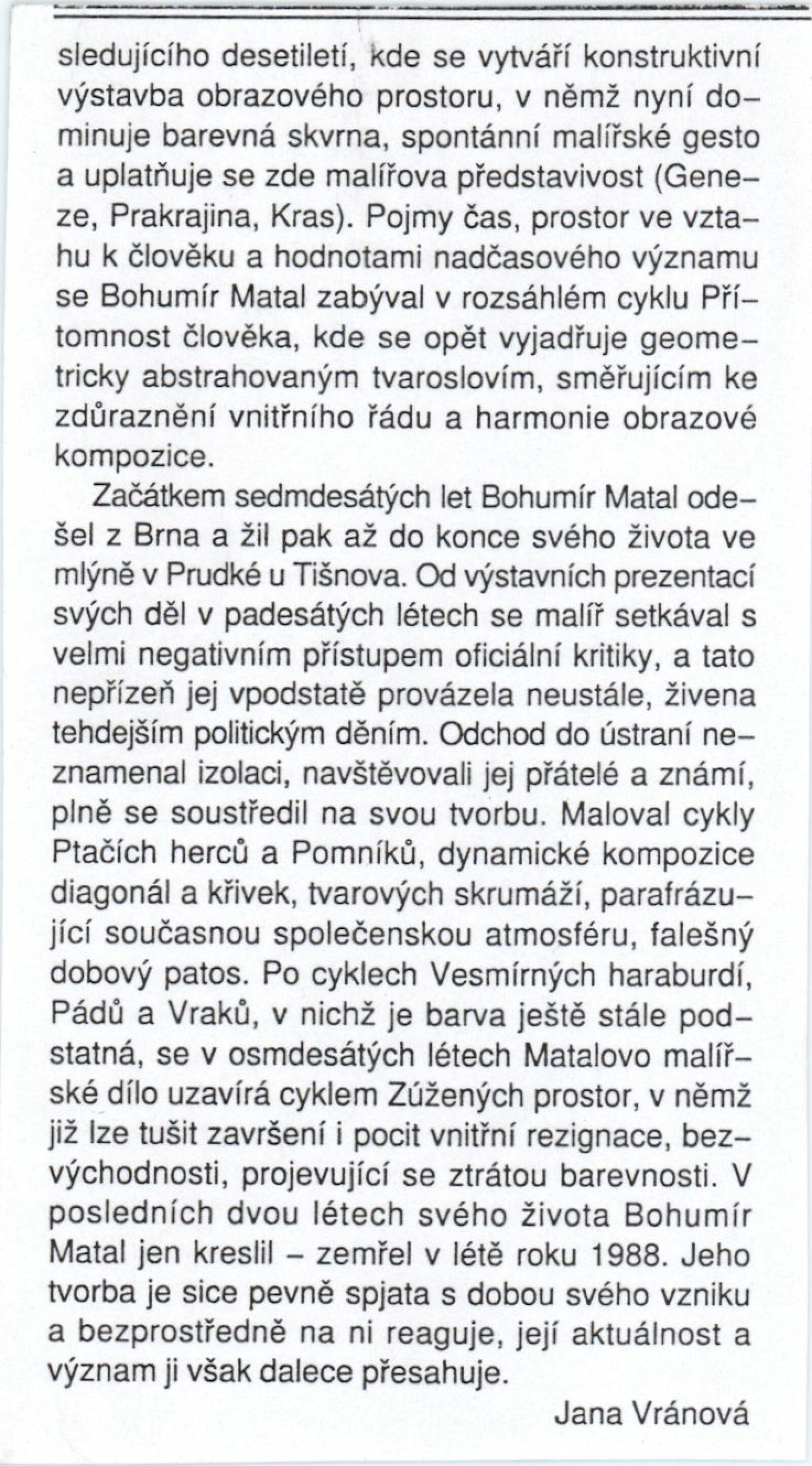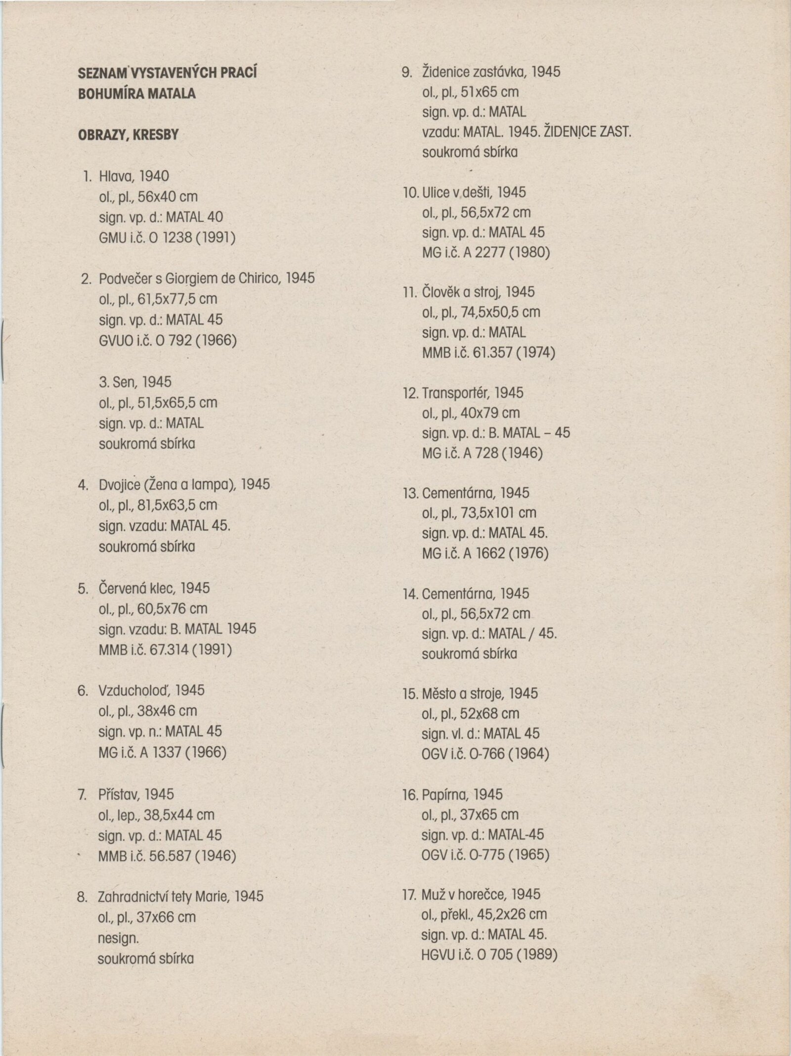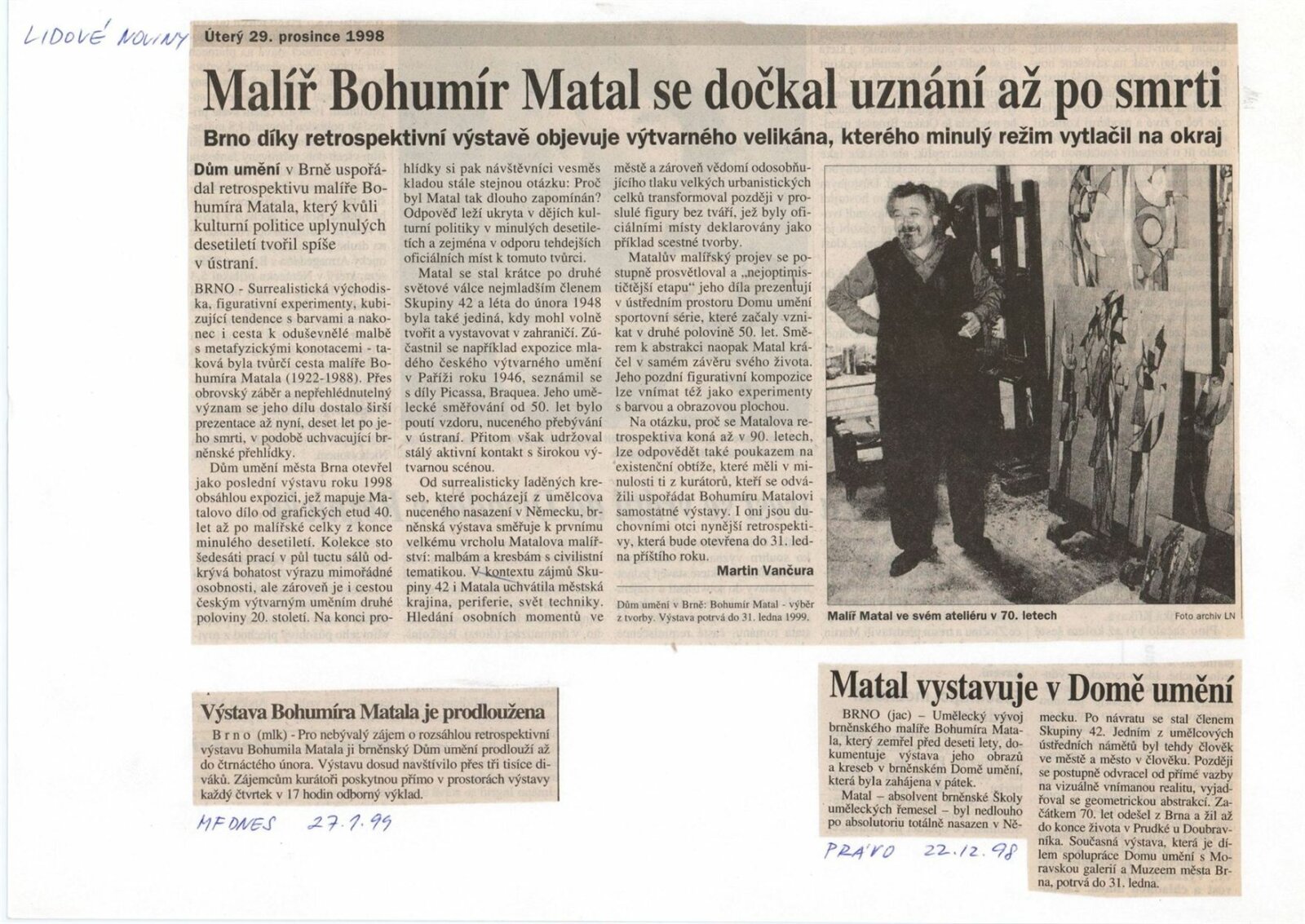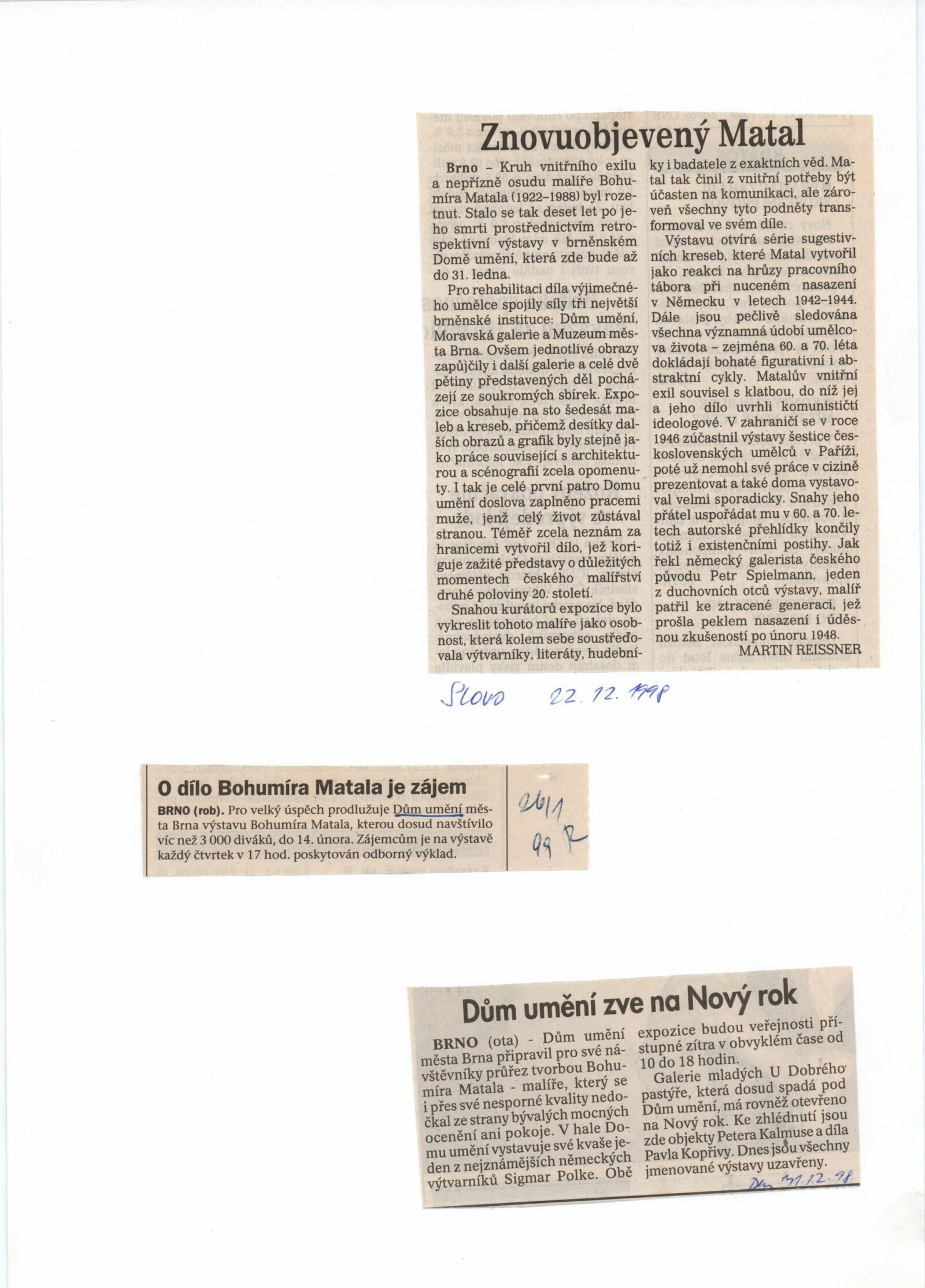 Bohumír Matal: Dům umění města Brna, 18. 12. 1998 – 31. 1. 1999 / Texty: Petr Holý, Jan Kačer, Ludvík Kundera, Pavel Liška, Marcela Macharáčková, Antonín Přidal, Petr Spielmann, Kateřina Svobodová, Lada H. Vacková, Igor Zhoř. – Brno: DUmB, 1998. – 173 s., obr., seznam vystavených prací [12] s., fotografická dokumentace, životopis, výstavy, realizace v architektuře, scénografie, knižní grafika a ilustrace, bibliografie, seznam obrazů ve veřejných sbírkách, DU 1088. – MZK