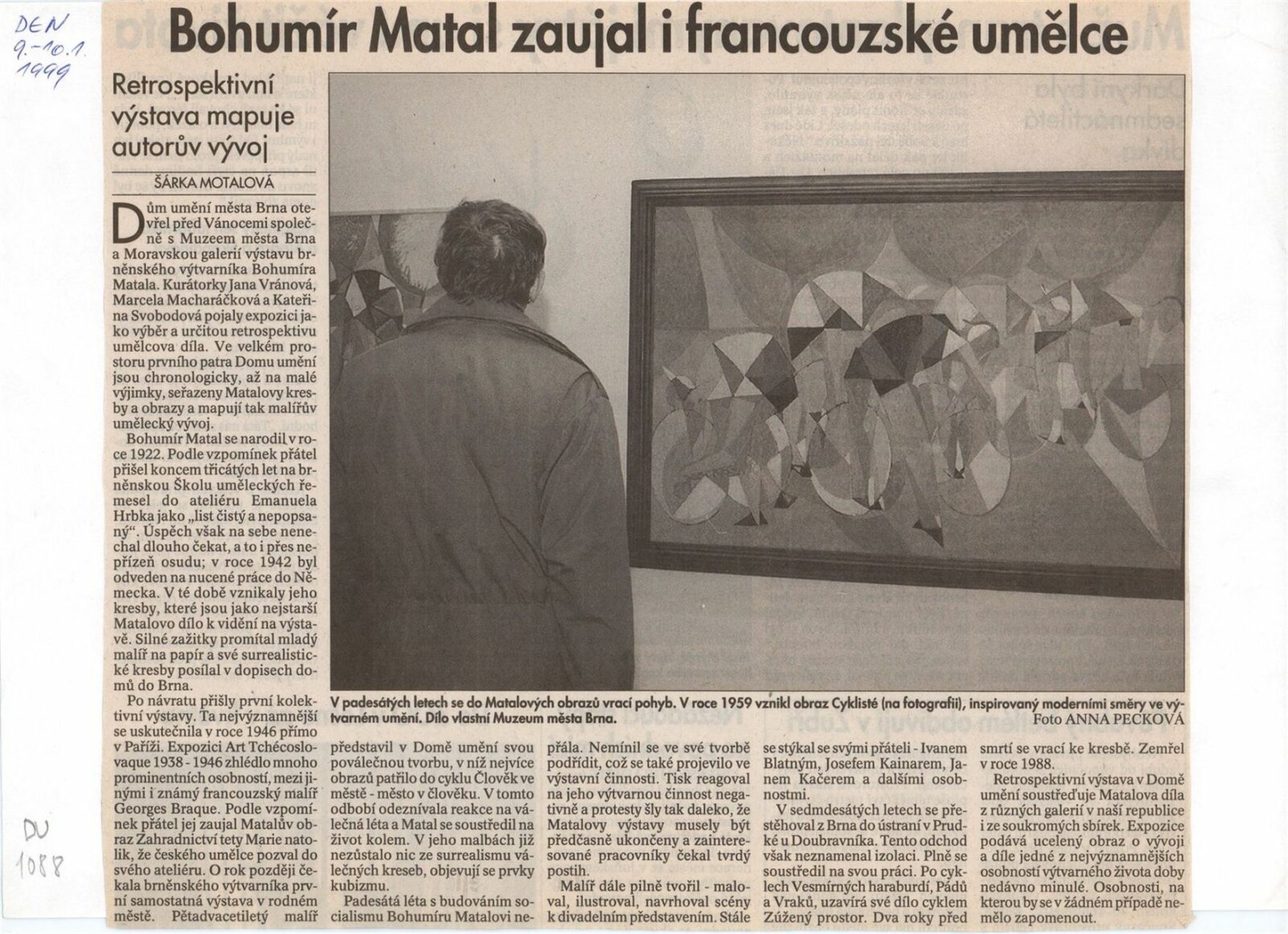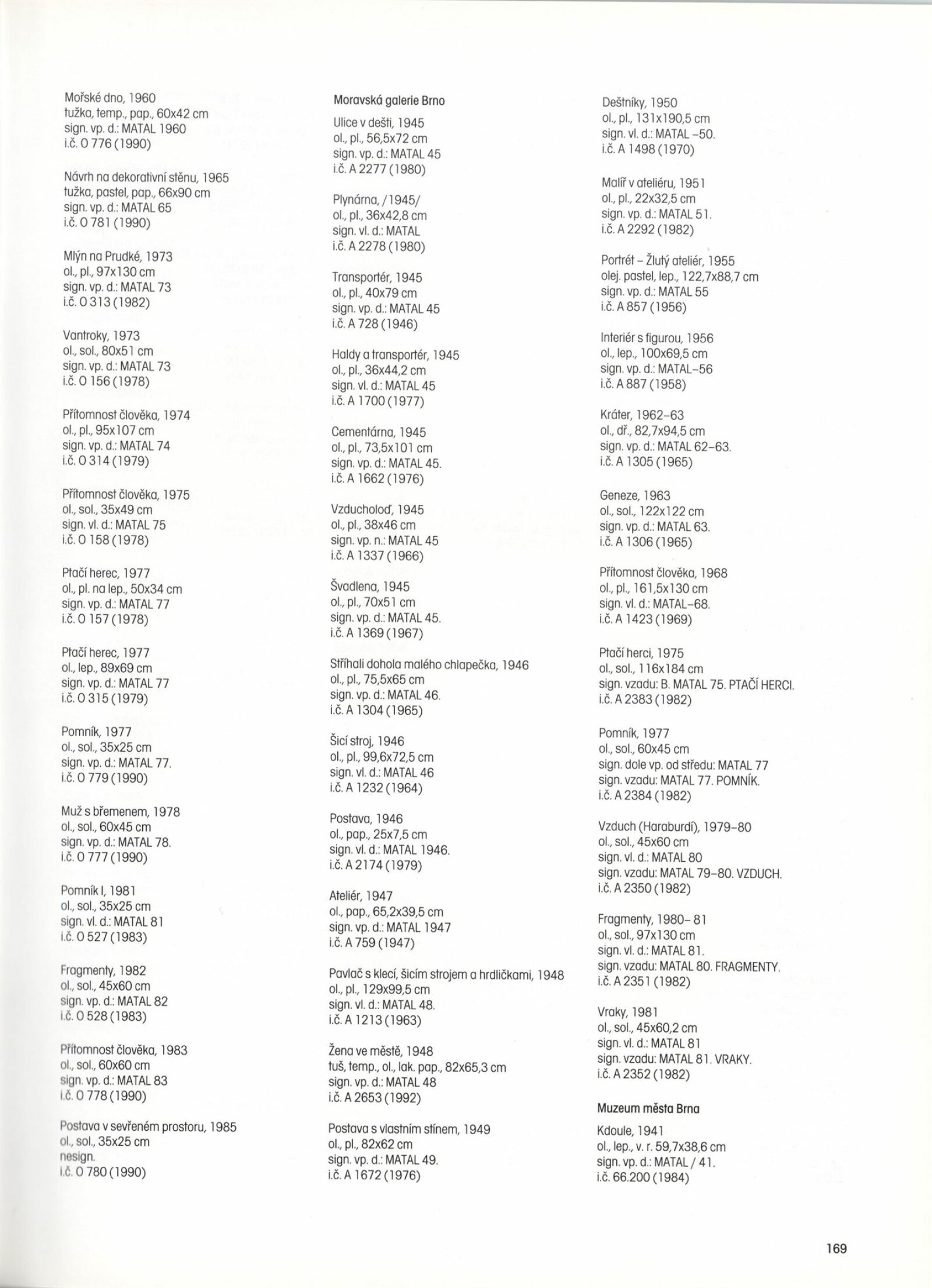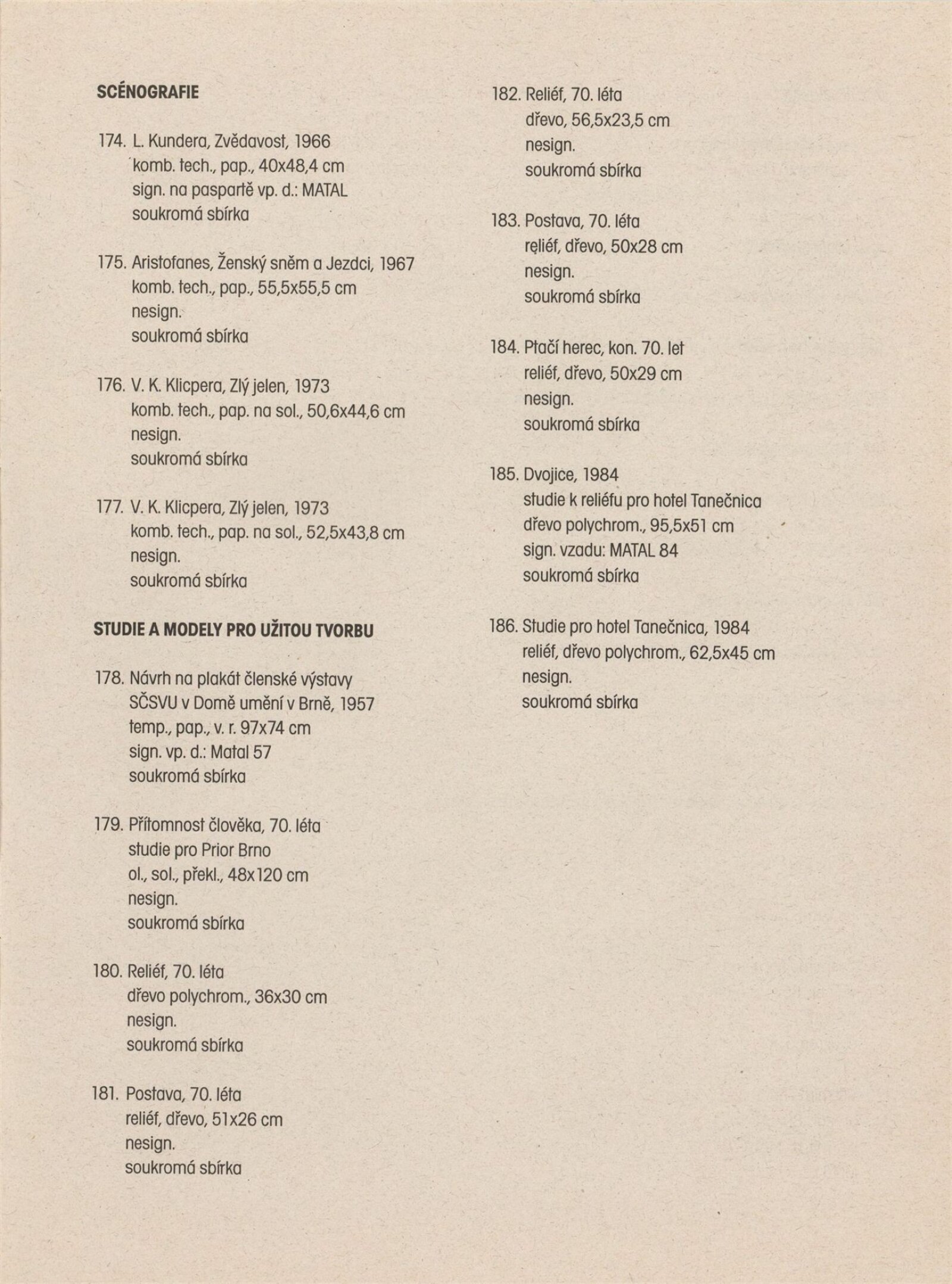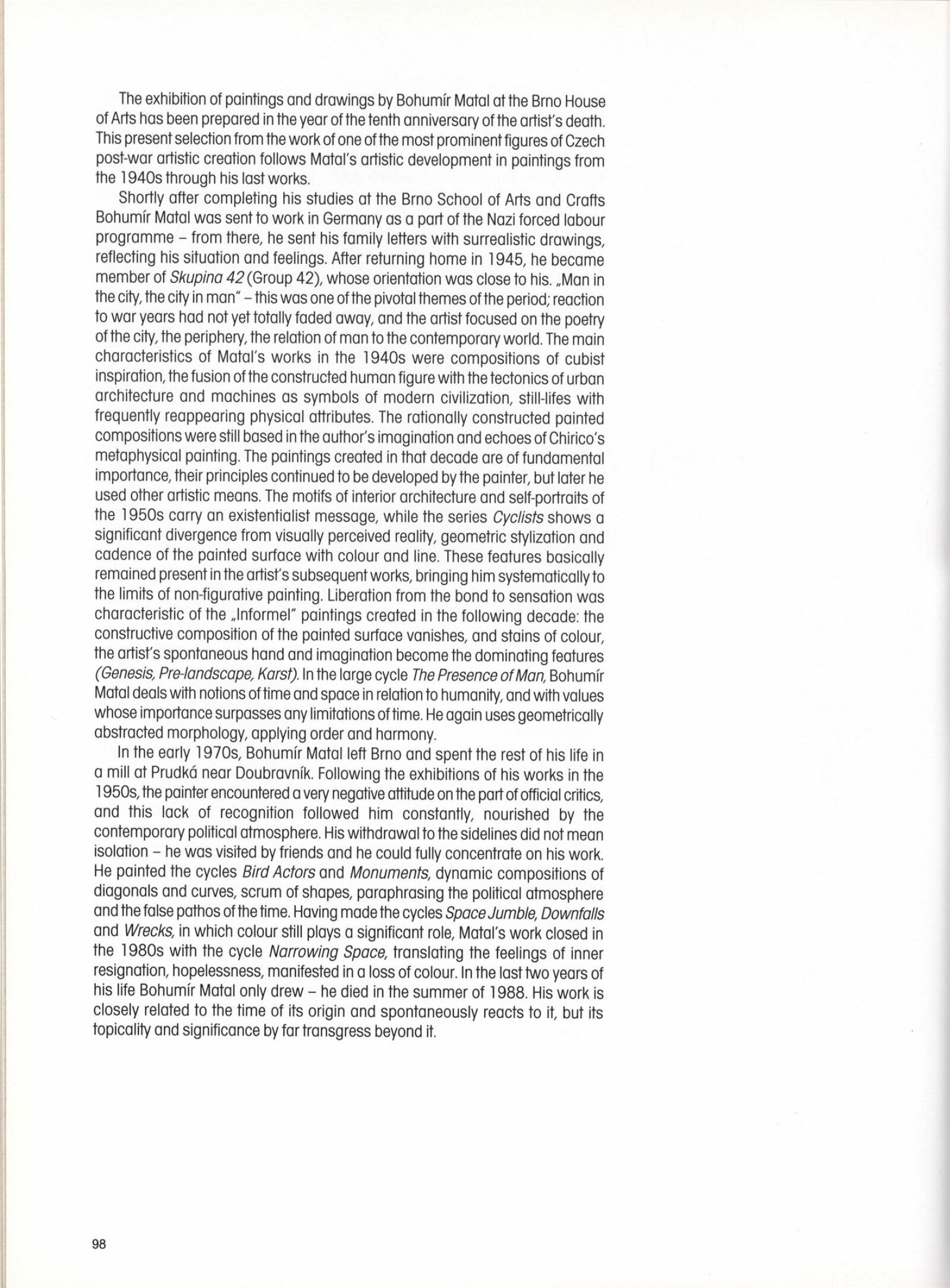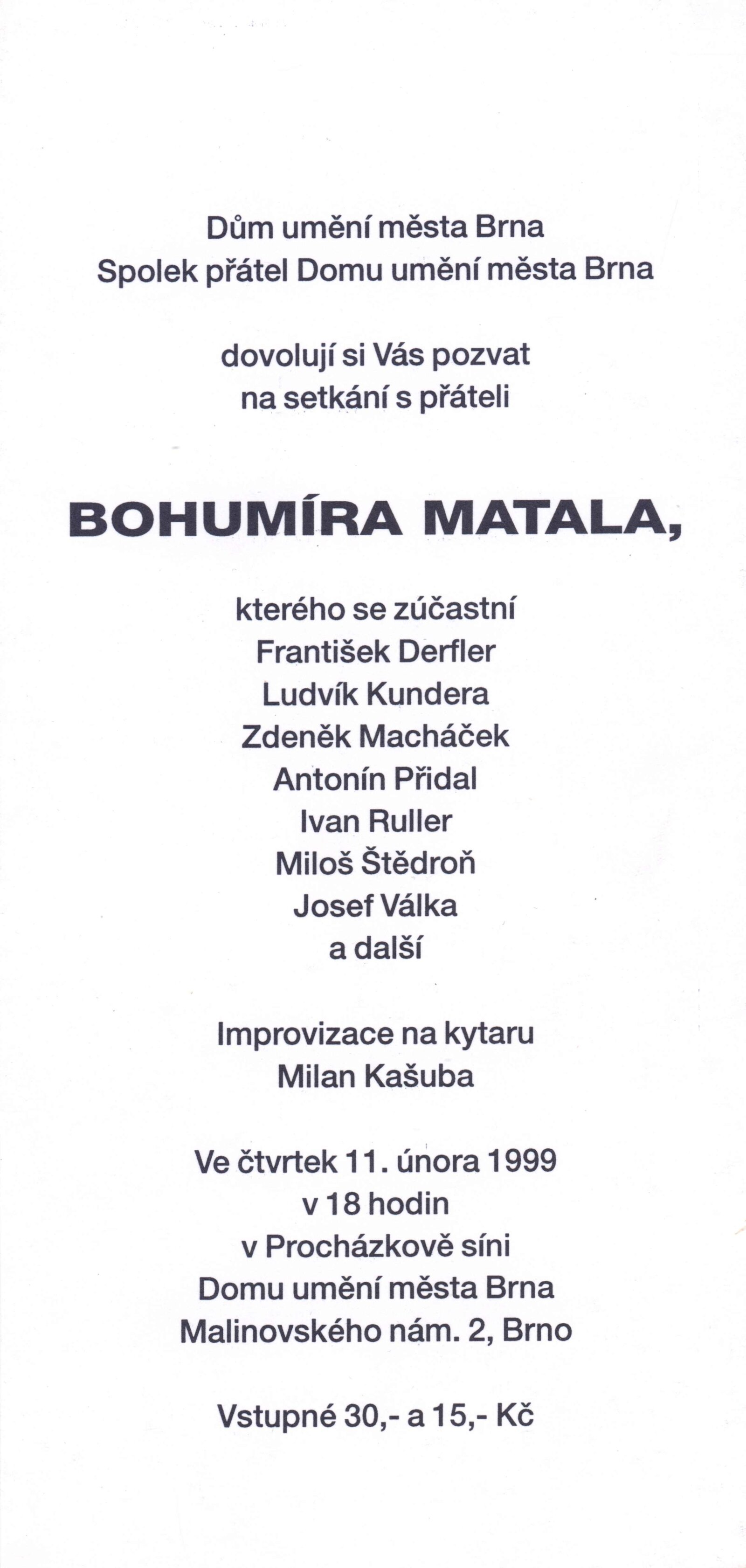 Bohumír Matal: Dům umění města Brna, 18. 12. 1998 – 31. 1. 1999 / Texty: Petr Holý, Jan Kačer, Ludvík Kundera, Pavel Liška, Marcela Macharáčková, Antonín Přidal, Petr Spielmann, Kateřina Svobodová, Lada H. Vacková, Igor Zhoř. – Brno: DUmB, 1998. – 173 s., obr., seznam vystavených prací [12] s., fotografická dokumentace, životopis, výstavy, realizace v architektuře, scénografie, knižní grafika a ilustrace, bibliografie, seznam obrazů ve veřejných sbírkách, DU 1088. – MZK