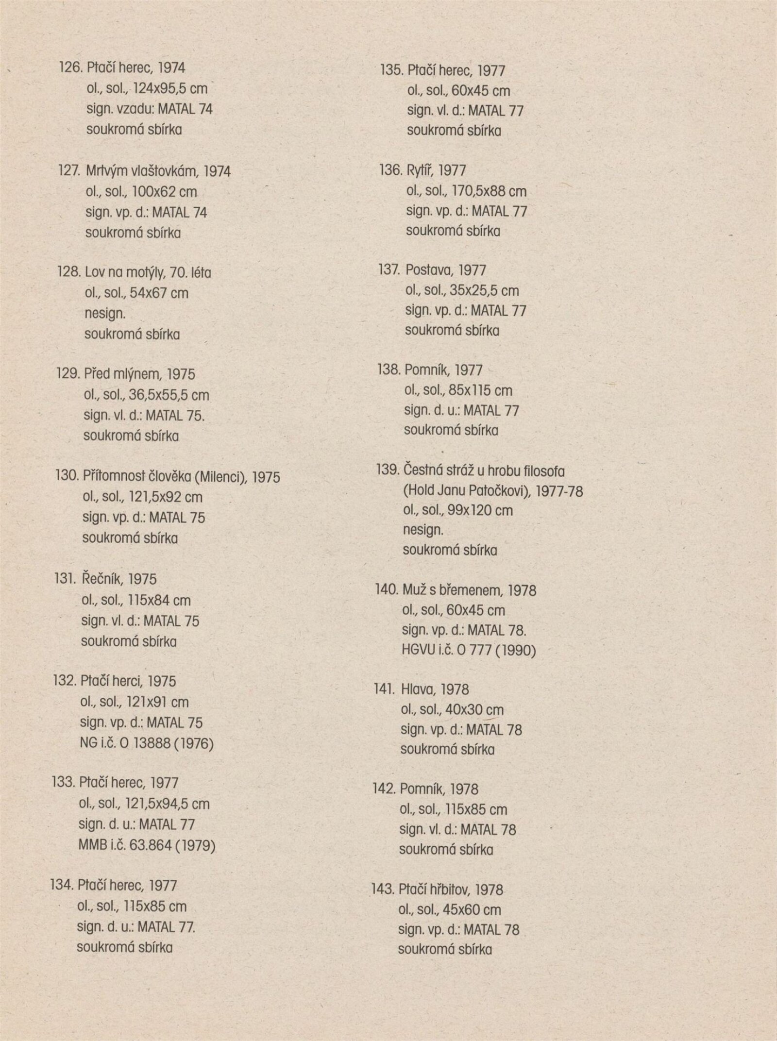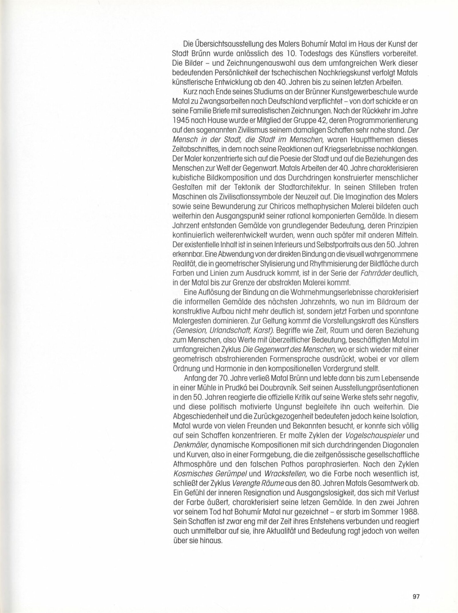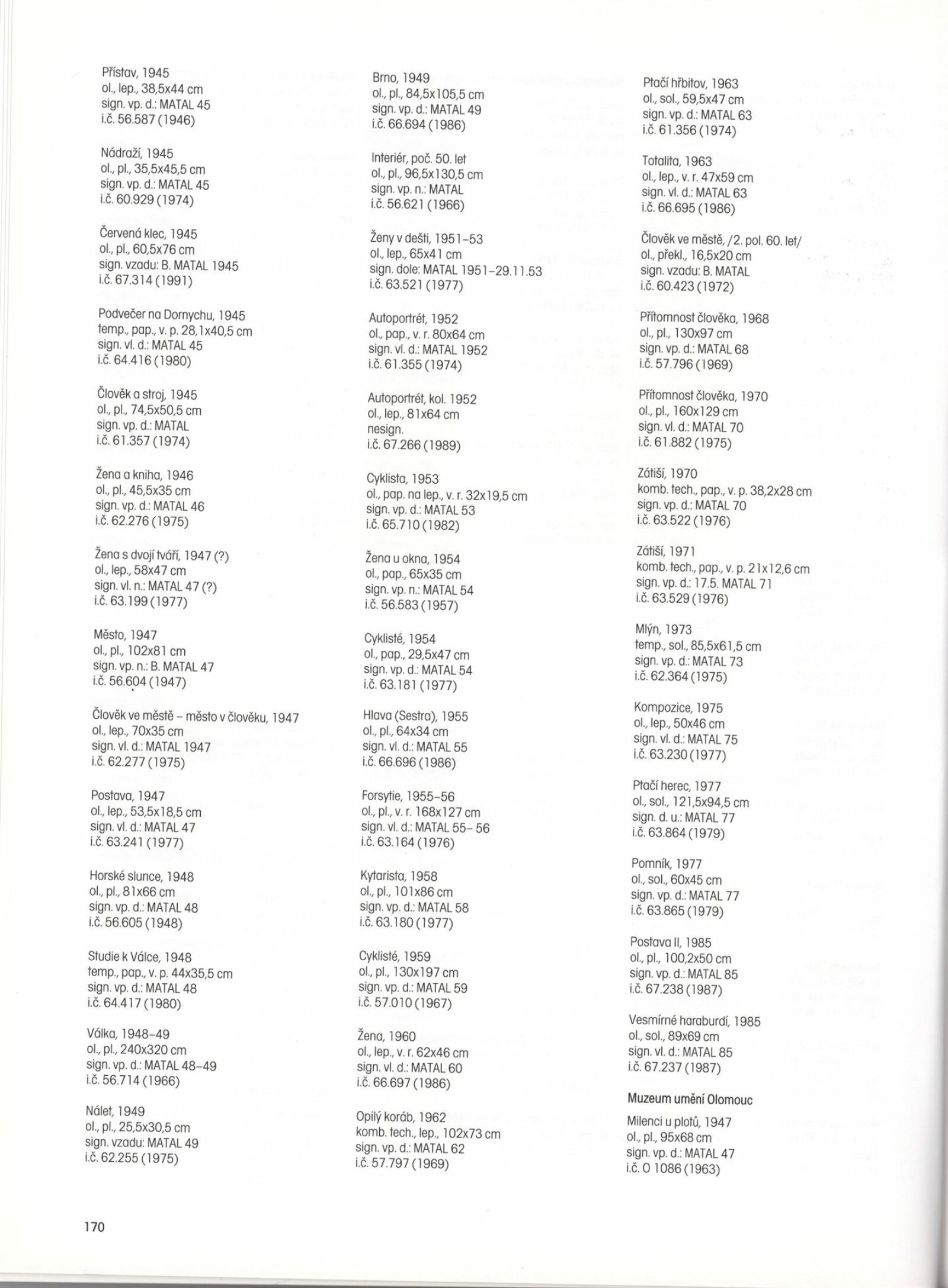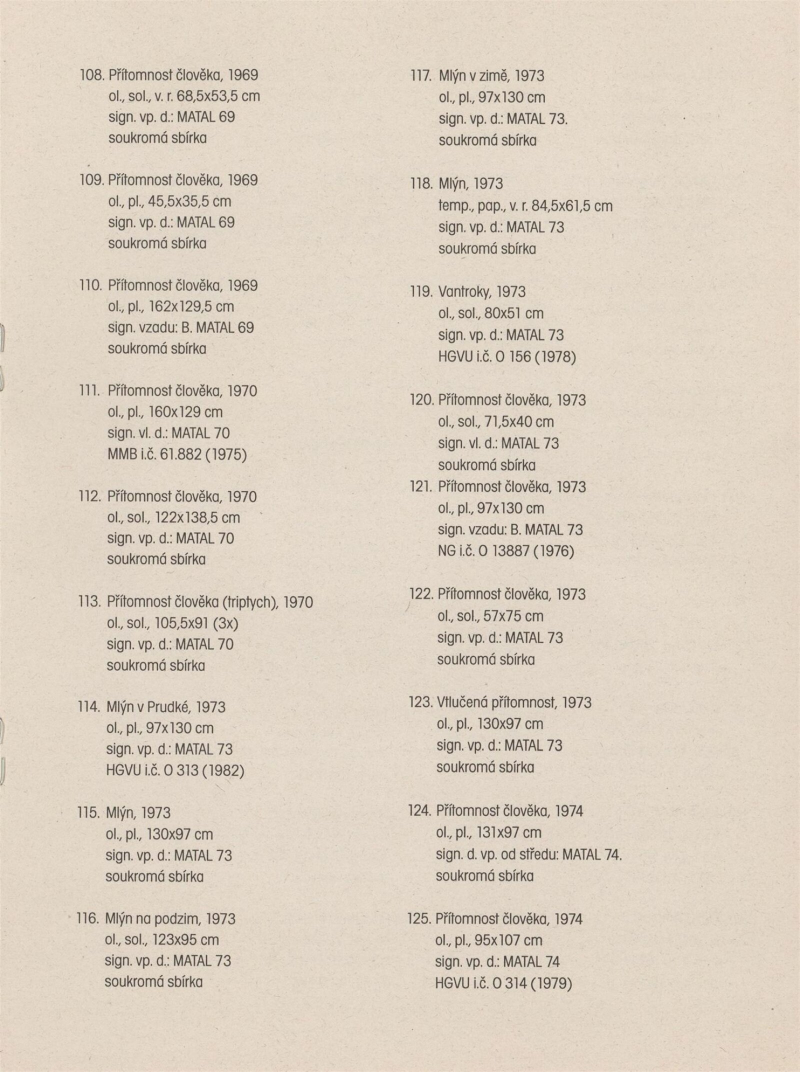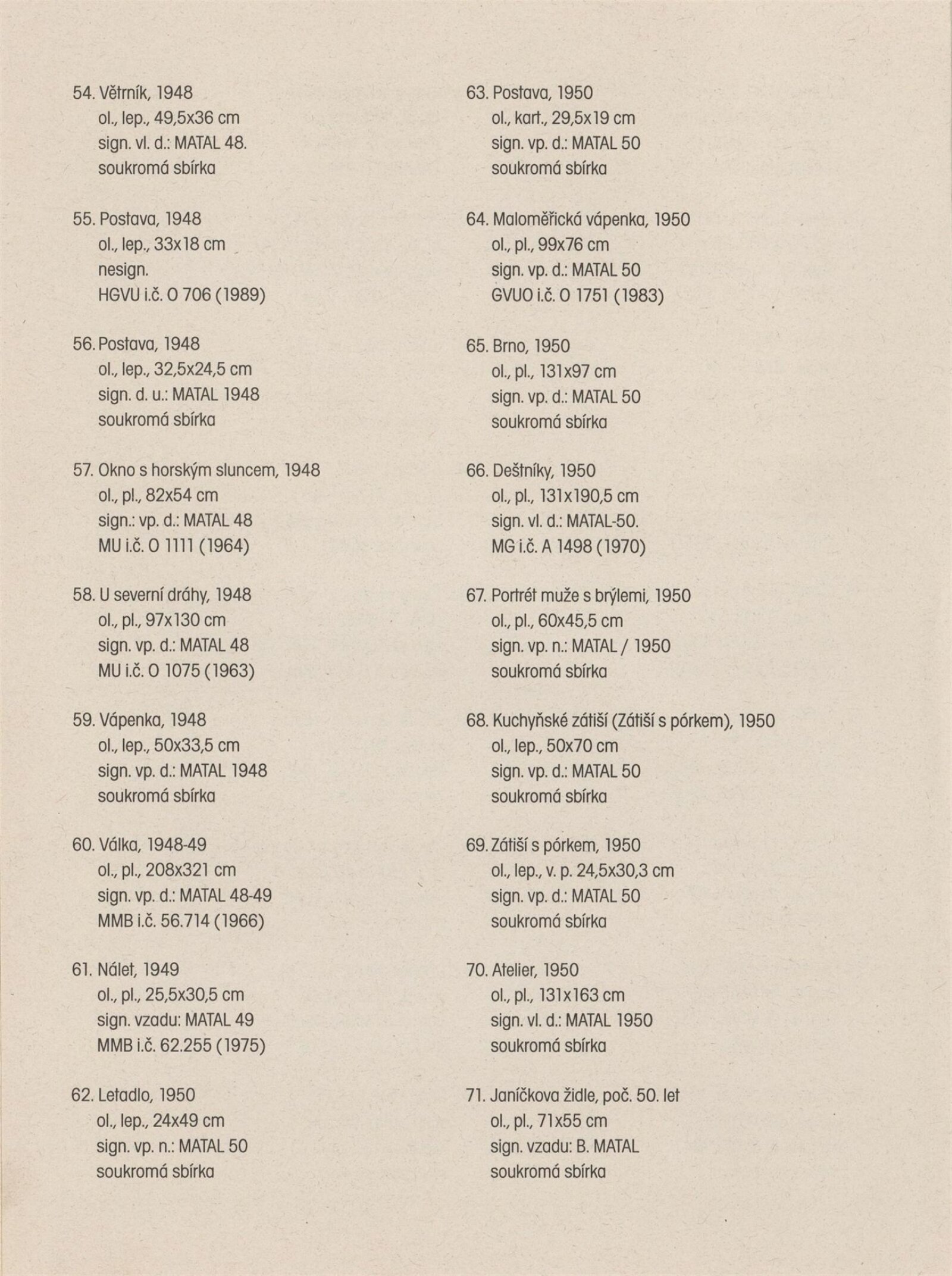 Bohumír Matal: Dům umění města Brna, 18. 12. 1998 – 31. 1. 1999 / Texty: Petr Holý, Jan Kačer, Ludvík Kundera, Pavel Liška, Marcela Macharáčková, Antonín Přidal, Petr Spielmann, Kateřina Svobodová, Lada H. Vacková, Igor Zhoř. – Brno: DUmB, 1998. – 173 s., obr., seznam vystavených prací [12] s., fotografická dokumentace, životopis, výstavy, realizace v architektuře, scénografie, knižní grafika a ilustrace, bibliografie, seznam obrazů ve veřejných sbírkách, DU 1088. – MZK
