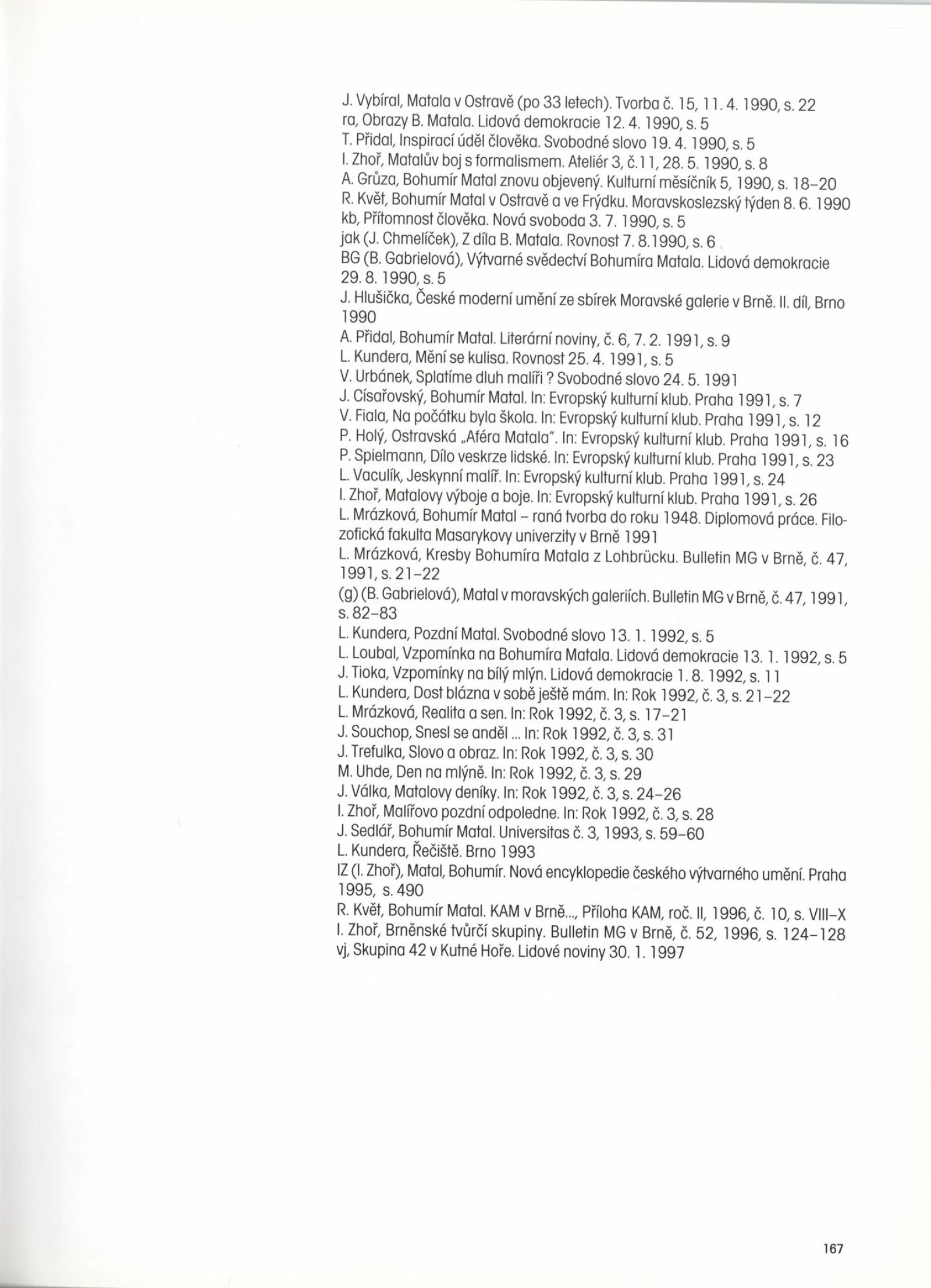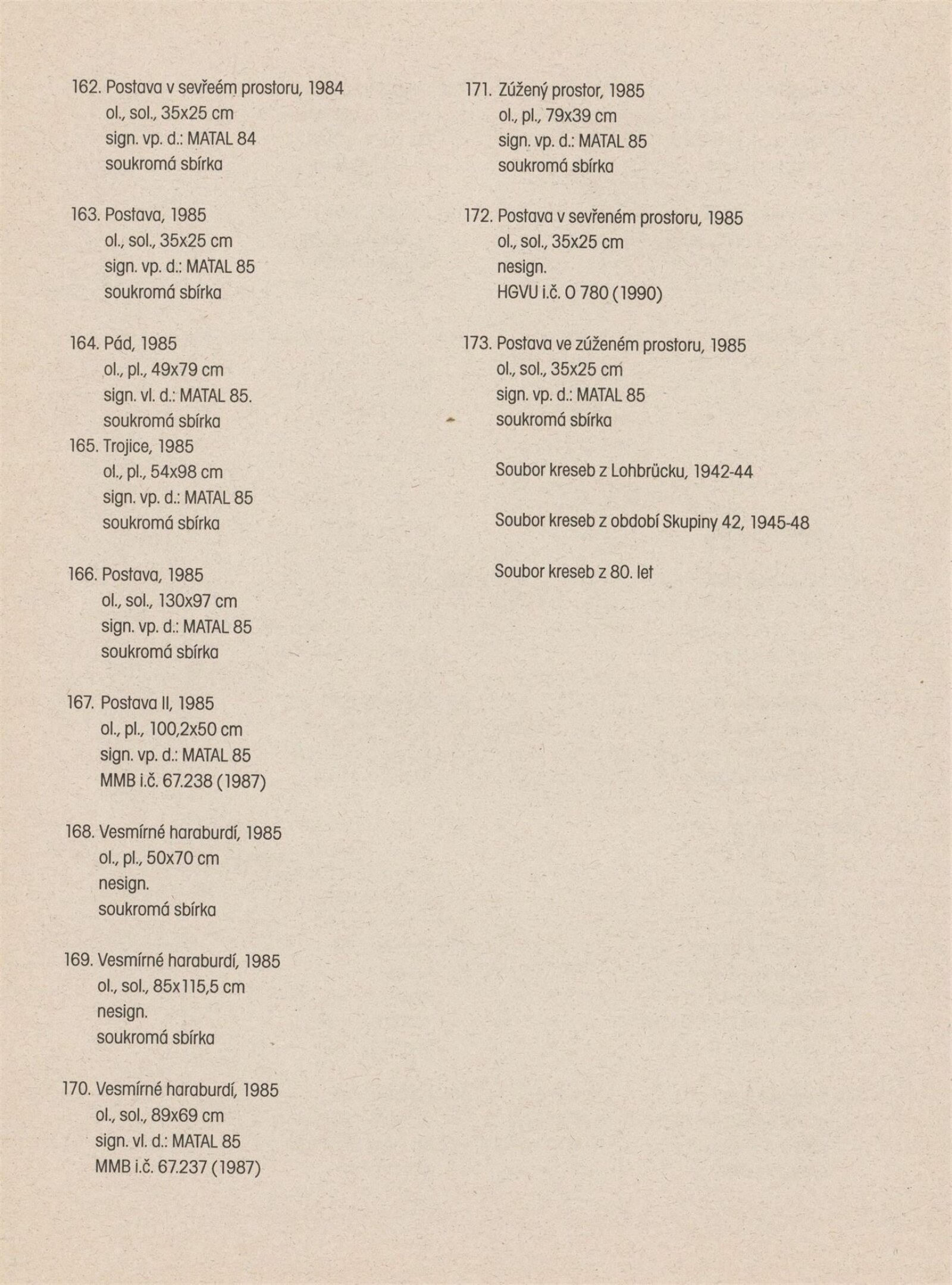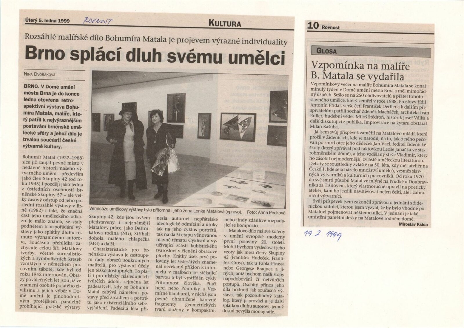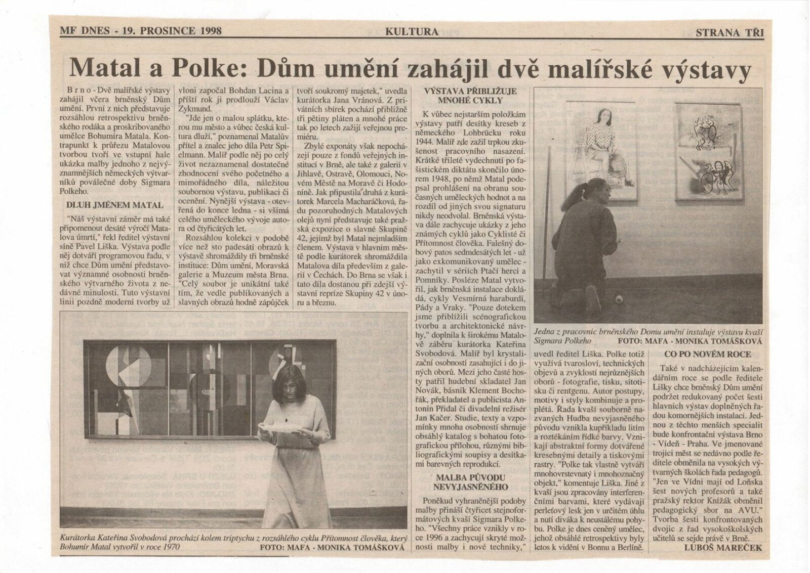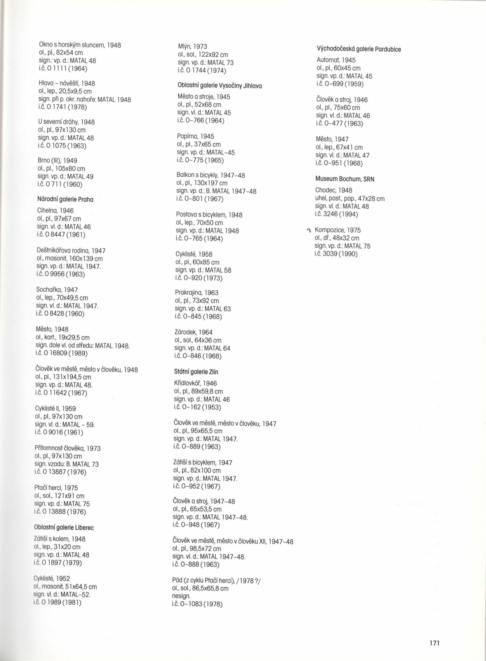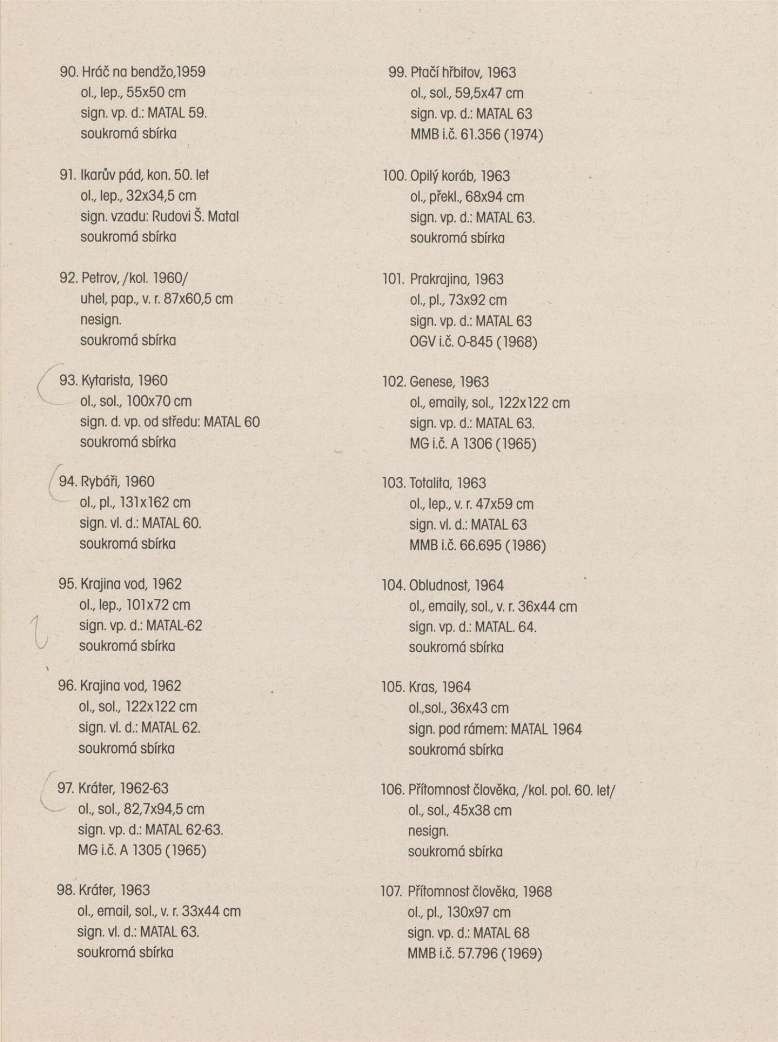 Bohumír Matal: Dům umění města Brna, 18. 12. 1998 – 31. 1. 1999 / Texty: Petr Holý, Jan Kačer, Ludvík Kundera, Pavel Liška, Marcela Macharáčková, Antonín Přidal, Petr Spielmann, Kateřina Svobodová, Lada H. Vacková, Igor Zhoř. – Brno: DUmB, 1998. – 173 s., obr., seznam vystavených prací [12] s., fotografická dokumentace, životopis, výstavy, realizace v architektuře, scénografie, knižní grafika a ilustrace, bibliografie, seznam obrazů ve veřejných sbírkách, DU 1088. – MZK