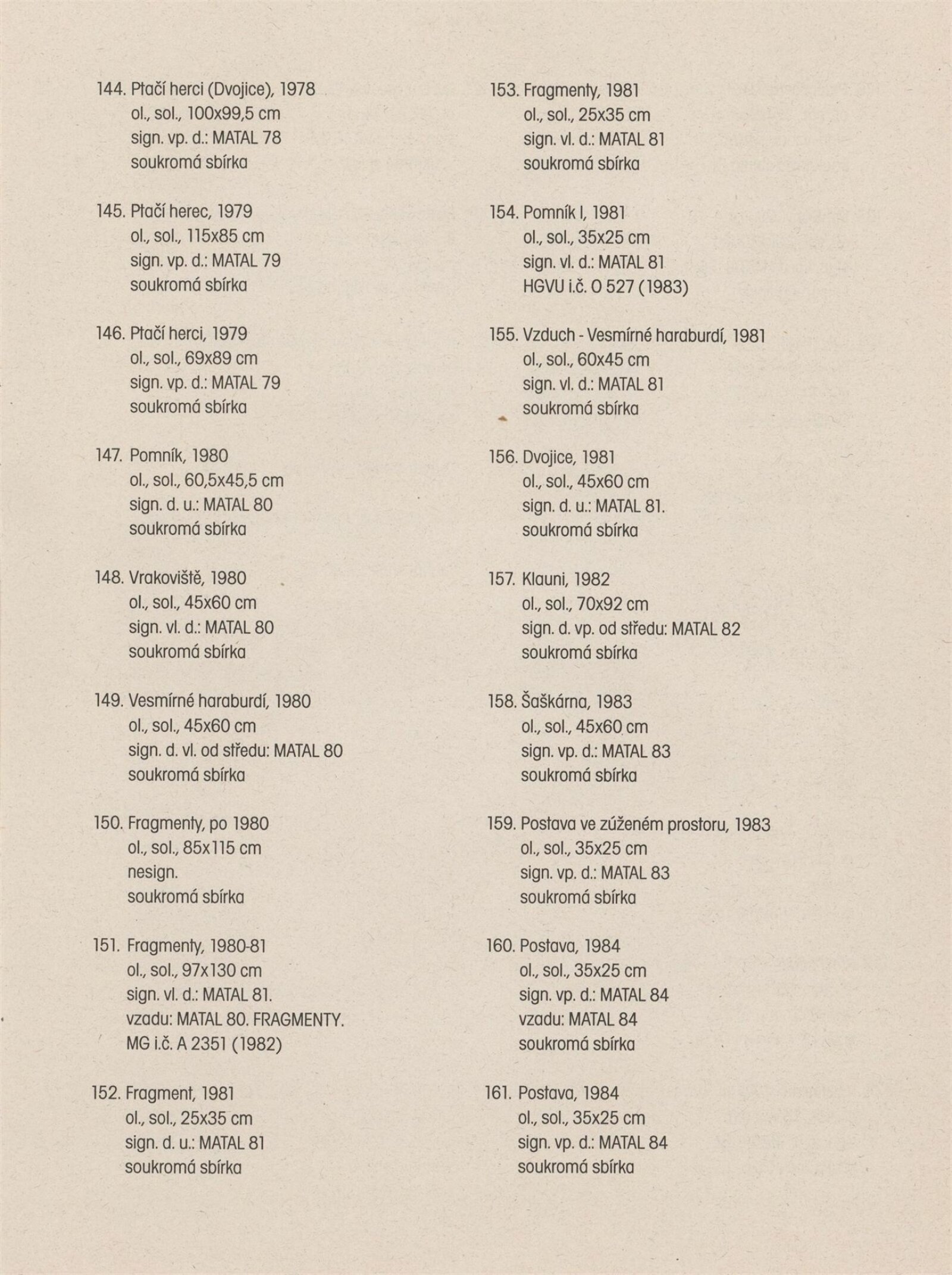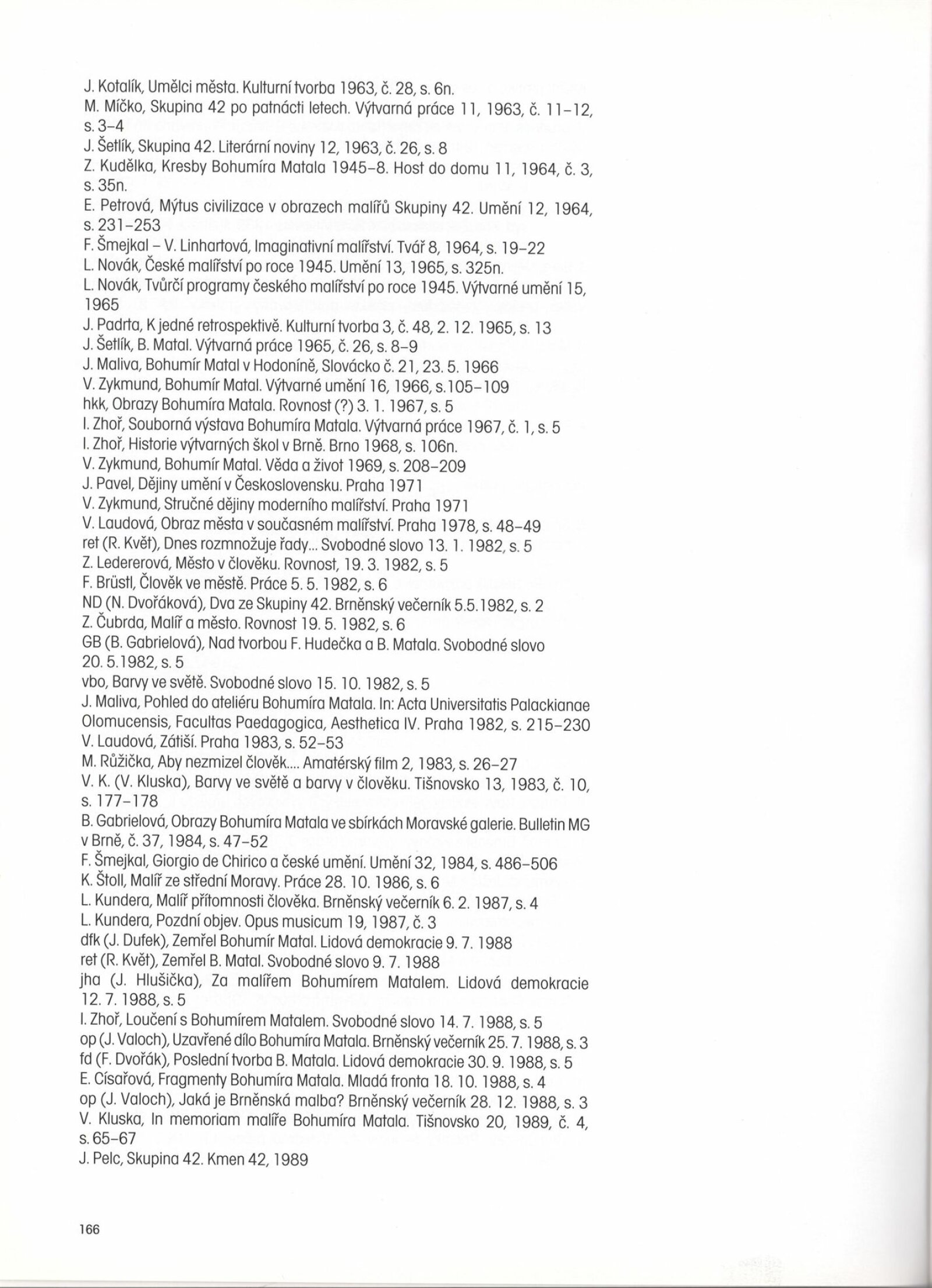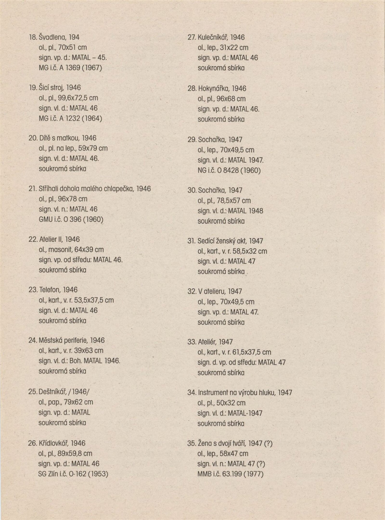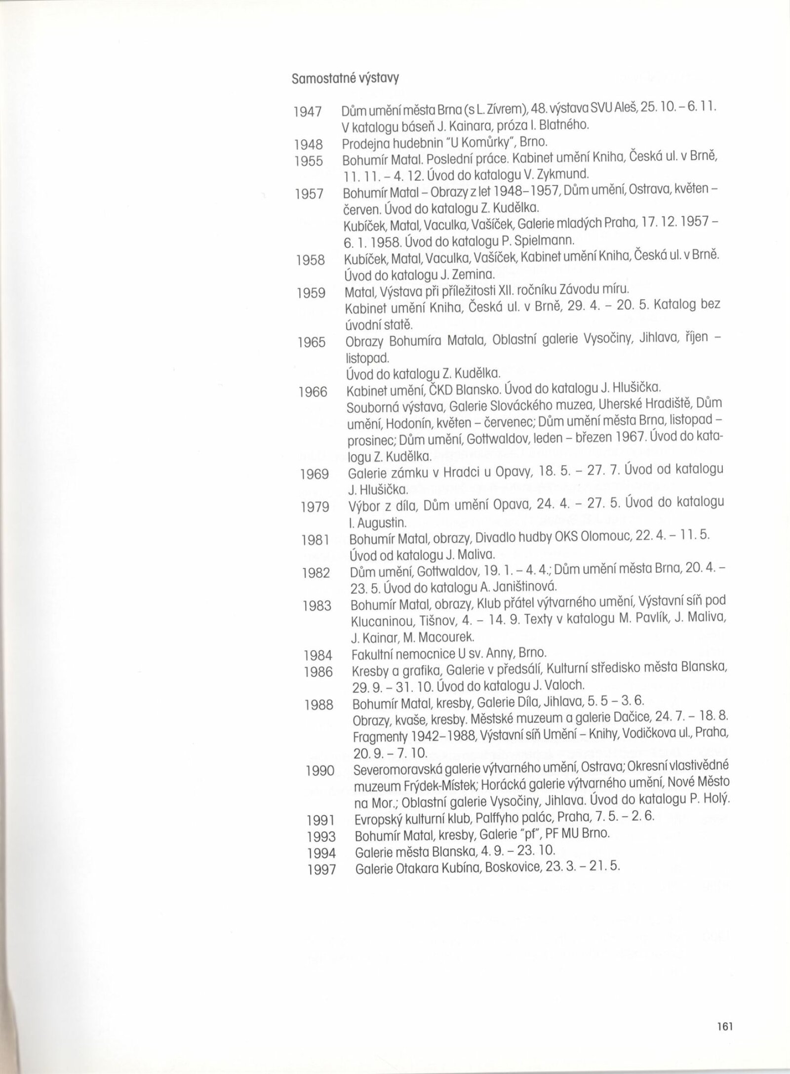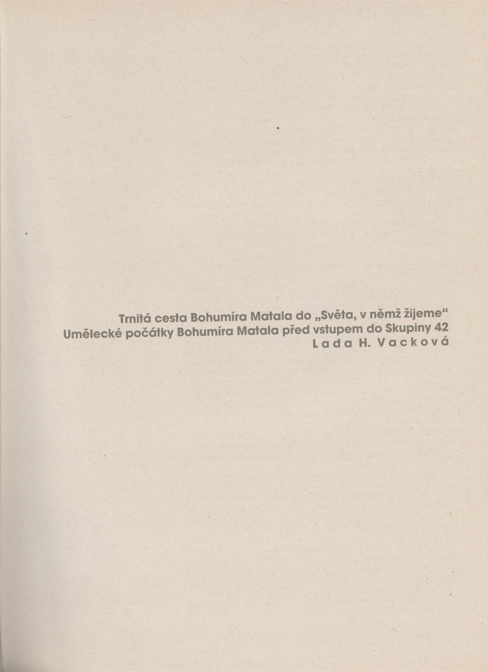 Bohumír Matal: Dům umění města Brna, 18. 12. 1998 – 31. 1. 1999 / Texty: Petr Holý, Jan Kačer, Ludvík Kundera, Pavel Liška, Marcela Macharáčková, Antonín Přidal, Petr Spielmann, Kateřina Svobodová, Lada H. Vacková, Igor Zhoř. – Brno: DUmB, 1998. – 173 s., obr., seznam vystavených prací [12] s., fotografická dokumentace, životopis, výstavy, realizace v architektuře, scénografie, knižní grafika a ilustrace, bibliografie, seznam obrazů ve veřejných sbírkách, DU 1088. – MZK