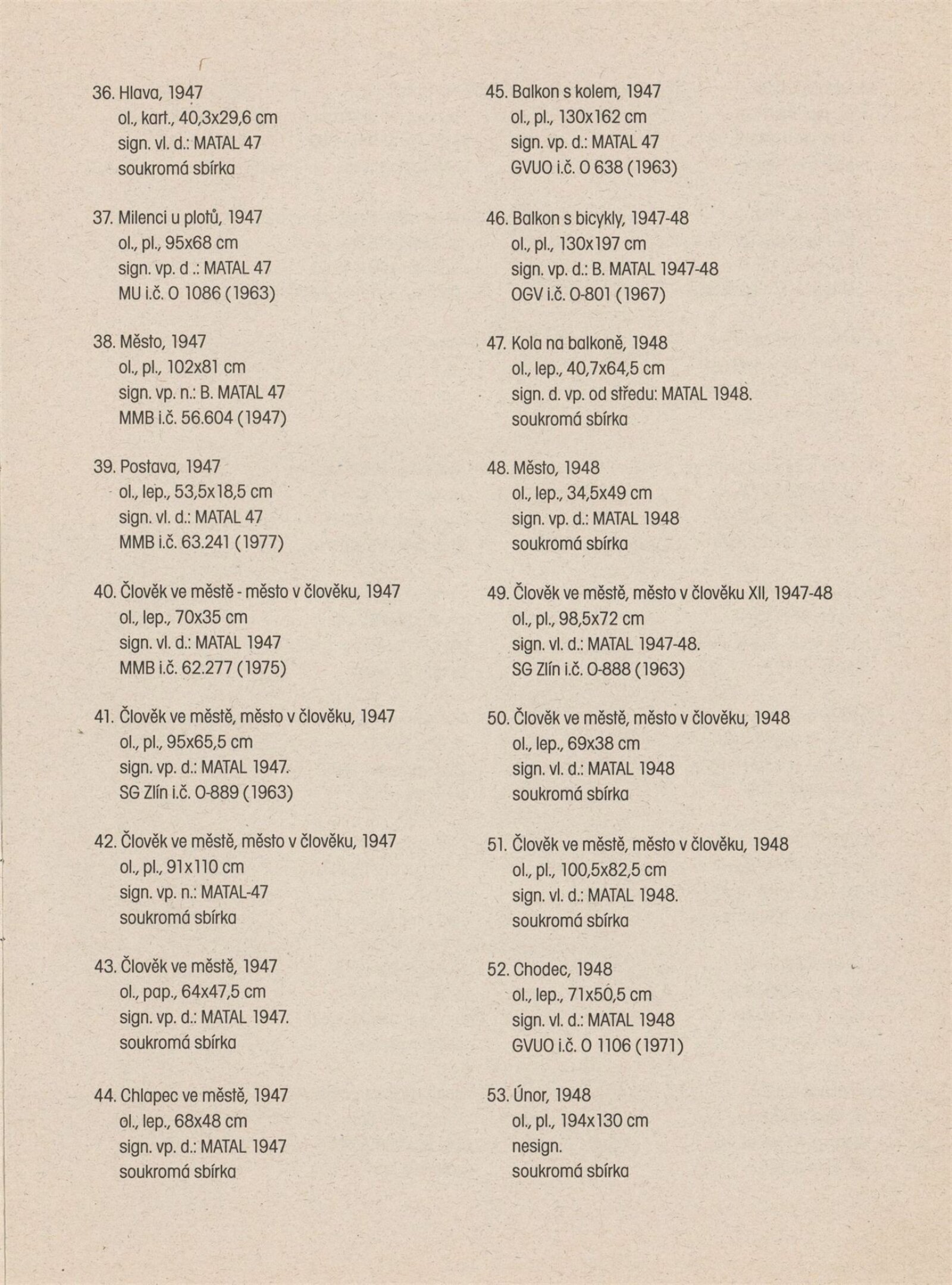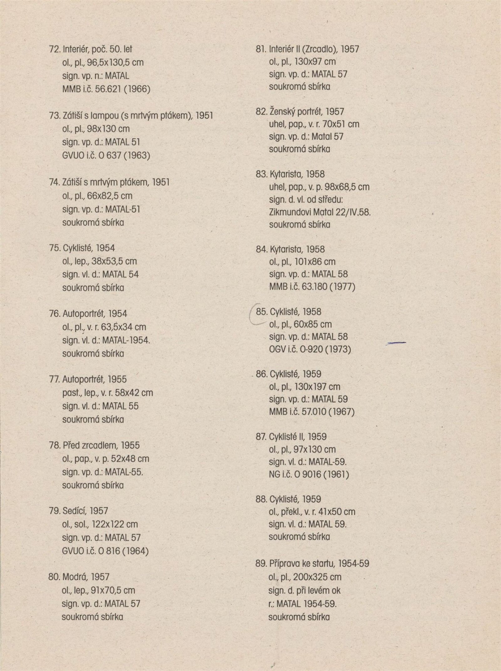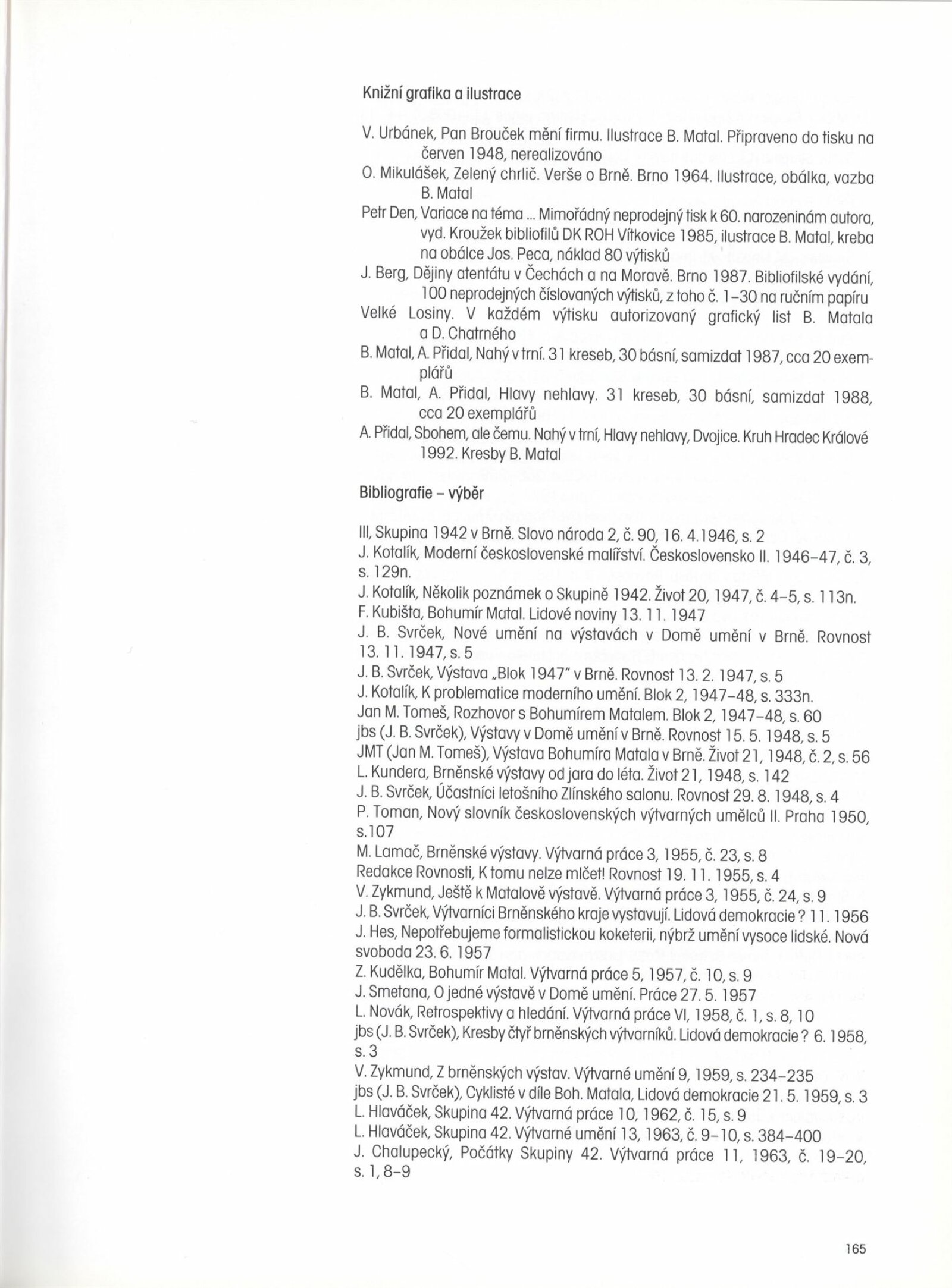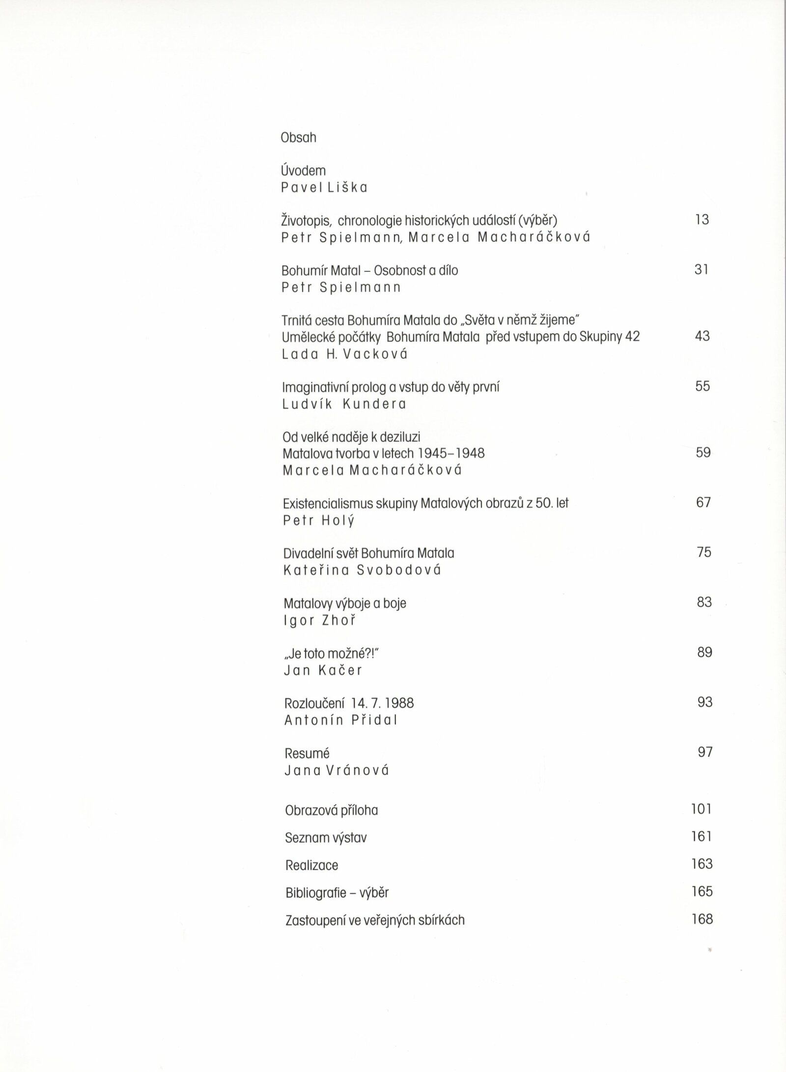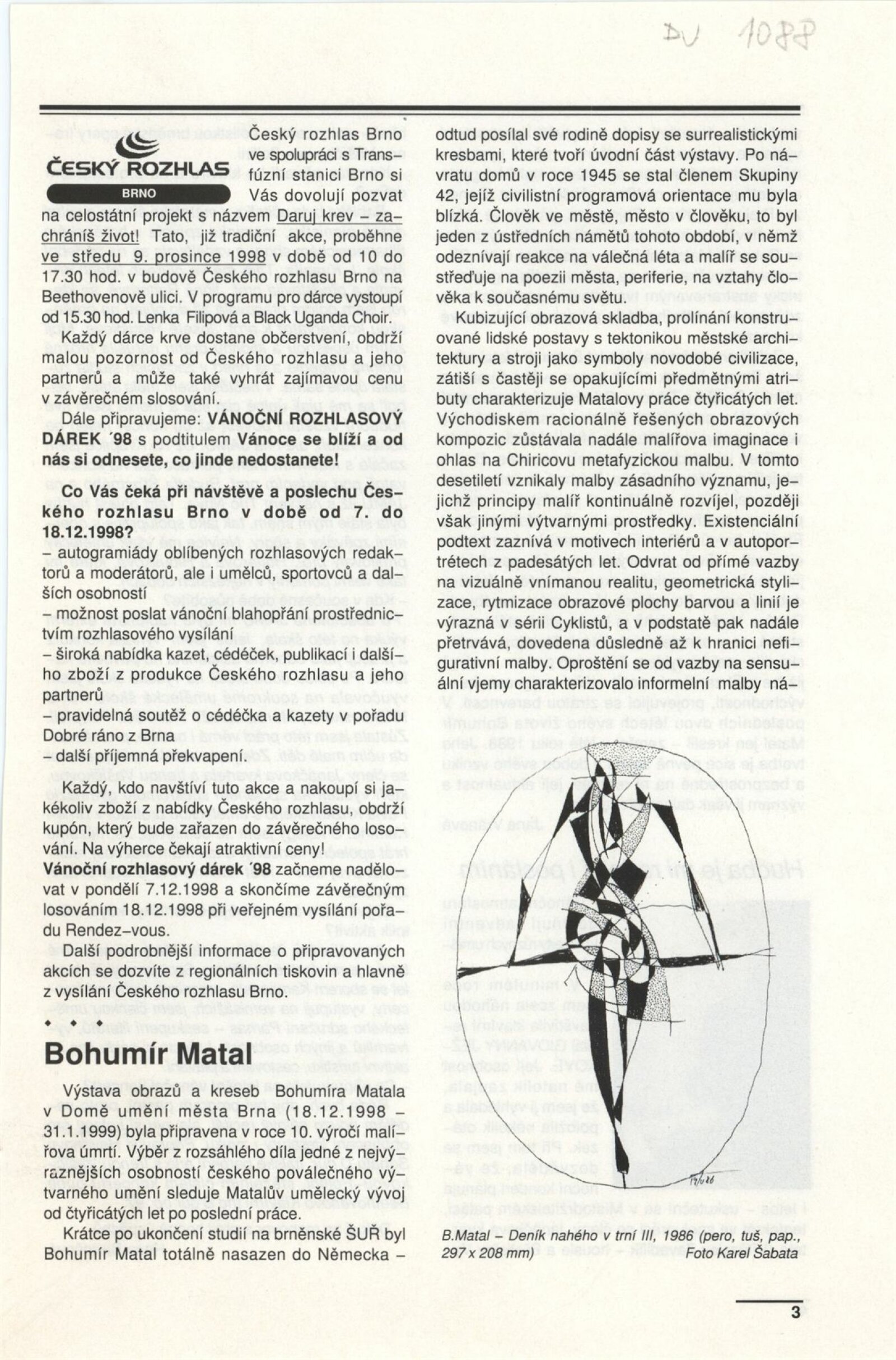 Bohumír Matal: Dům umění města Brna, 18. 12. 1998 – 31. 1. 1999 / Texty: Petr Holý, Jan Kačer, Ludvík Kundera, Pavel Liška, Marcela Macharáčková, Antonín Přidal, Petr Spielmann, Kateřina Svobodová, Lada H. Vacková, Igor Zhoř. – Brno: DUmB, 1998. – 173 s., obr., seznam vystavených prací [12] s., fotografická dokumentace, životopis, výstavy, realizace v architektuře, scénografie, knižní grafika a ilustrace, bibliografie, seznam obrazů ve veřejných sbírkách, DU 1088. – MZK