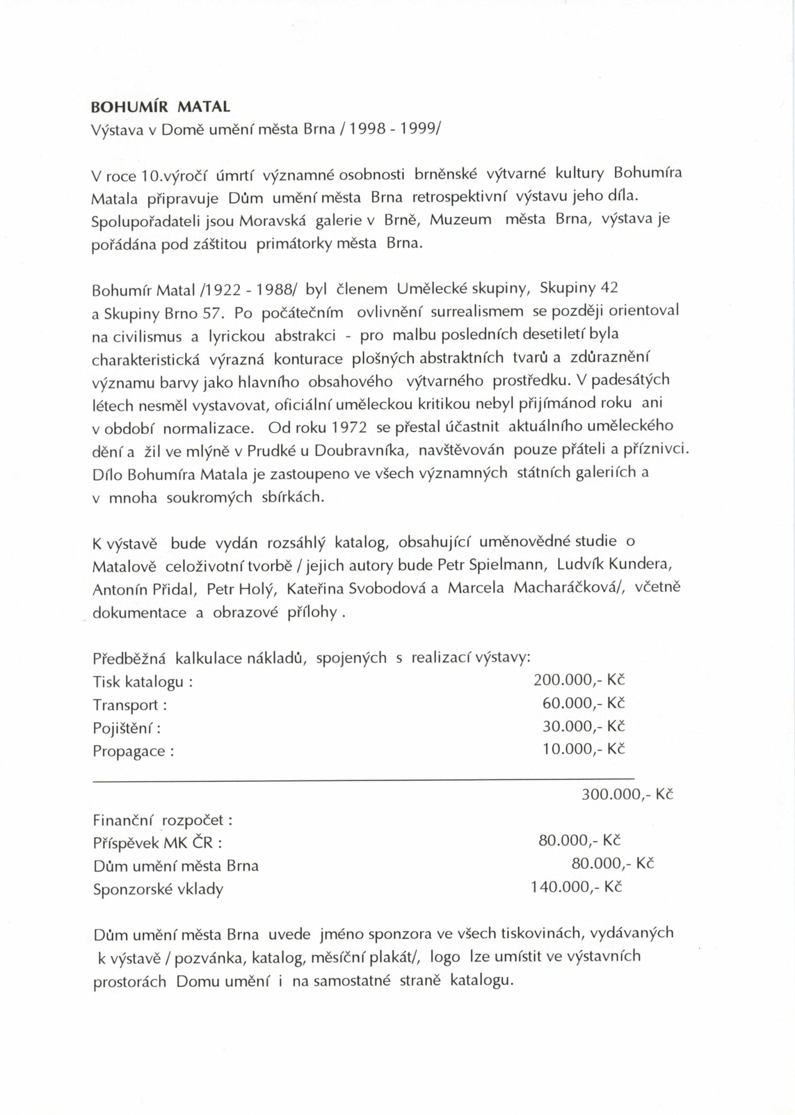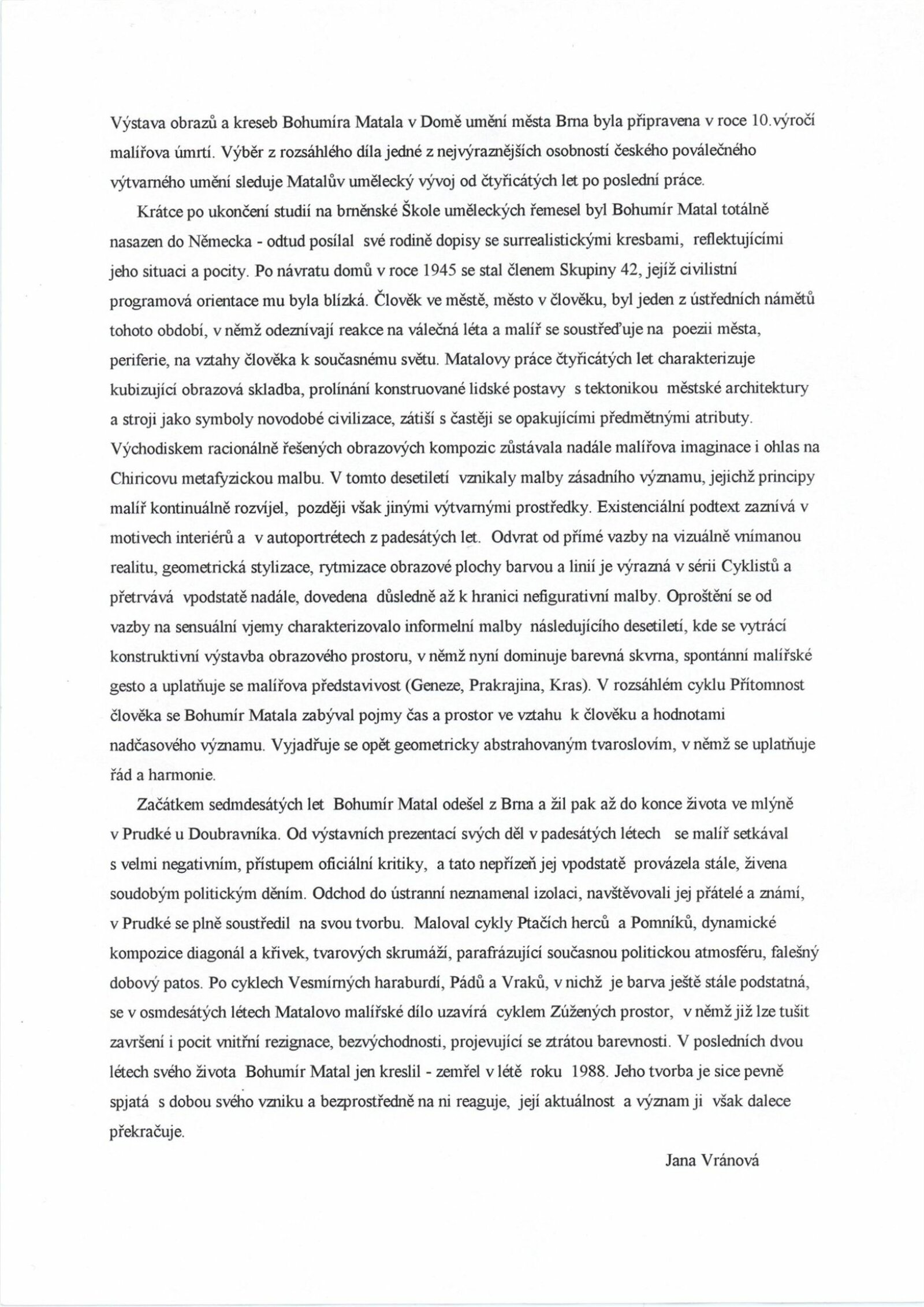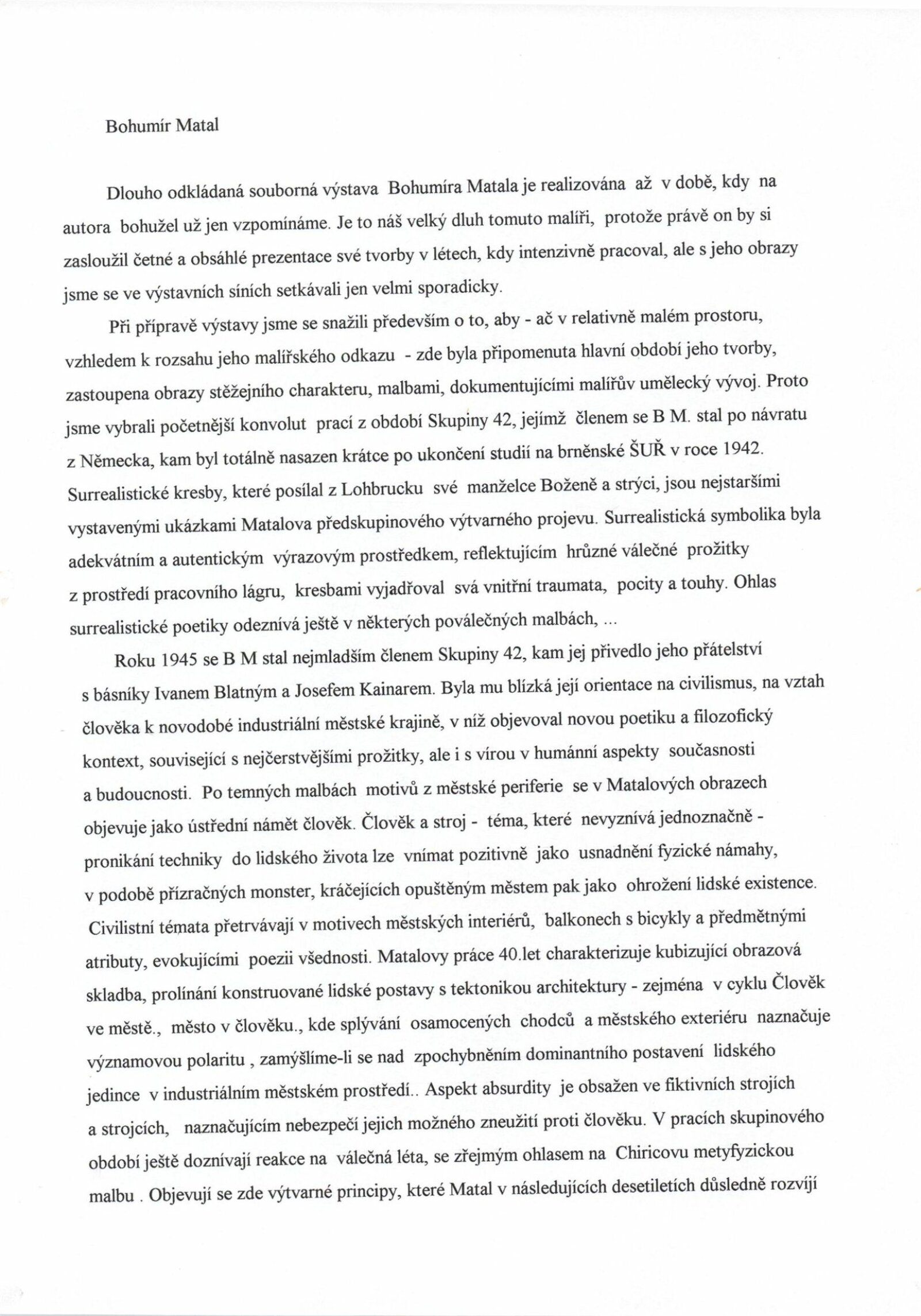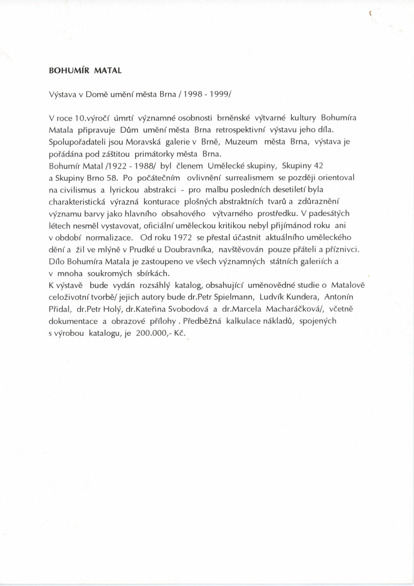 pozvánka na vernisáž a na setkání s přáteli B. Matala, katalog, tisková zpráva, texty k výstavě, materiály ke katalogu, životopis umělce, fotografie, negativy a diapozitivy (vernisáž, výstava, jednotlivá díla, fotografie pro katalog), seznam vystavených děl, korespondence o realizaci výstavy, provozní korespondence, smlouvy a potvrzení o zapůjčení děl, finanční smlouvy, anotace, rozpočet, recenze v tisku, katalogy z jiných výstav umělce, poznámky