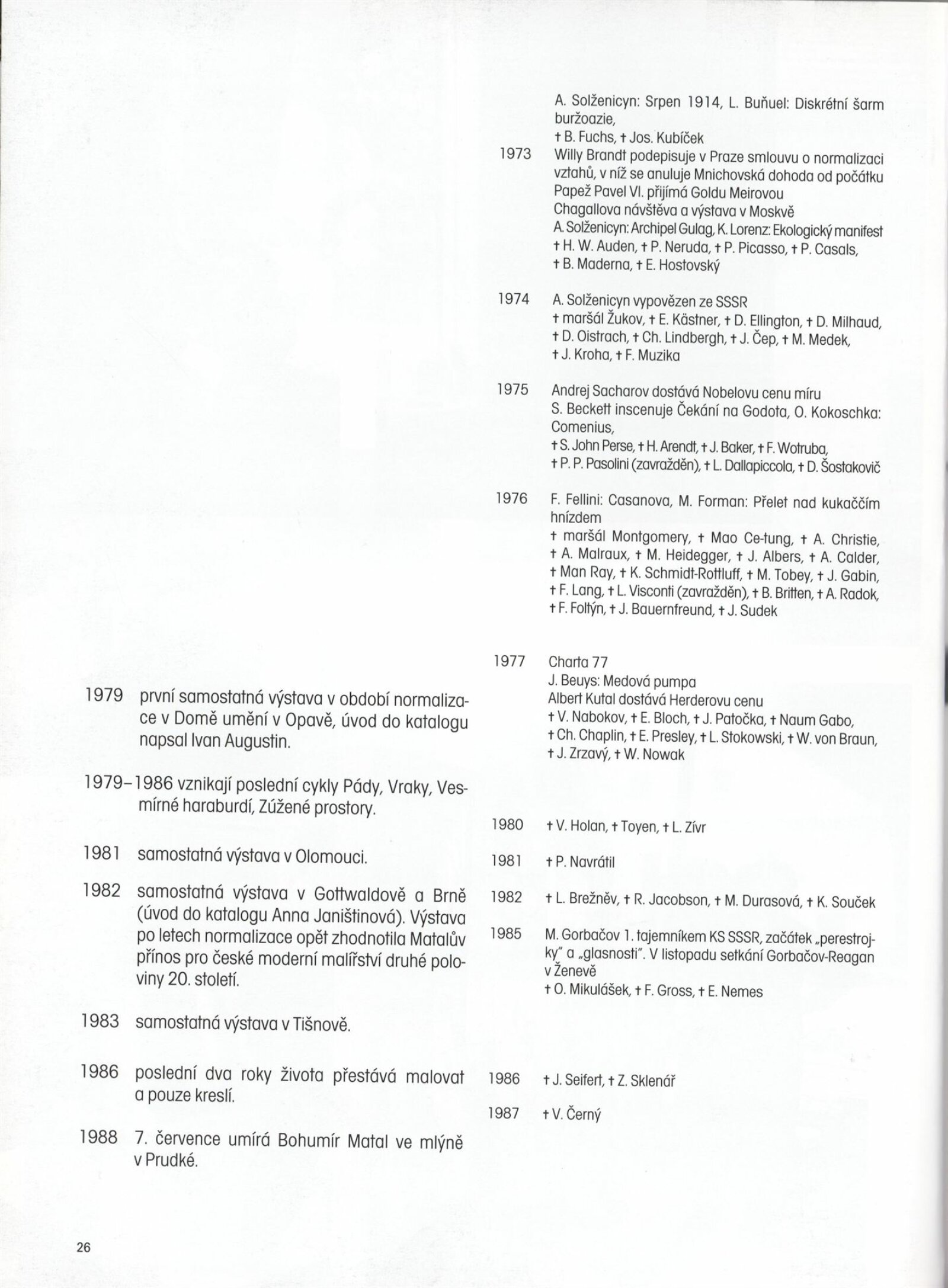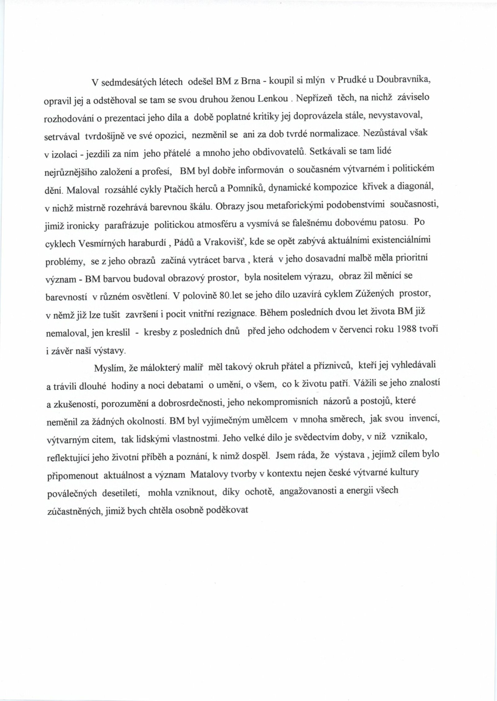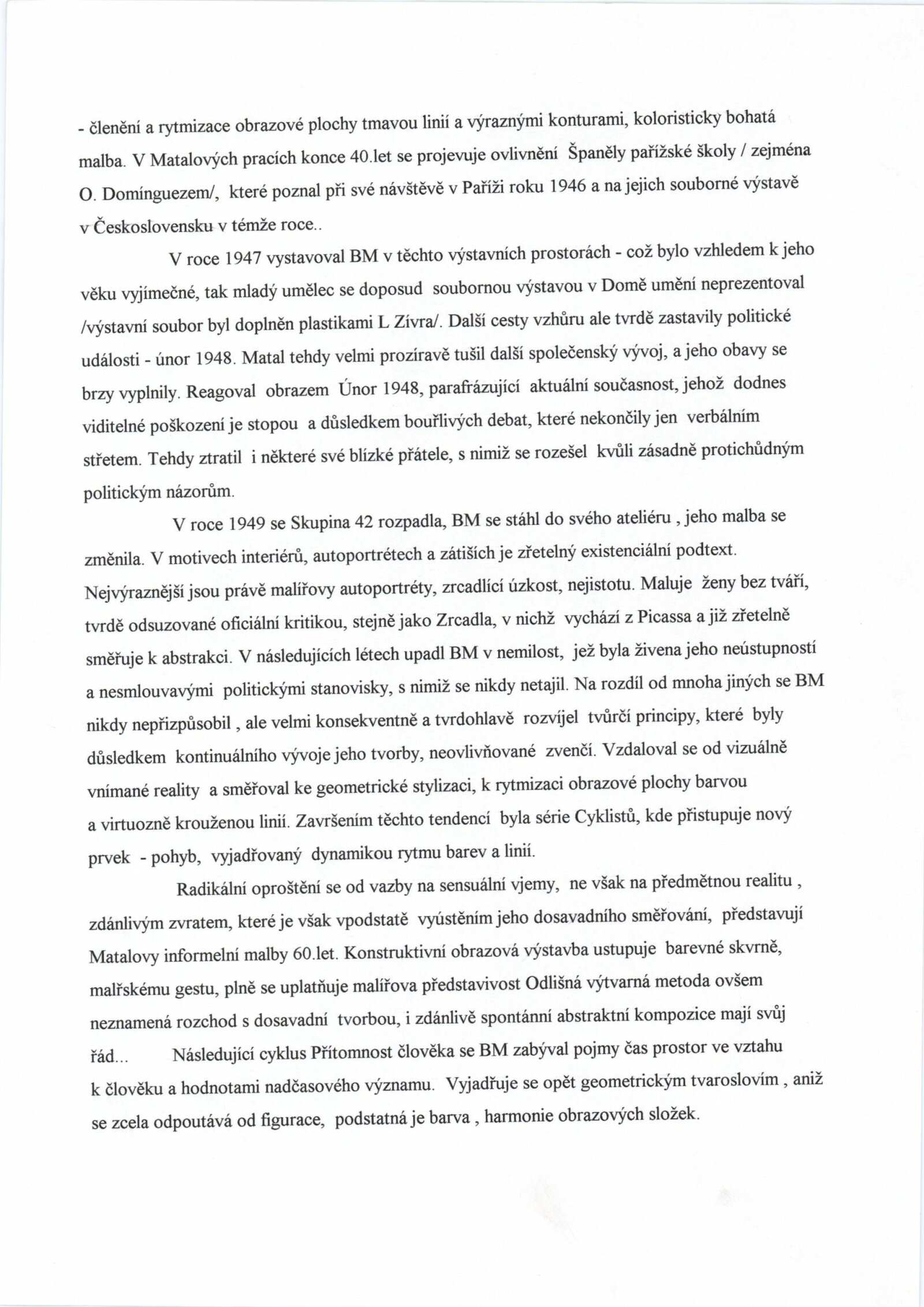 pozvánka na vernisáž a na setkání s přáteli B. Matala, katalog, tisková zpráva, texty k výstavě, materiály ke katalogu, životopis umělce, fotografie, negativy a diapozitivy (vernisáž, výstava, jednotlivá díla, fotografie pro katalog), seznam vystavených děl, korespondence o realizaci výstavy, provozní korespondence, smlouvy a potvrzení o zapůjčení děl, finanční smlouvy, anotace, rozpočet, recenze v tisku, katalogy z jiných výstav umělce, poznámky